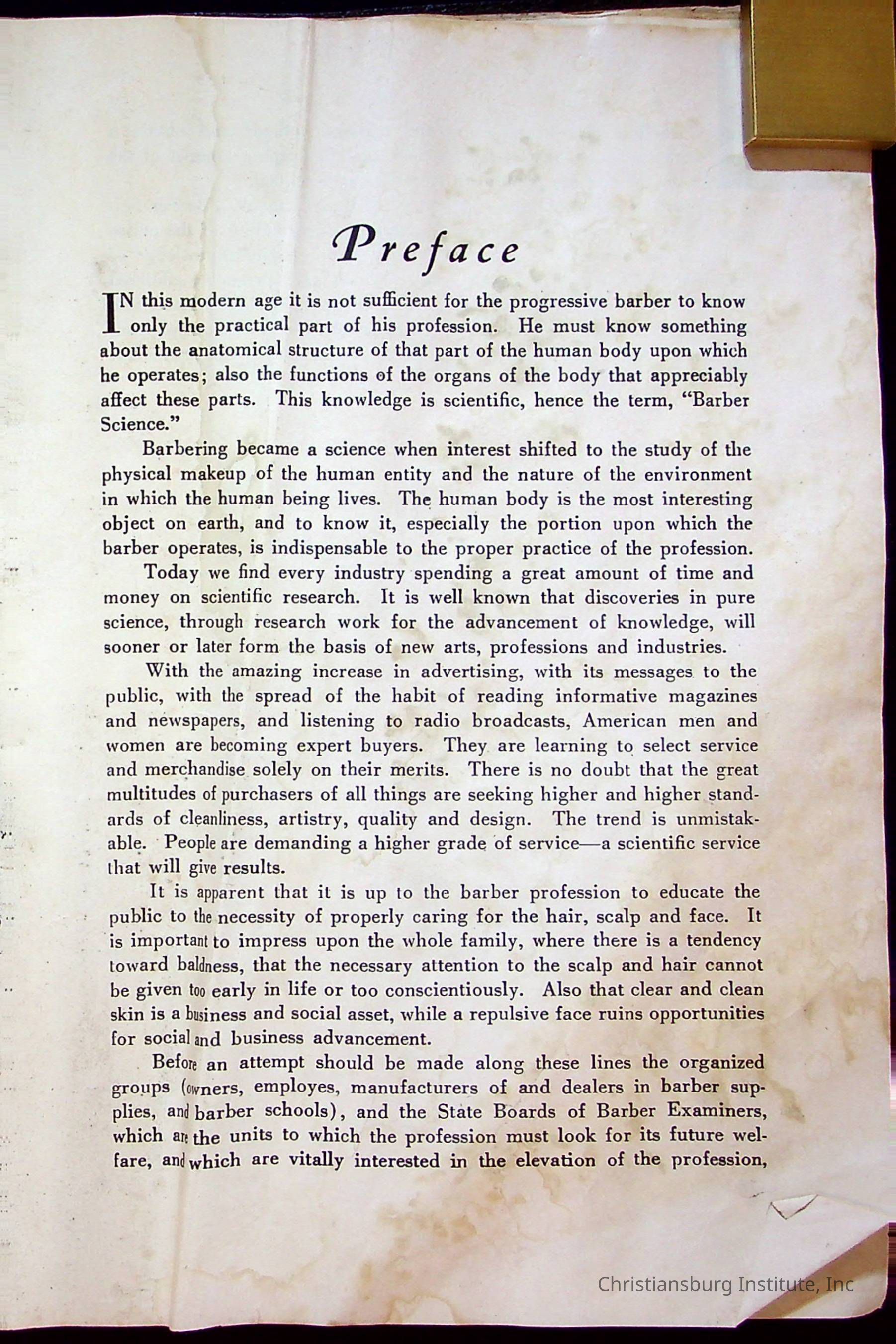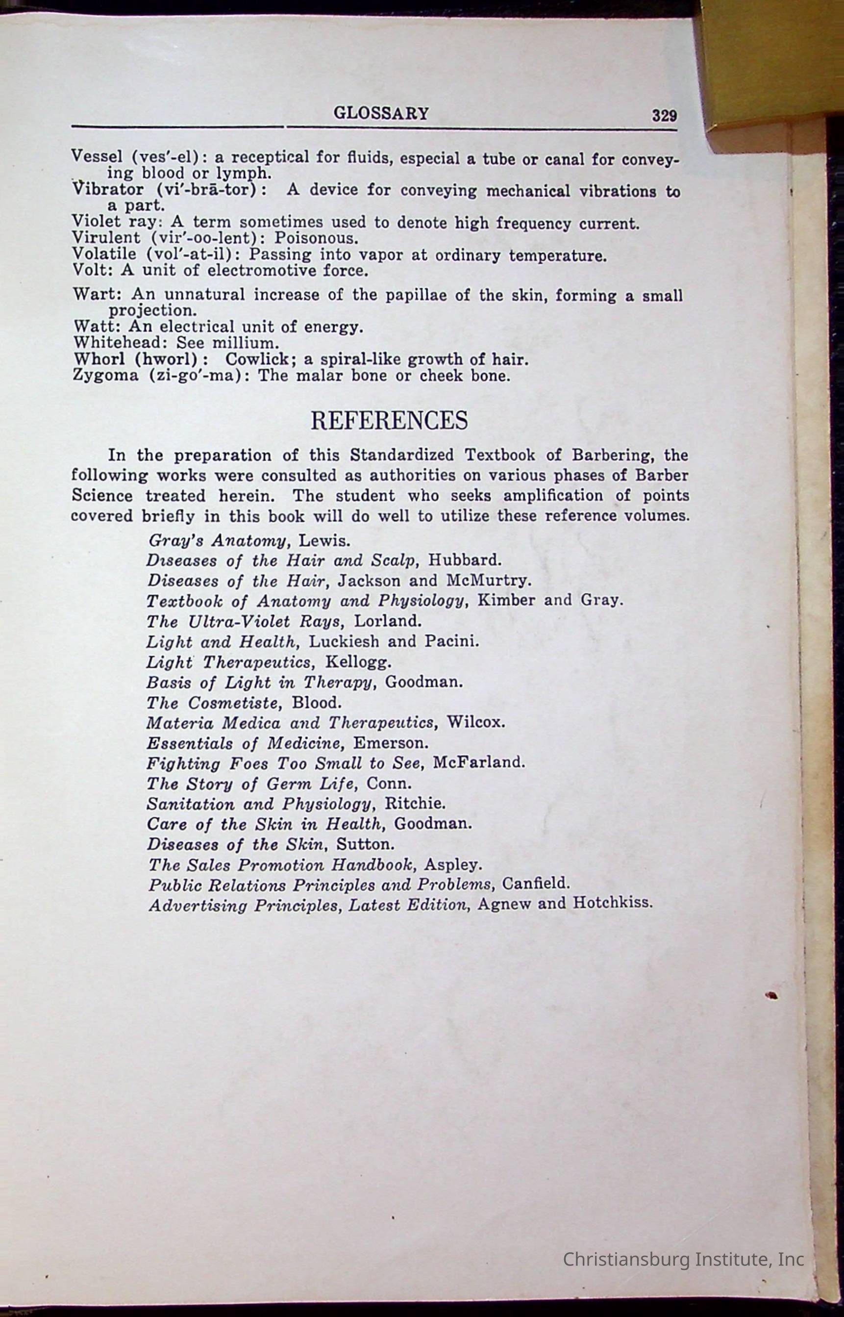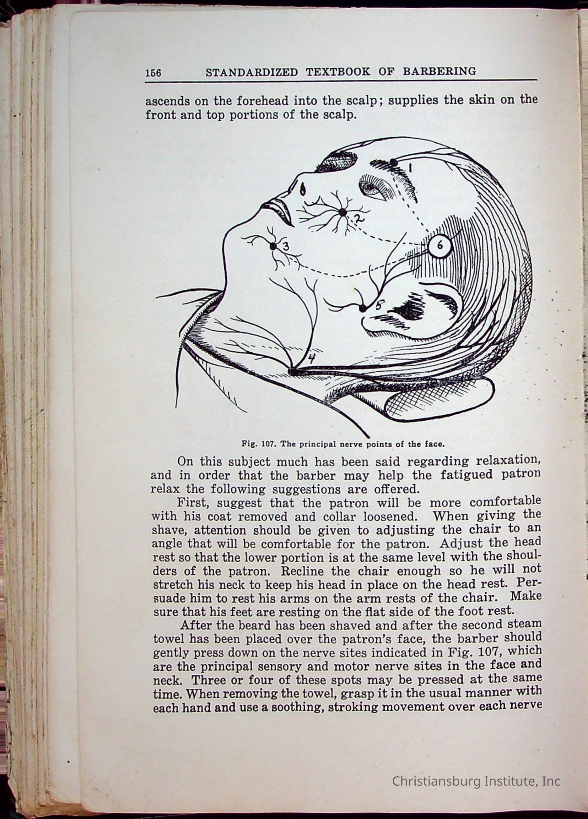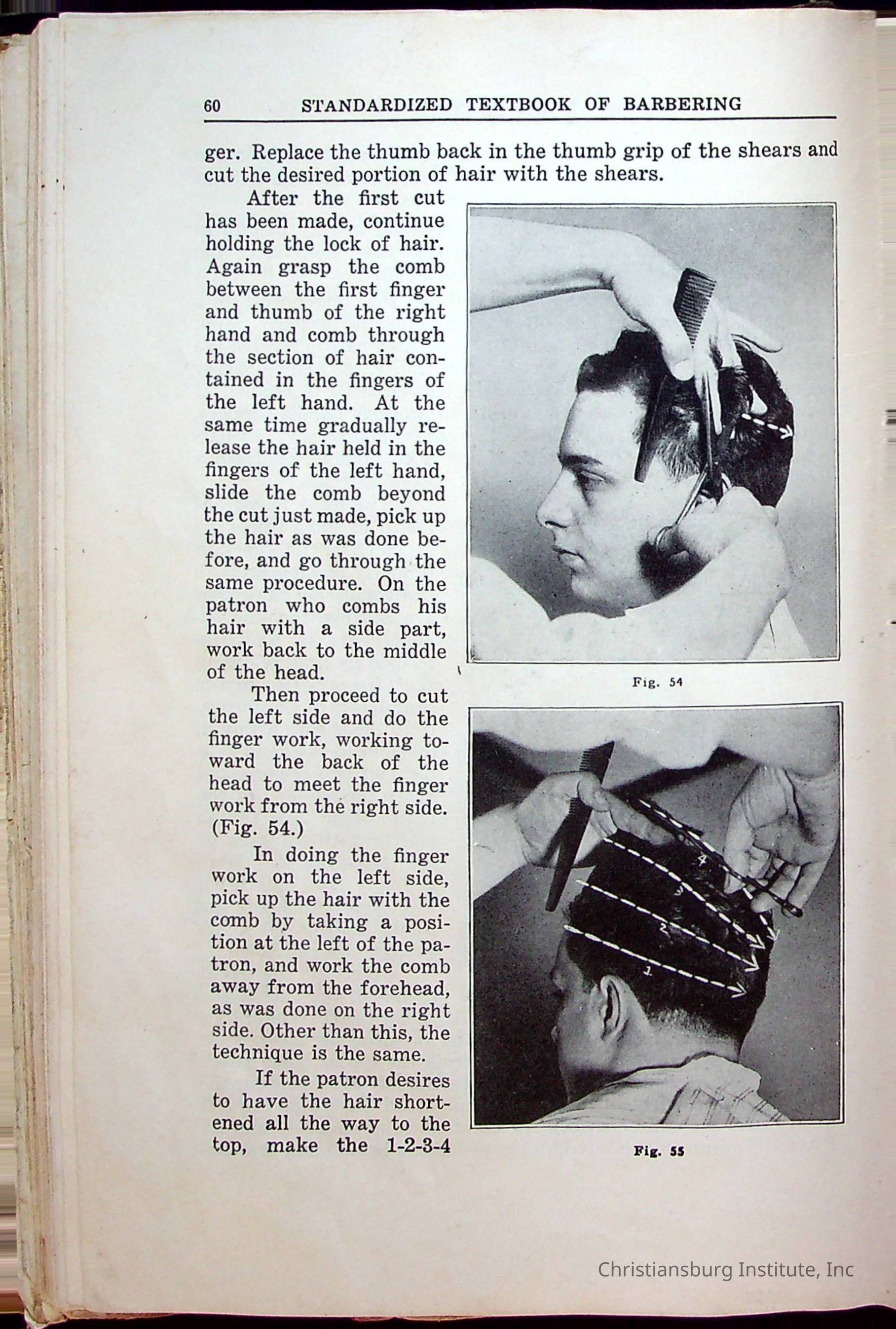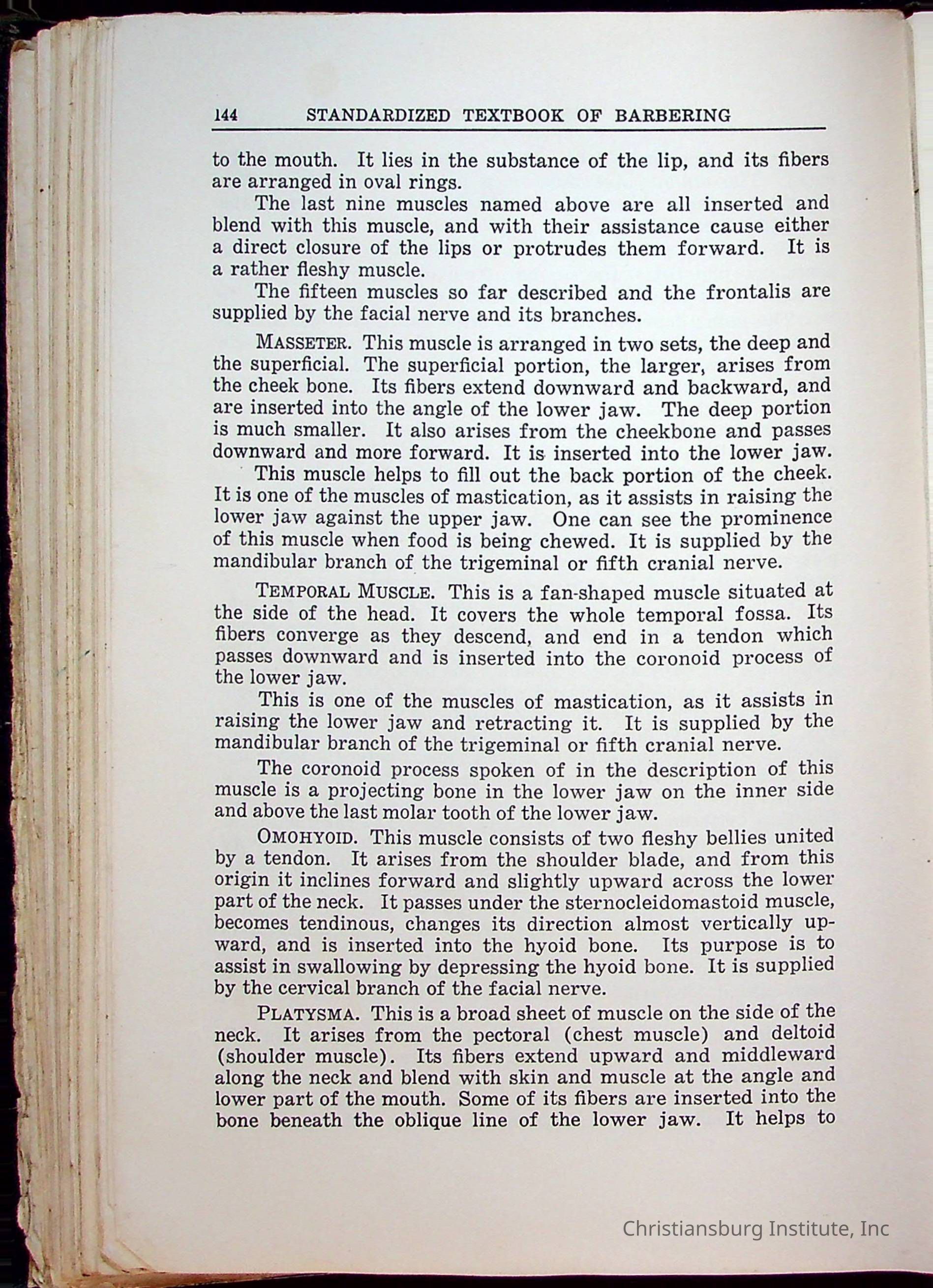 "Standardized Textbook of Barbering: in Two Parts" written and published by the Associated Master Barbers and Beauticians of America in the year 1950. This textbook was in the Christiansburg Institute library.