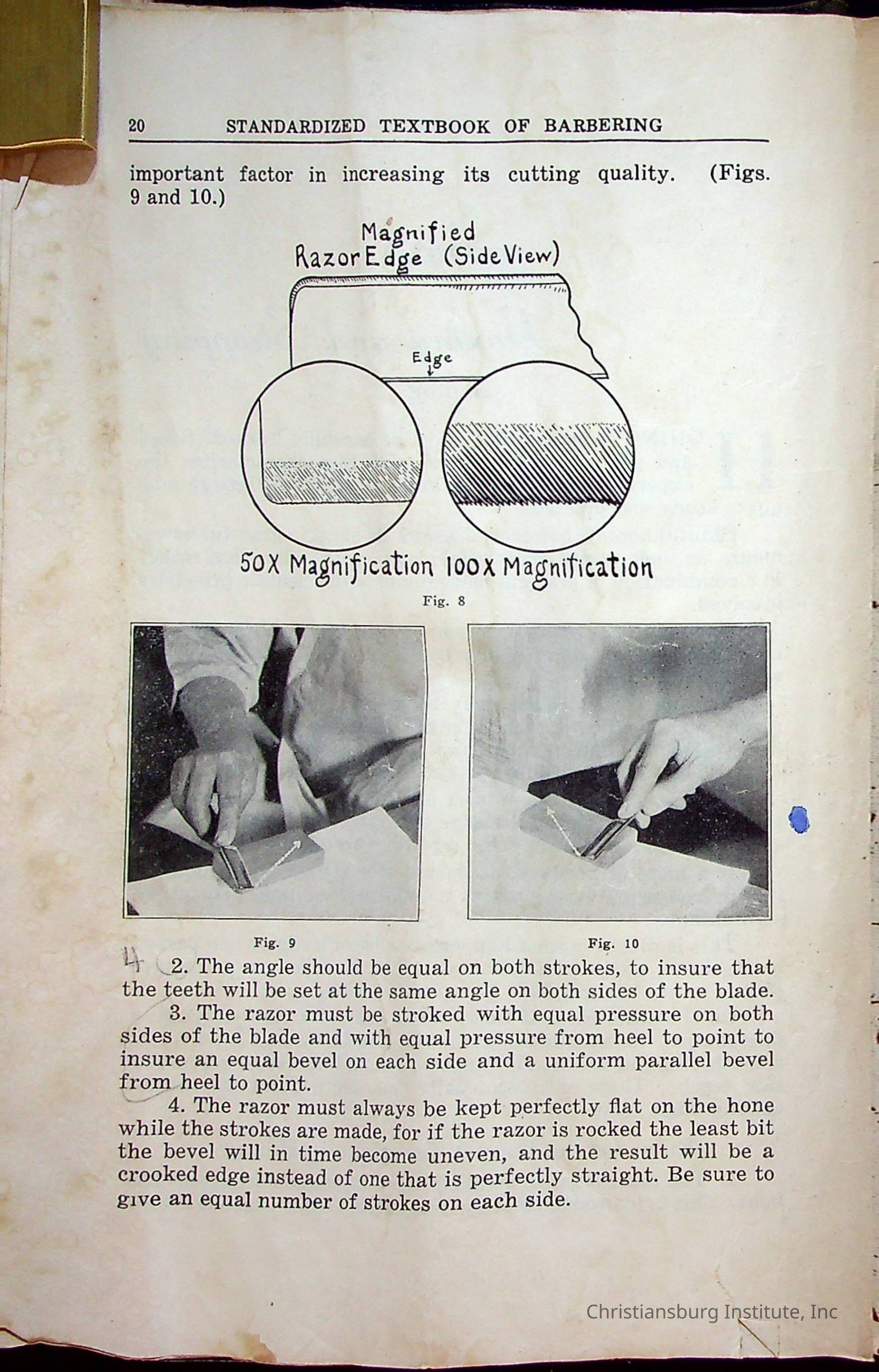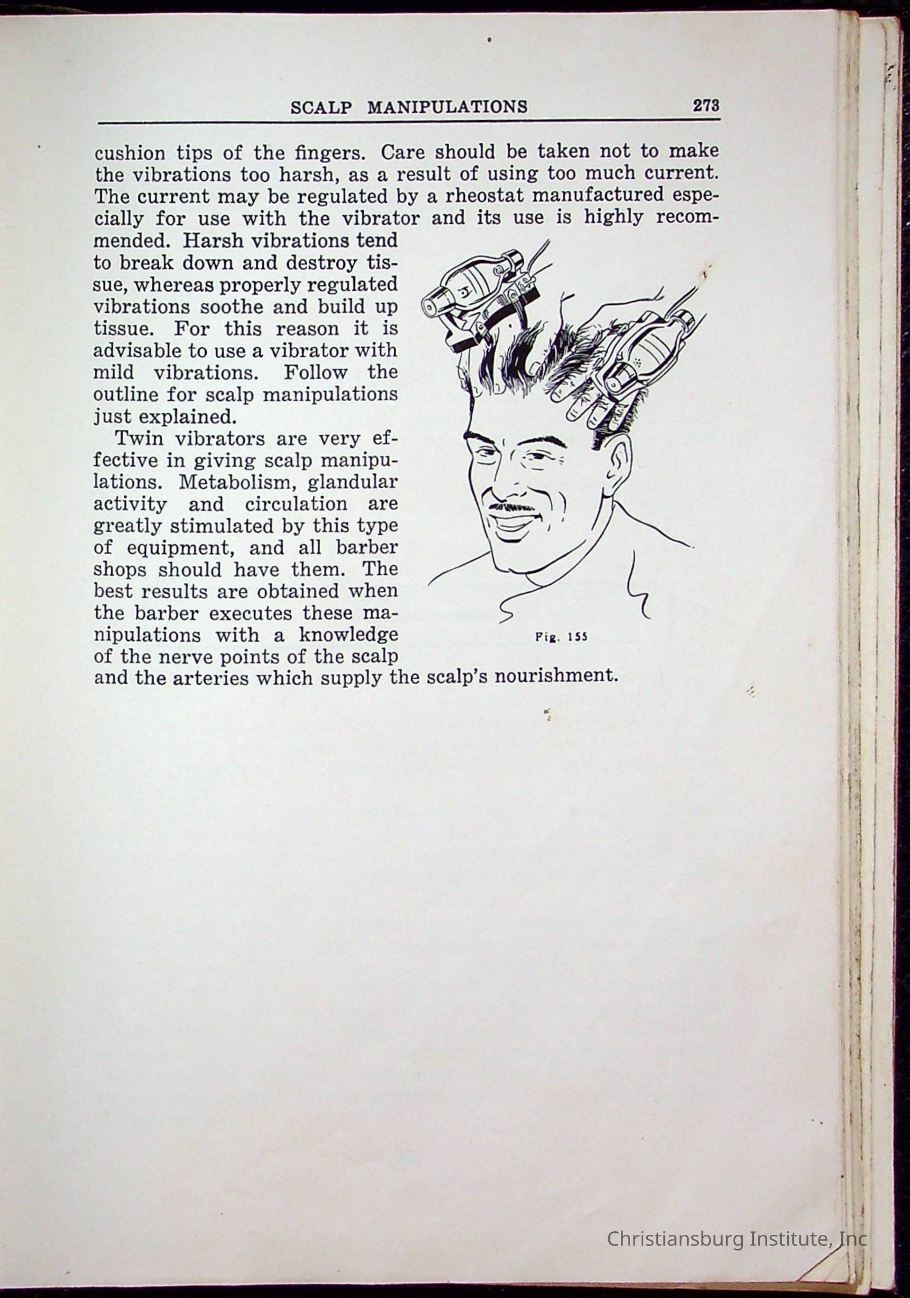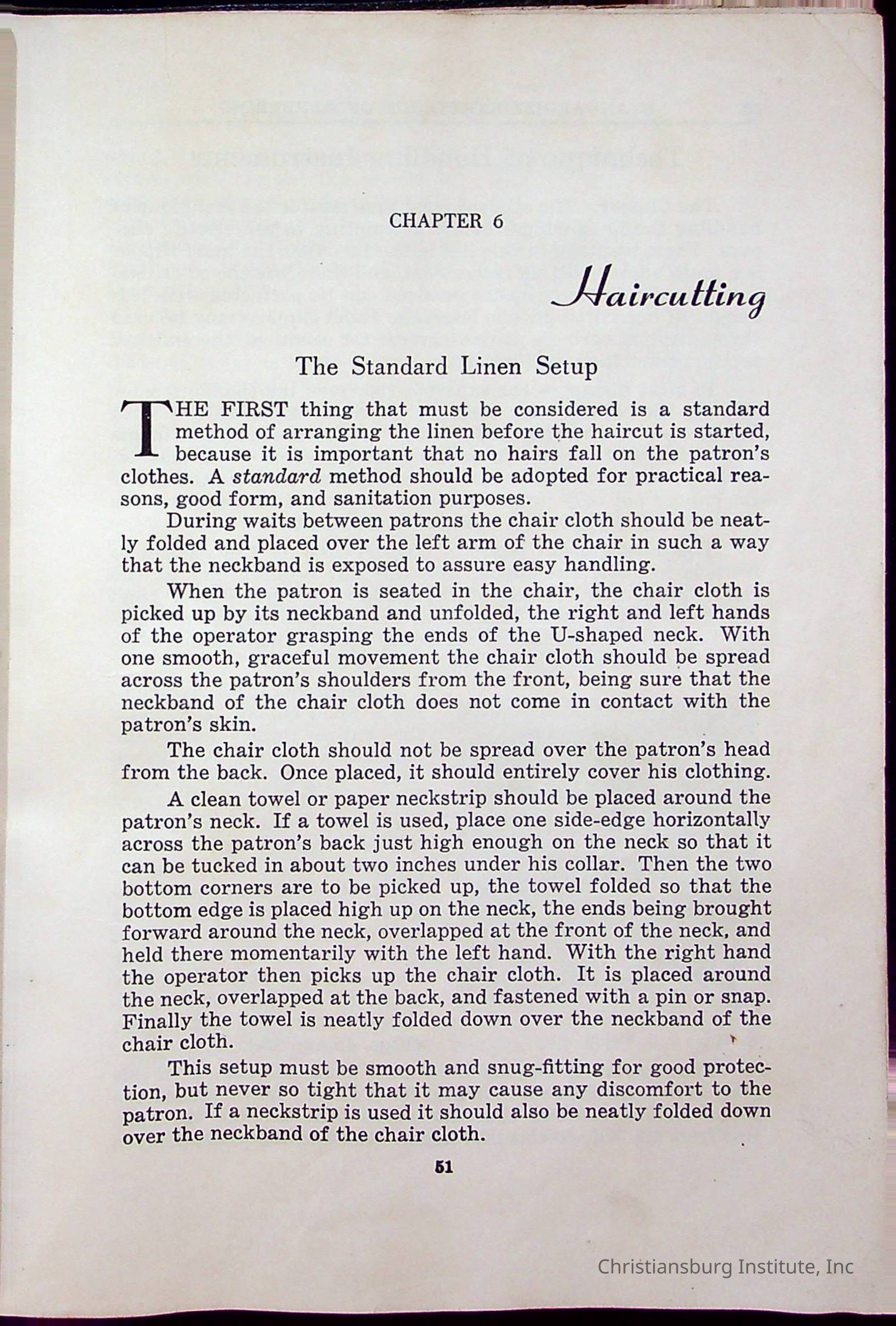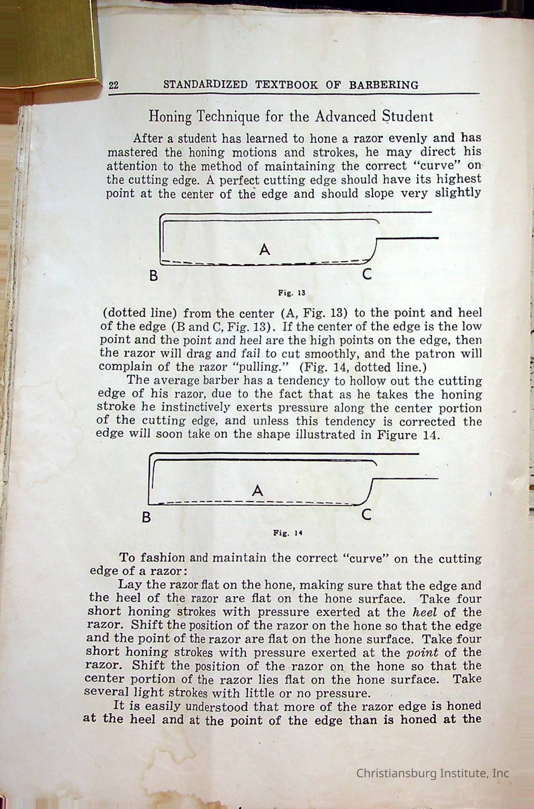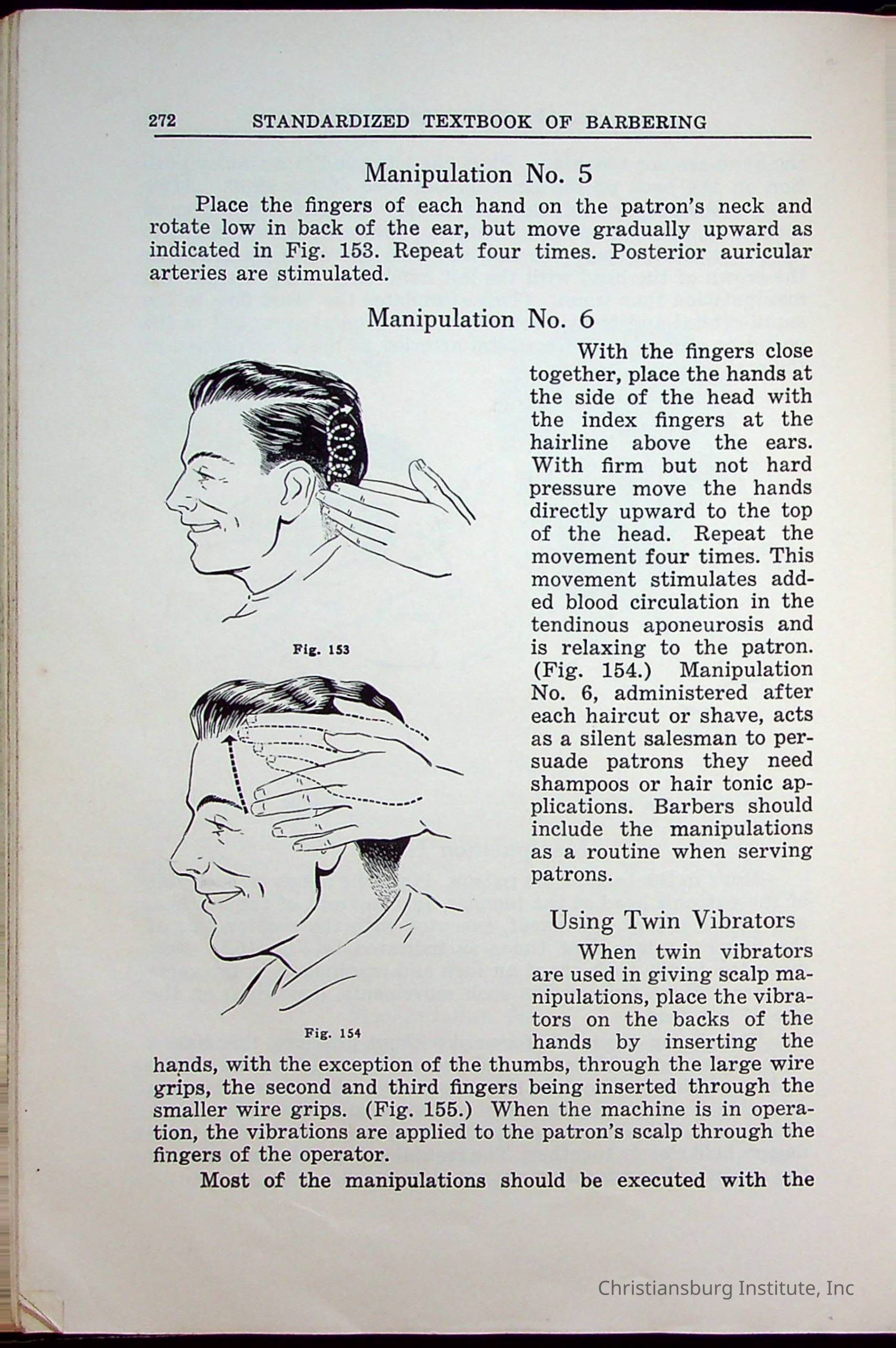 "Standardized Textbook of Barbering: in Two Parts" written and published by the Associated Master Barbers and Beauticians of America in the year 1950. This textbook was in the Christiansburg Institute library.