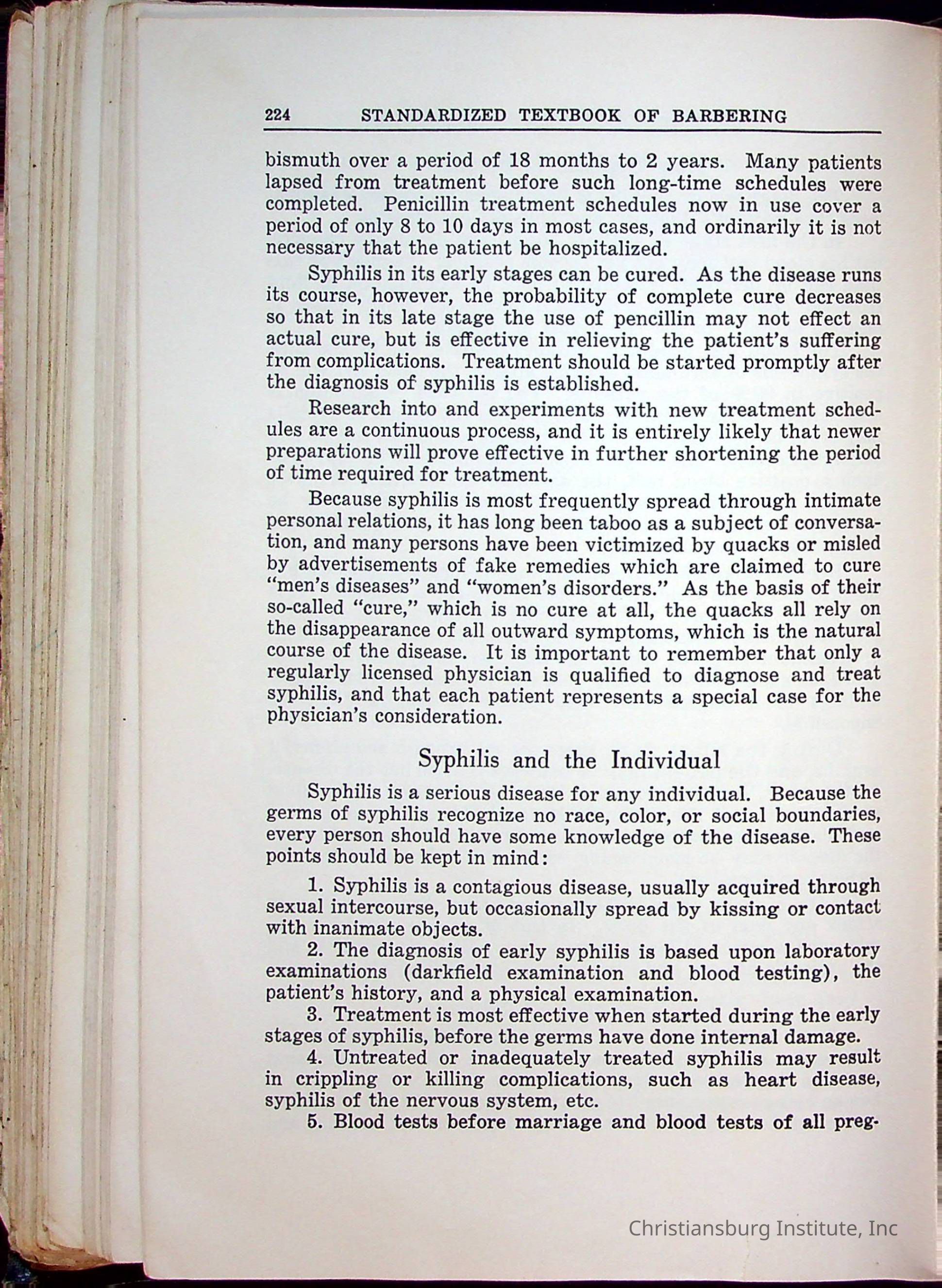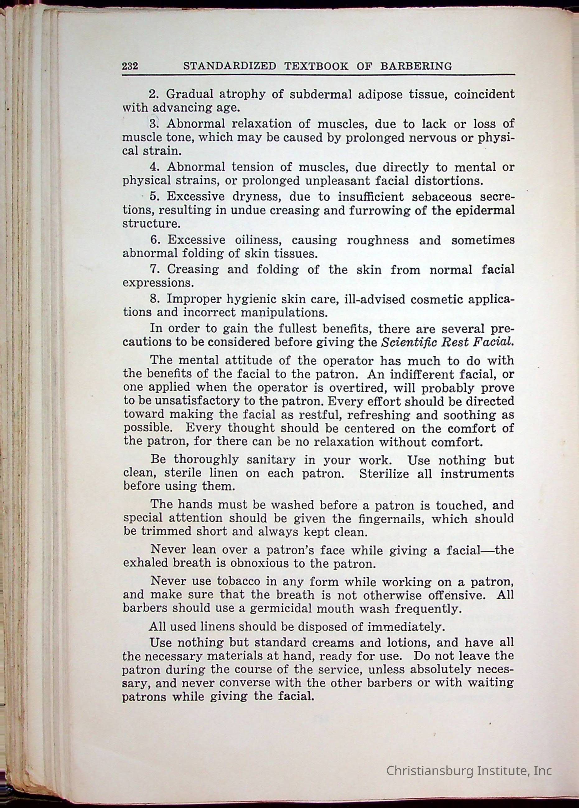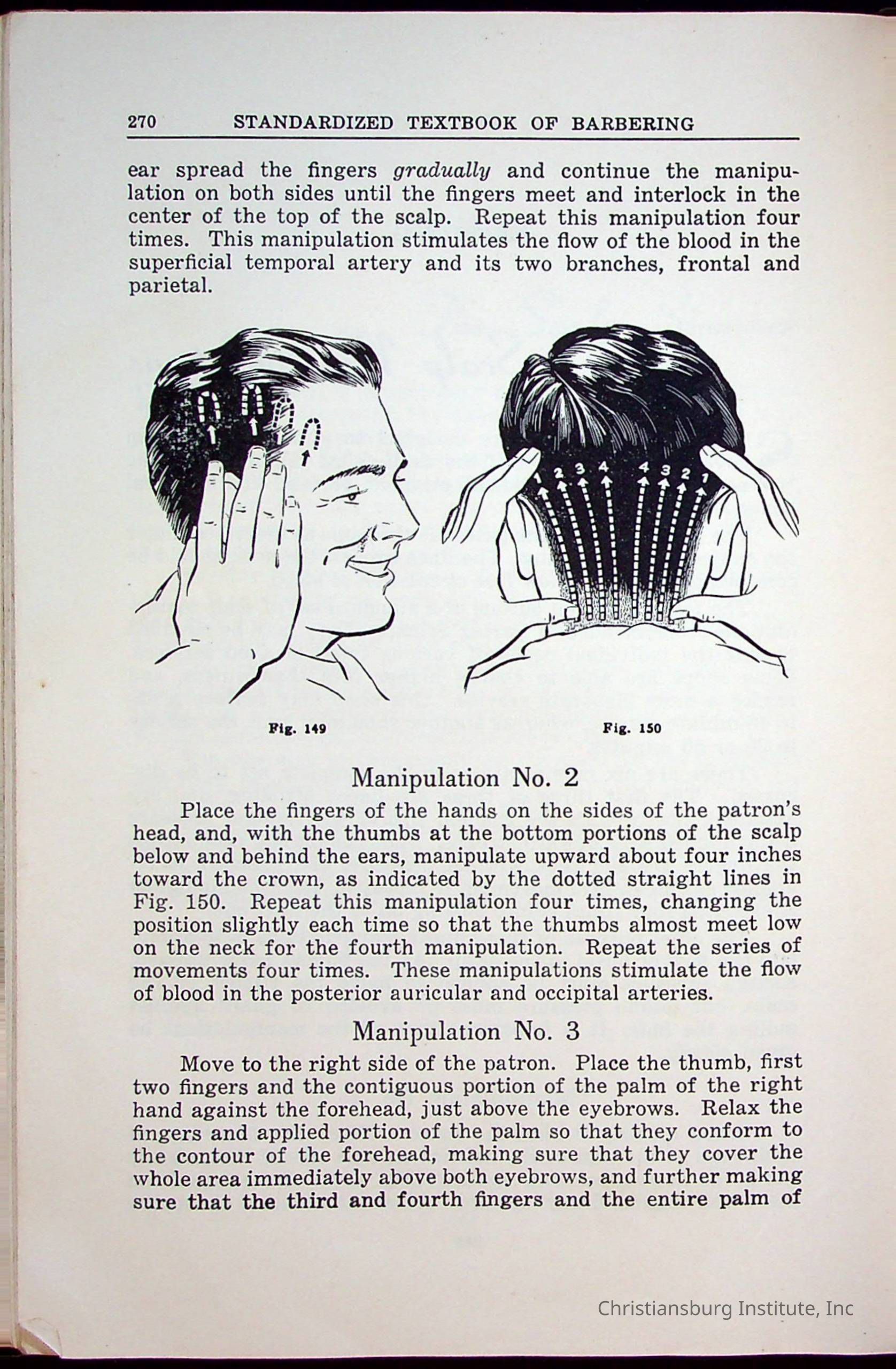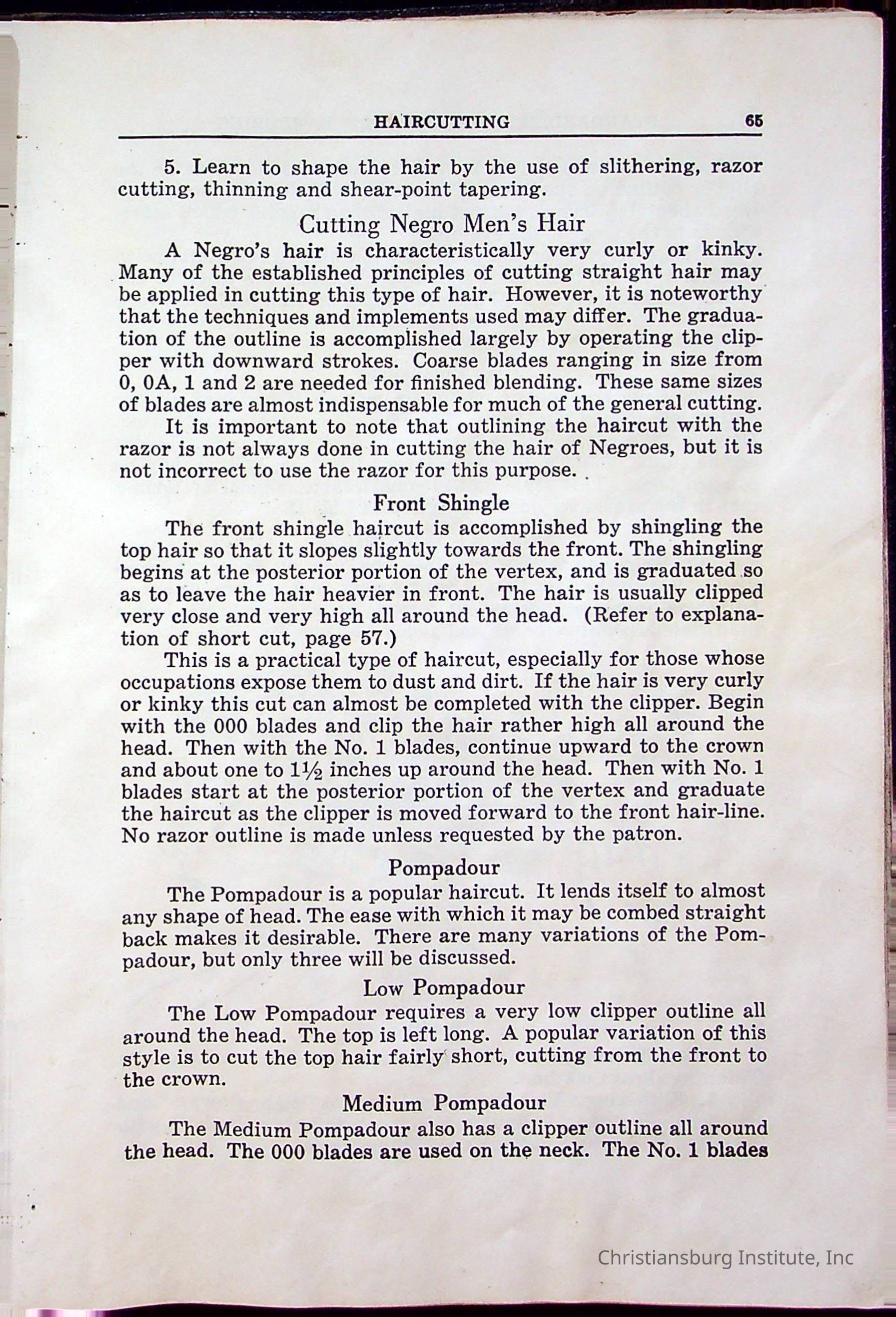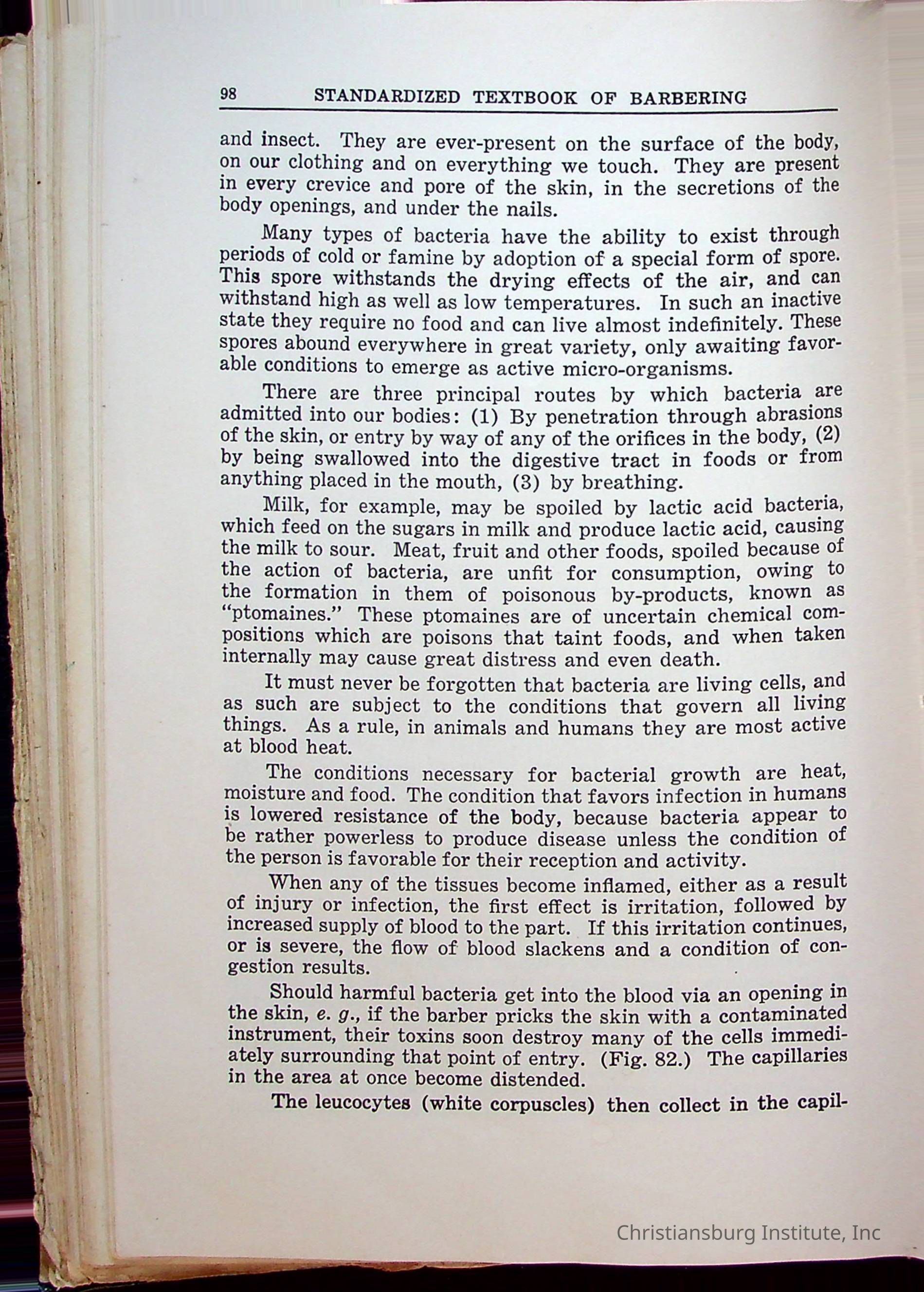 "Standardized Textbook of Barbering: in Two Parts" written and published by the Associated Master Barbers and Beauticians of America in the year 1950. This textbook was in the Christiansburg Institute library.