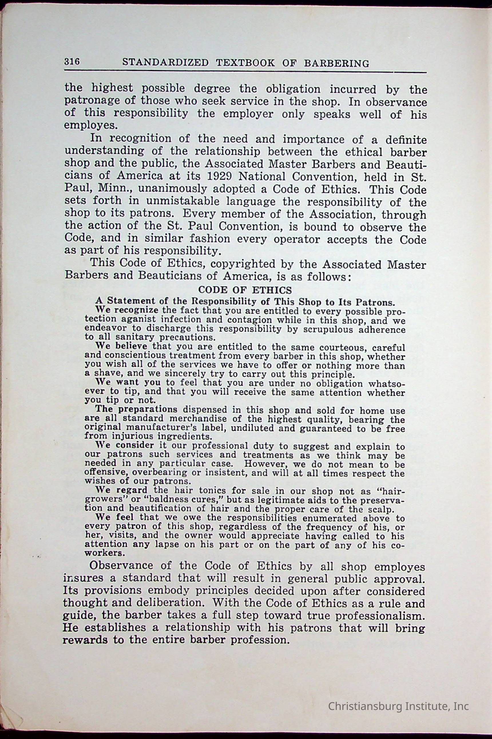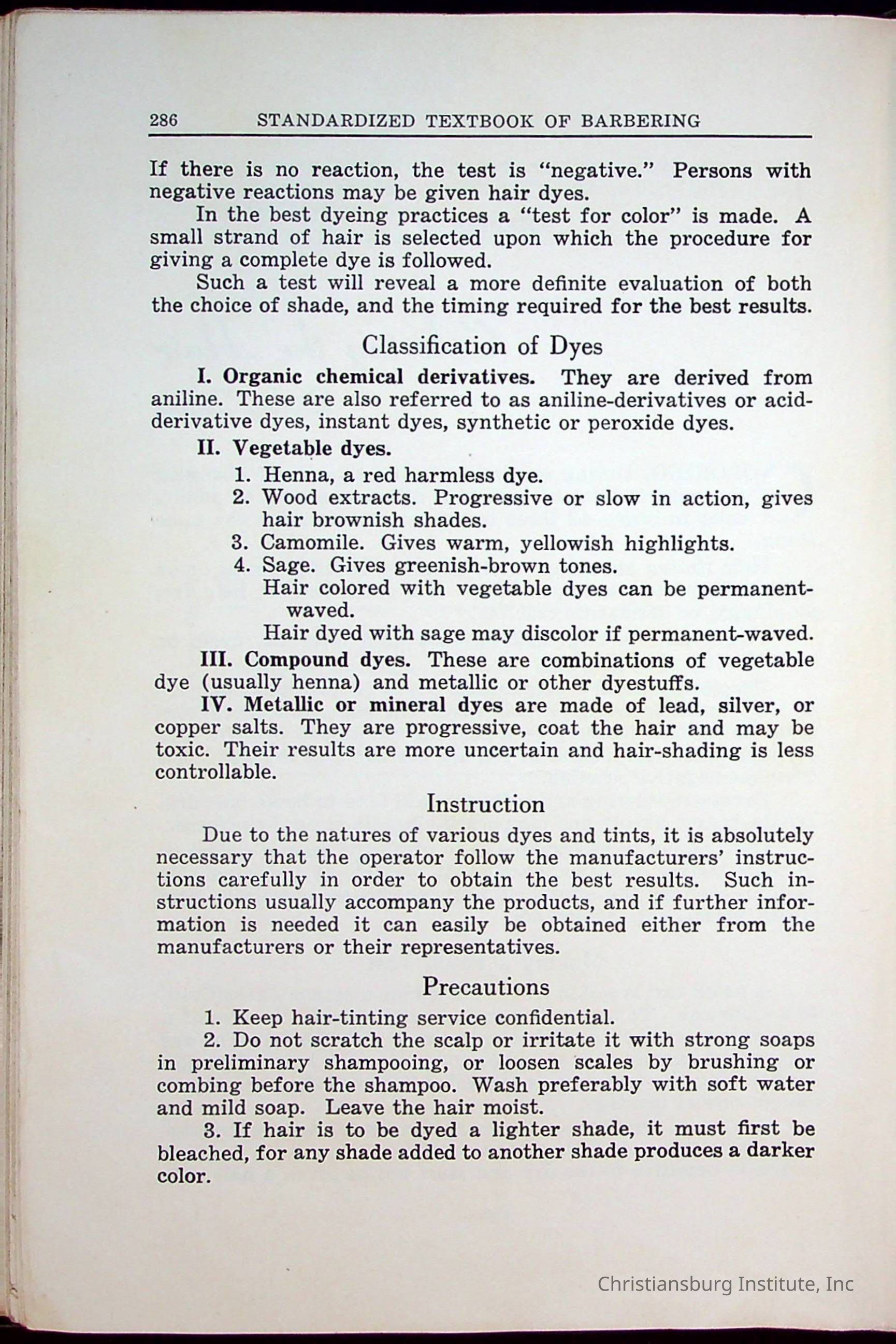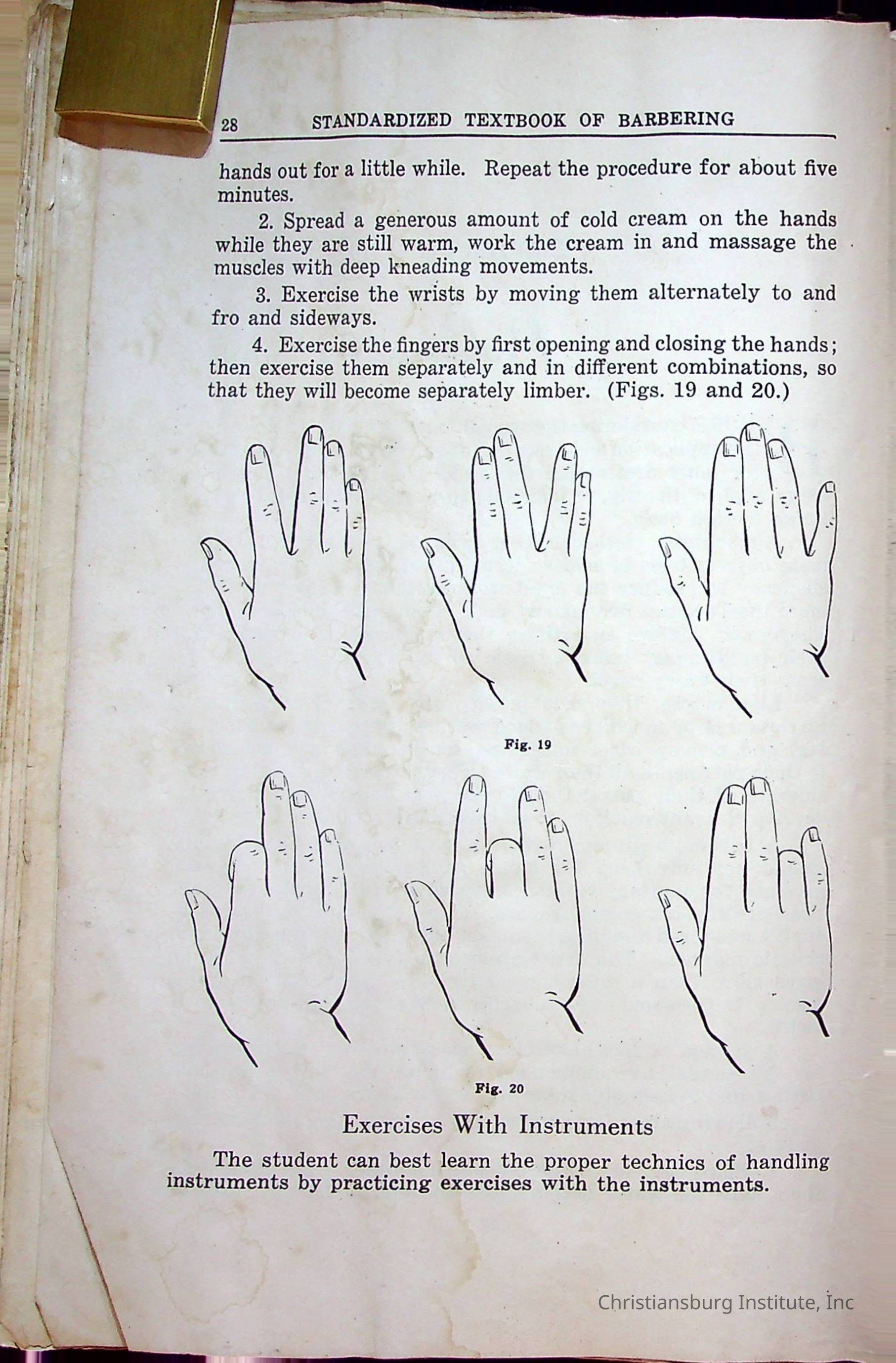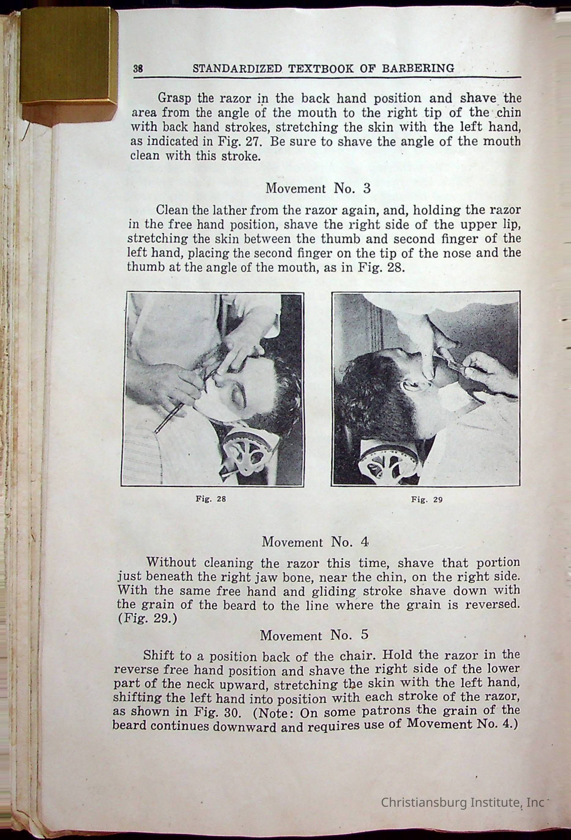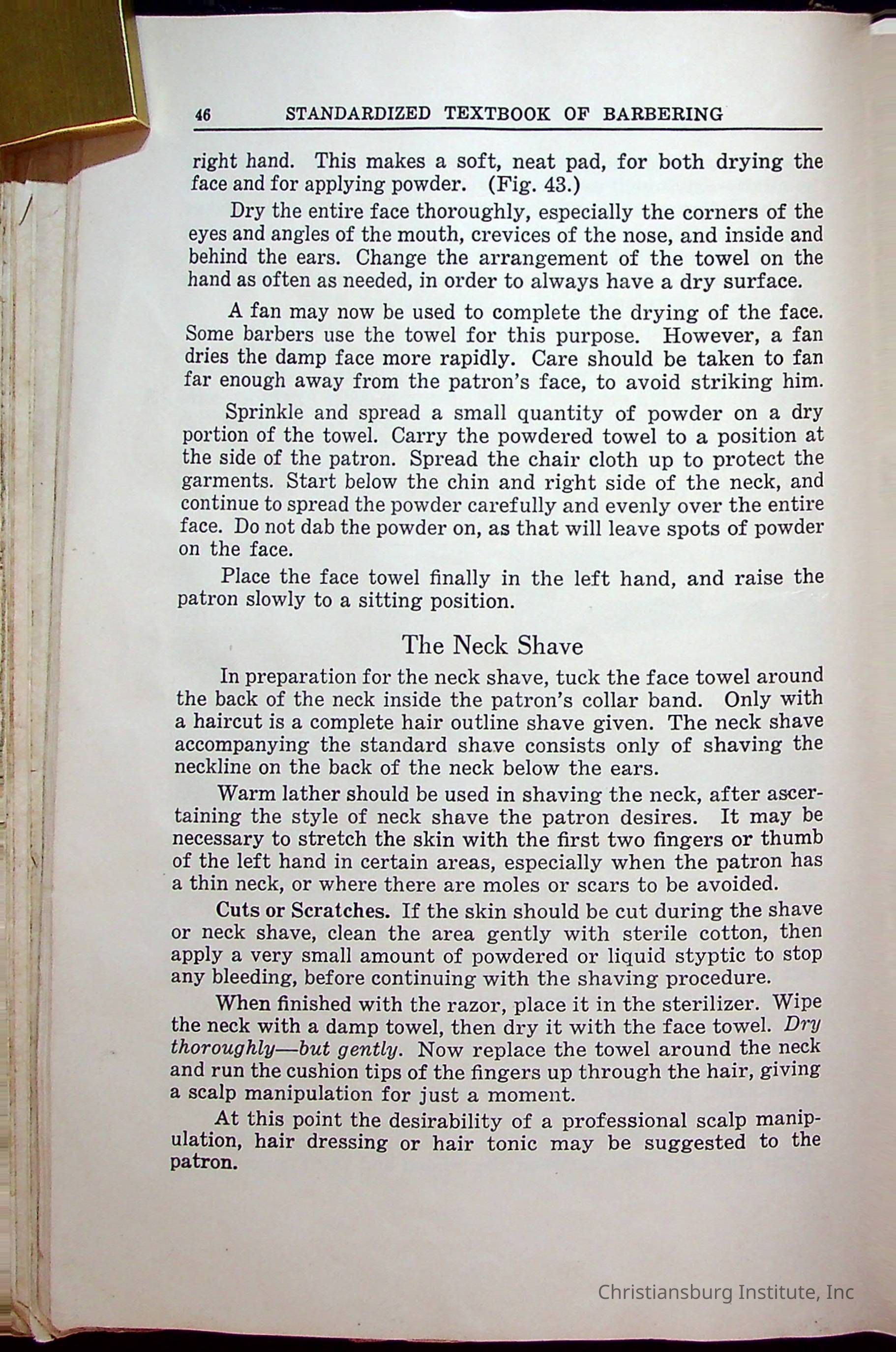 "Standardized Textbook of Barbering: in Two Parts" written and published by the Associated Master Barbers and Beauticians of America in the year 1950. This textbook was in the Christiansburg Institute library.
