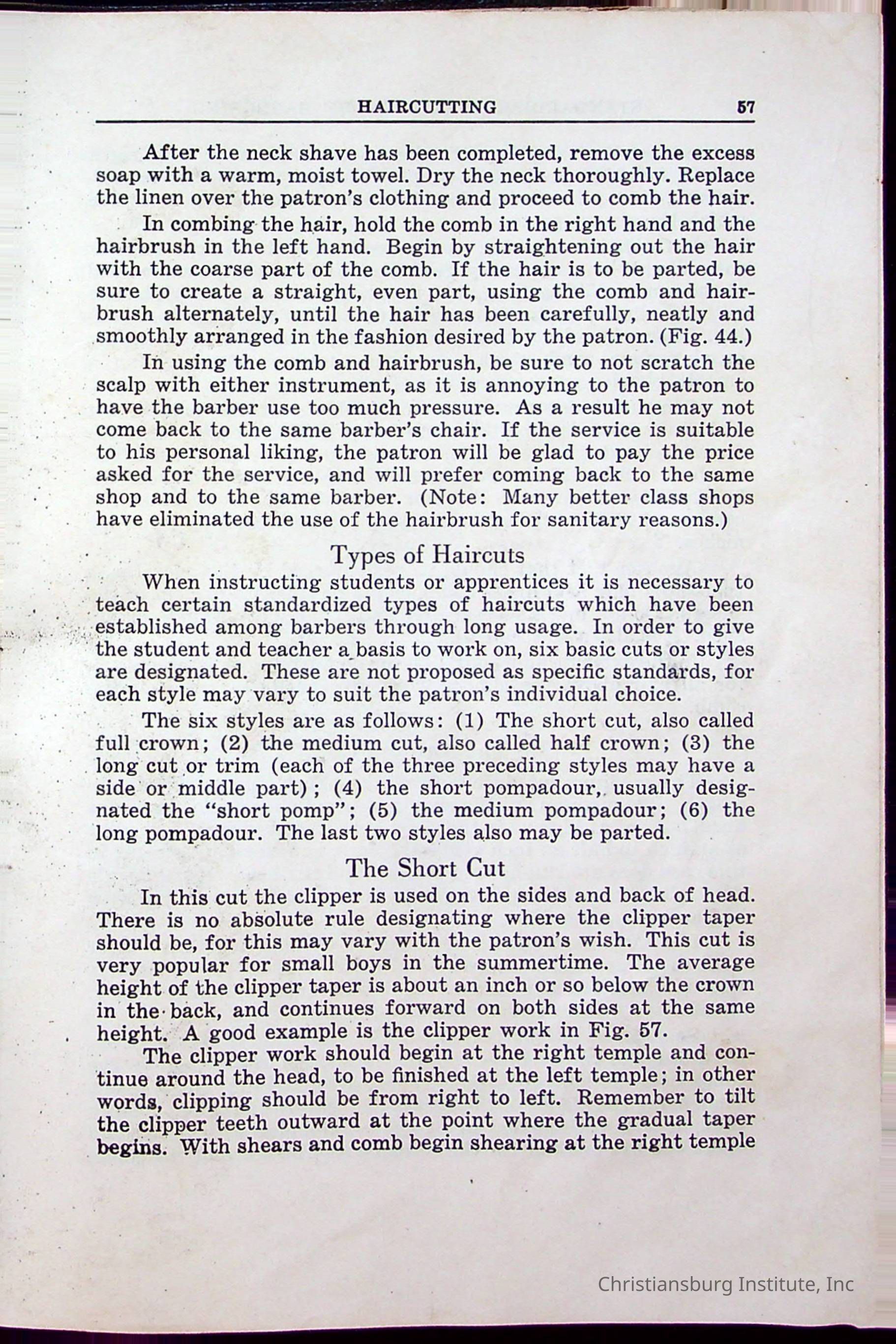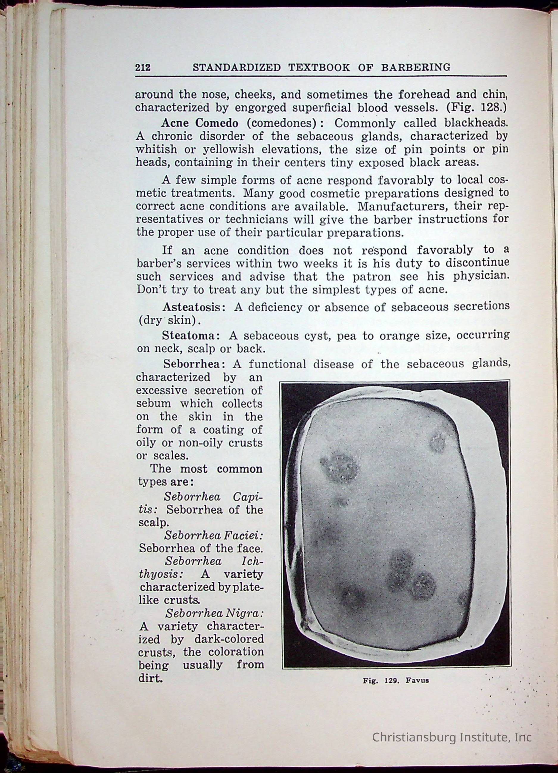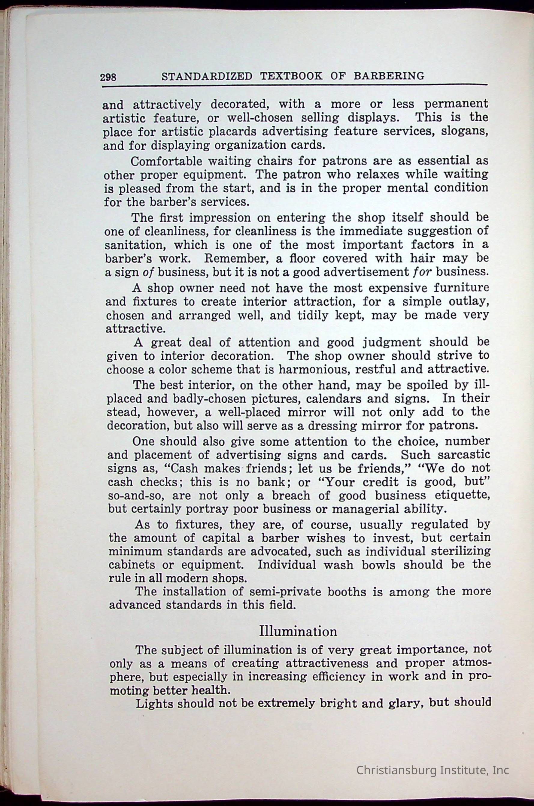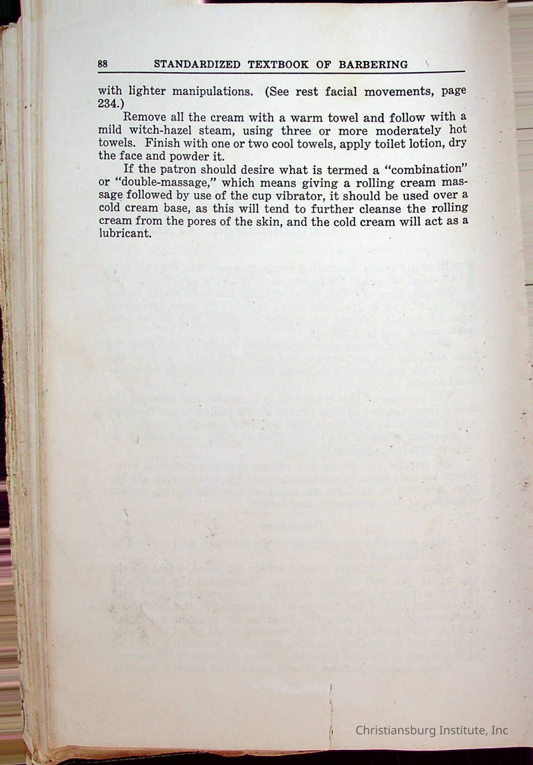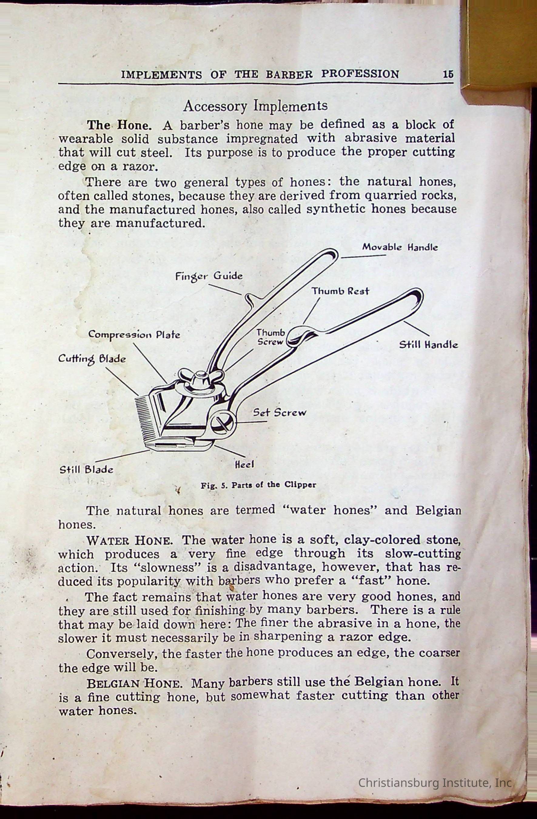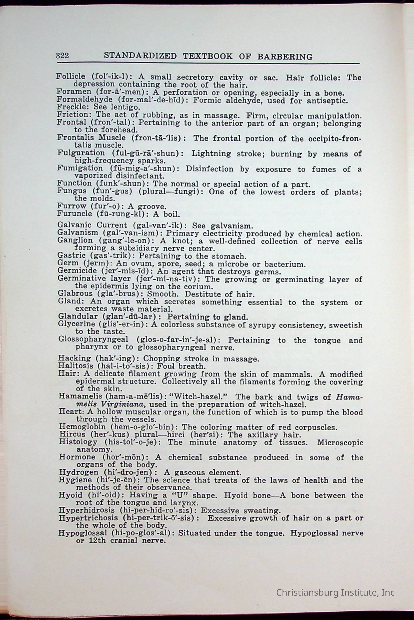 "Standardized Textbook of Barbering: in Two Parts" written and published by the Associated Master Barbers and Beauticians of America in the year 1950. This textbook was in the Christiansburg Institute library.