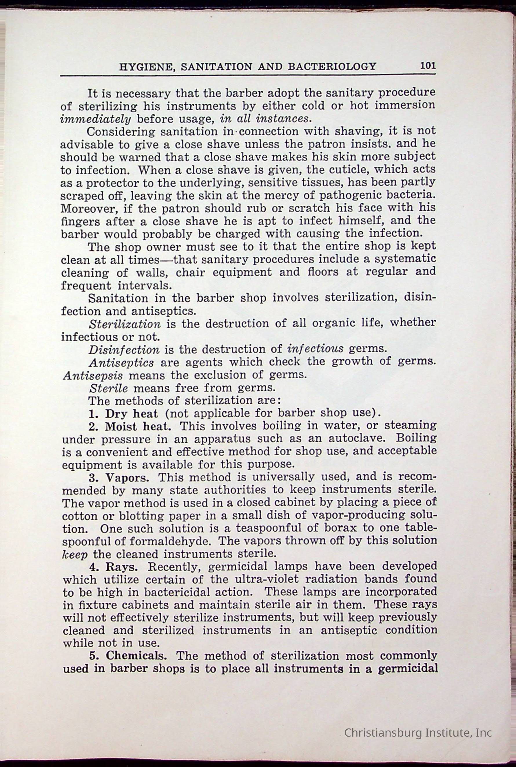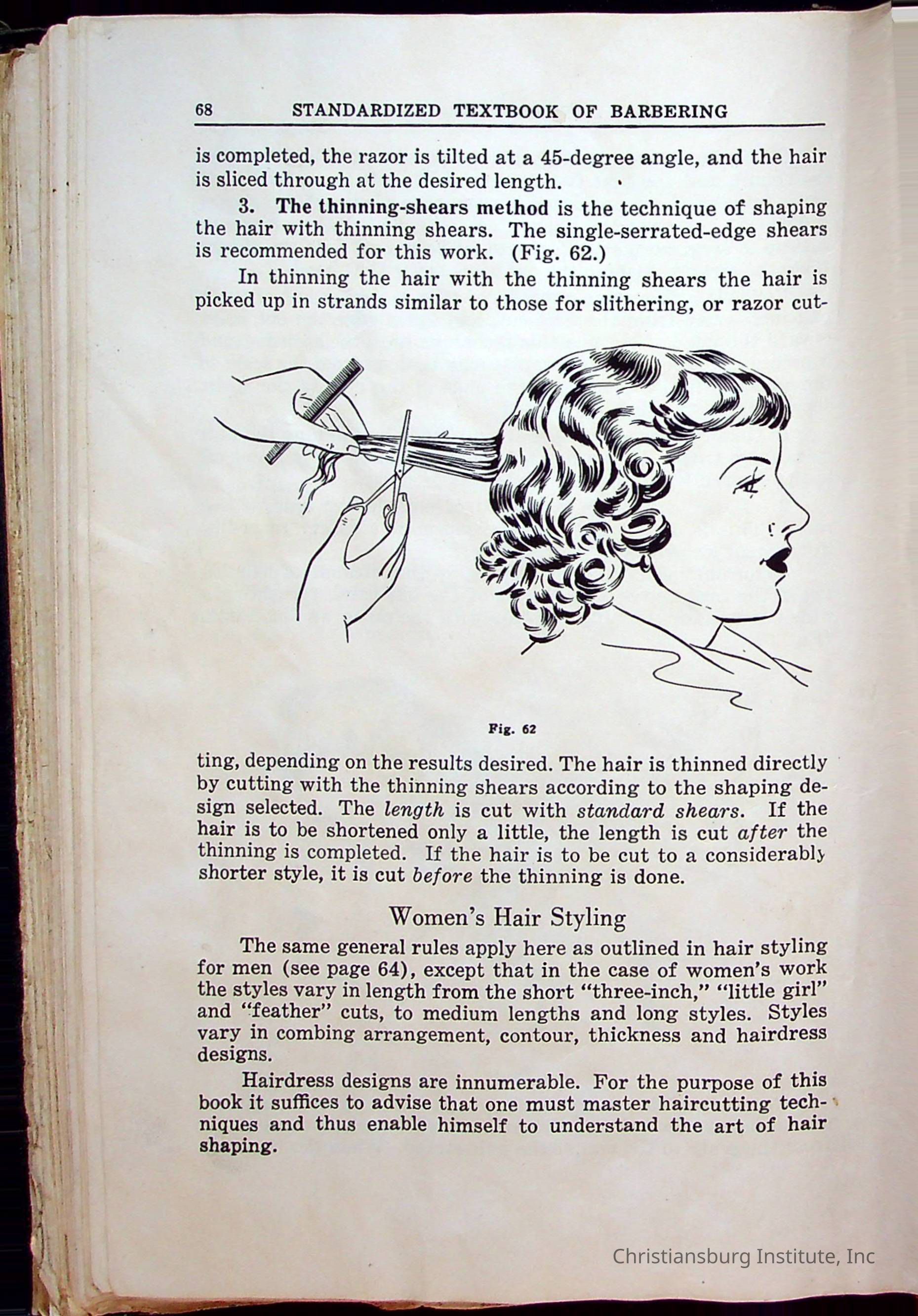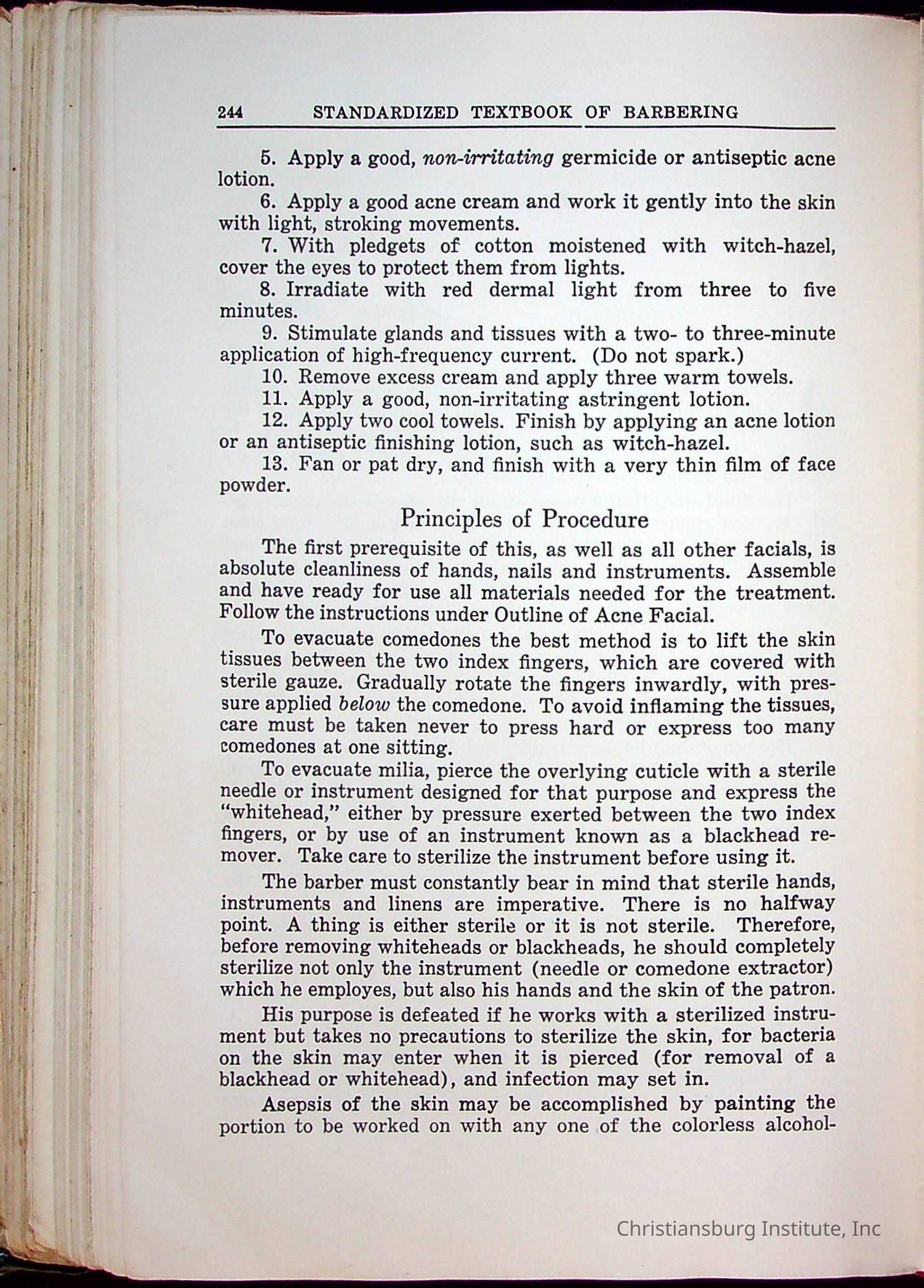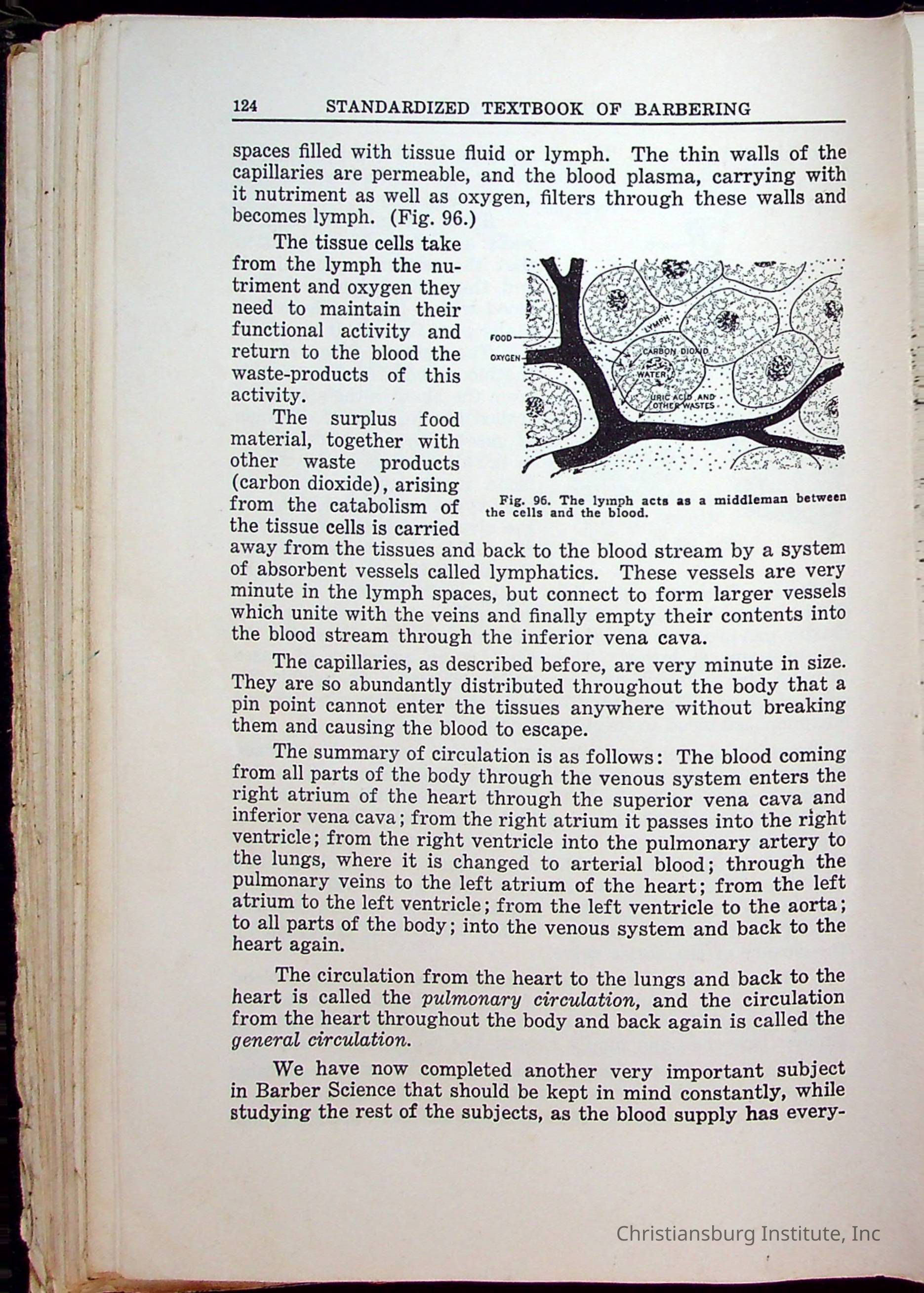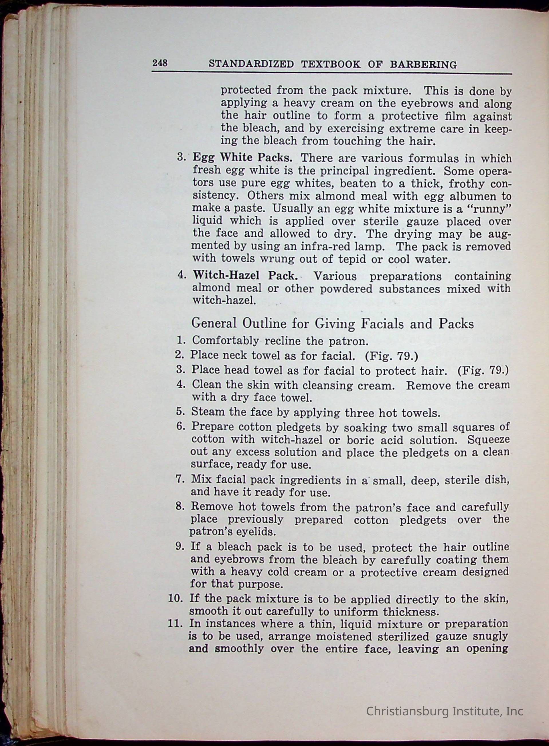 "Standardized Textbook of Barbering: in Two Parts" written and published by the Associated Master Barbers and Beauticians of America in the year 1950. This textbook was in the Christiansburg Institute library.