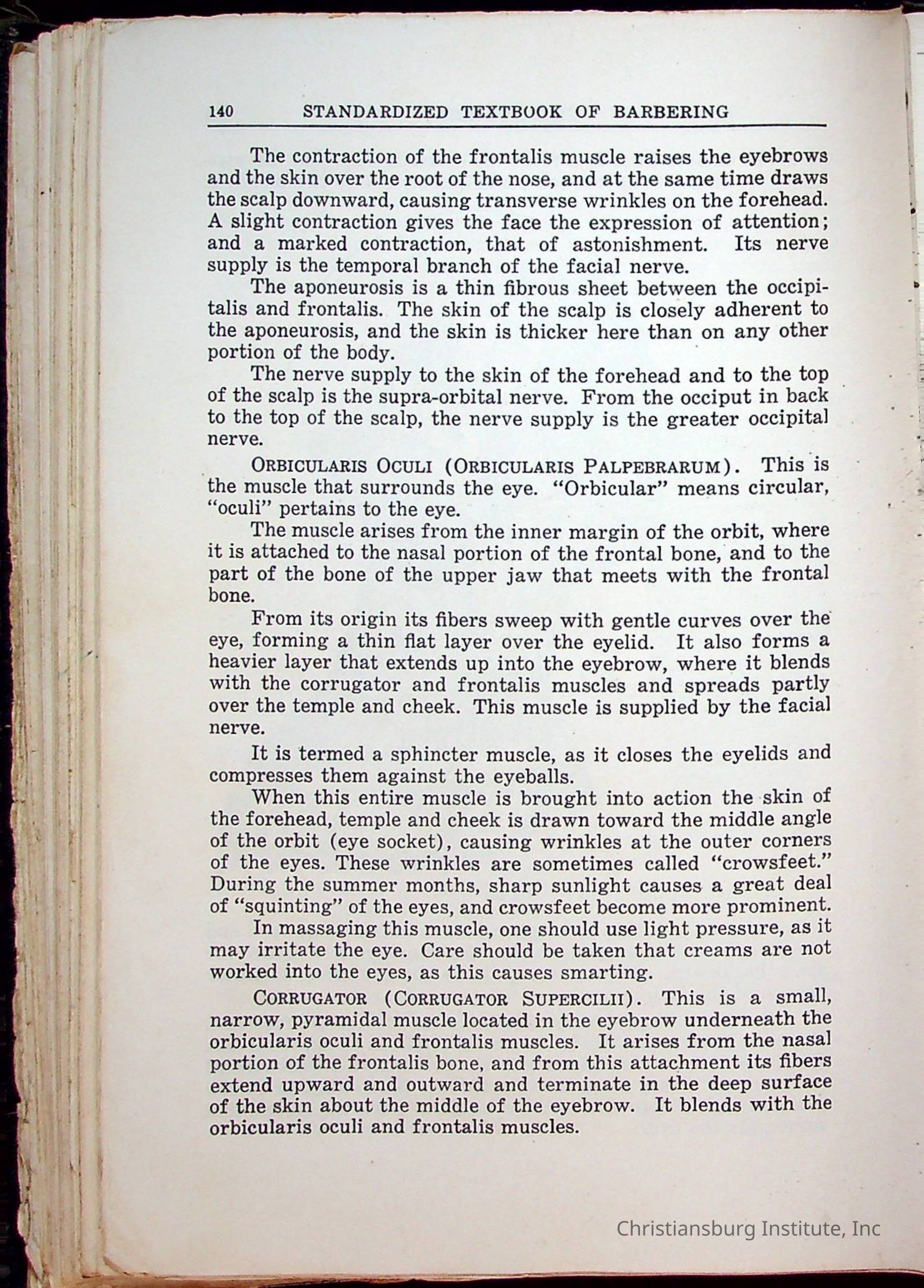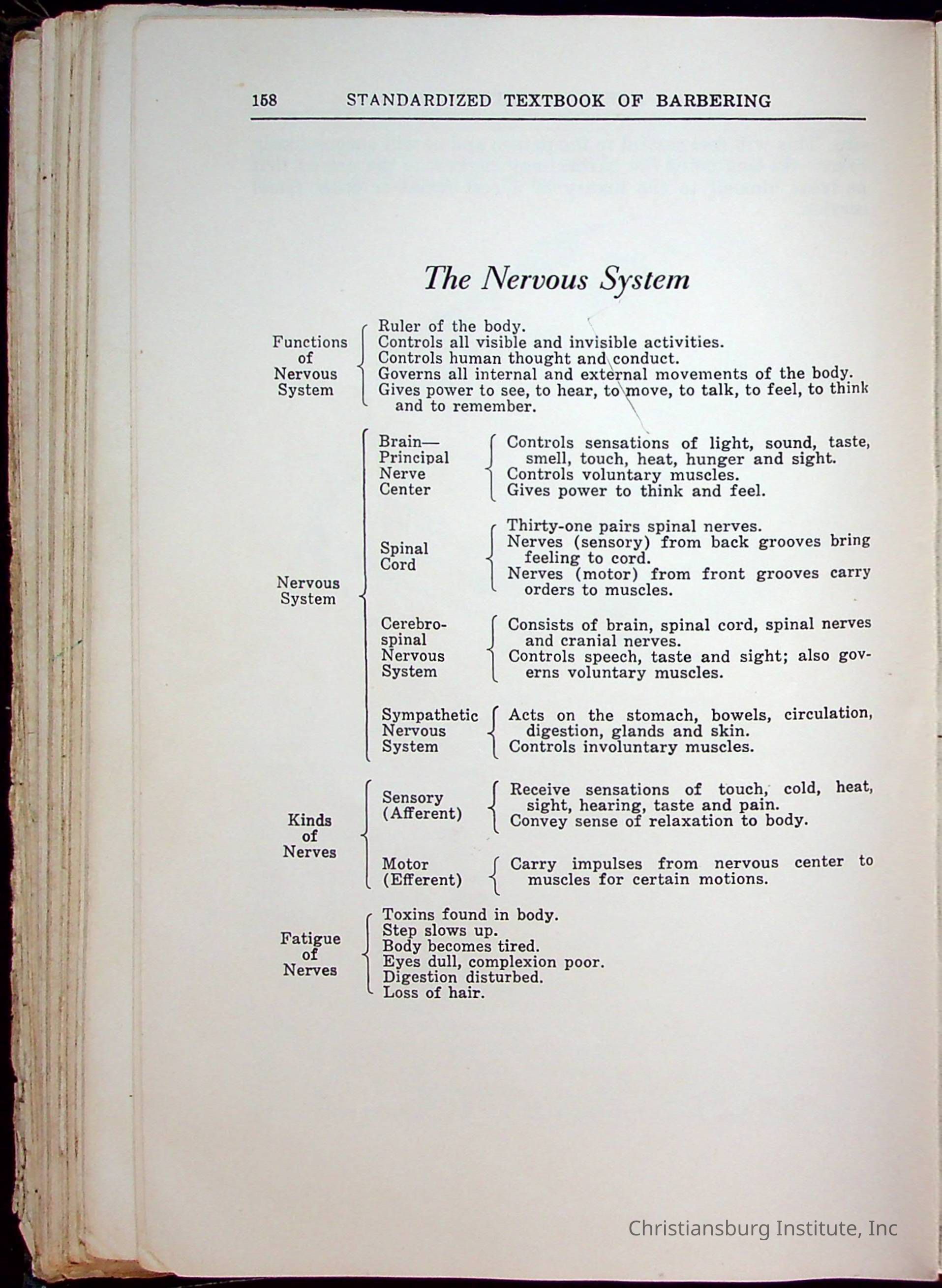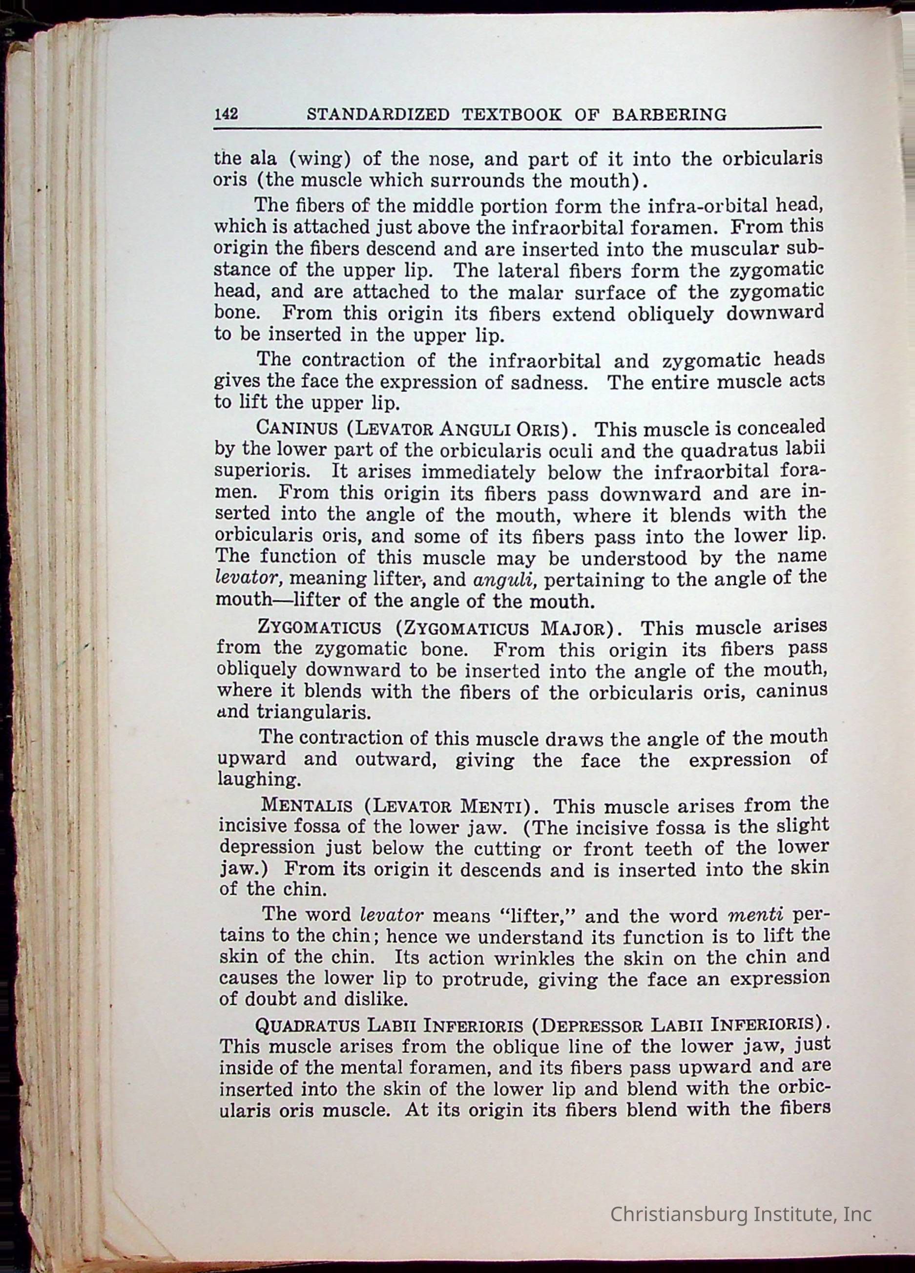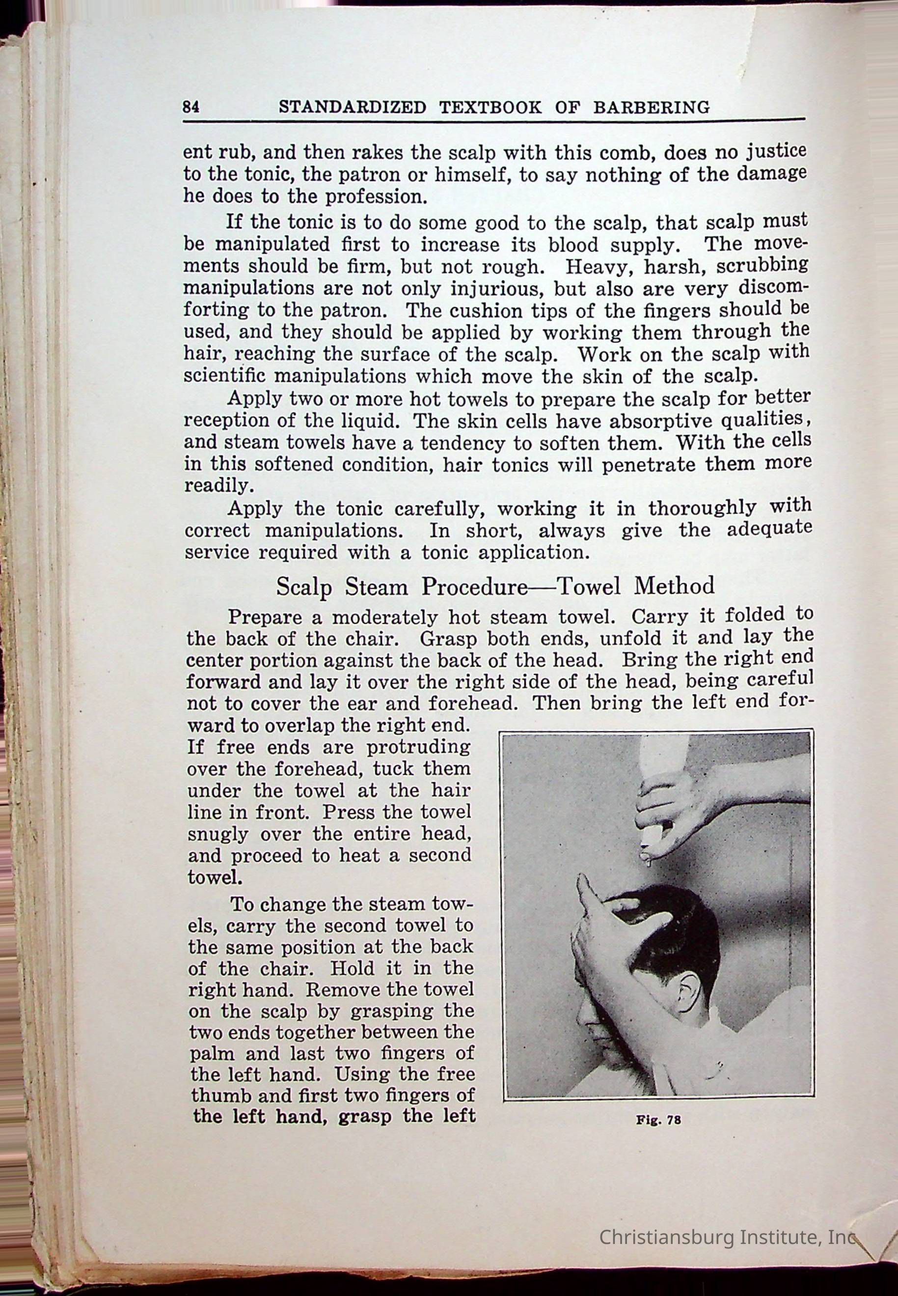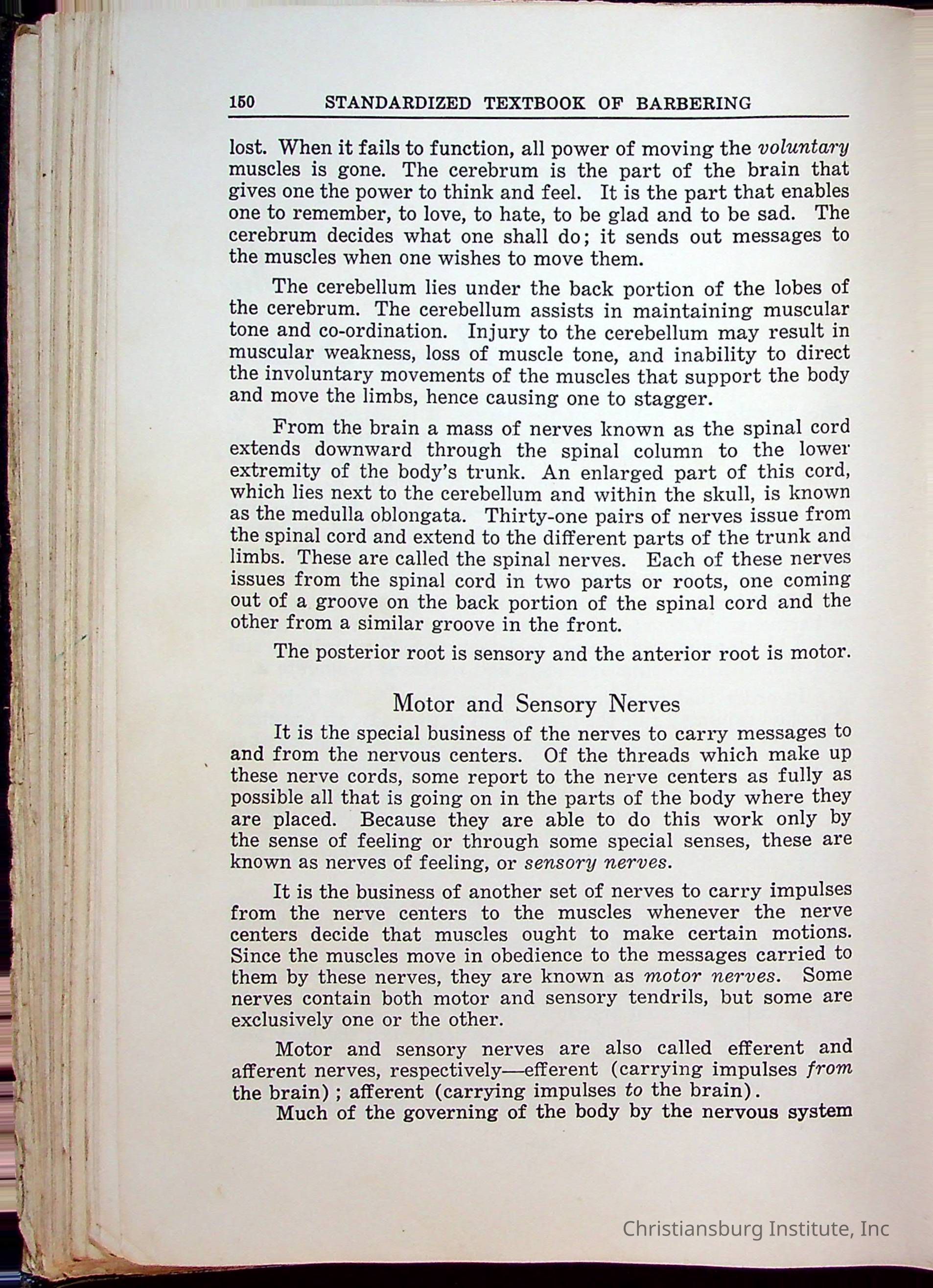 "Standardized Textbook of Barbering: in Two Parts" written and published by the Associated Master Barbers and Beauticians of America in the year 1950. This textbook was in the Christiansburg Institute library.