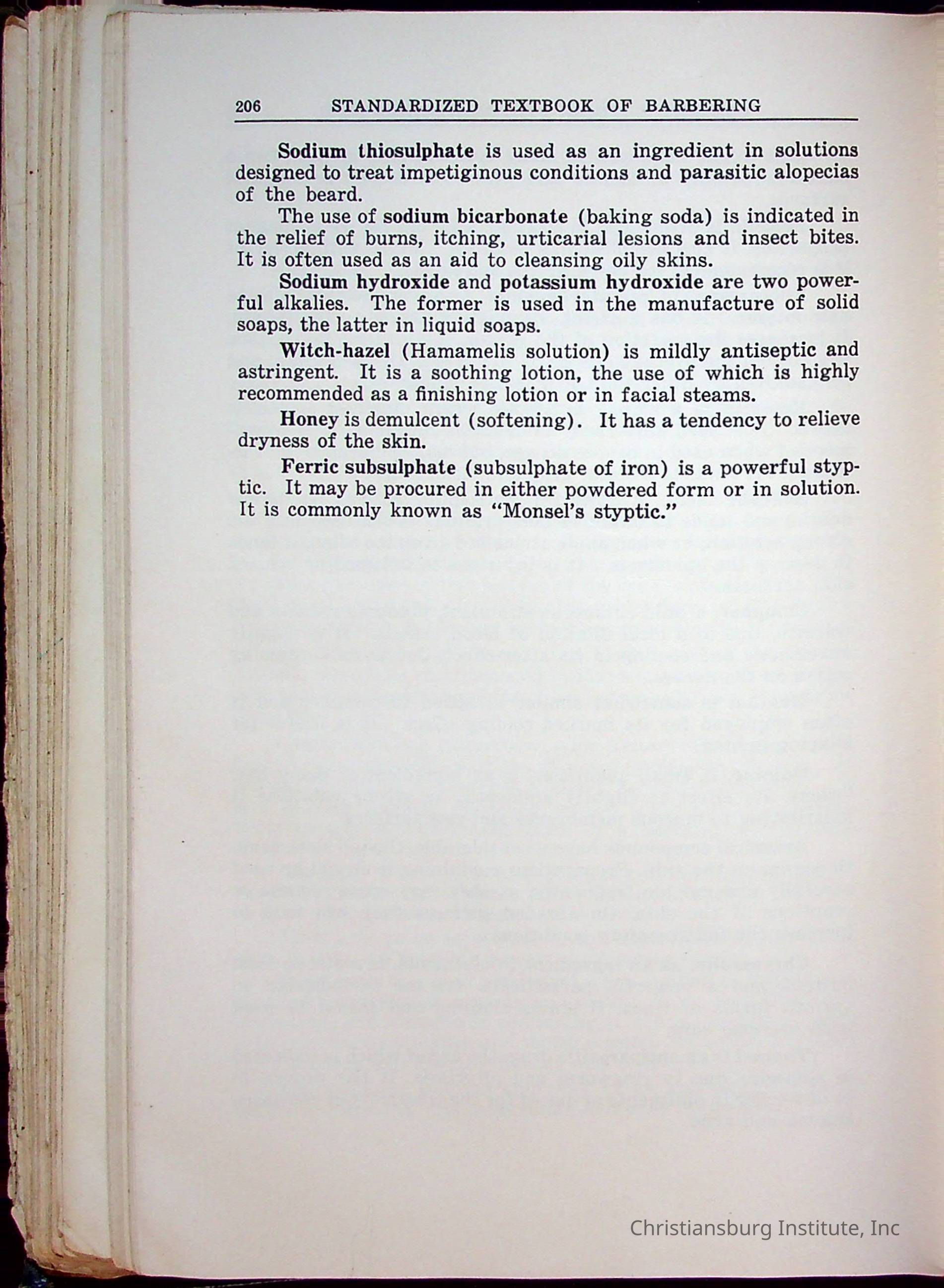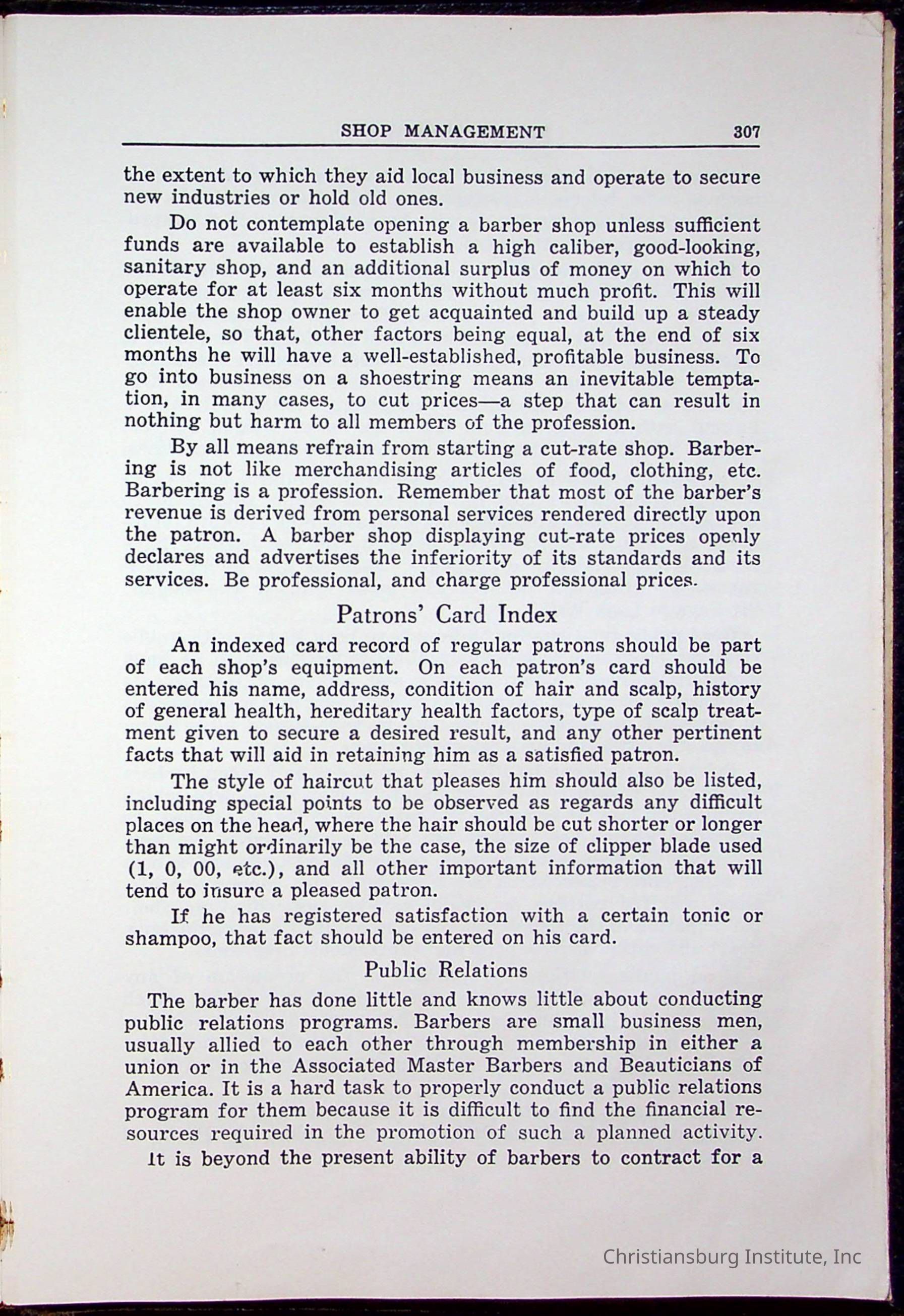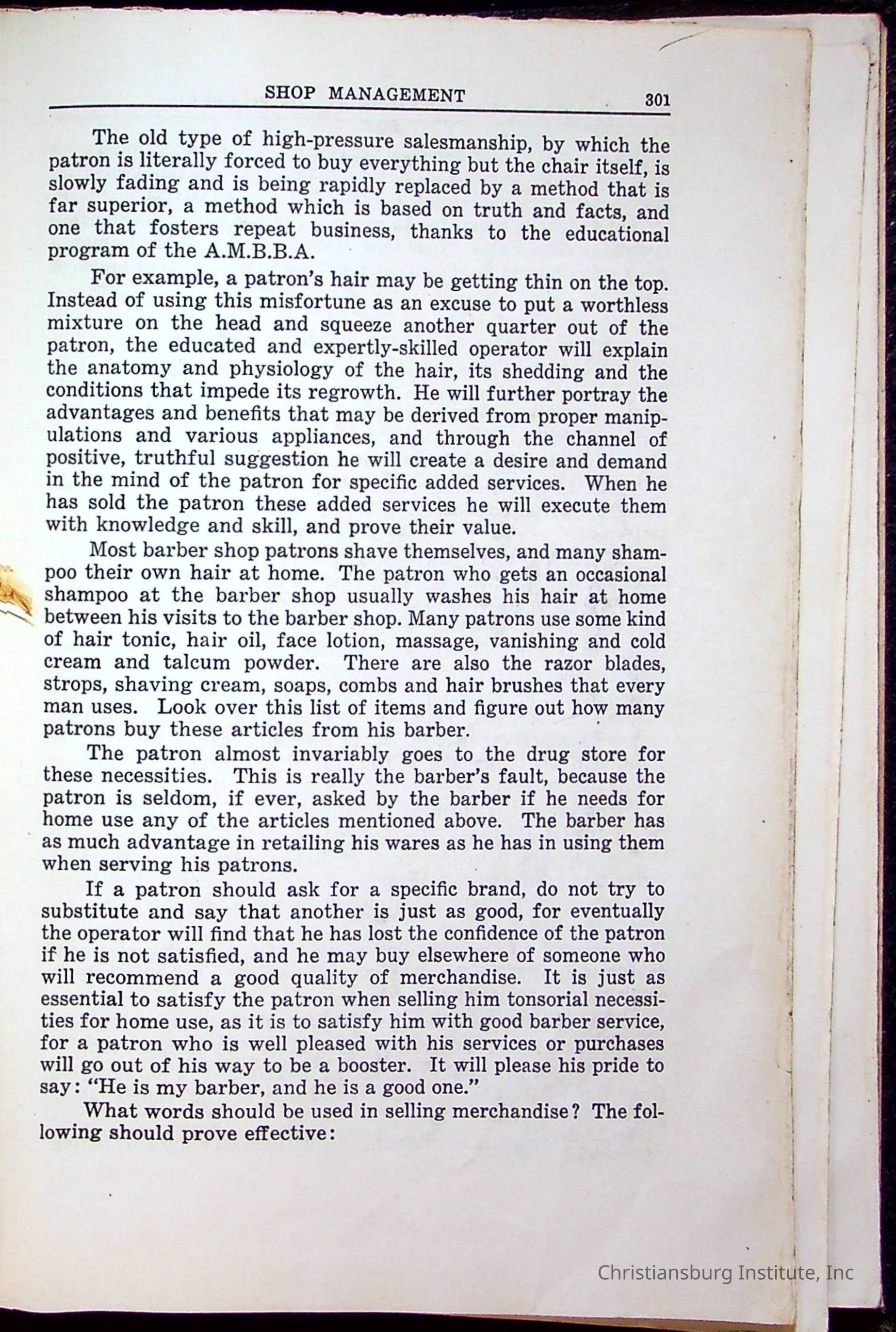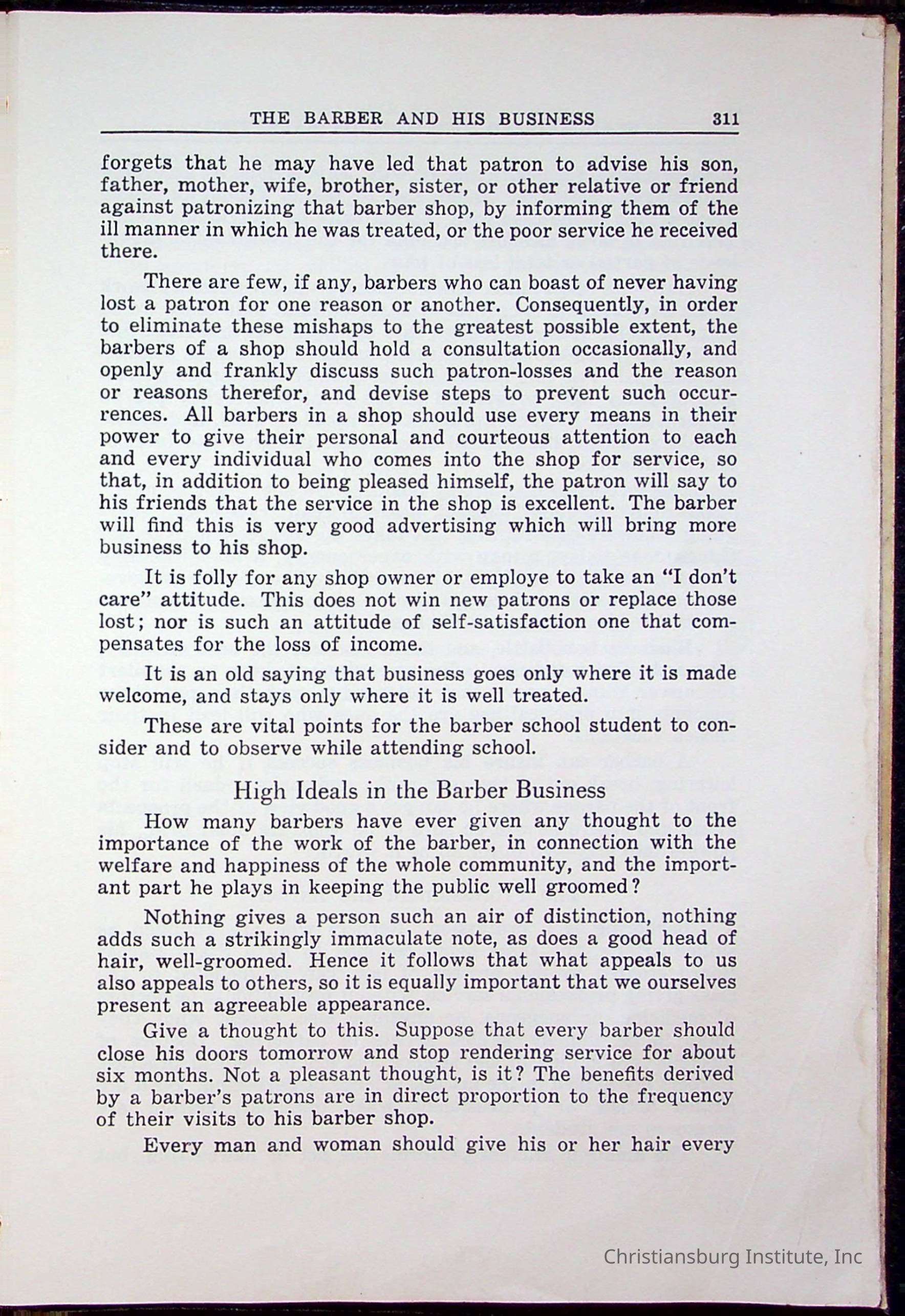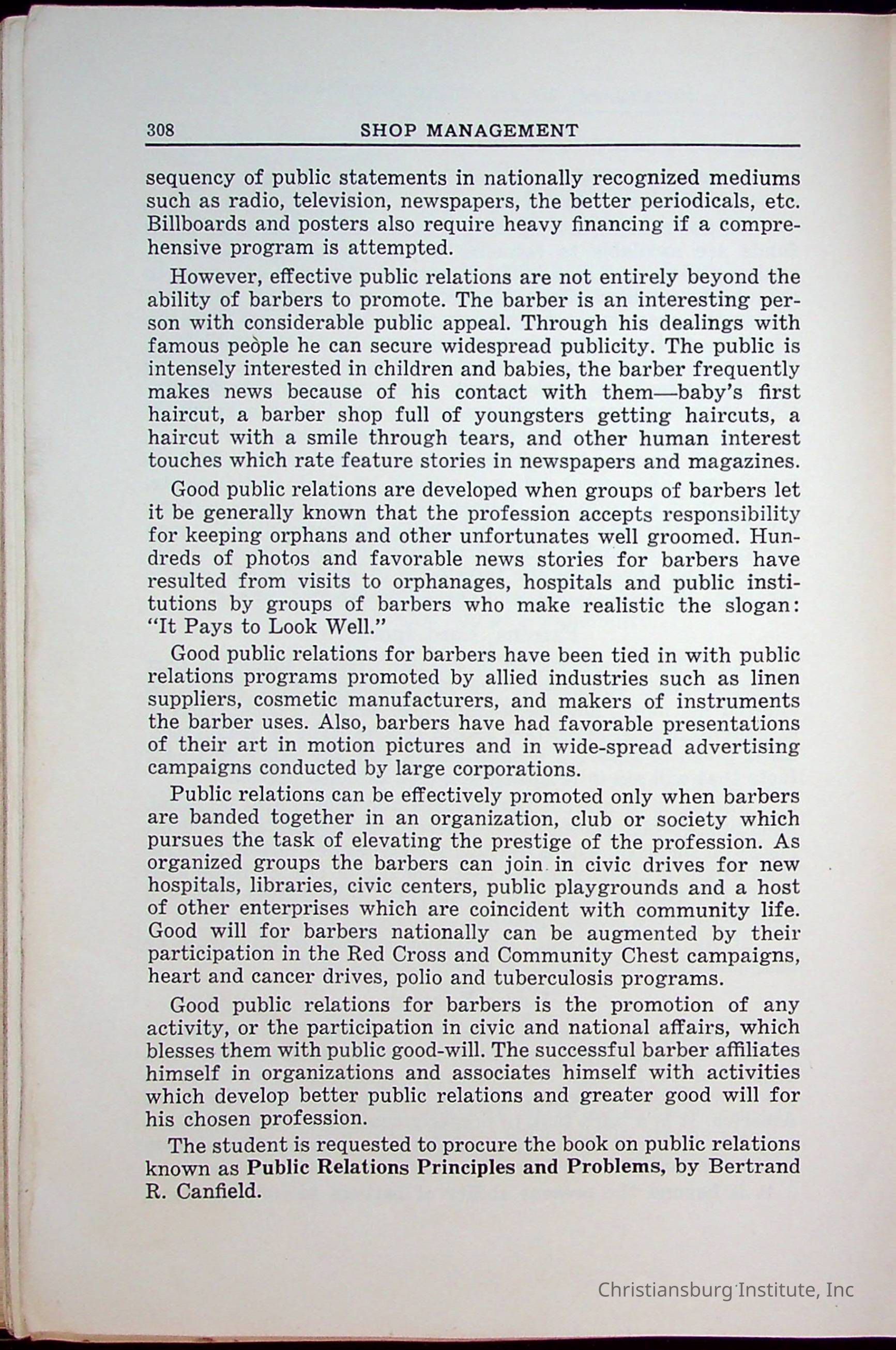 "Standardized Textbook of Barbering: in Two Parts" written and published by the Associated Master Barbers and Beauticians of America in the year 1950. This textbook was in the Christiansburg Institute library.