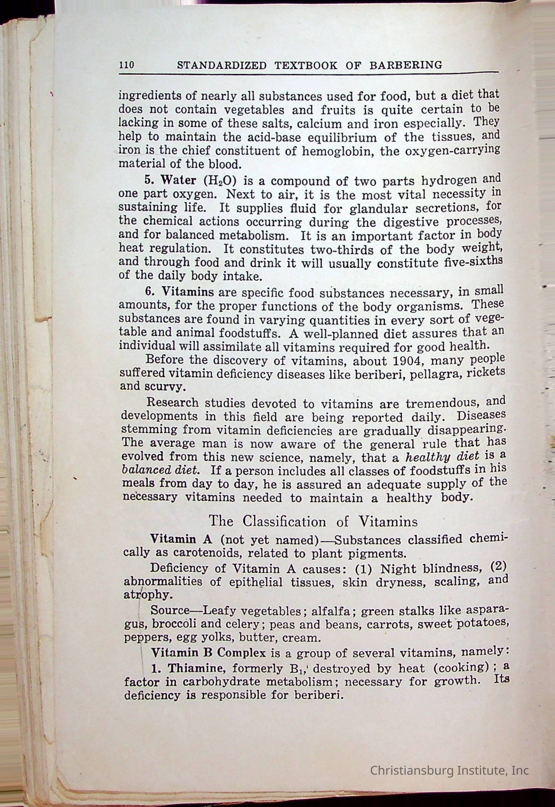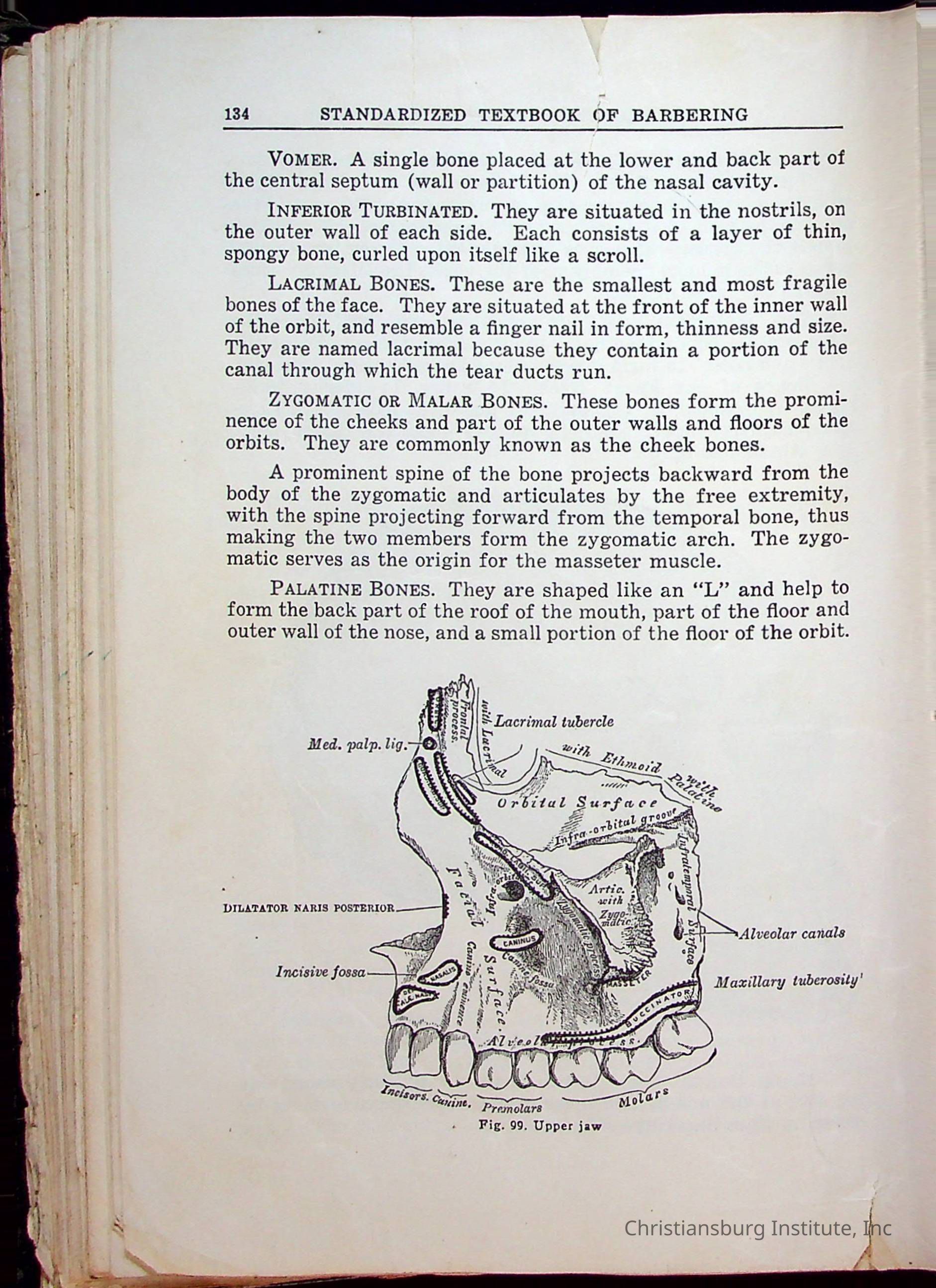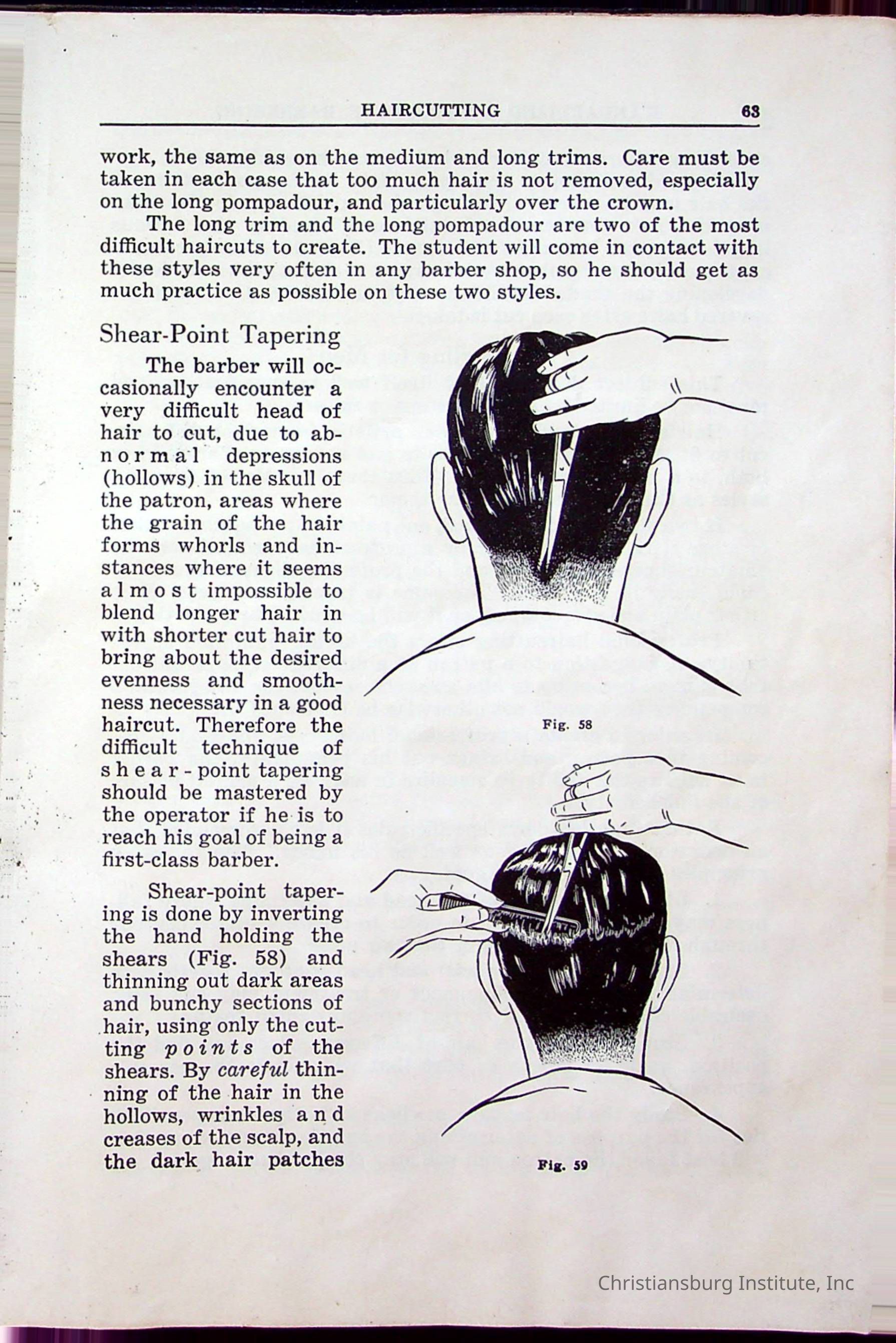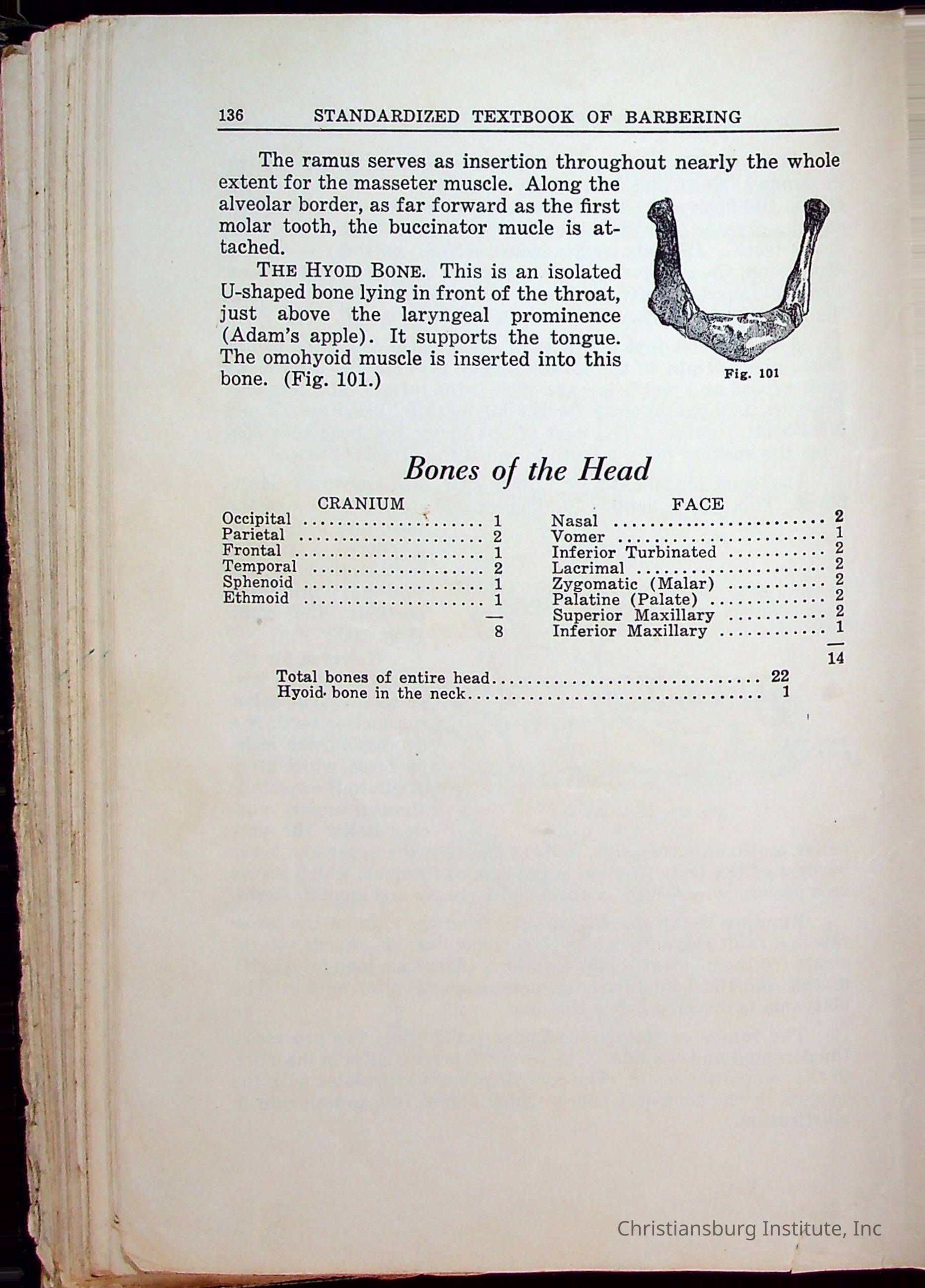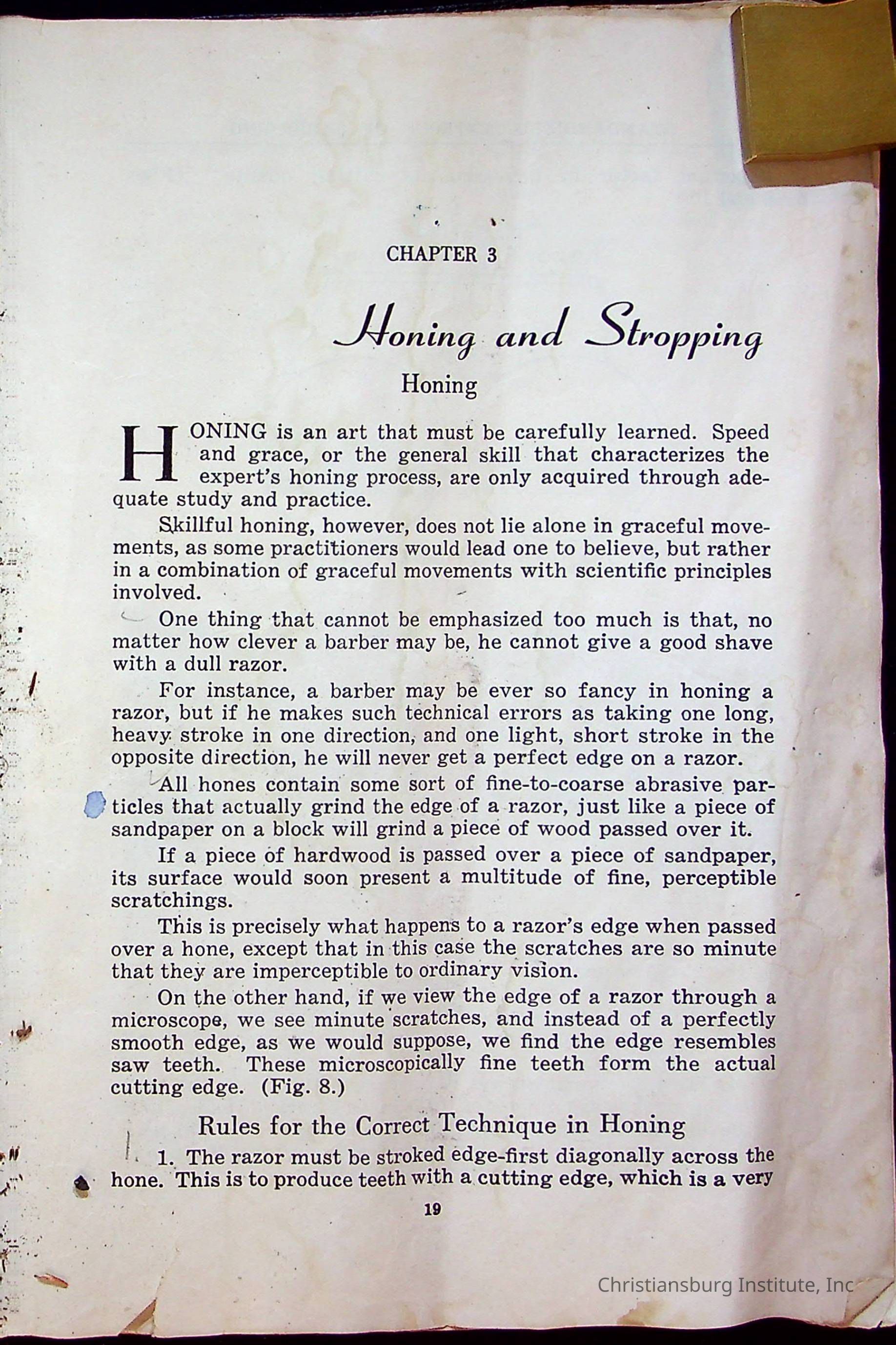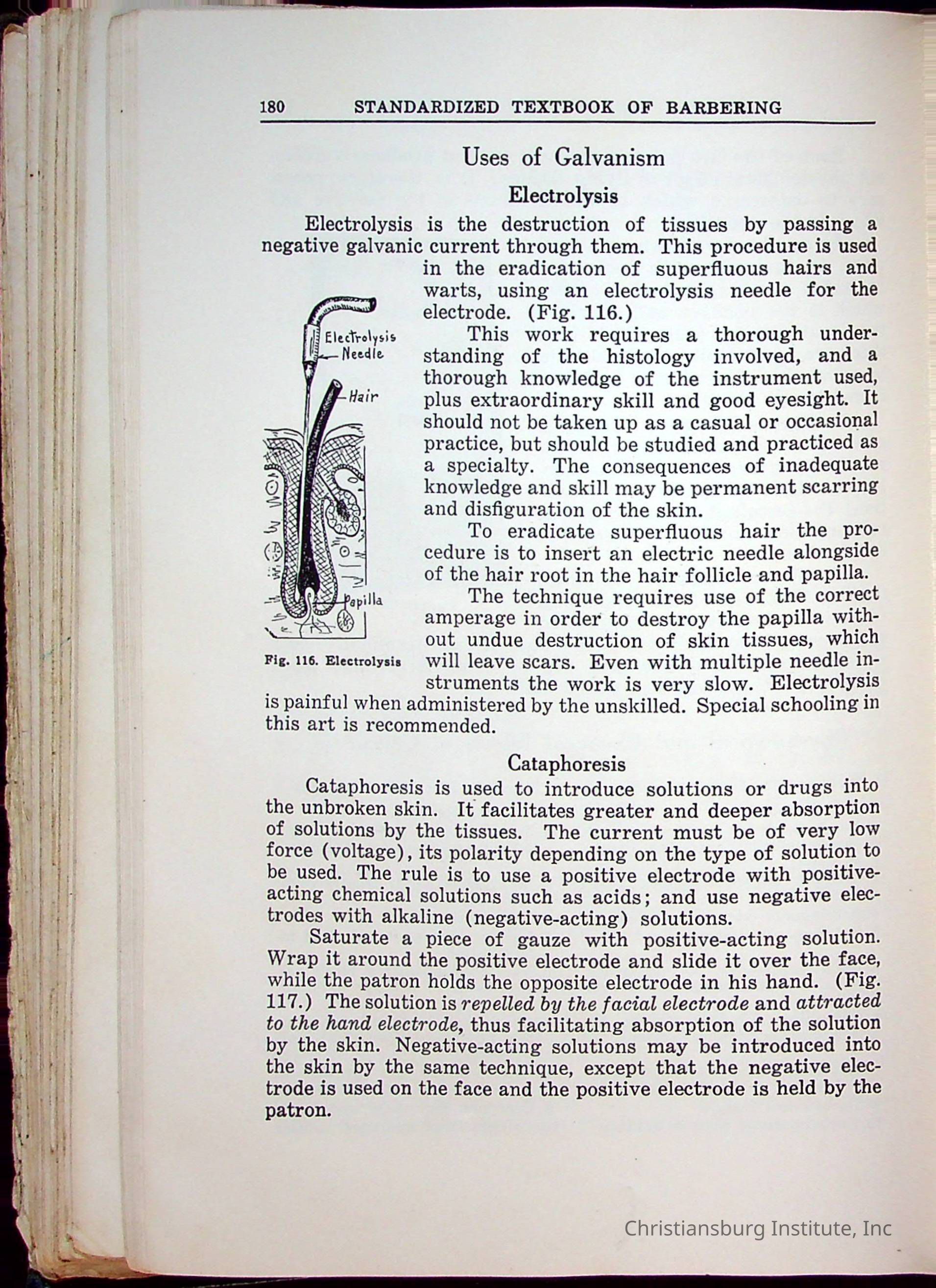 "Standardized Textbook of Barbering: in Two Parts" written and published by the Associated Master Barbers and Beauticians of America in the year 1950. This textbook was in the Christiansburg Institute library.