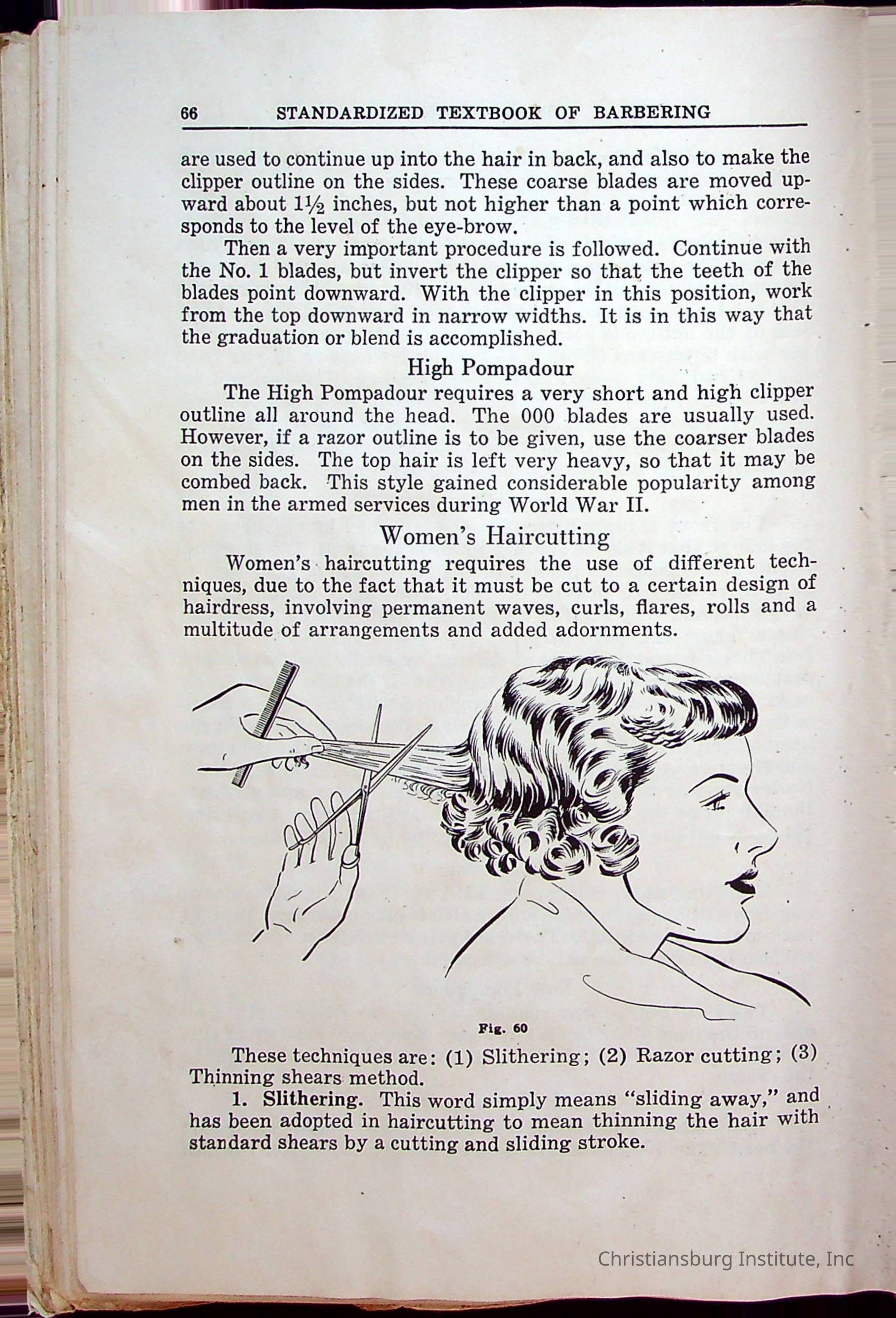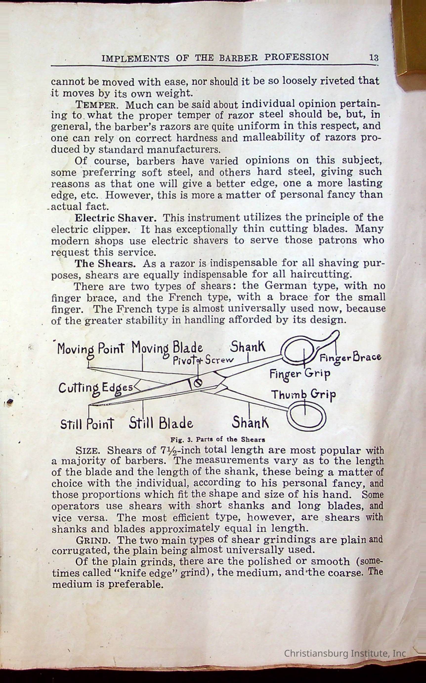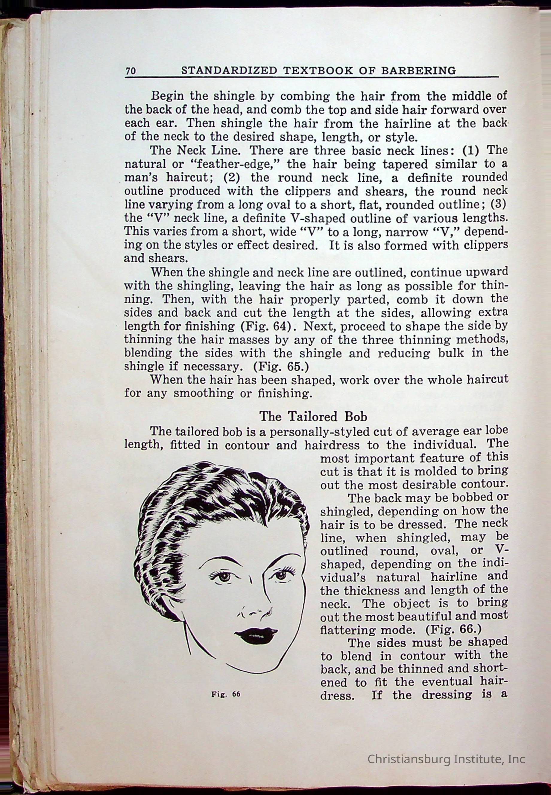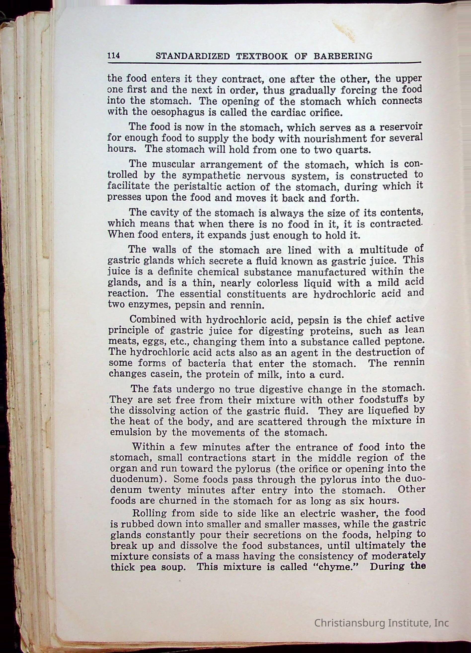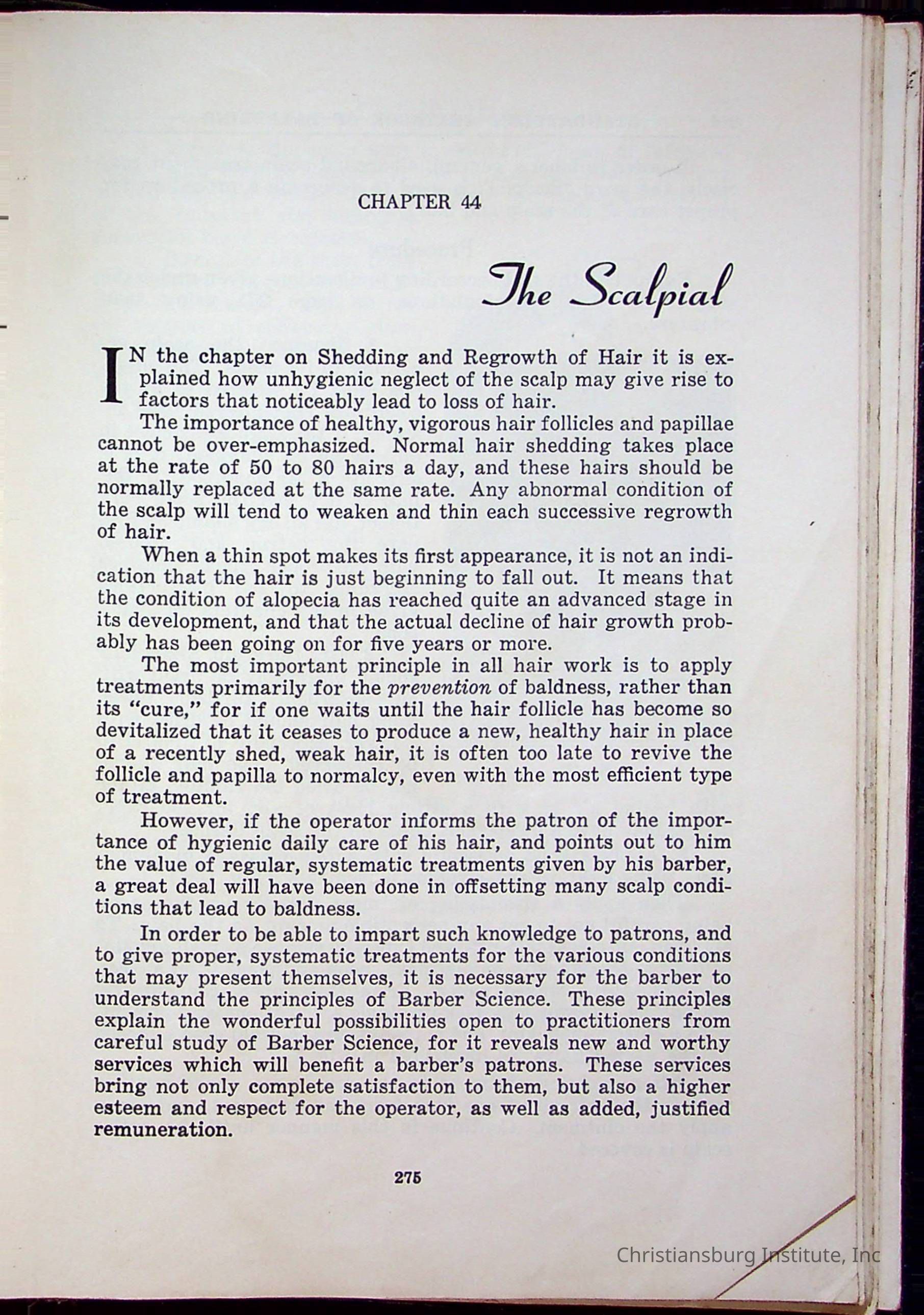 "Standardized Textbook of Barbering: in Two Parts" written and published by the Associated Master Barbers and Beauticians of America in the year 1950. This textbook was in the Christiansburg Institute library.
