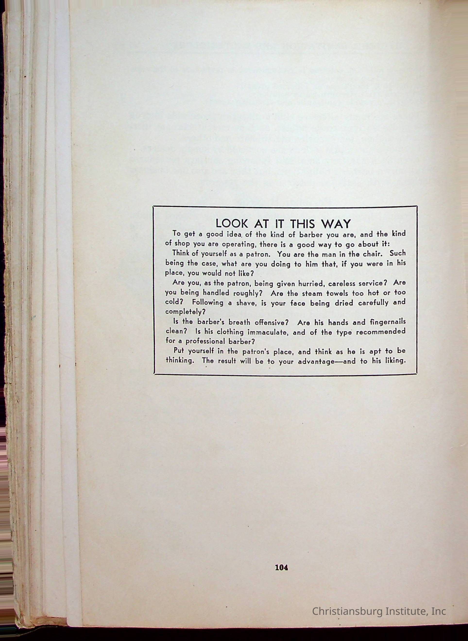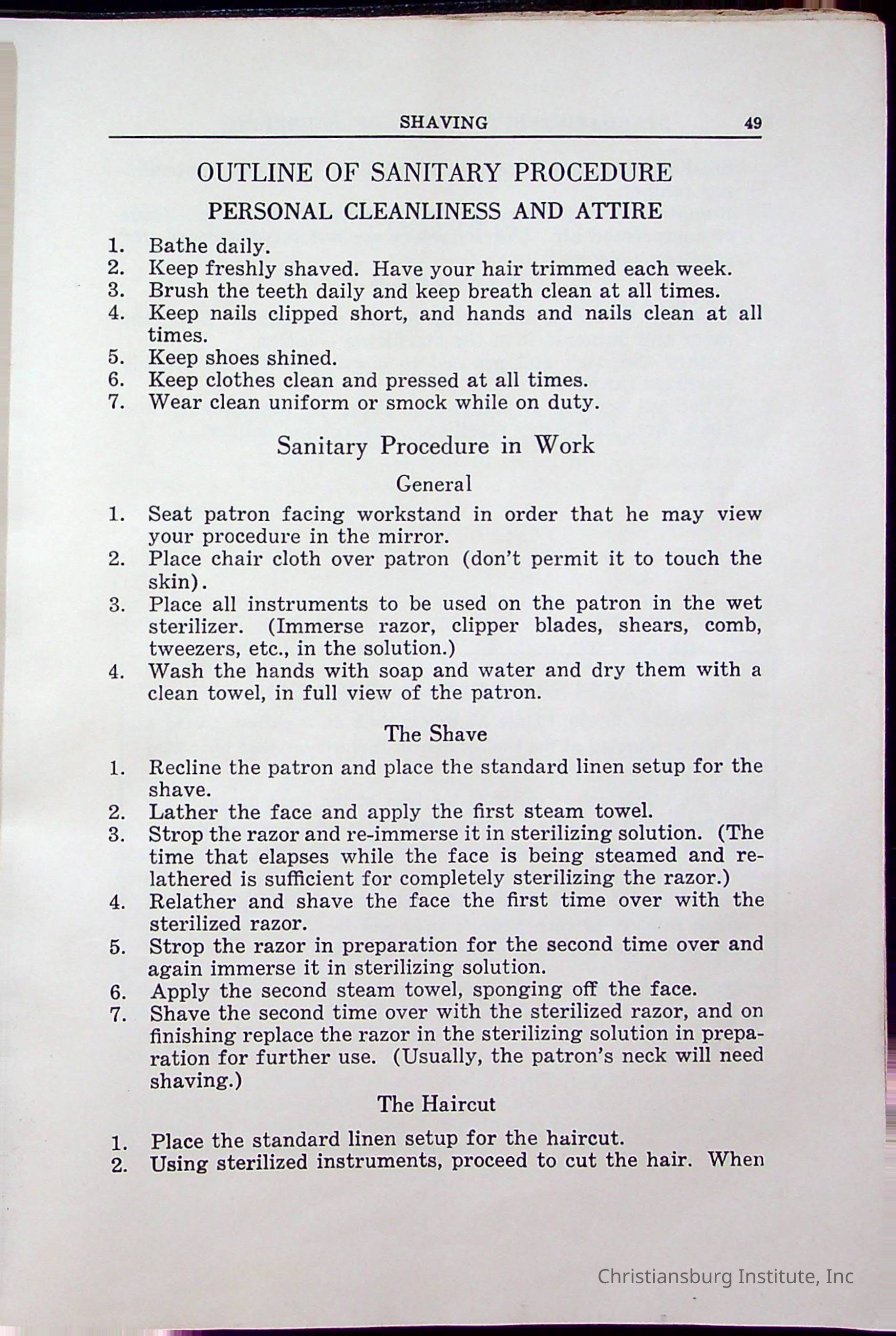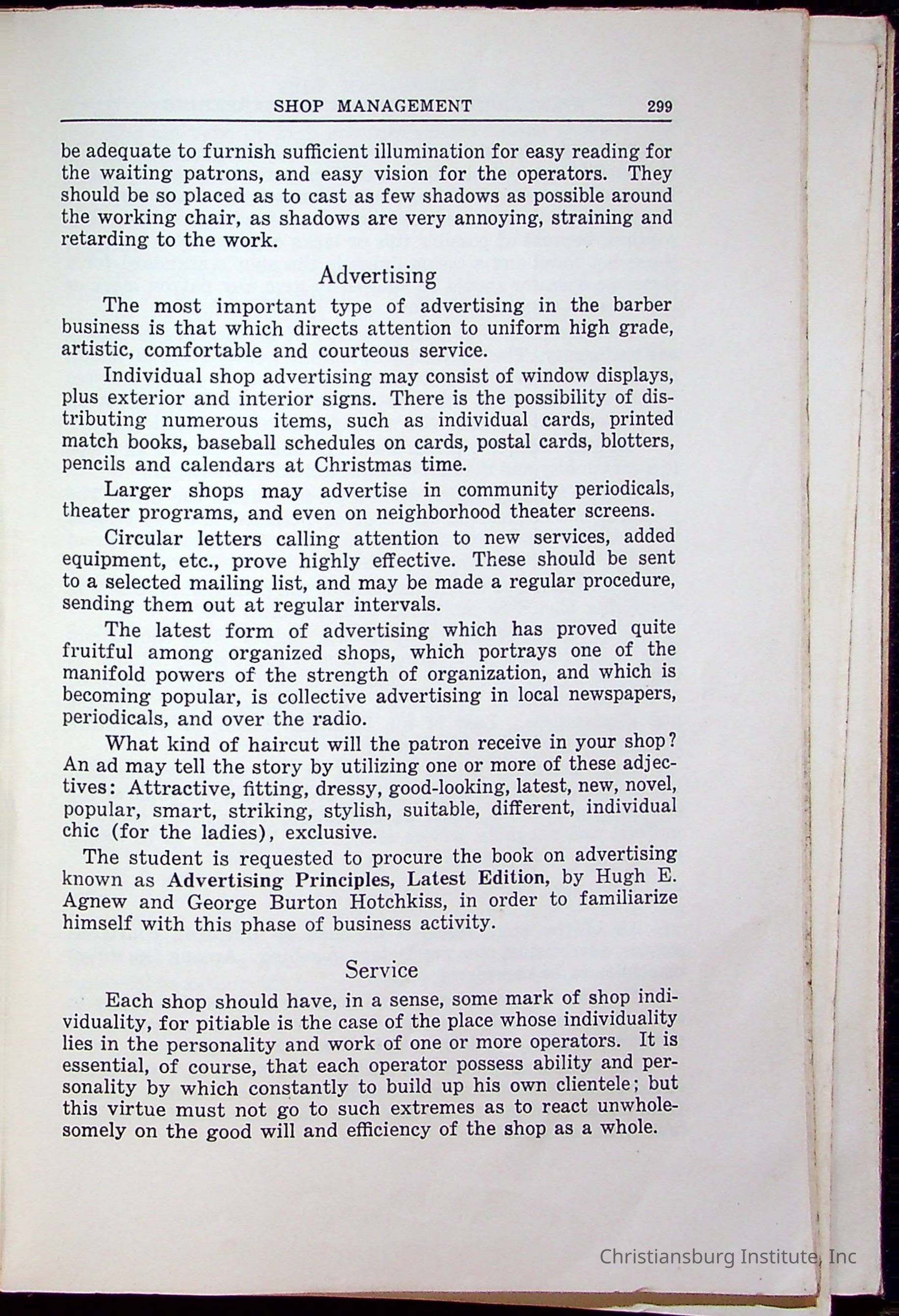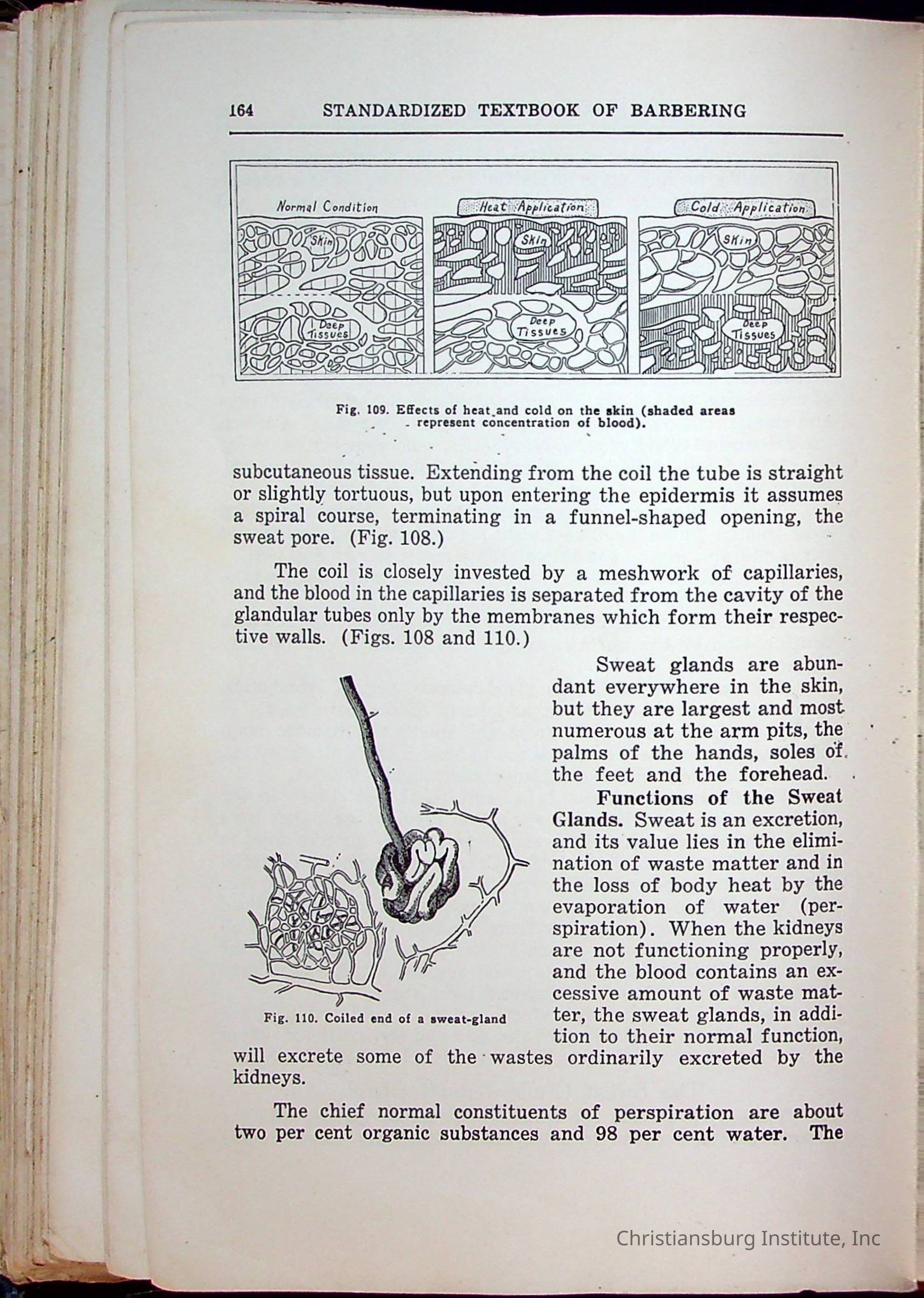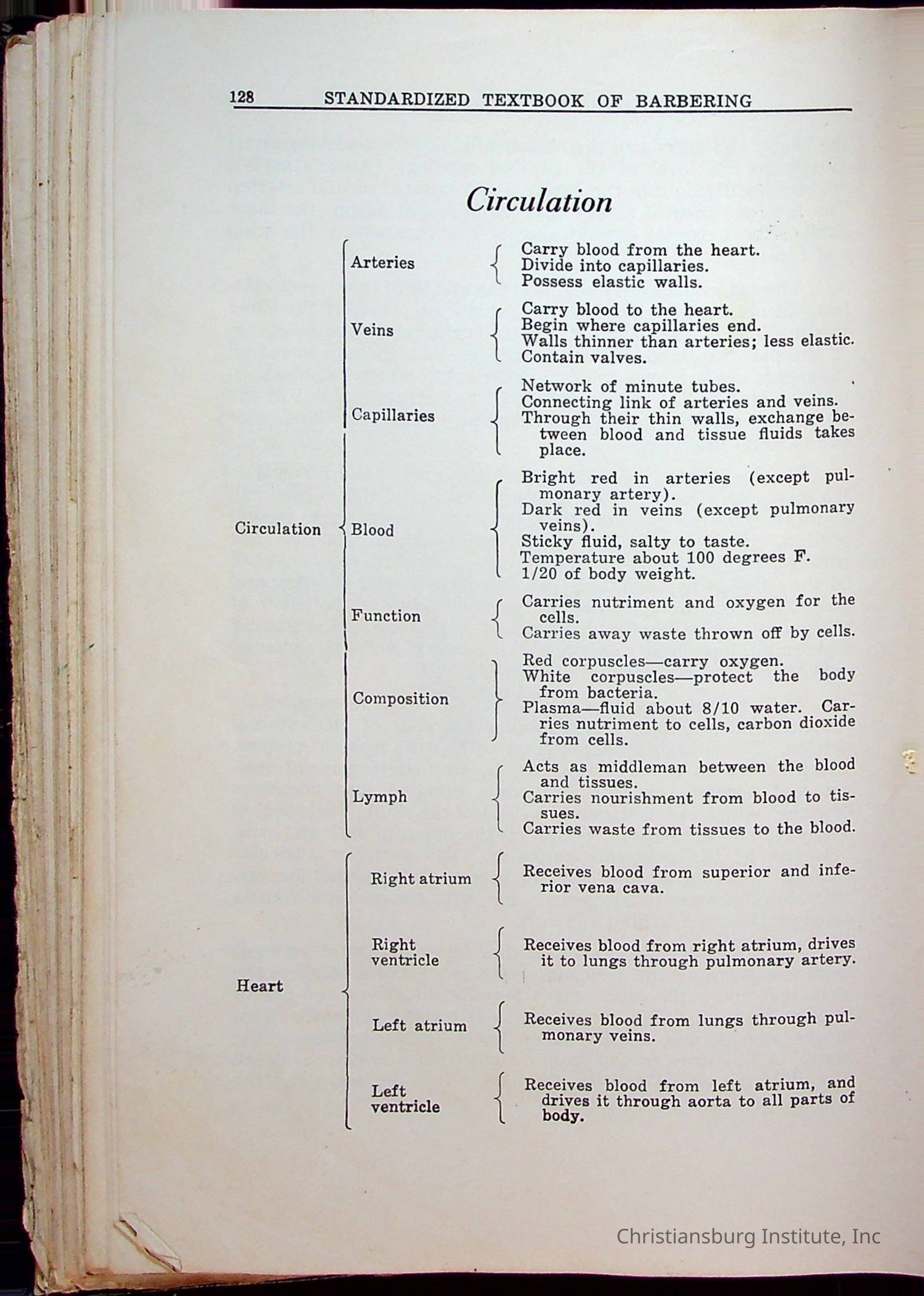 "Standardized Textbook of Barbering: in Two Parts" written and published by the Associated Master Barbers and Beauticians of America in the year 1950. This textbook was in the Christiansburg Institute library.