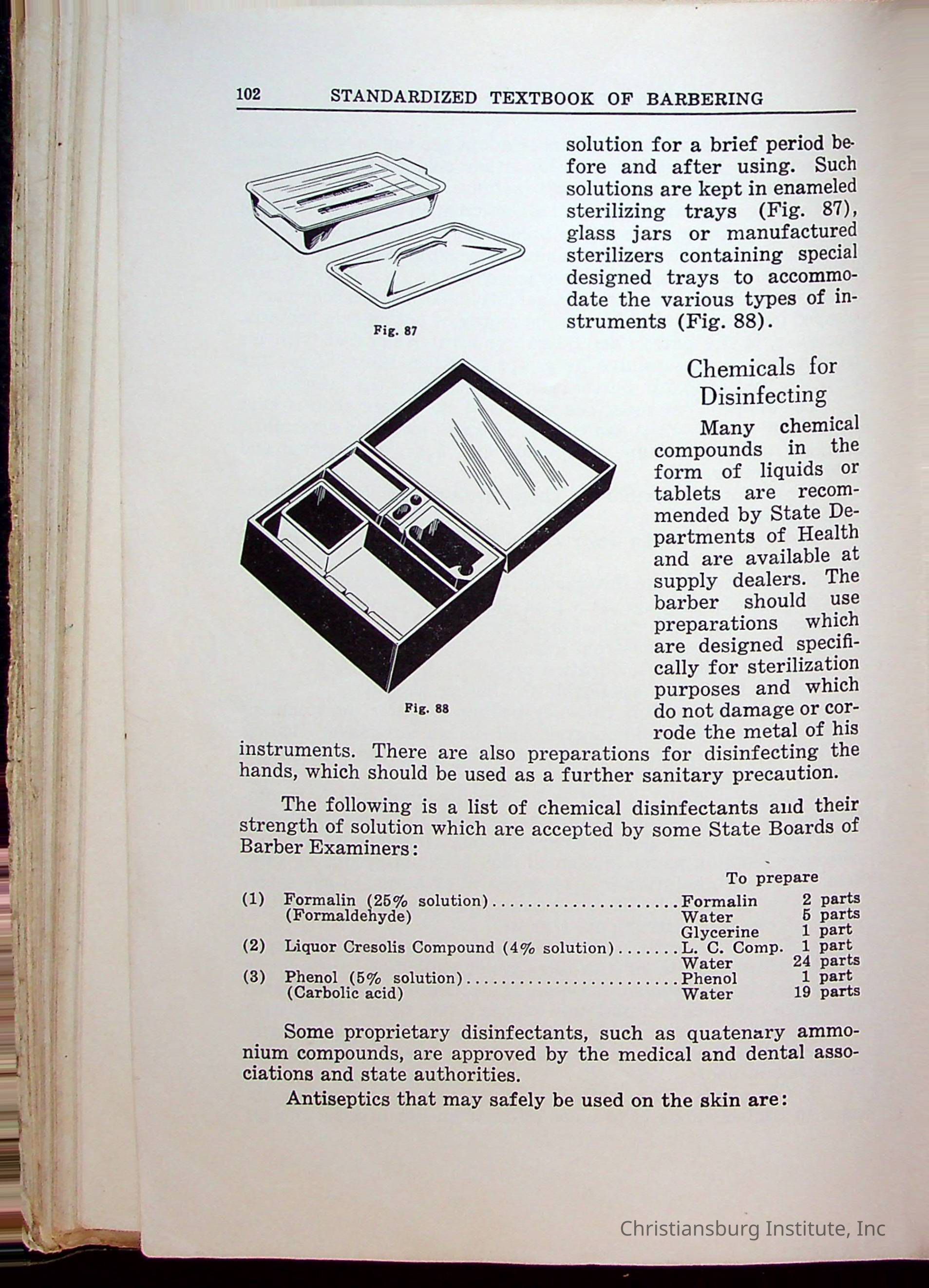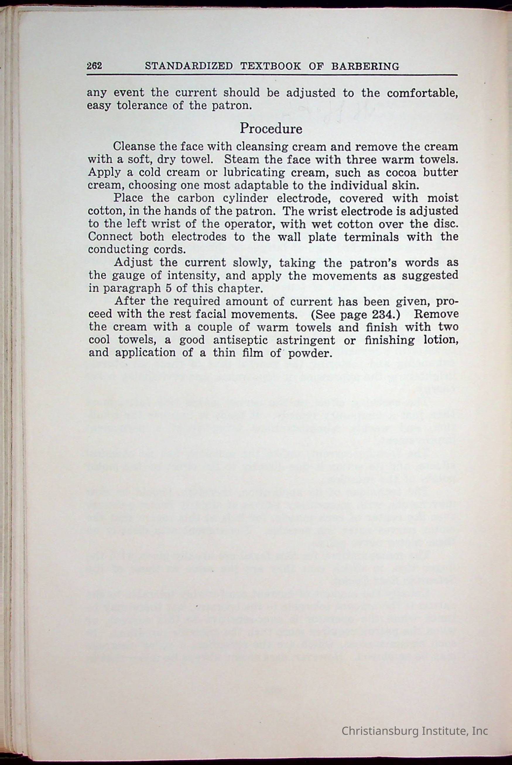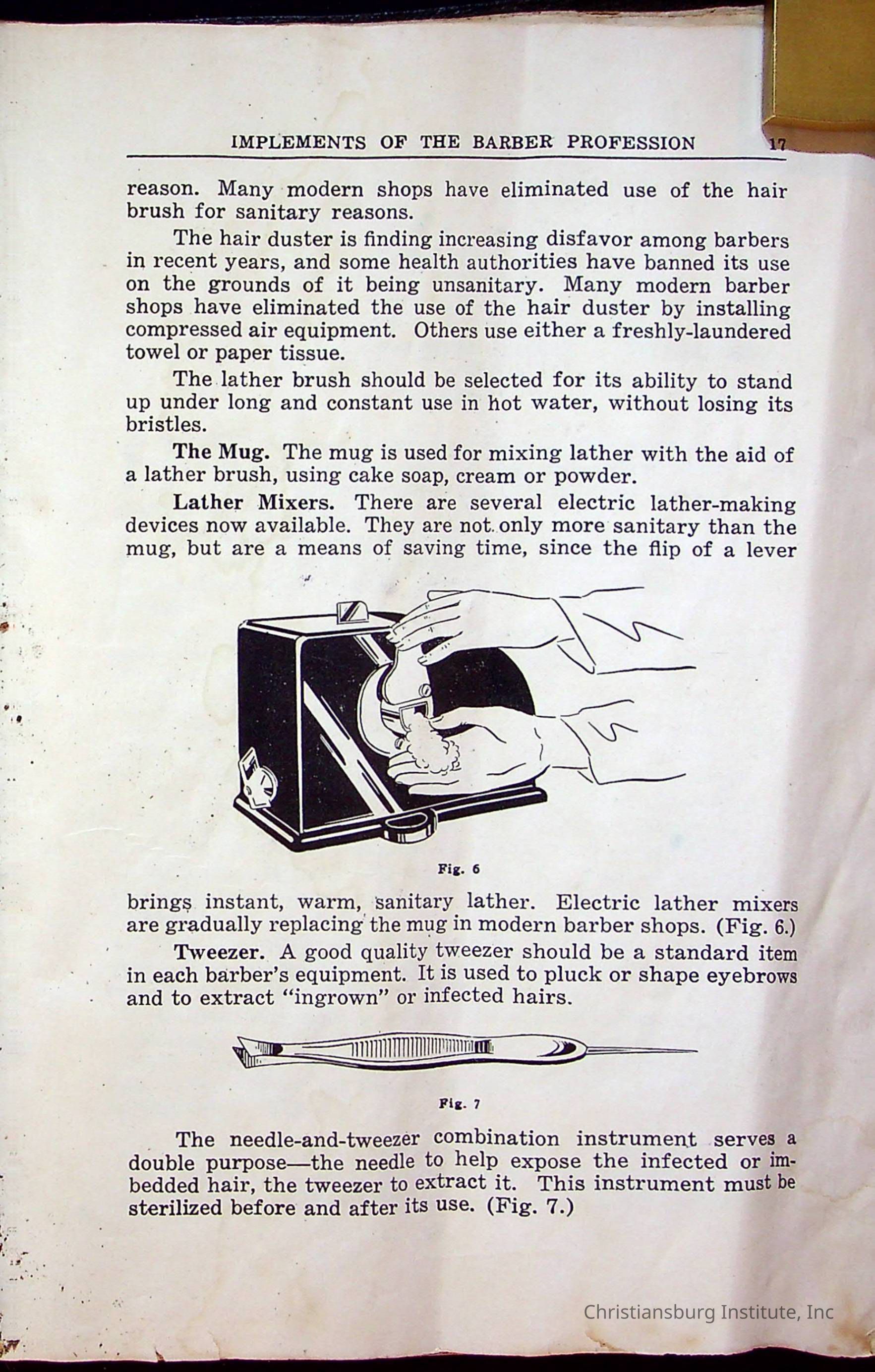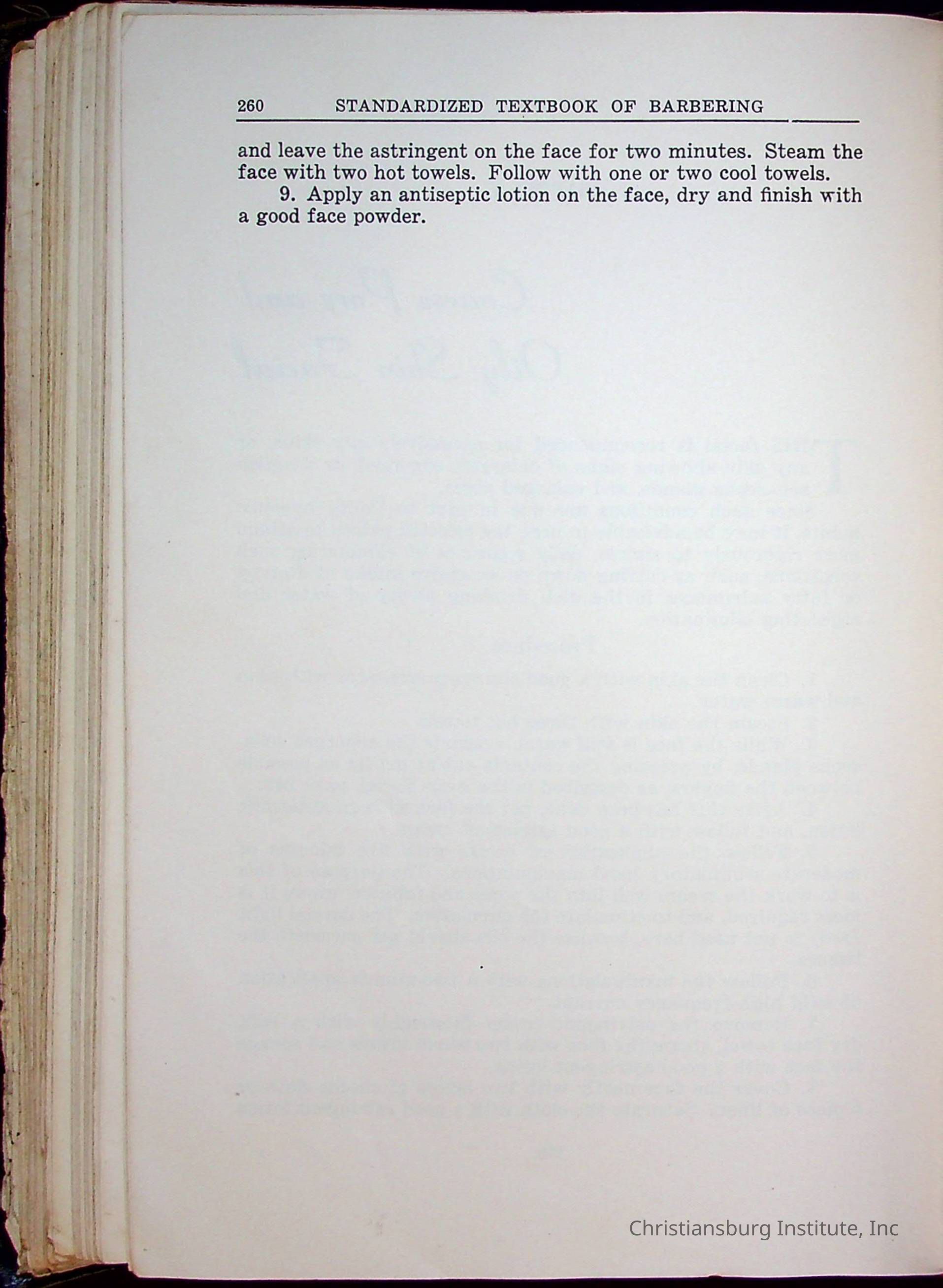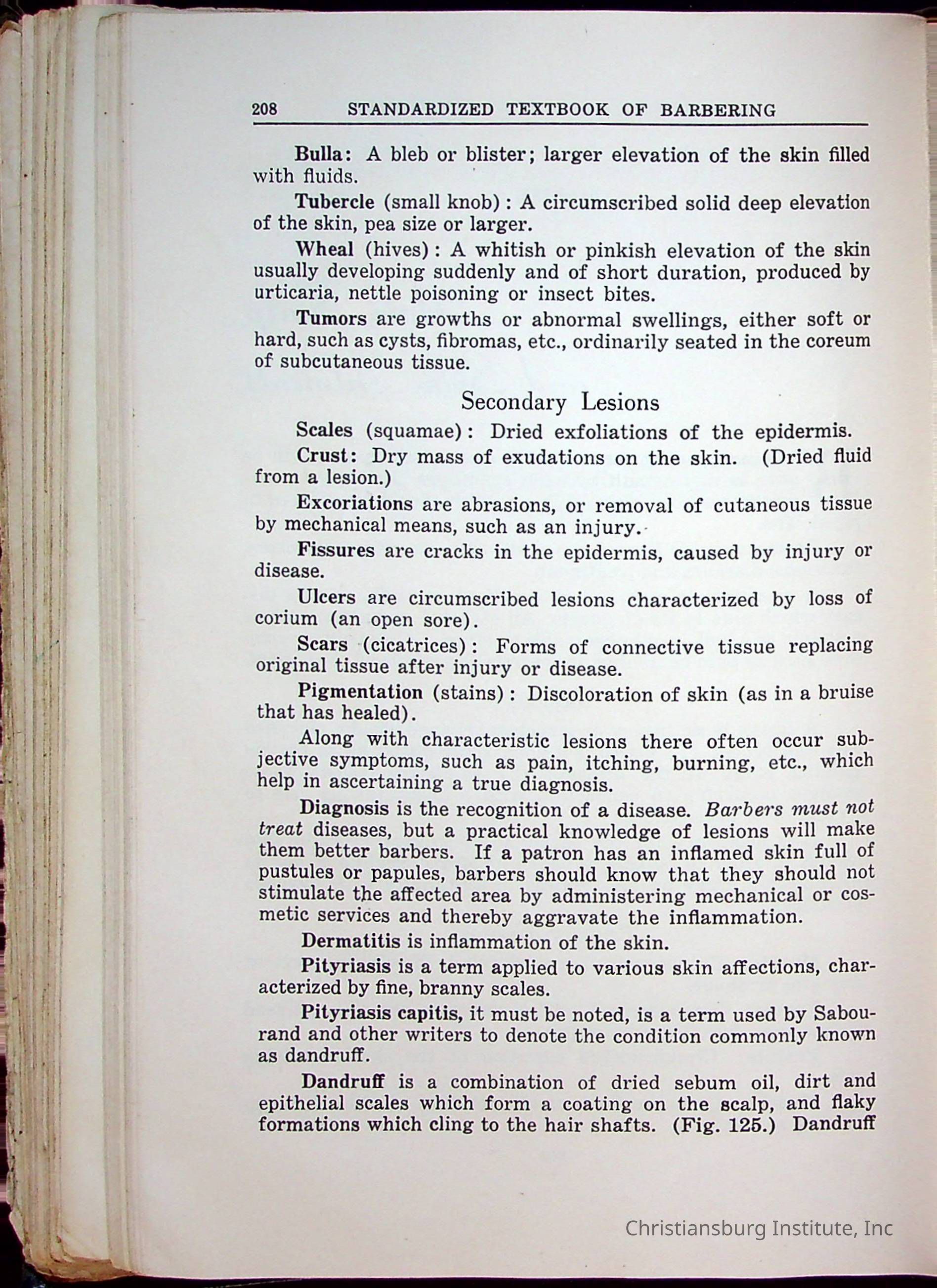 "Standardized Textbook of Barbering: in Two Parts" written and published by the Associated Master Barbers and Beauticians of America in the year 1950. This textbook was in the Christiansburg Institute library.