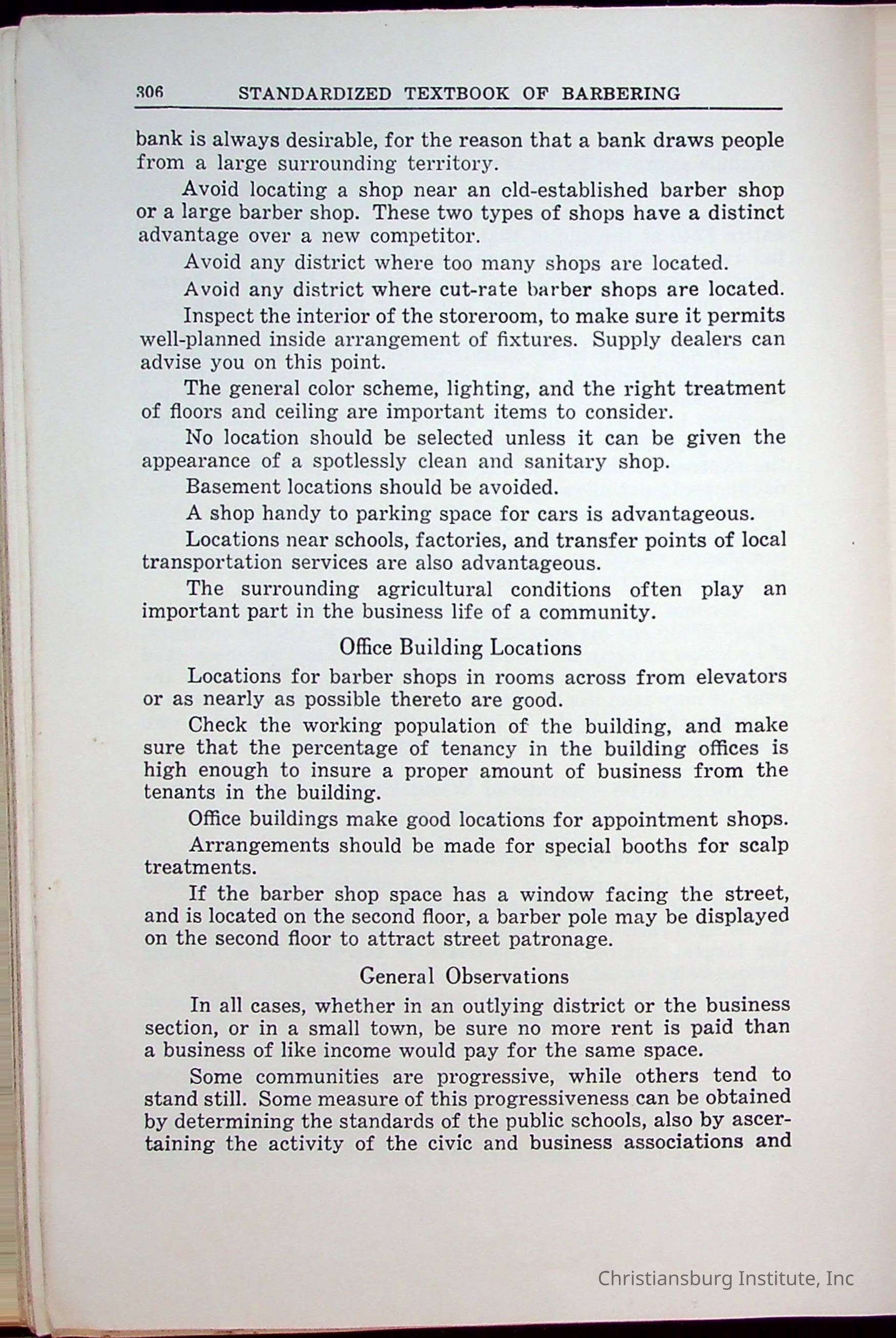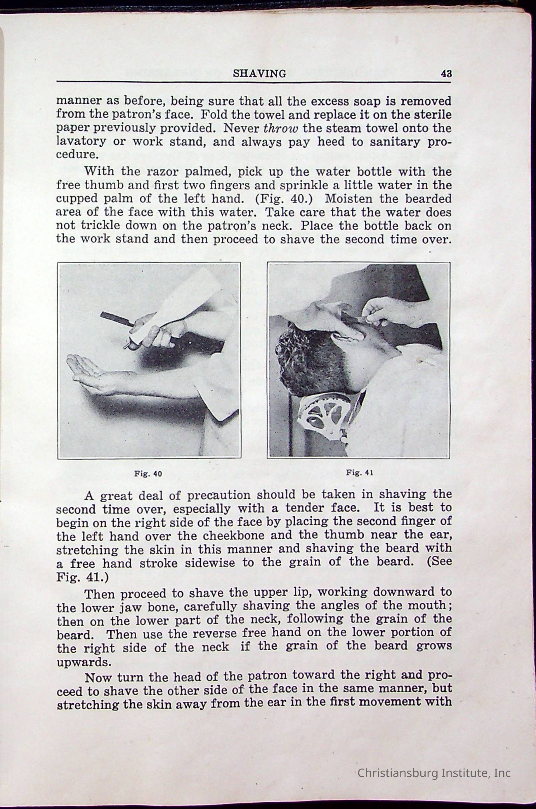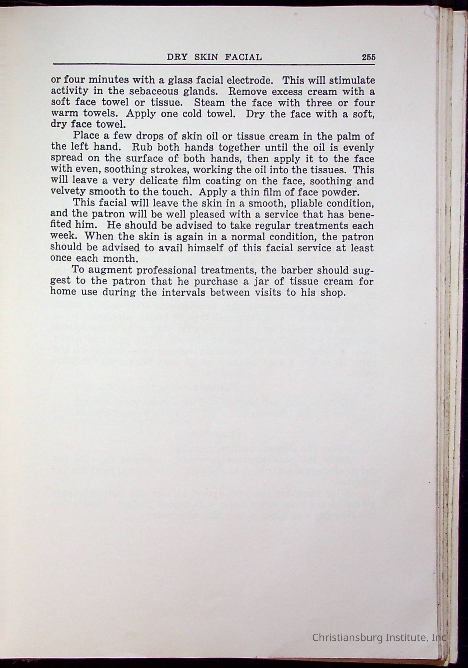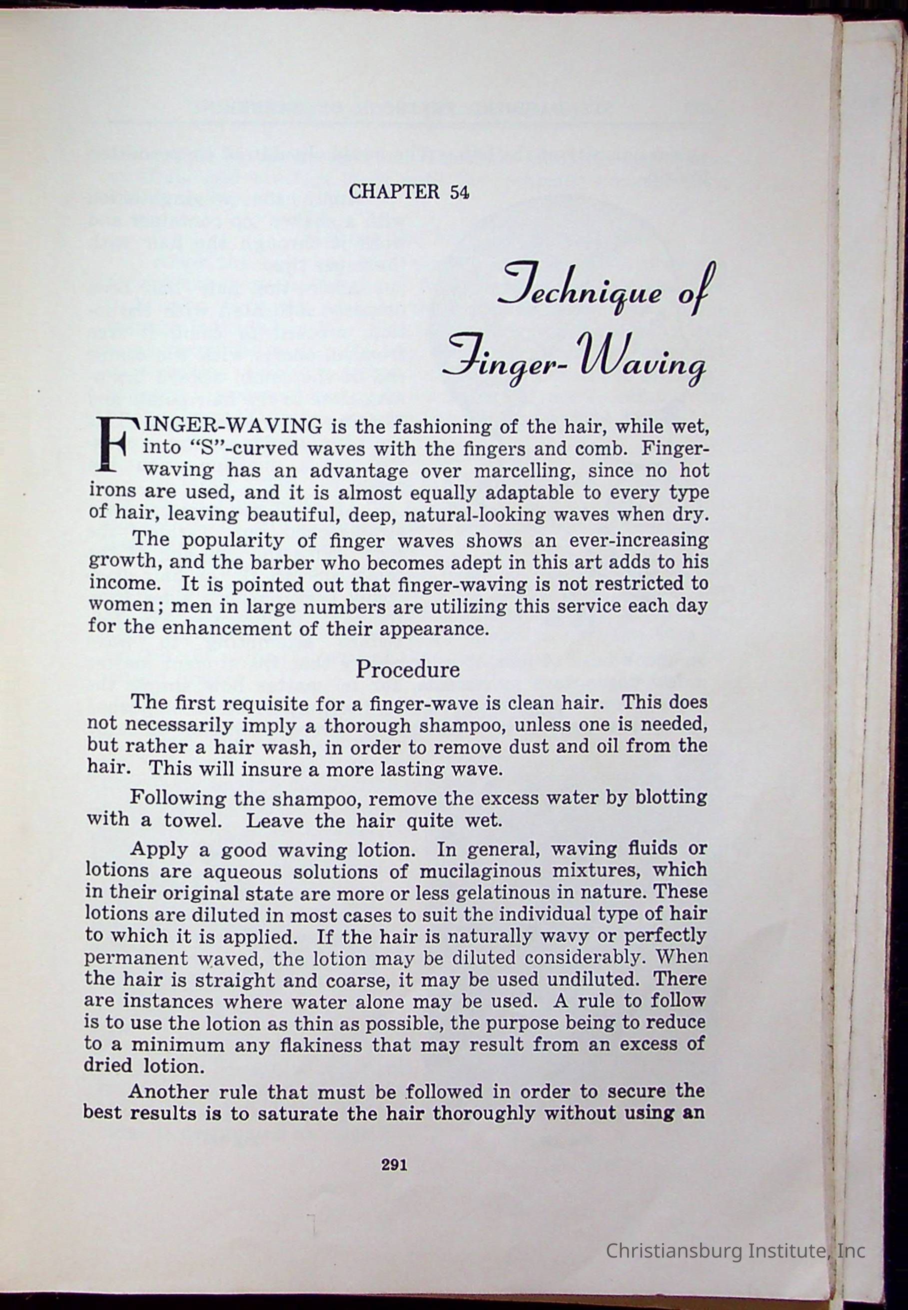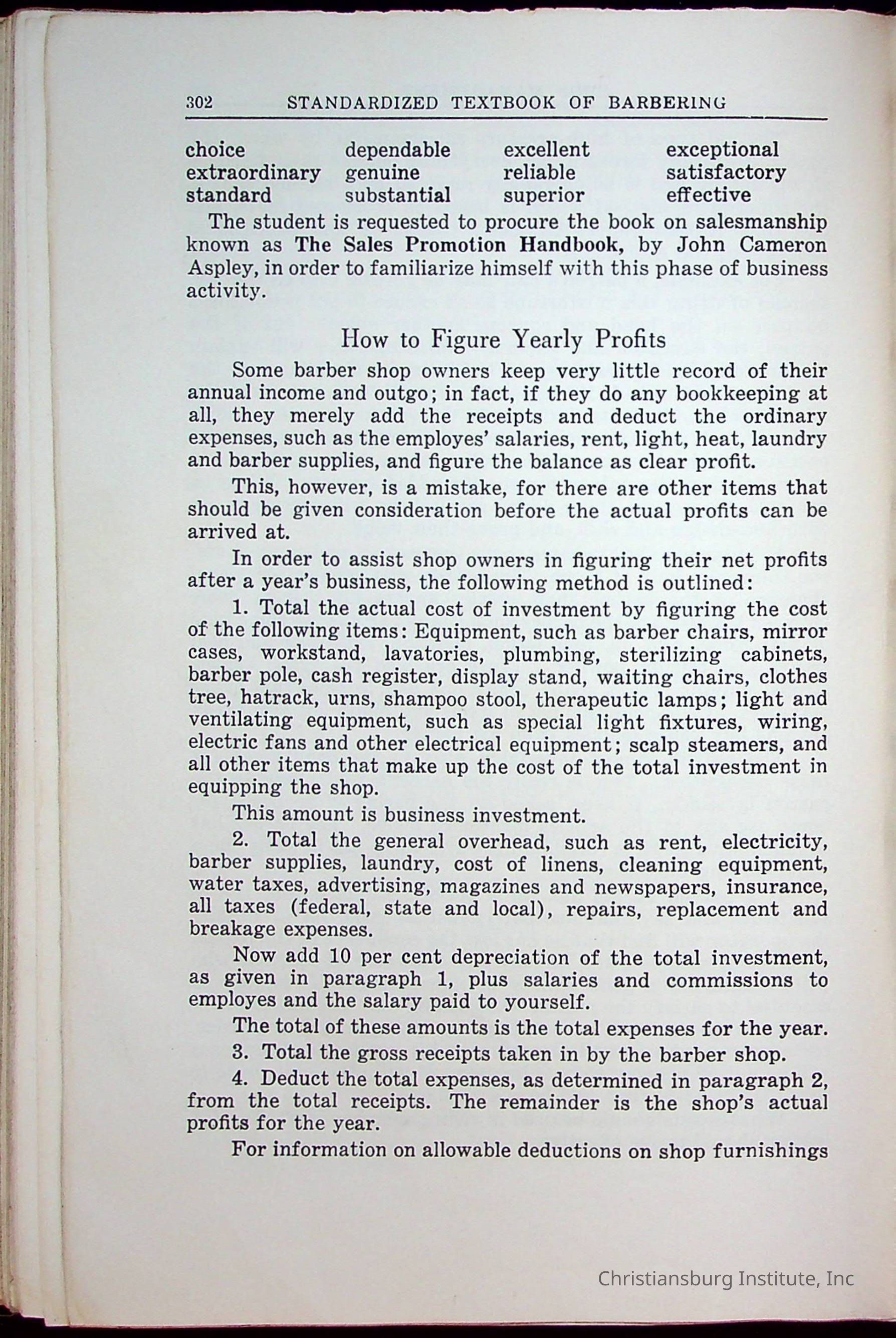 "Standardized Textbook of Barbering: in Two Parts" written and published by the Associated Master Barbers and Beauticians of America in the year 1950. This textbook was in the Christiansburg Institute library.