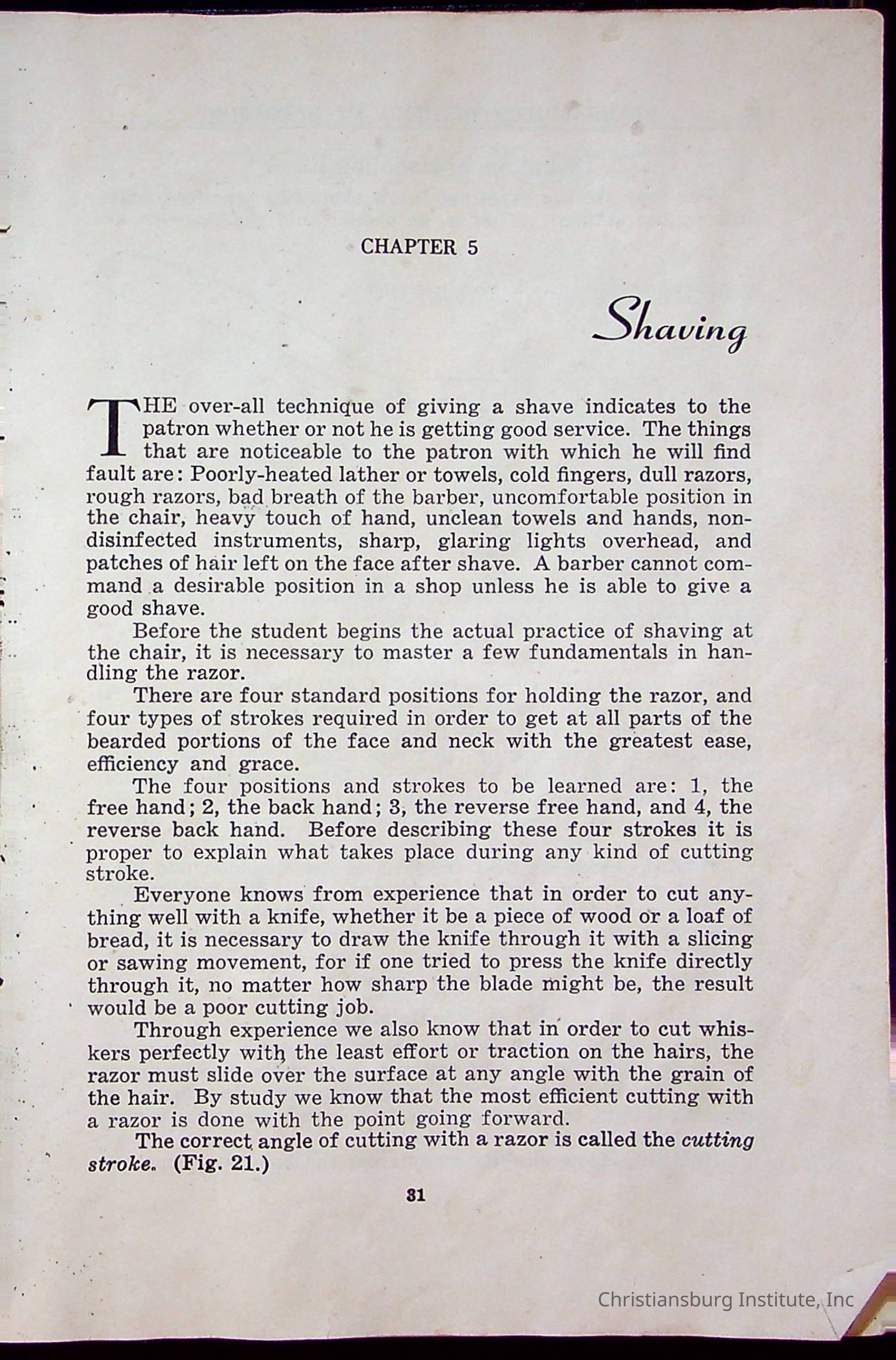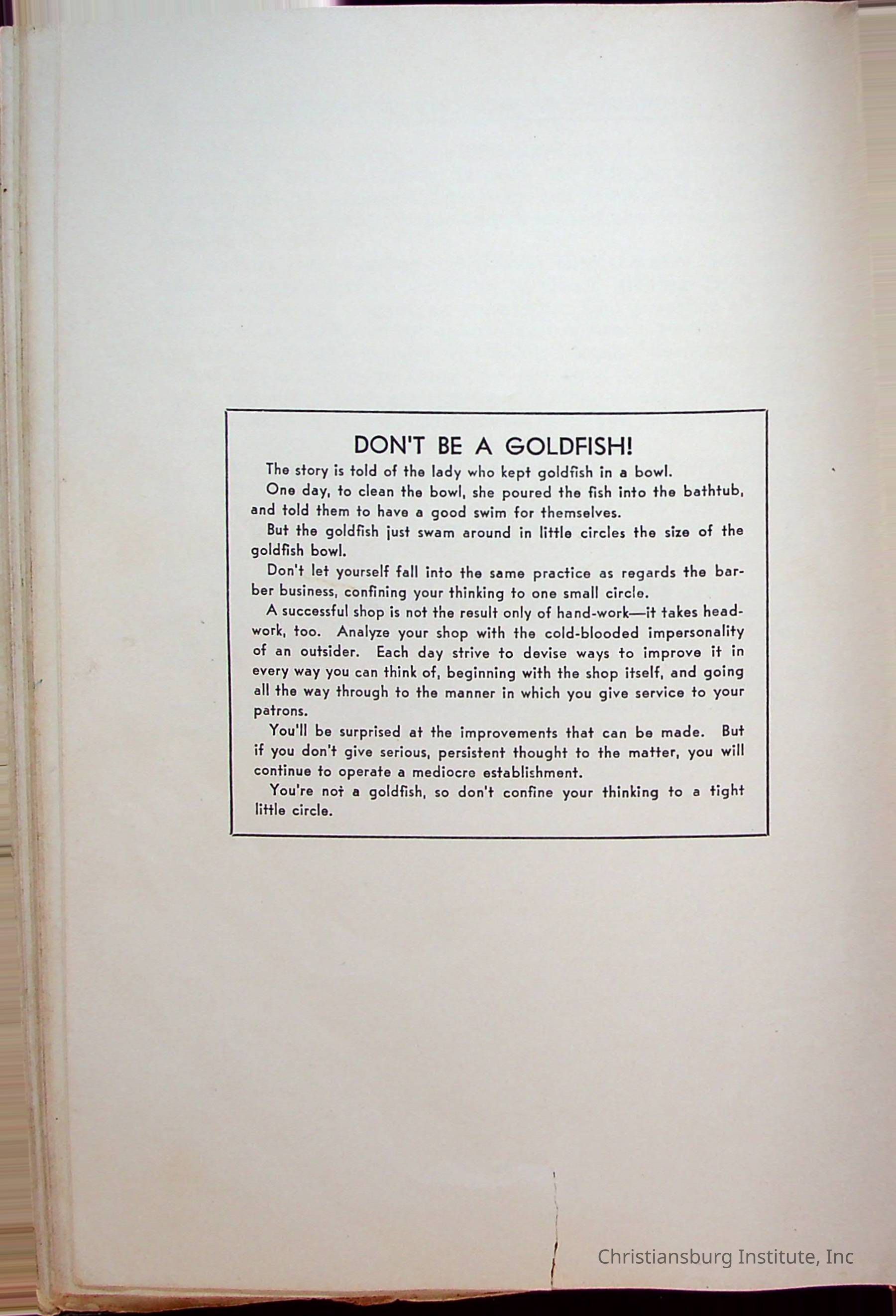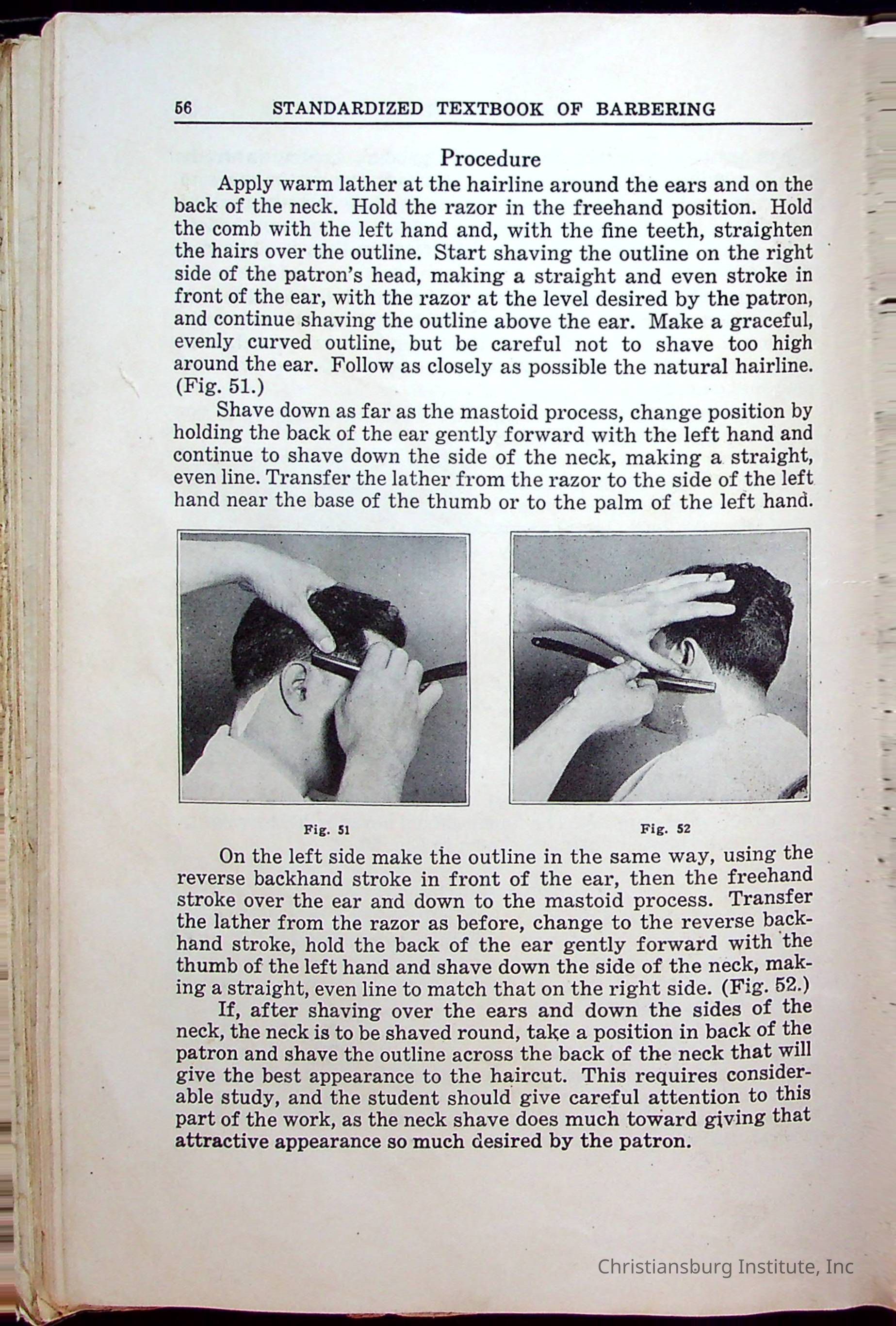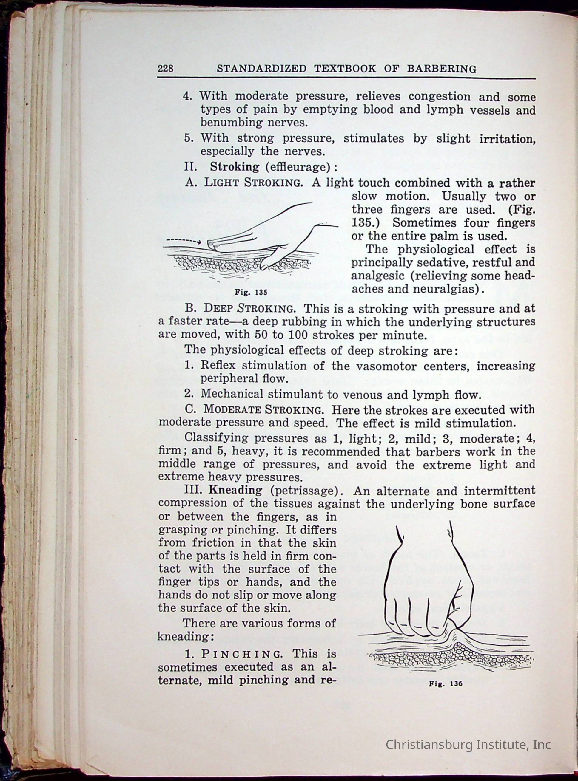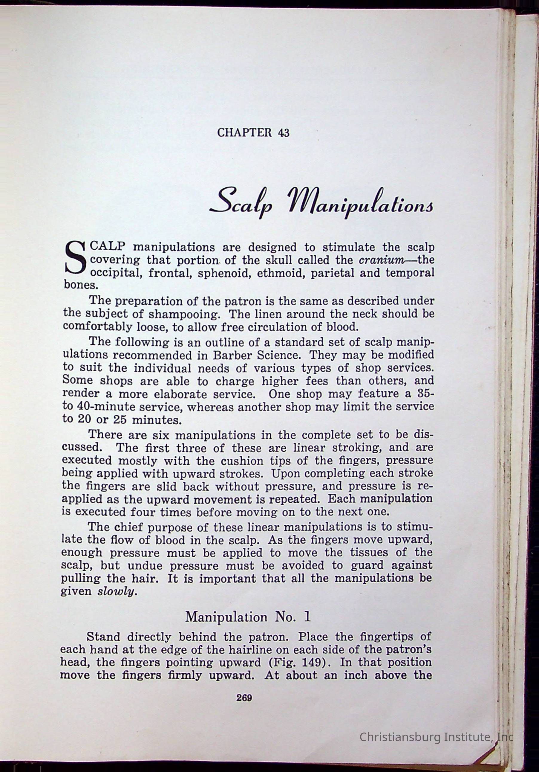 "Standardized Textbook of Barbering: in Two Parts" written and published by the Associated Master Barbers and Beauticians of America in the year 1950. This textbook was in the Christiansburg Institute library.