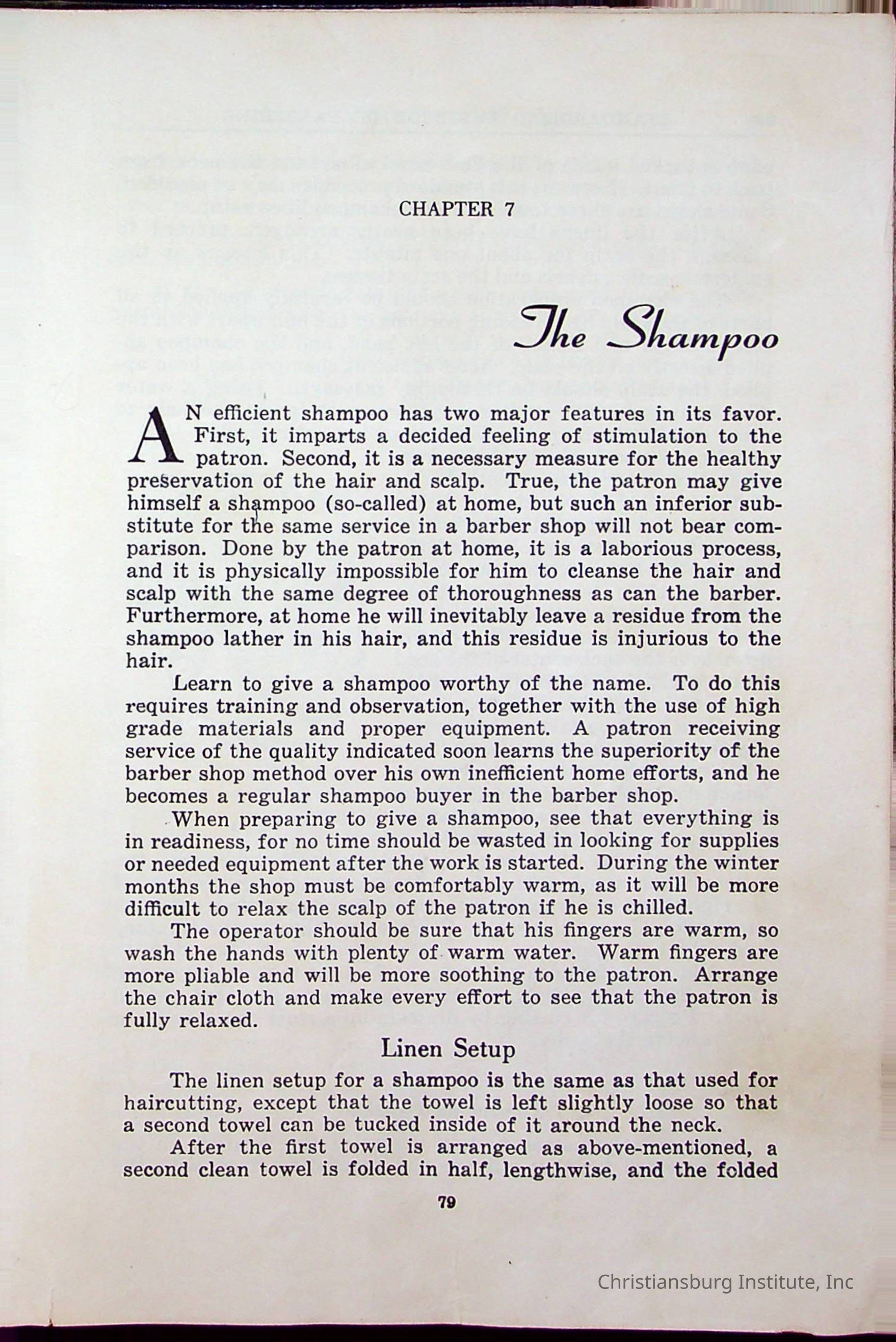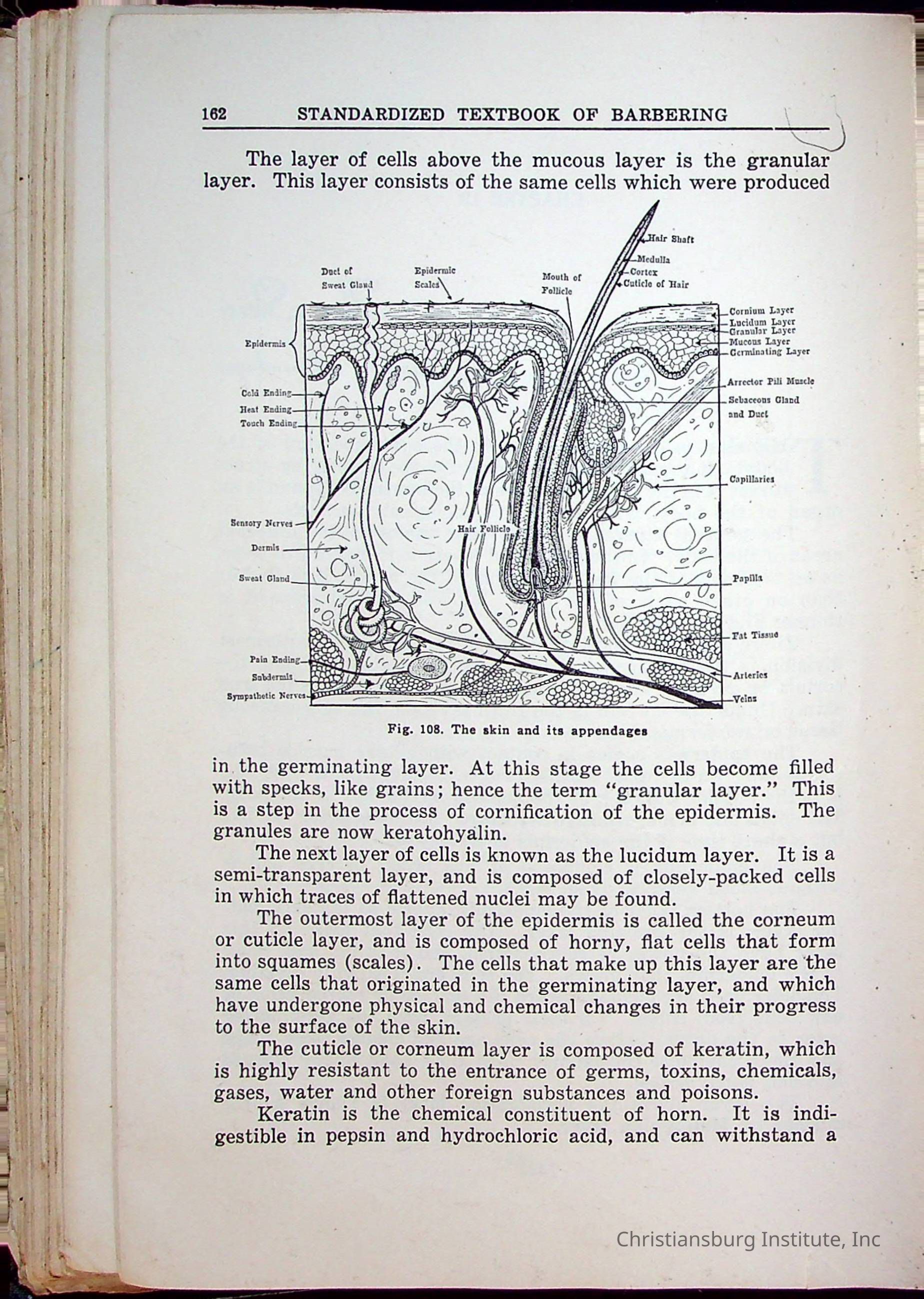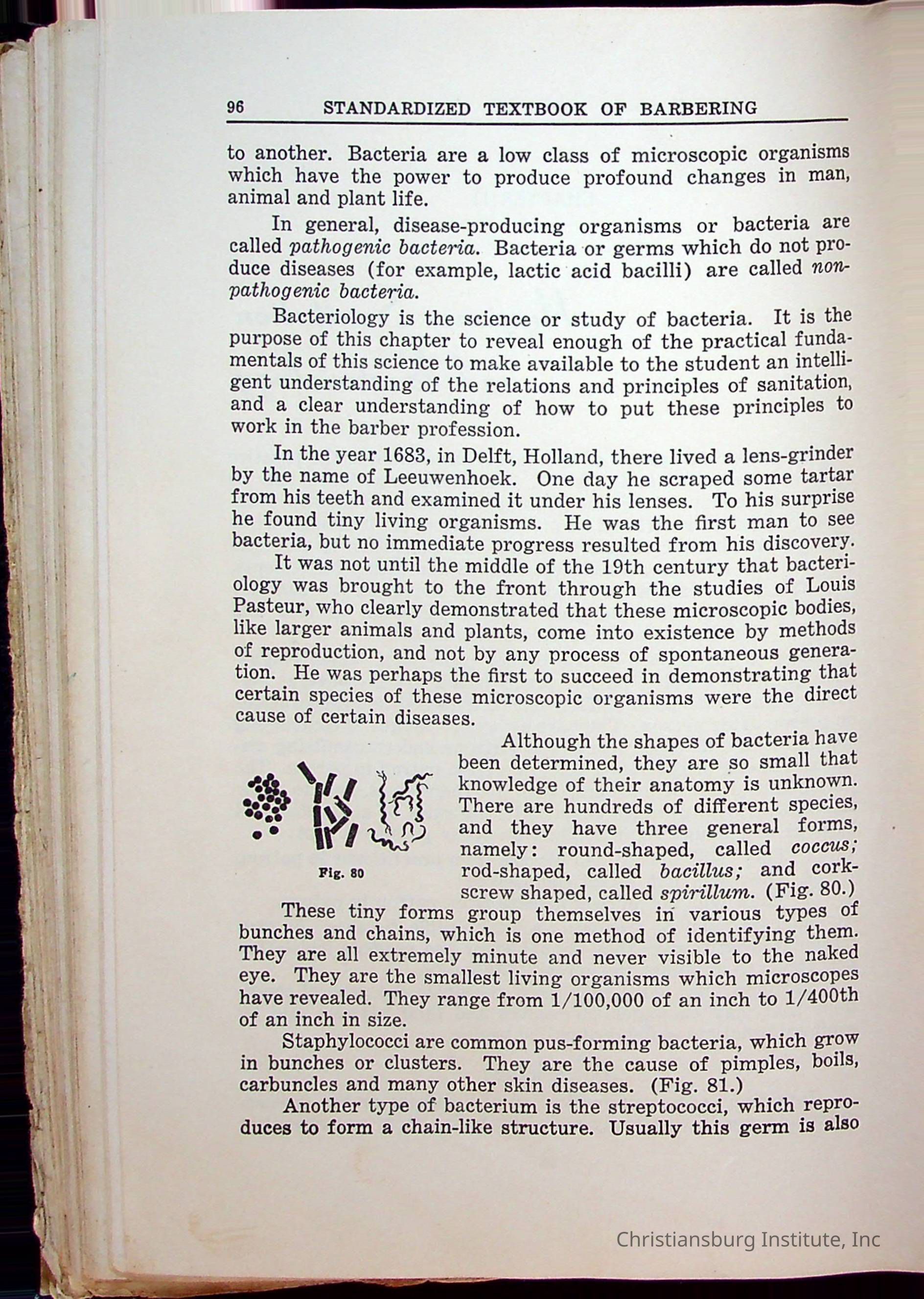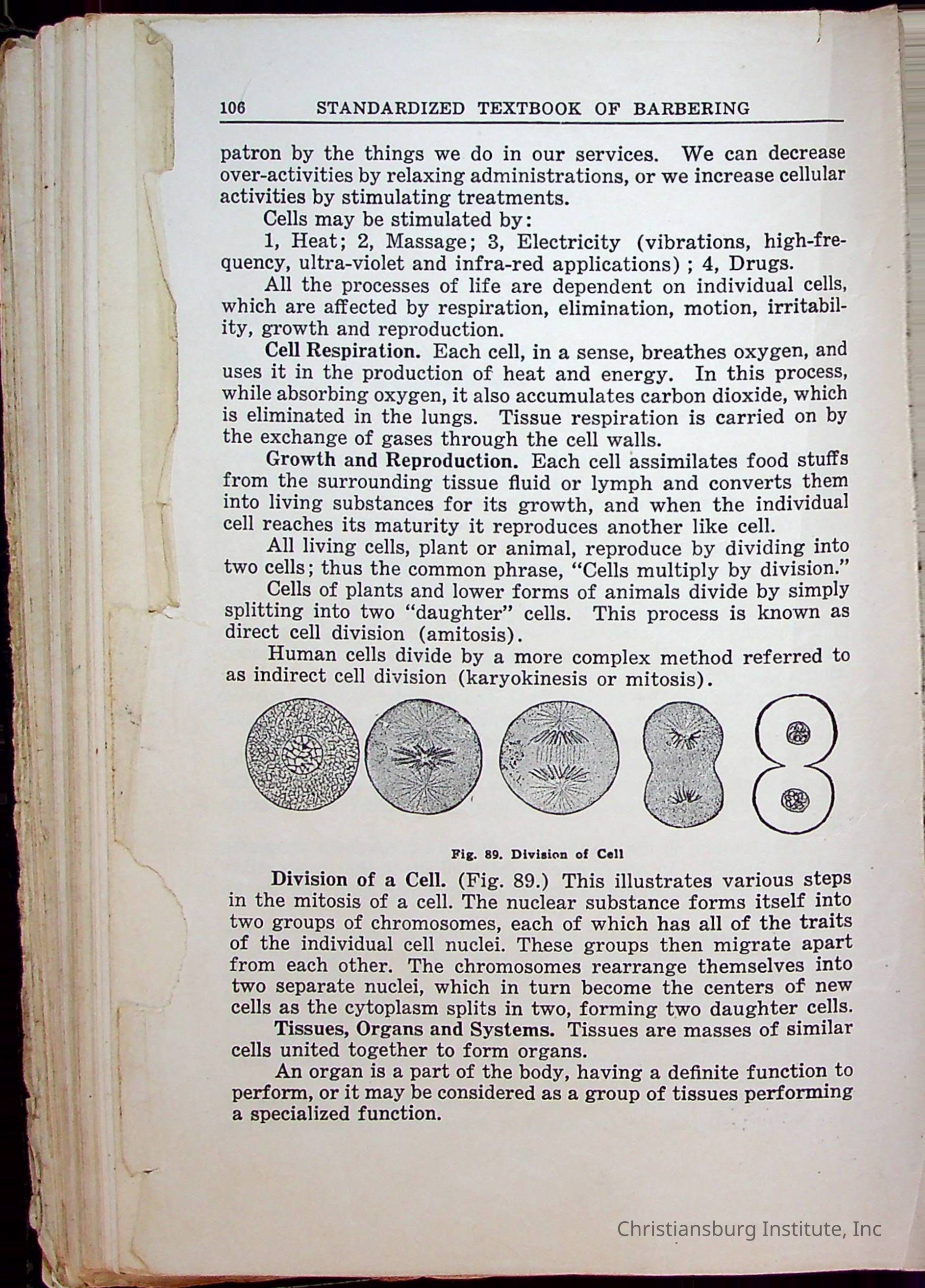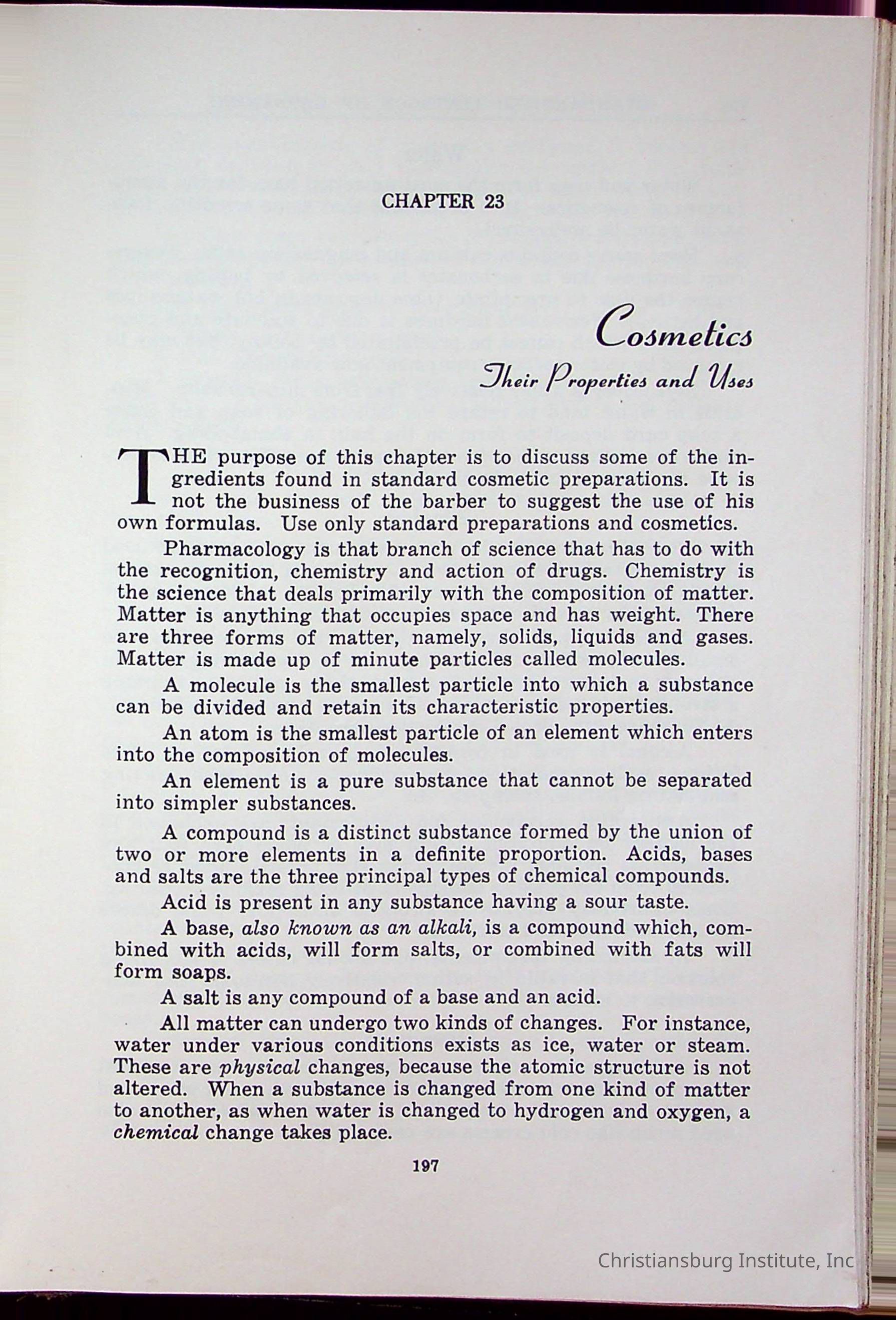 "Standardized Textbook of Barbering: in Two Parts" written and published by the Associated Master Barbers and Beauticians of America in the year 1950. This textbook was in the Christiansburg Institute library.