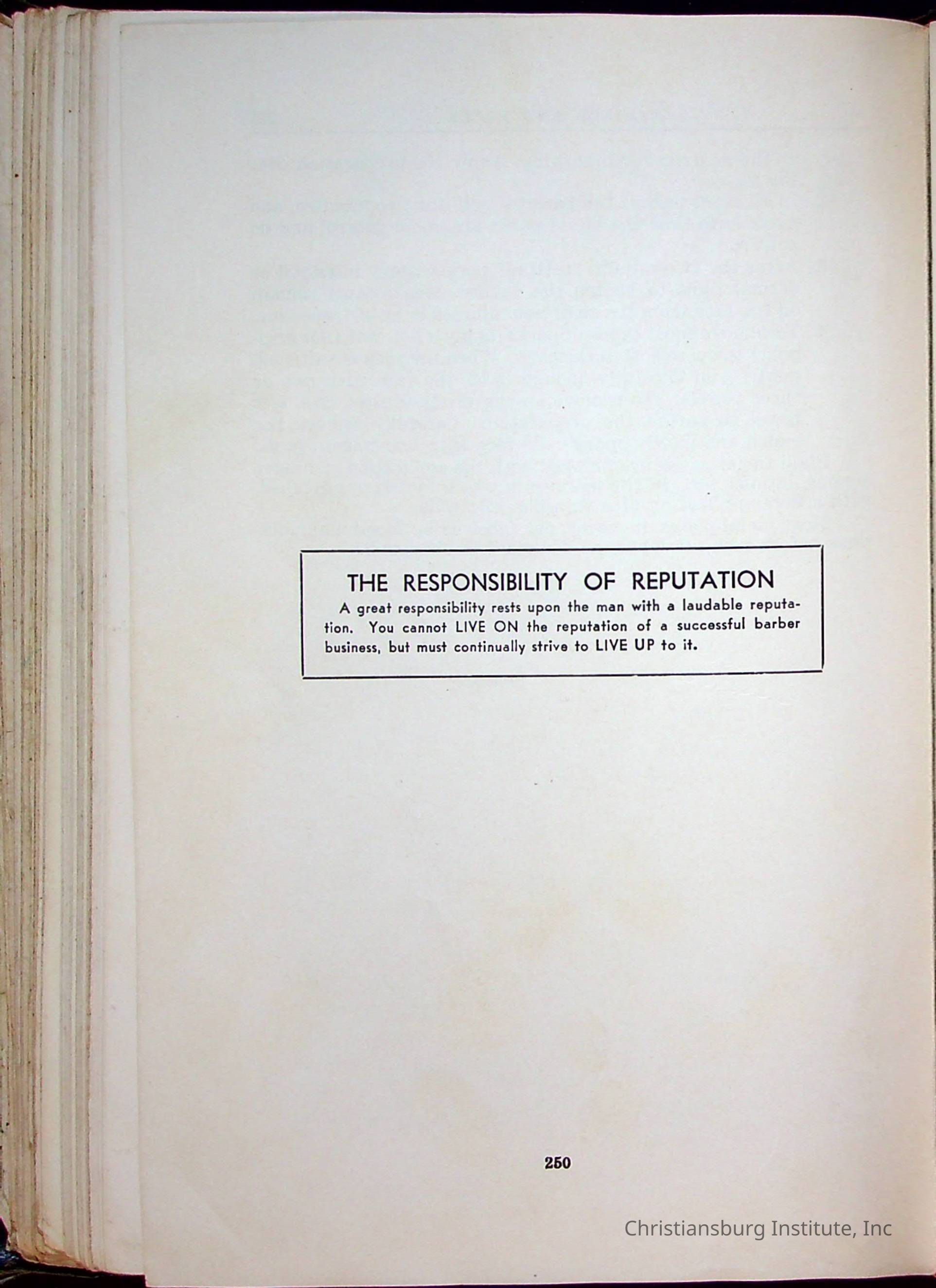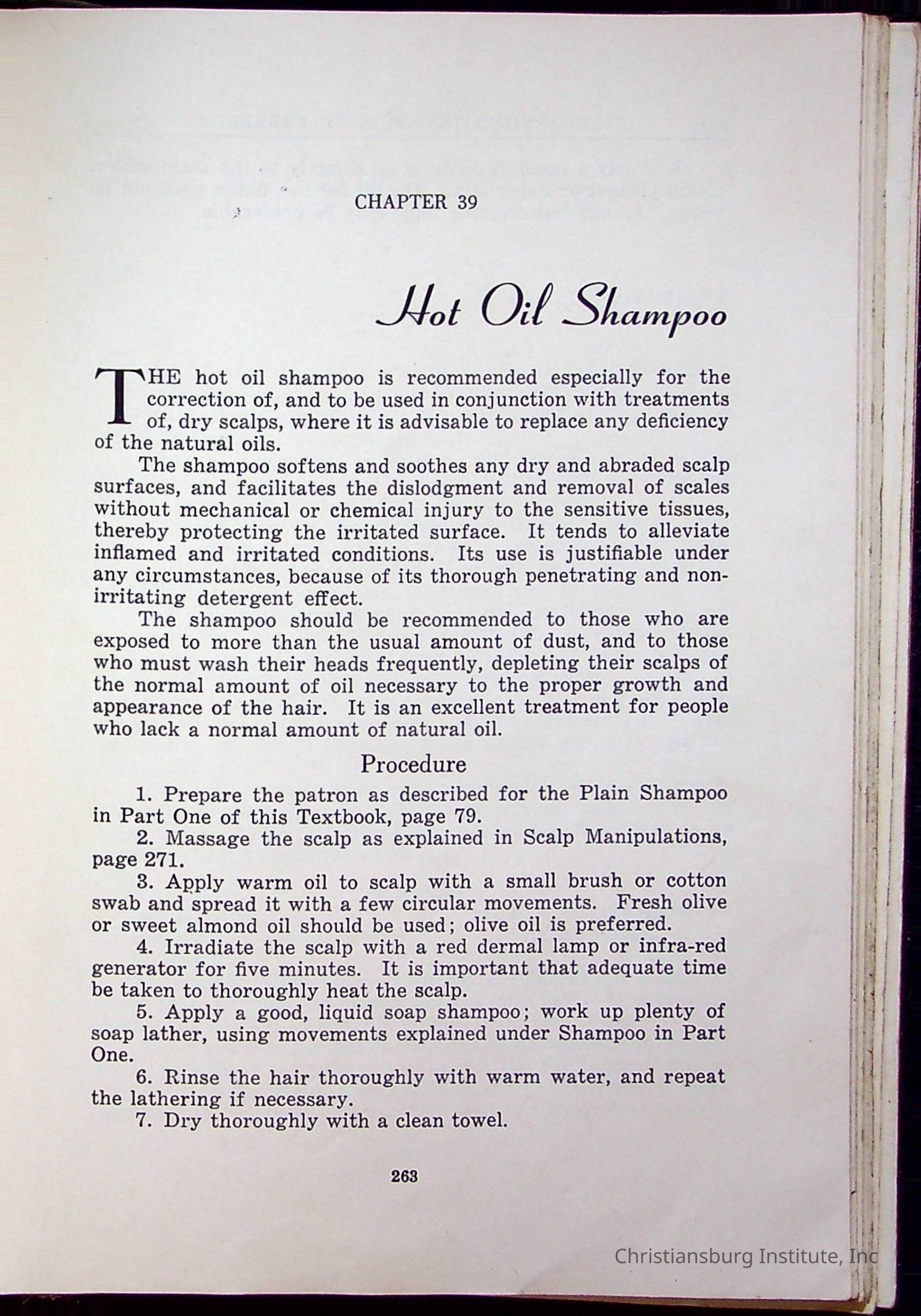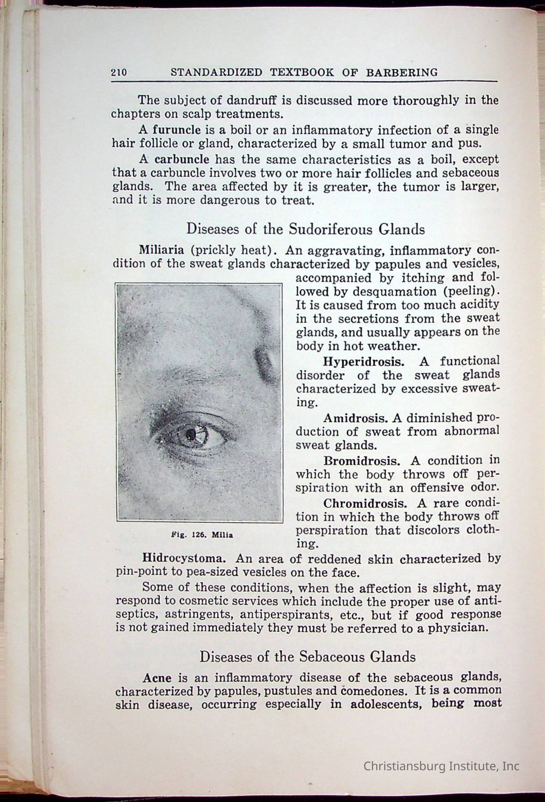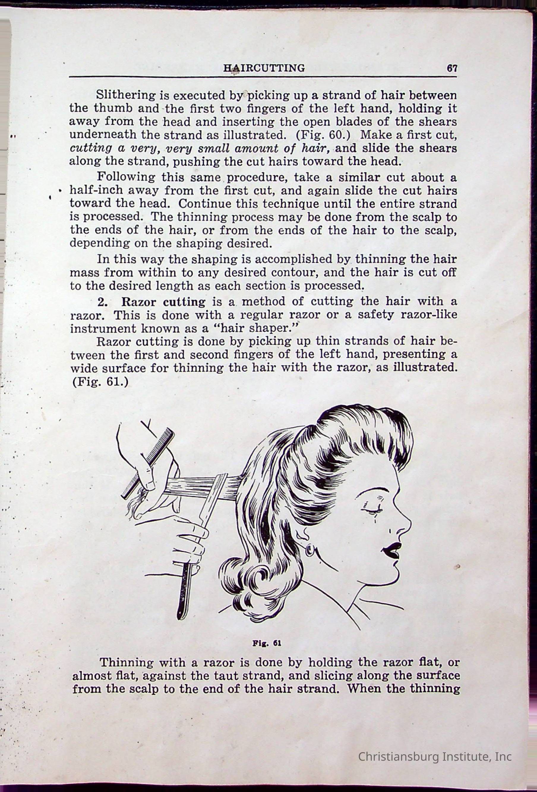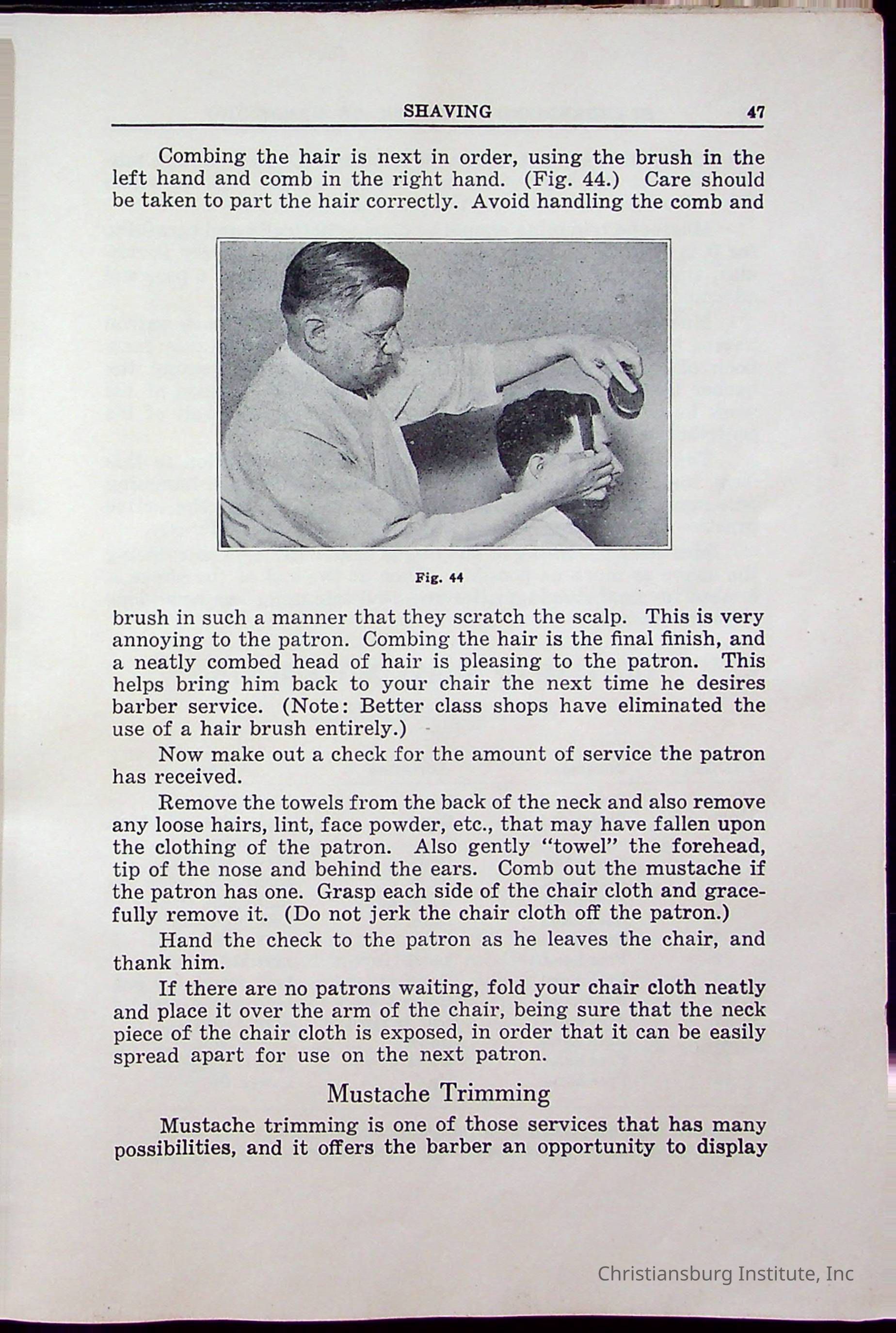 "Standardized Textbook of Barbering: in Two Parts" written and published by the Associated Master Barbers and Beauticians of America in the year 1950. This textbook was in the Christiansburg Institute library.