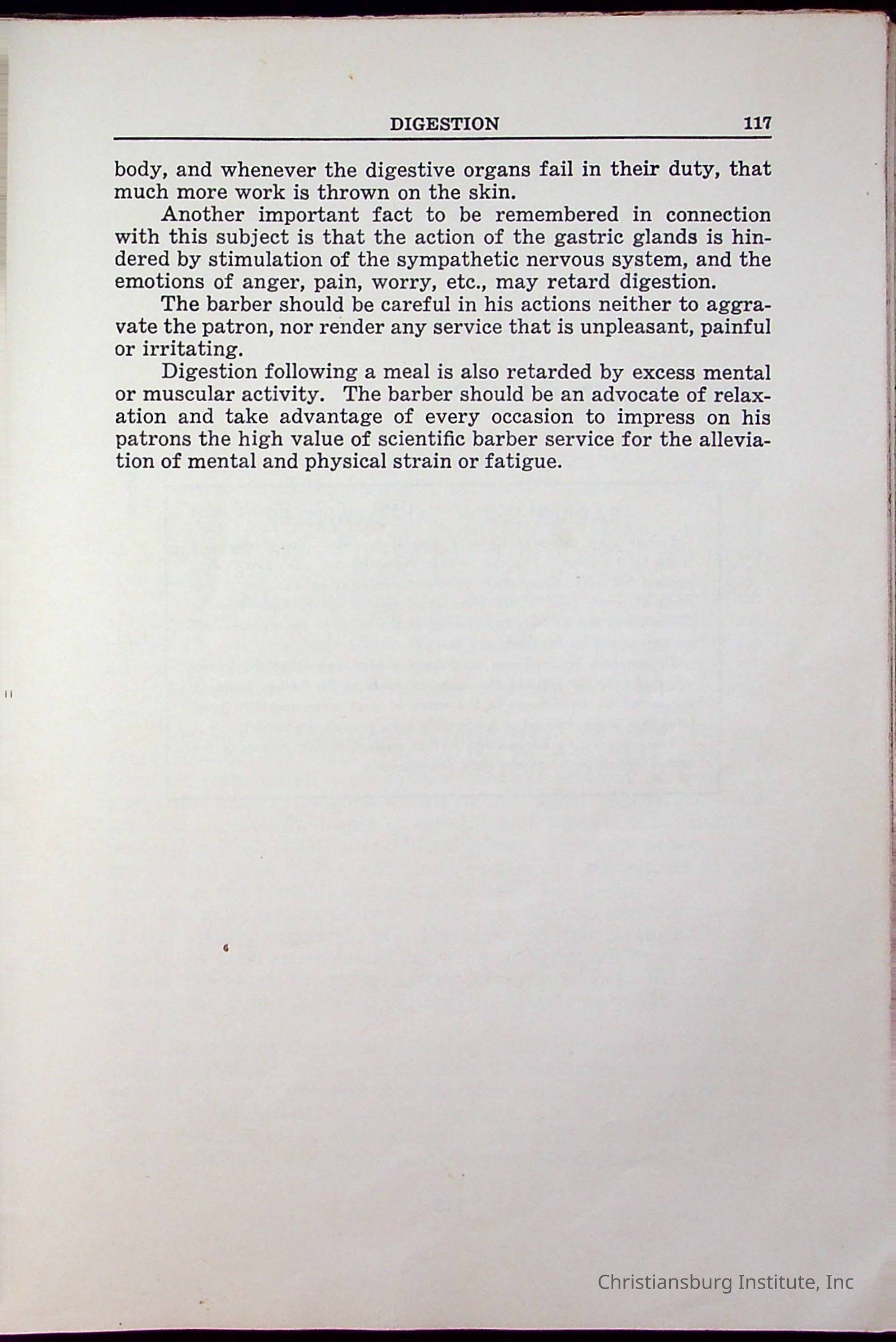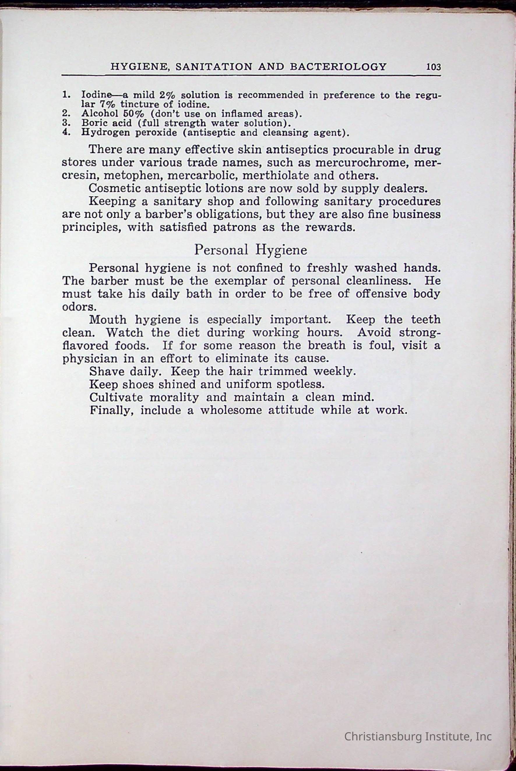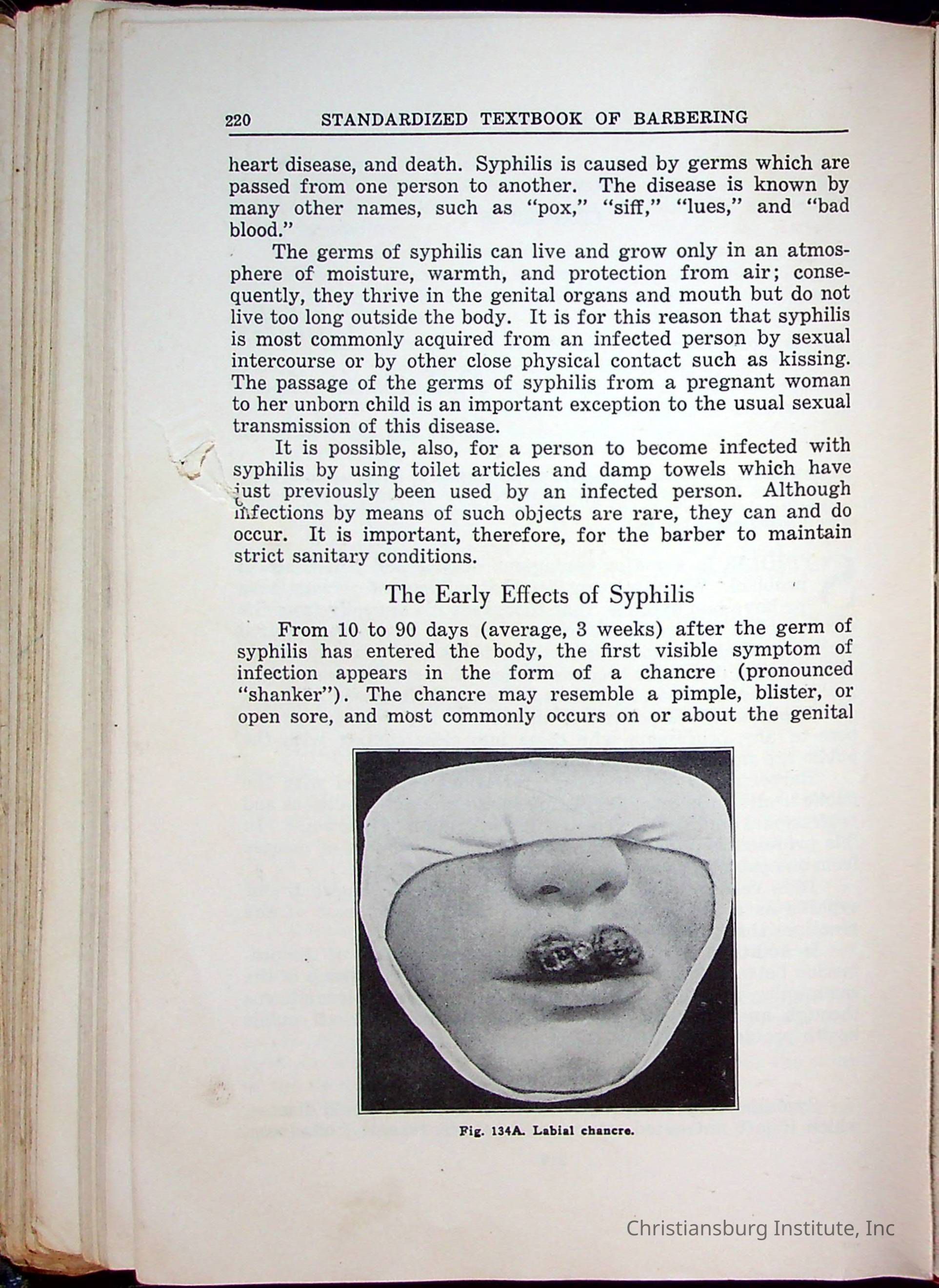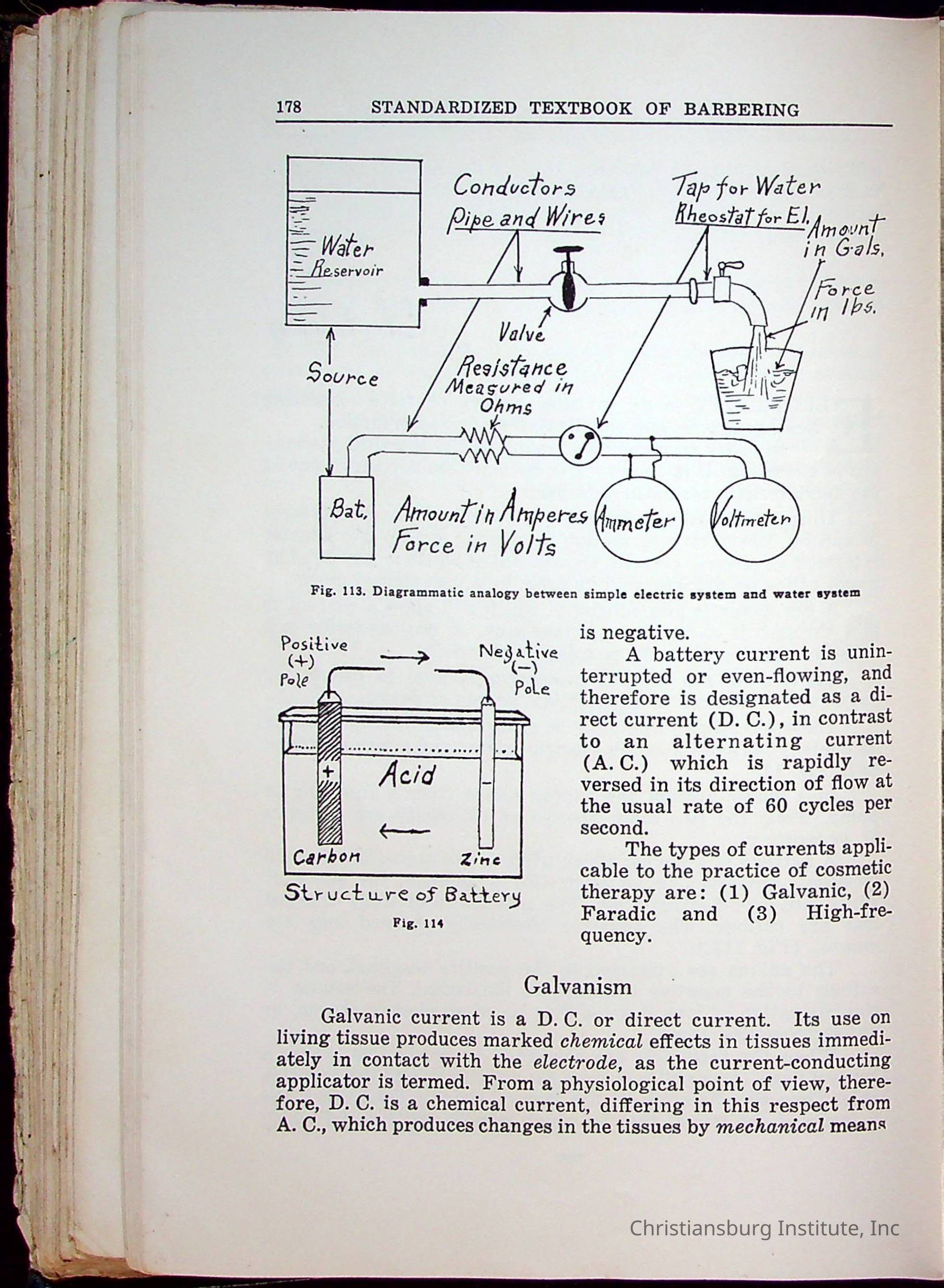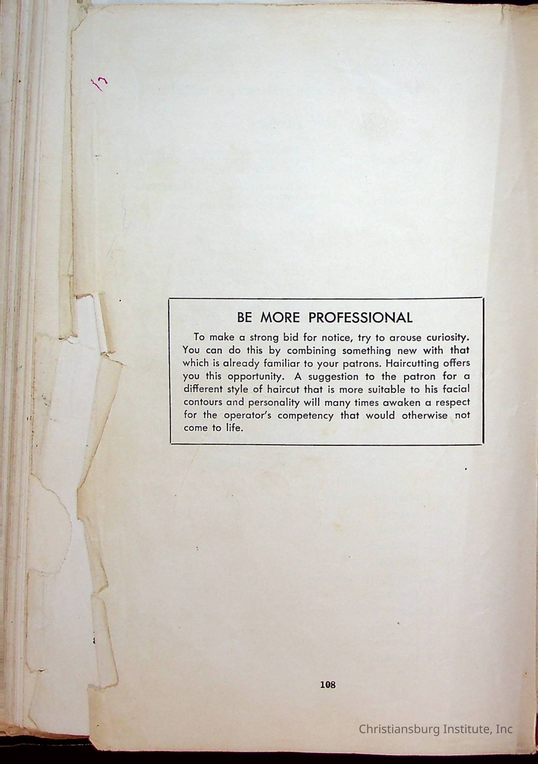 "Standardized Textbook of Barbering: in Two Parts" written and published by the Associated Master Barbers and Beauticians of America in the year 1950. This textbook was in the Christiansburg Institute library.