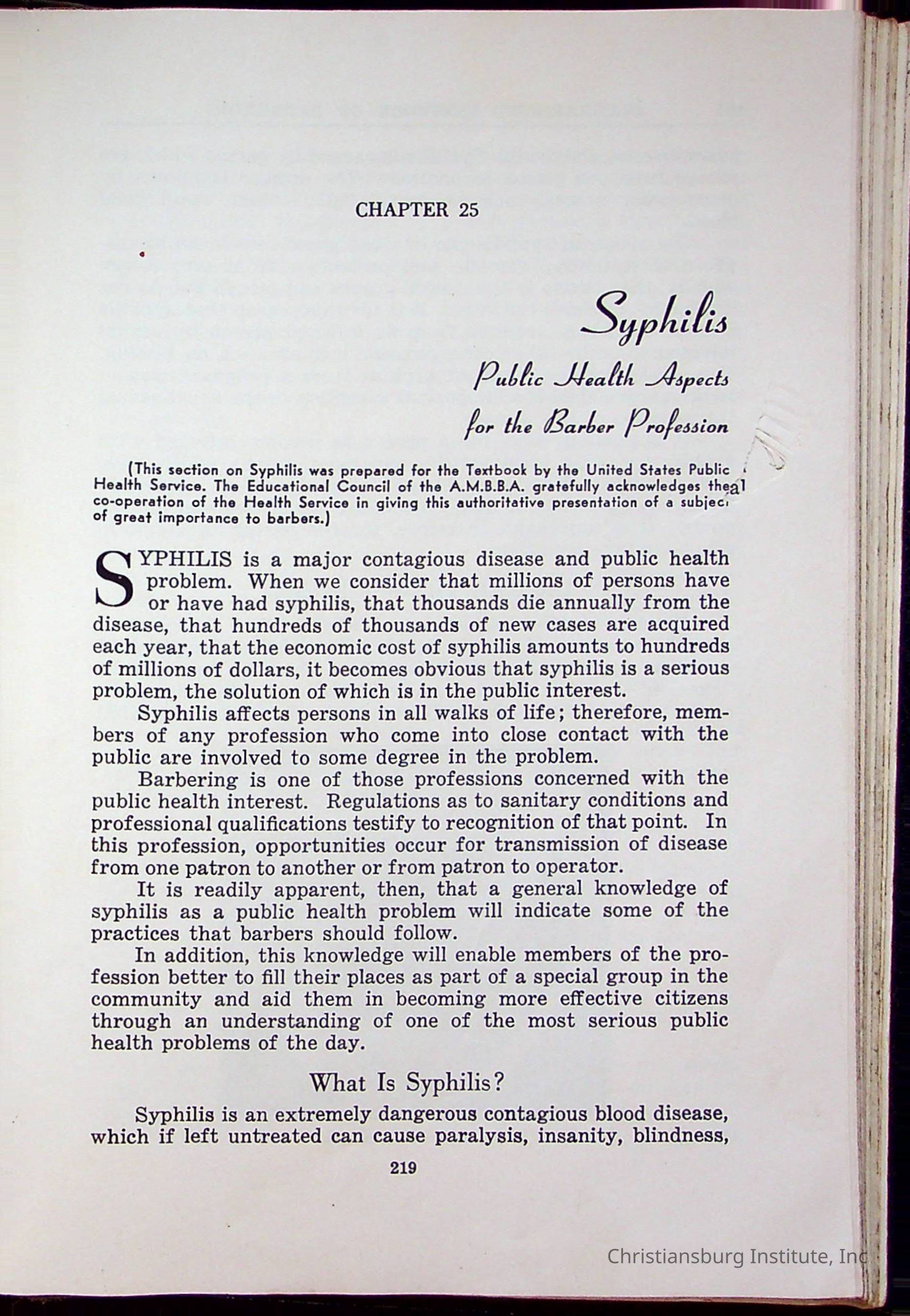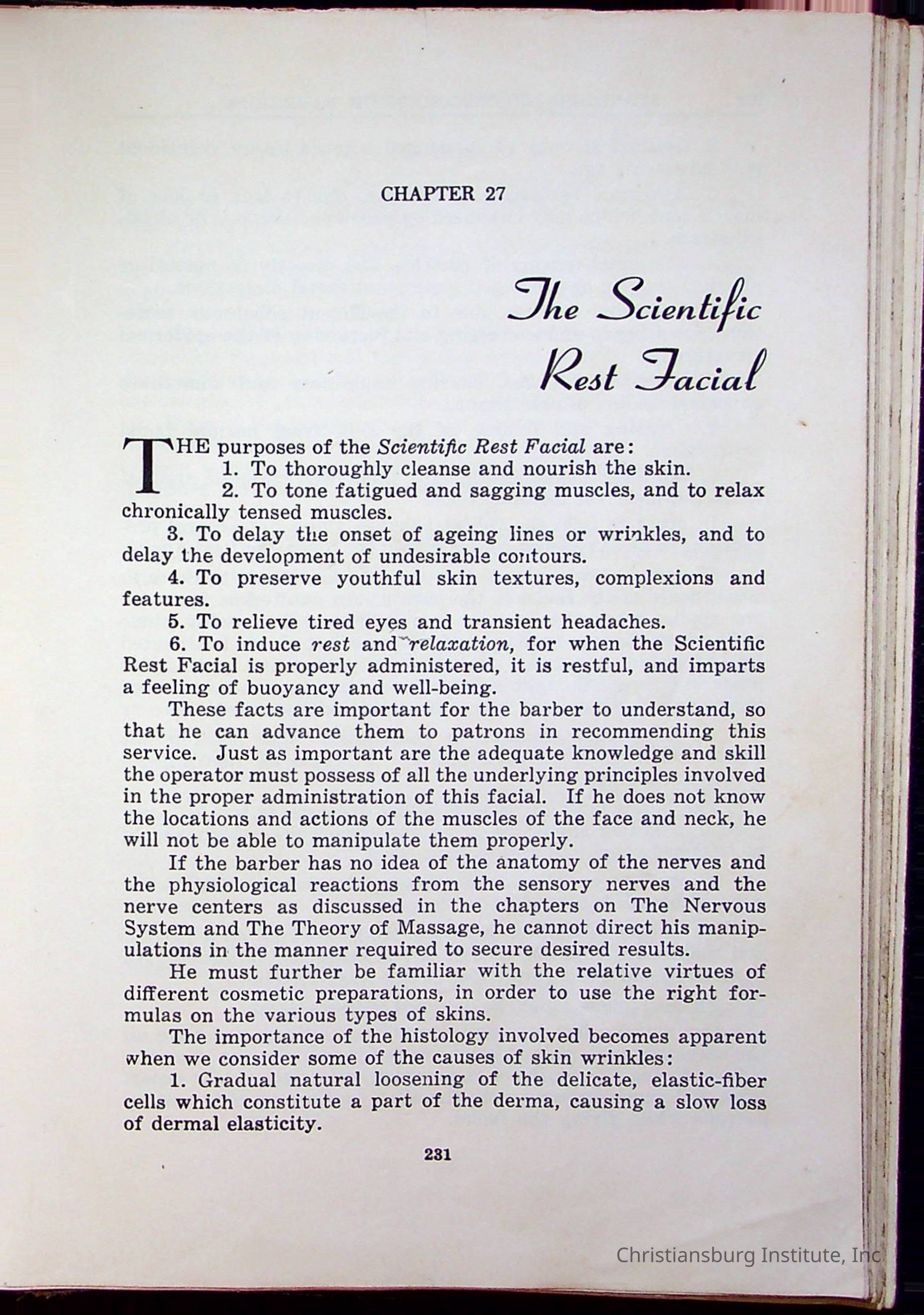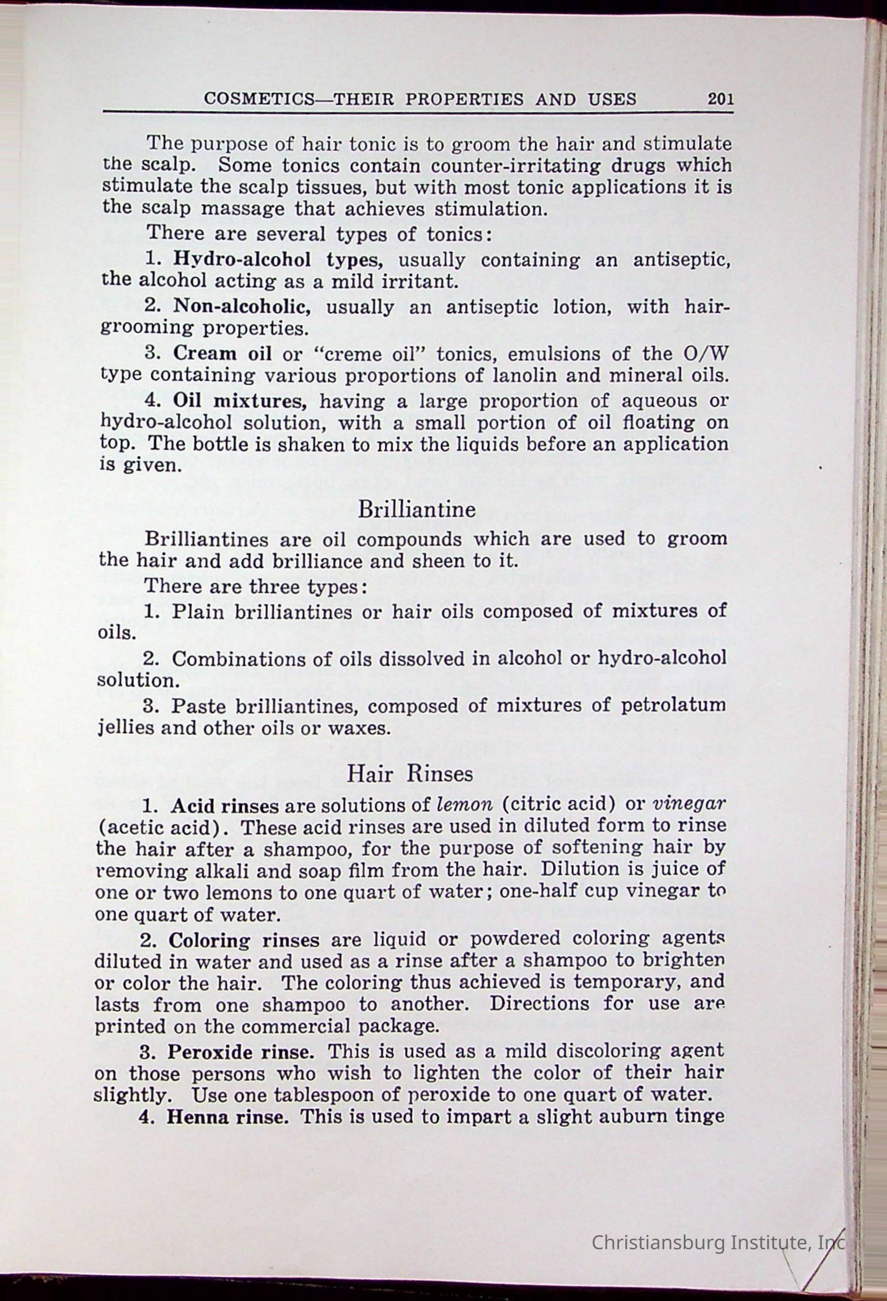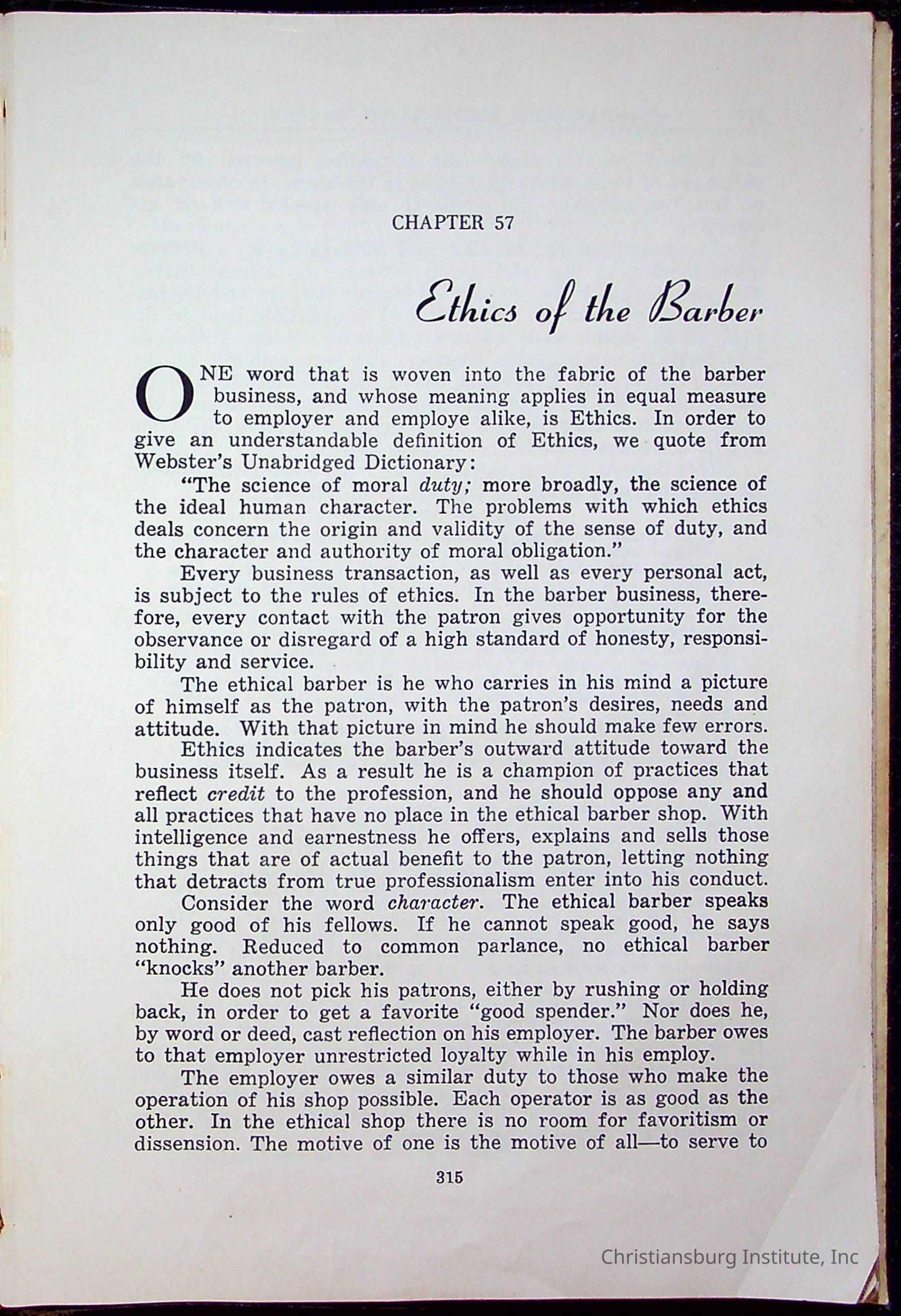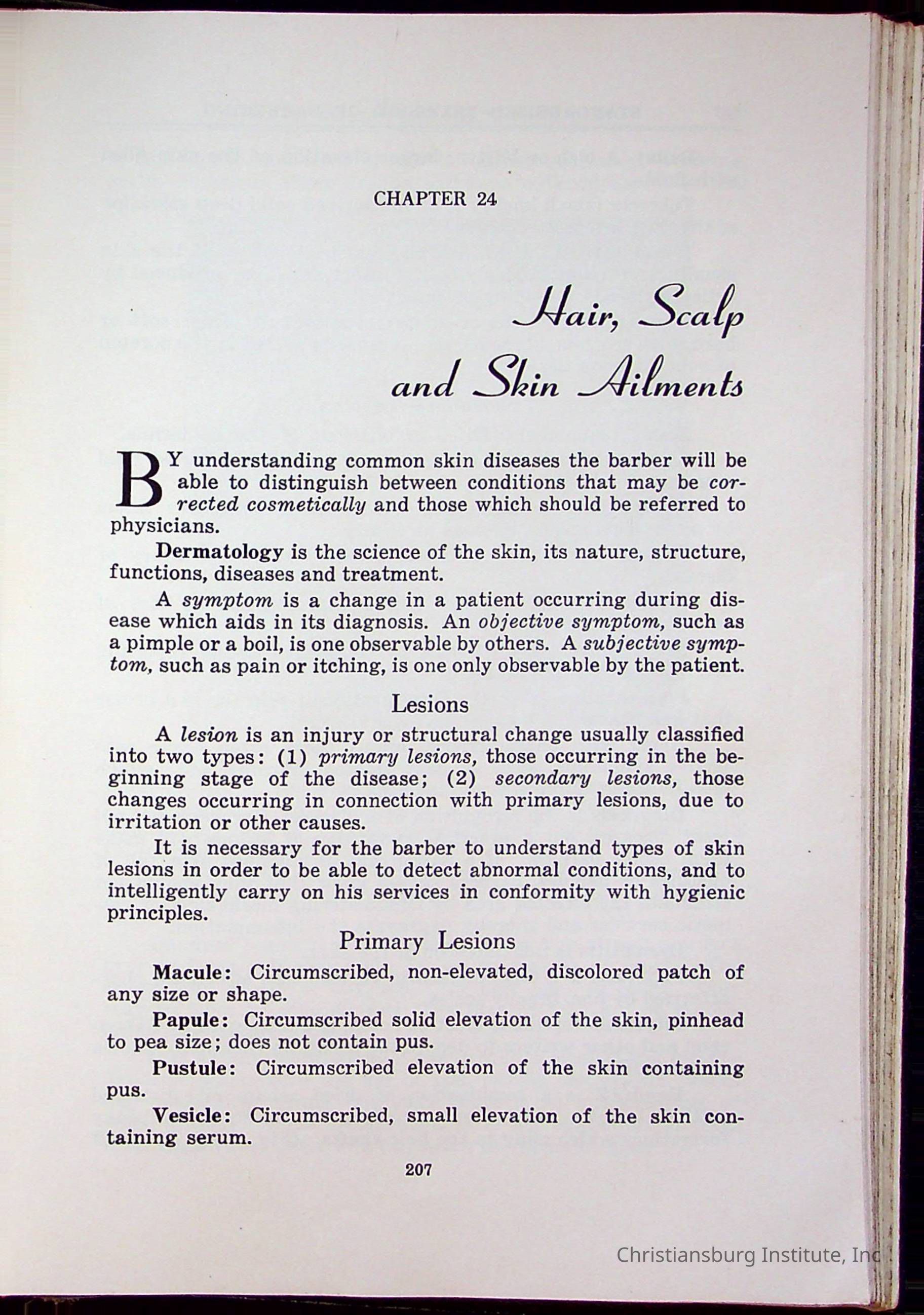 "Standardized Textbook of Barbering: in Two Parts" written and published by the Associated Master Barbers and Beauticians of America in the year 1950. This textbook was in the Christiansburg Institute library.
