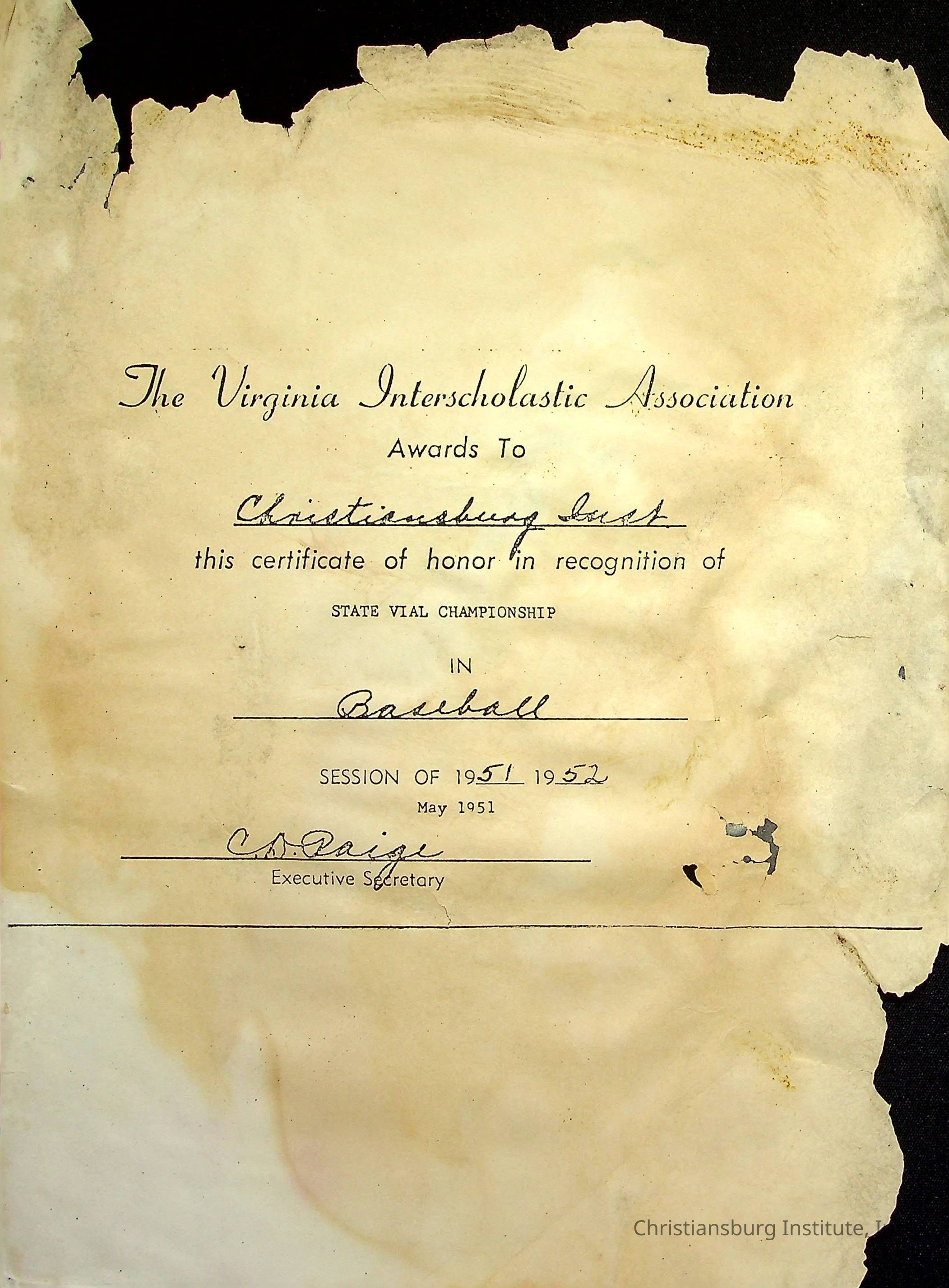 An award for the State VIAL Championship in baseball awarded to Christiansburg Institute for the 1951-1952 season issued by the Virginia Interscholastic Association.Creator