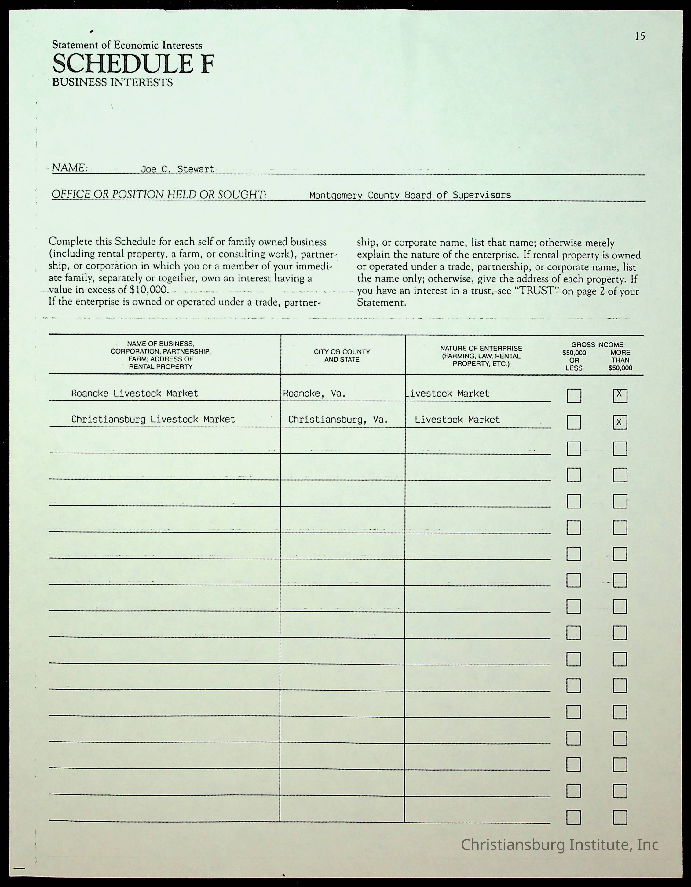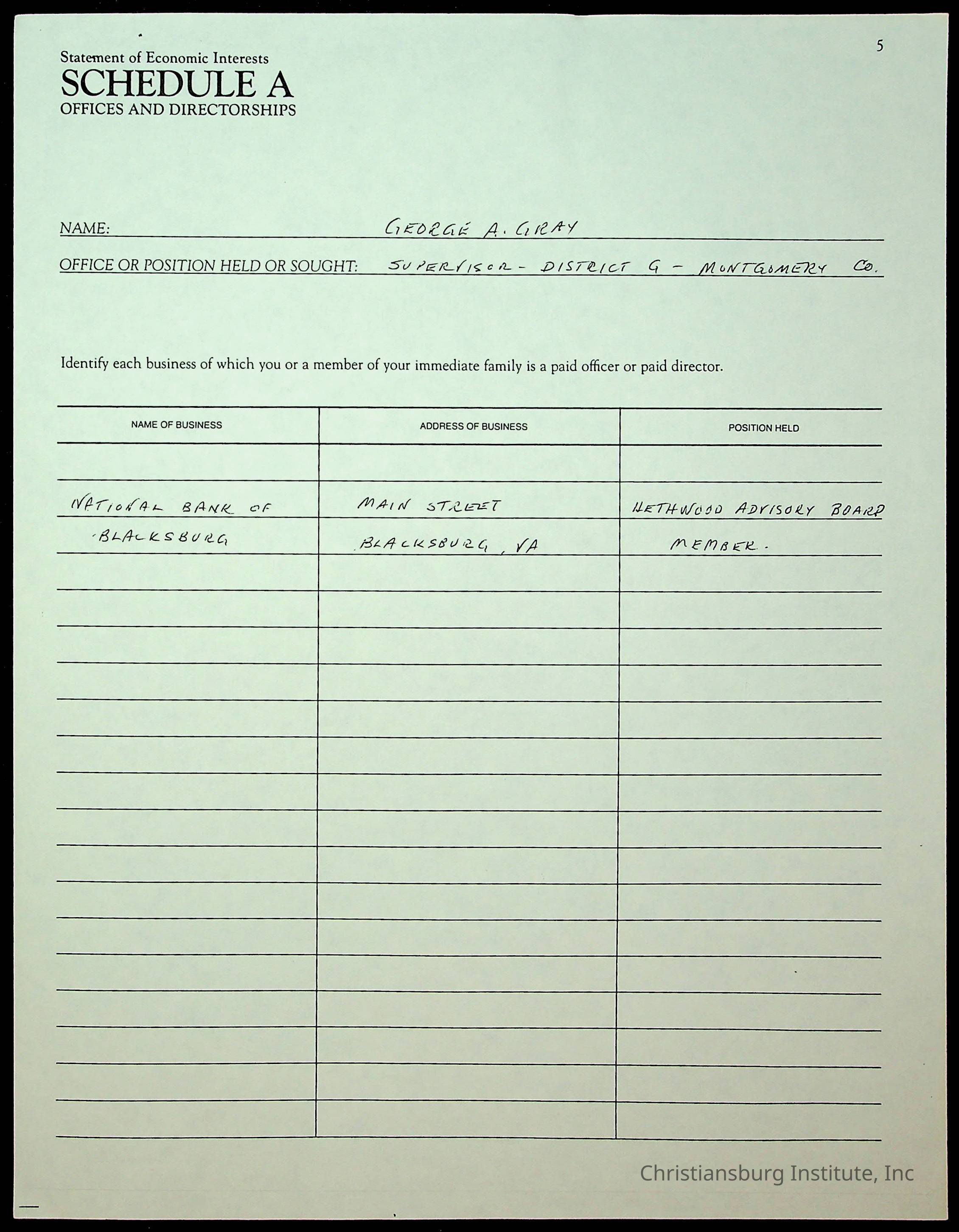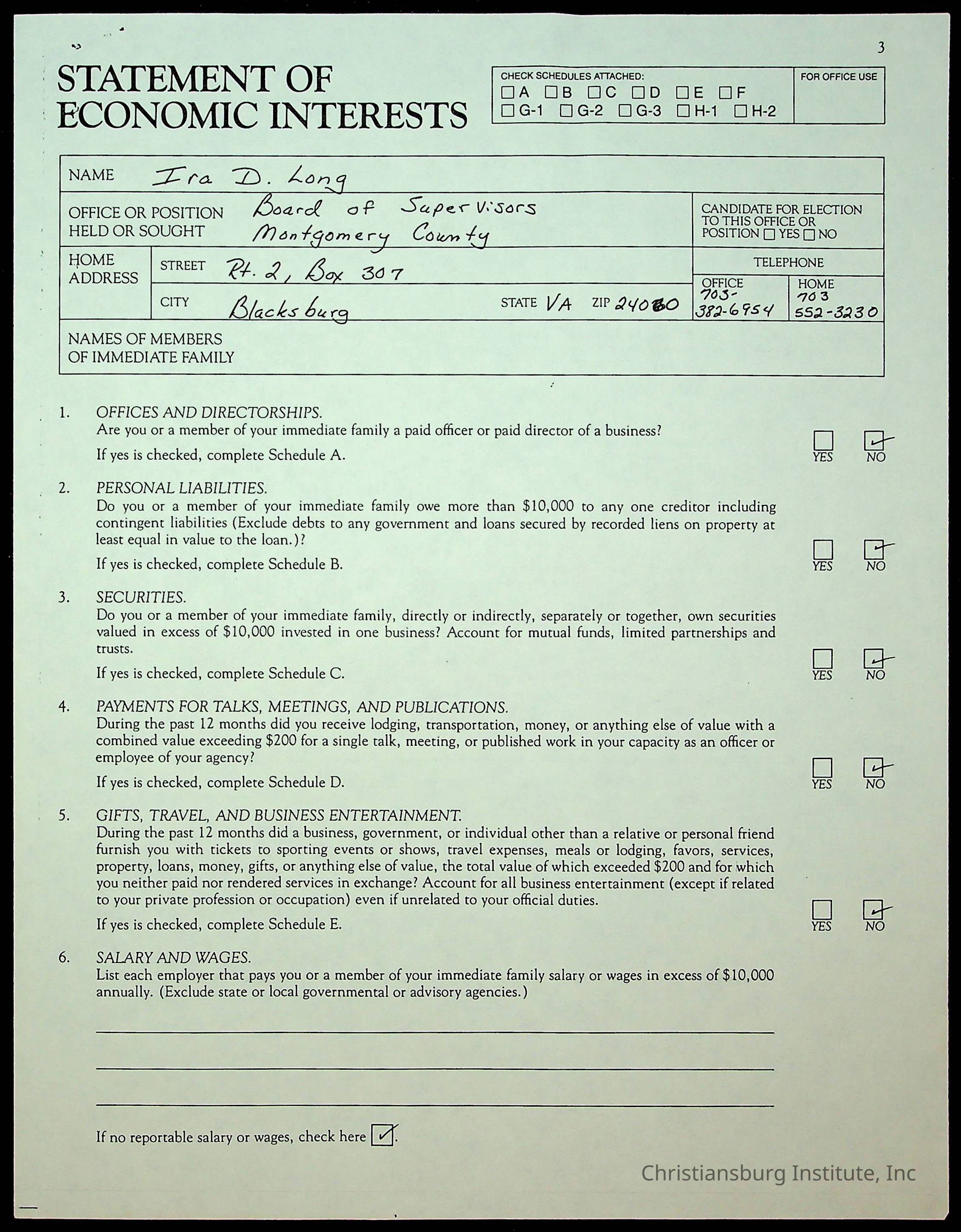 A series of statements of economic interests from the Montgomery County board of supervisors, undated.