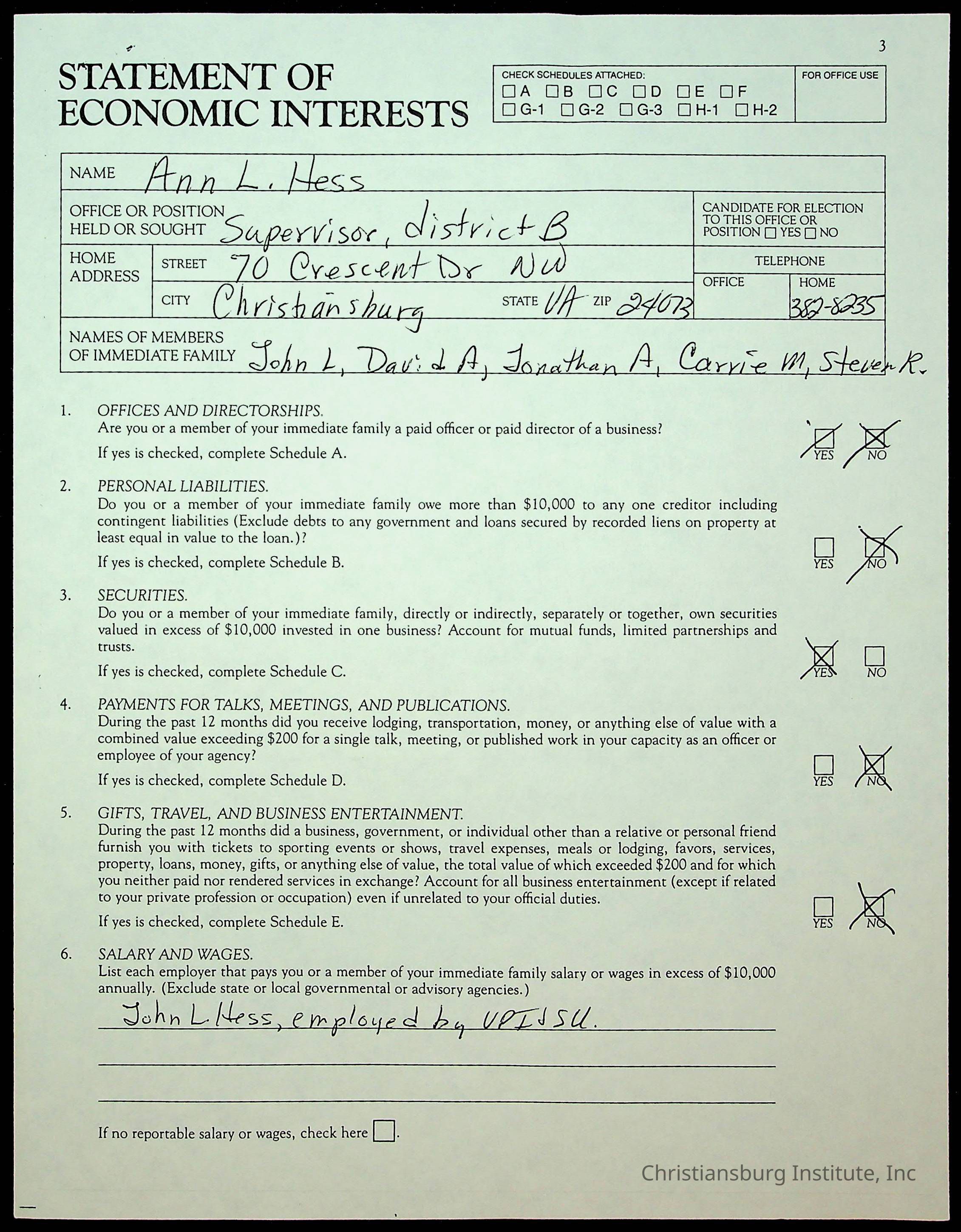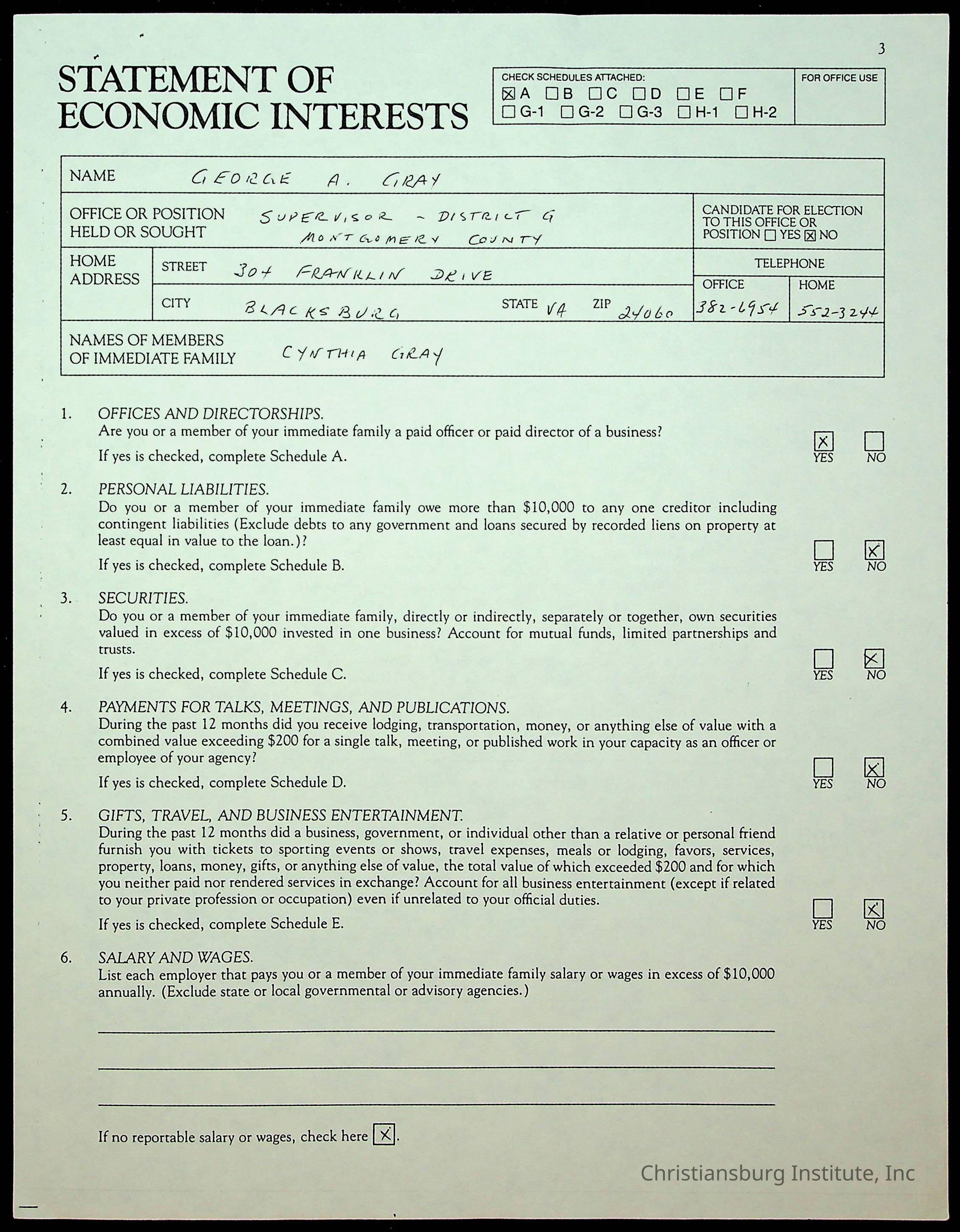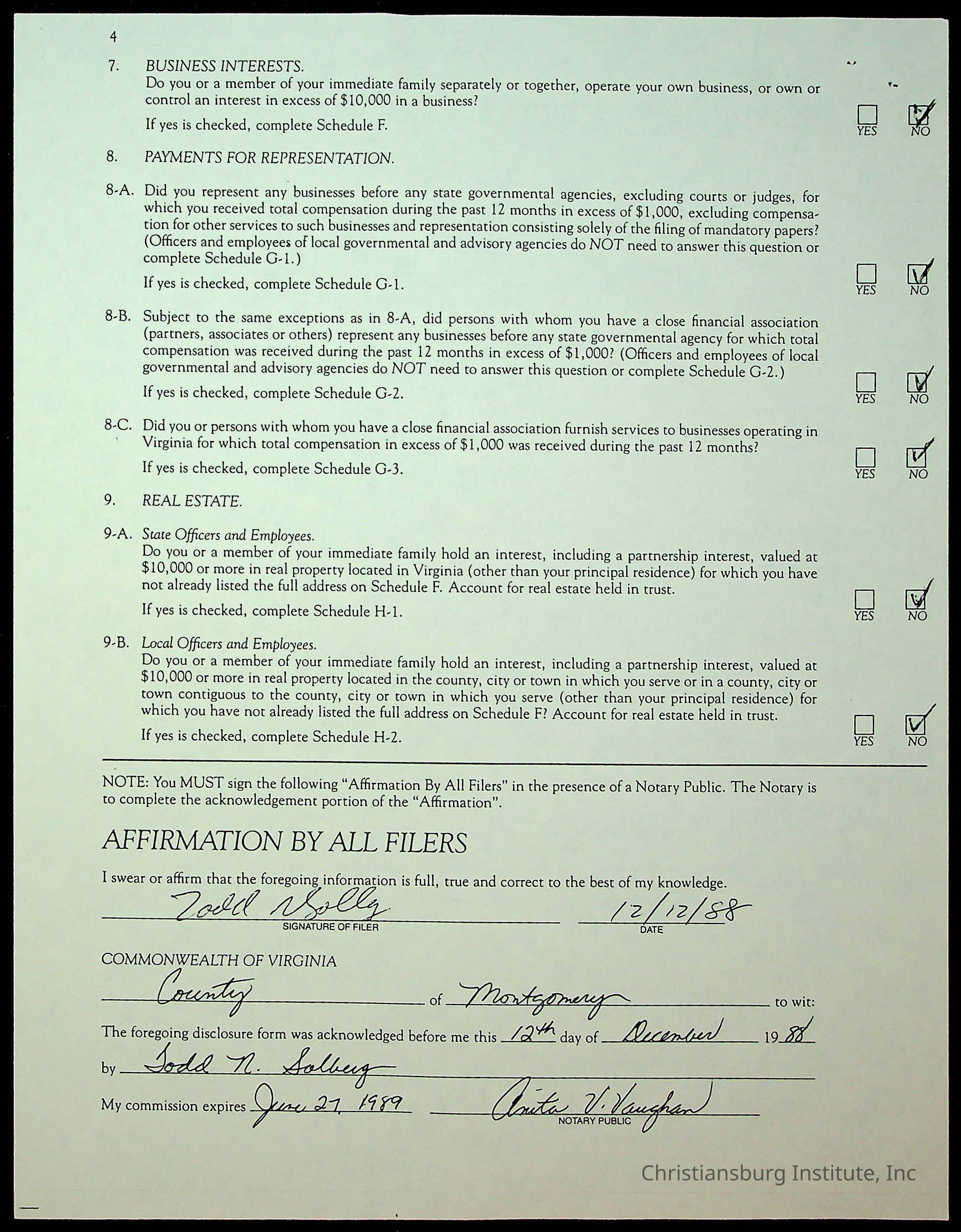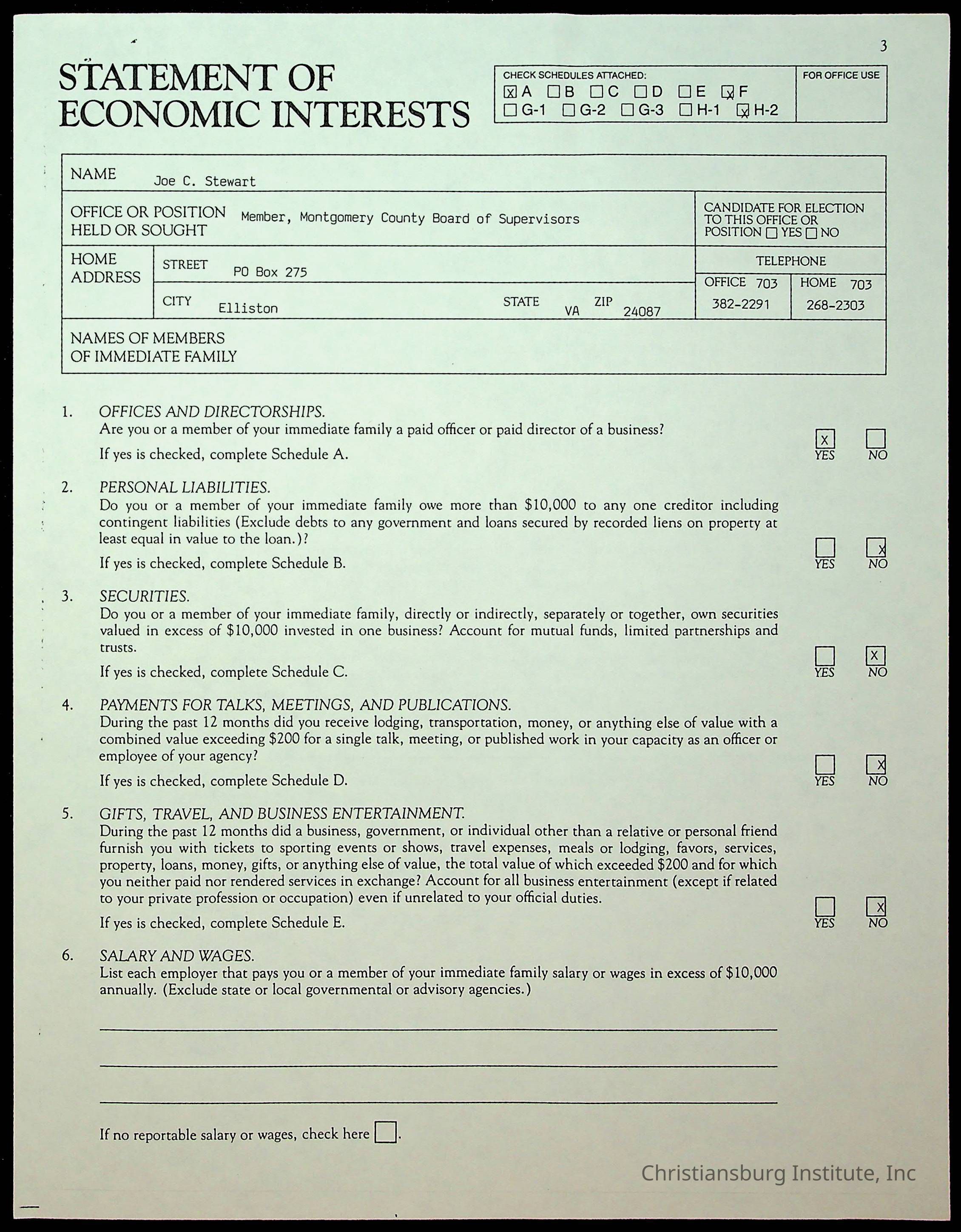 Statements of Economic Interests, Montgomery County Supervisors, 1988