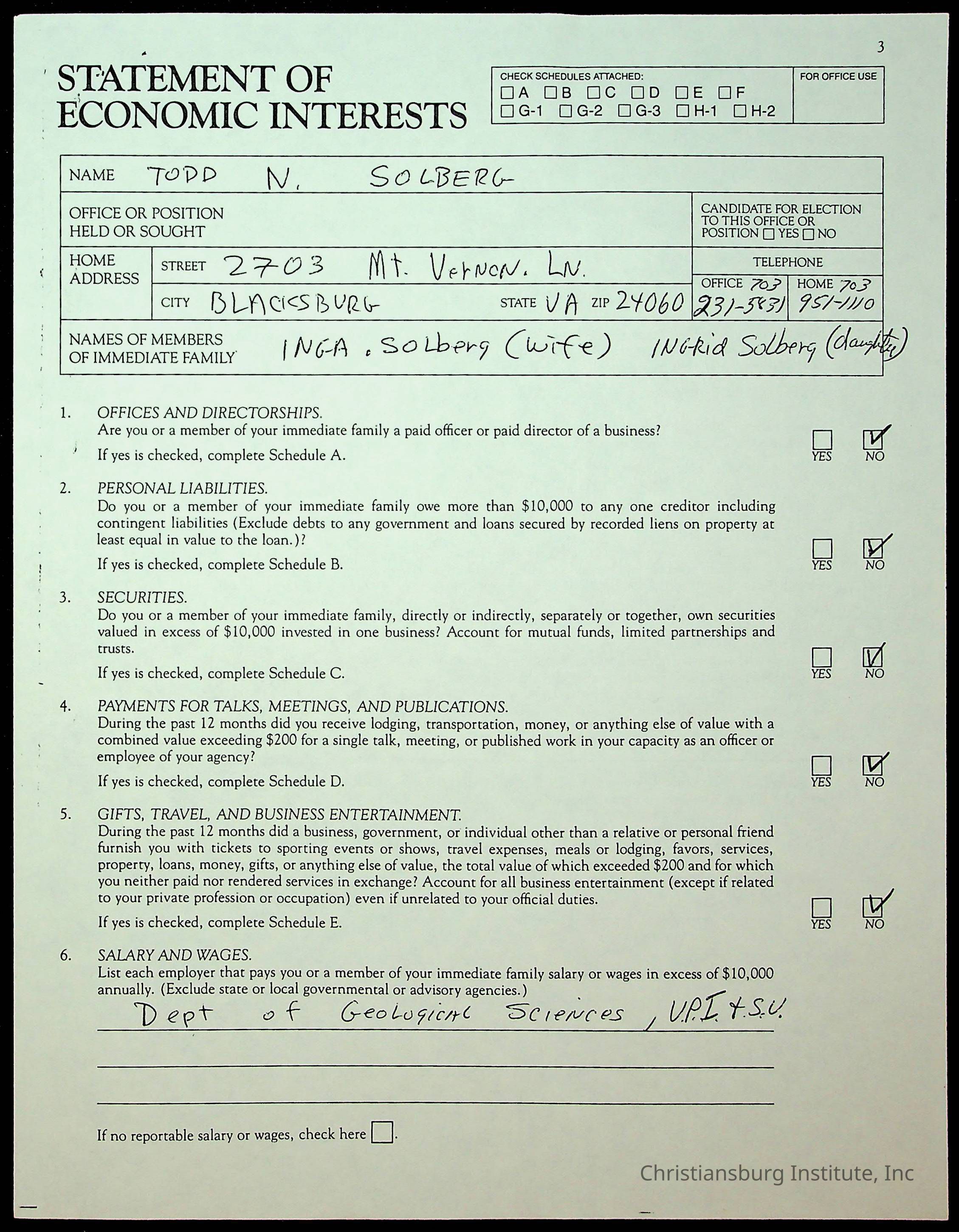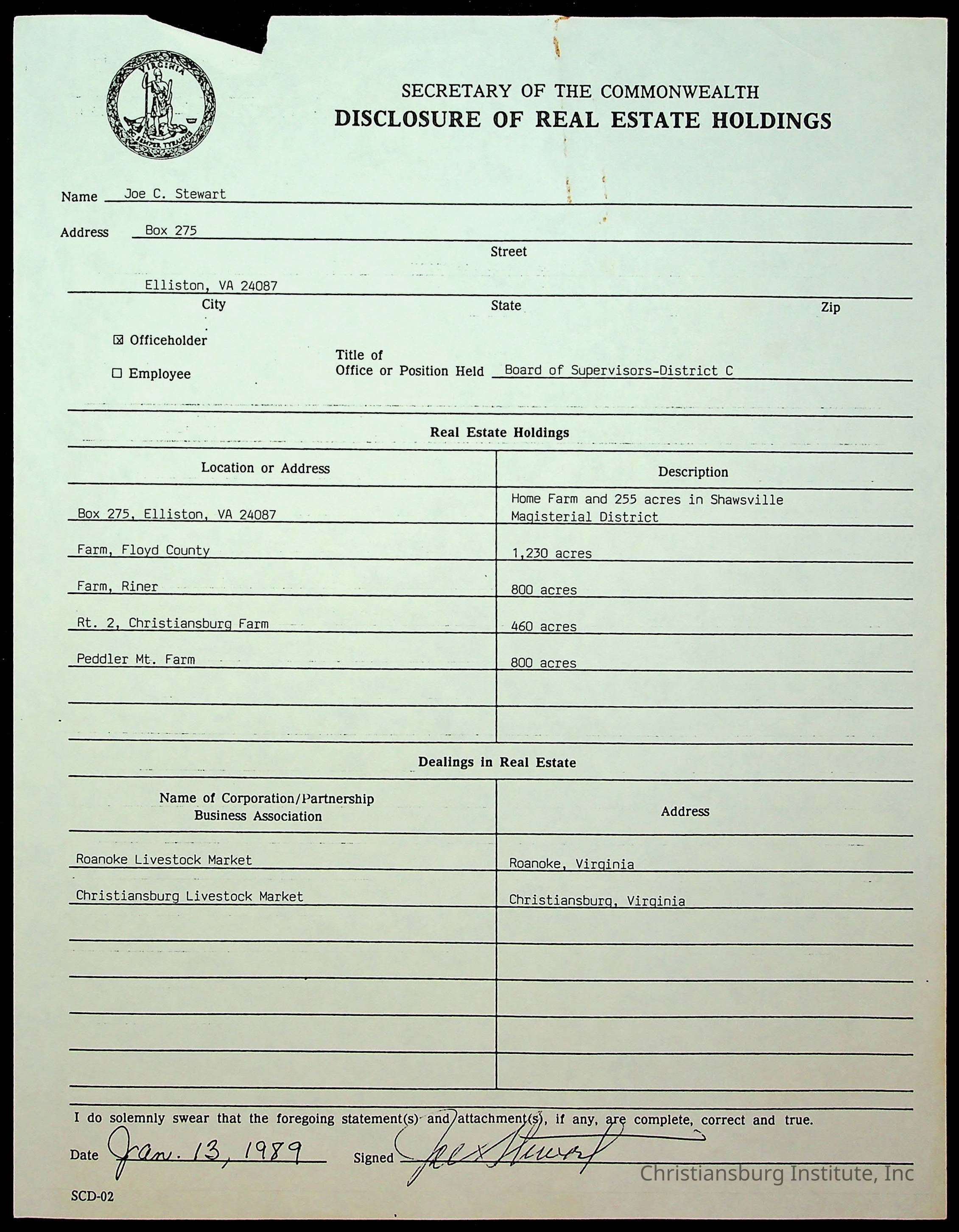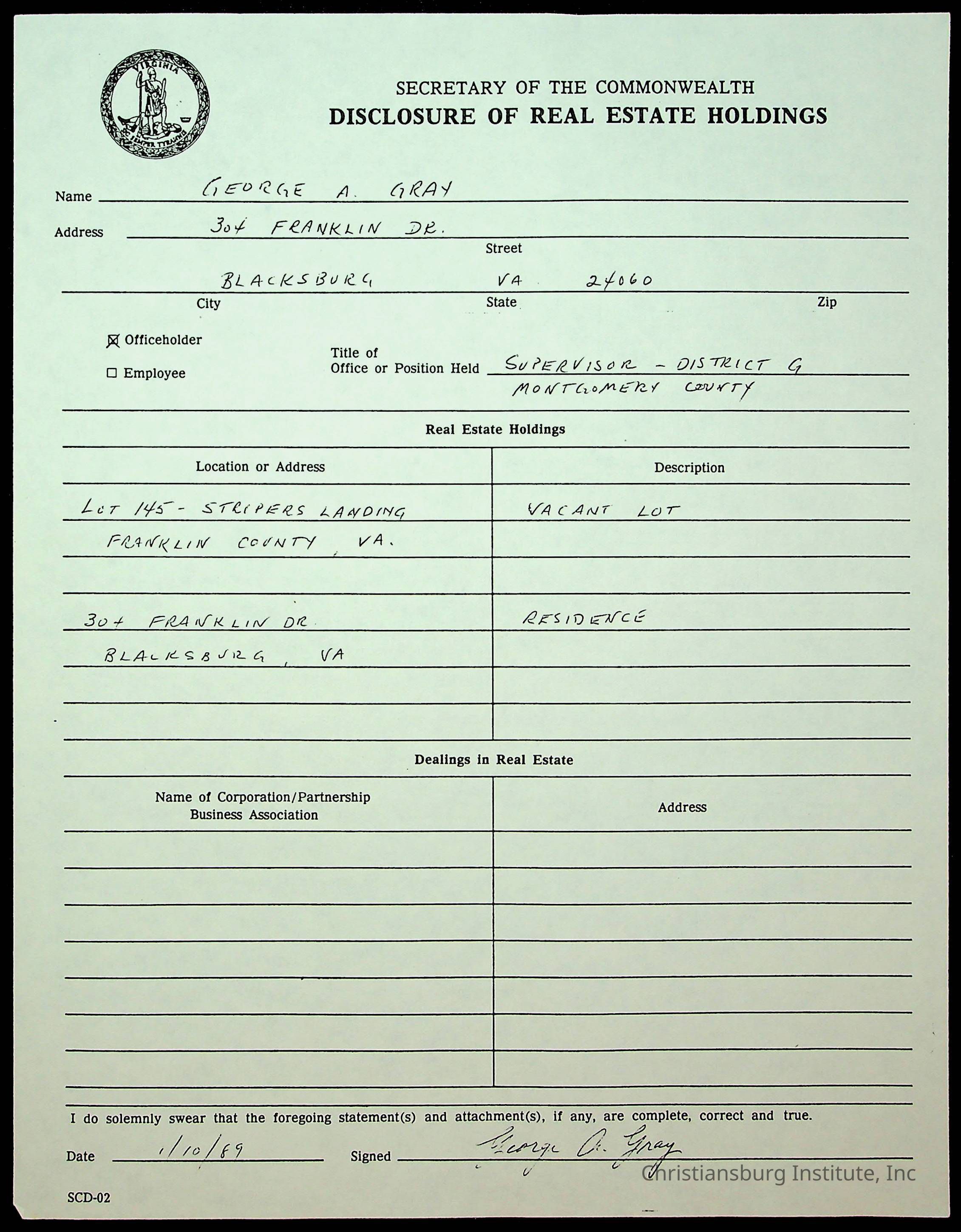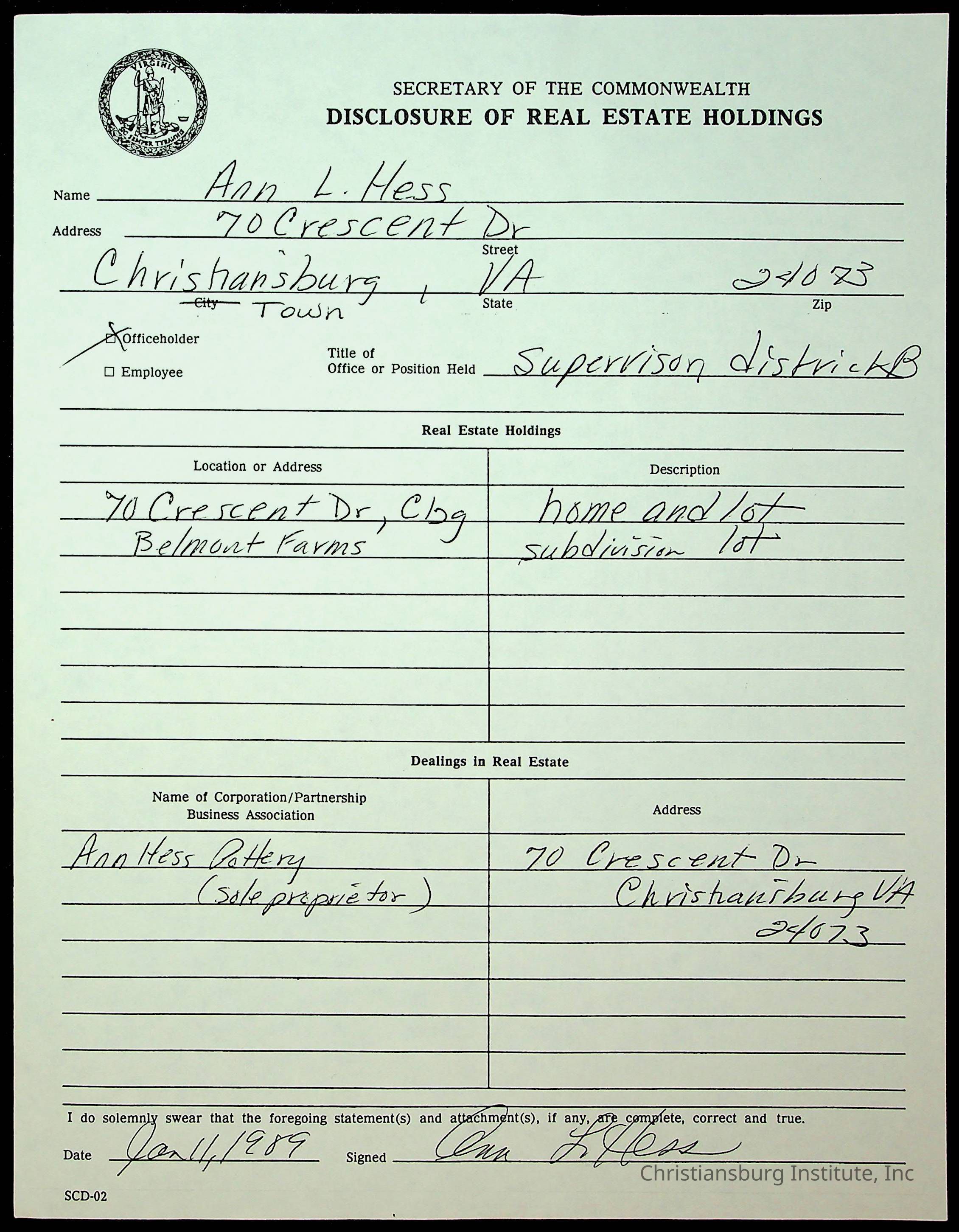 Statements of Economic Interests, Montgomery County Supervisors, 1988