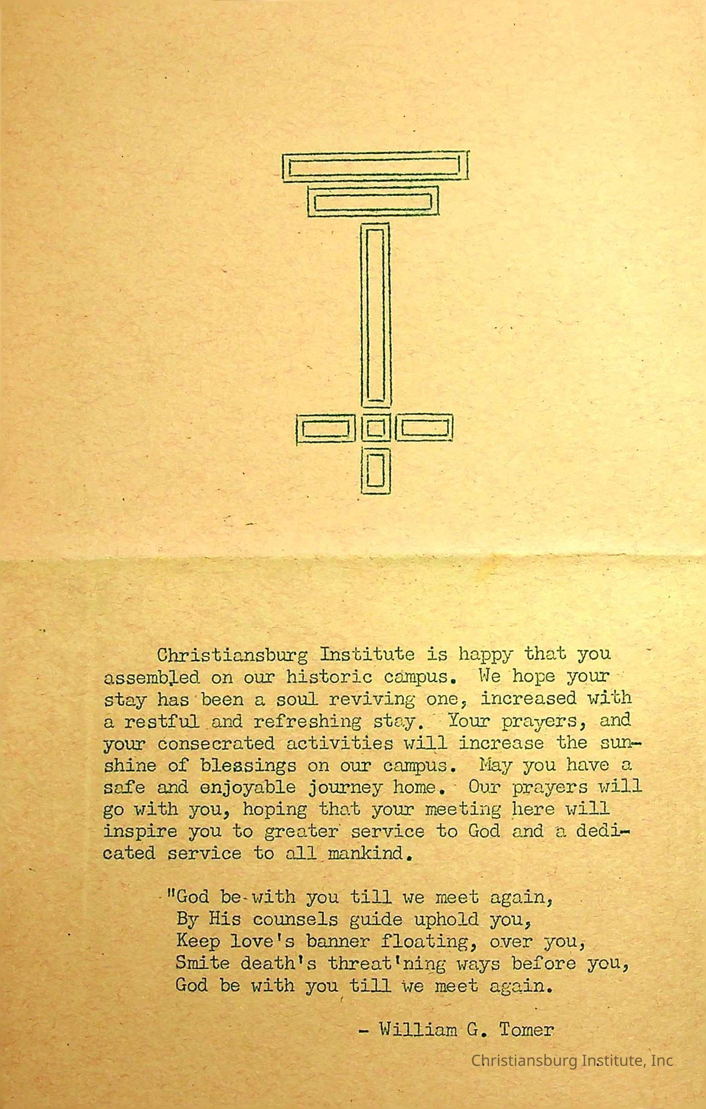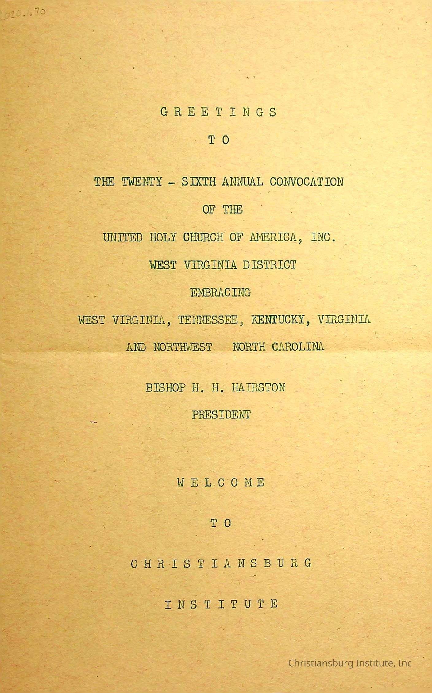 An event program for the 26th Annual Convocation of the United Holy Church of America, Inc held at Christiansburg Institute, circa 1950s.Creator