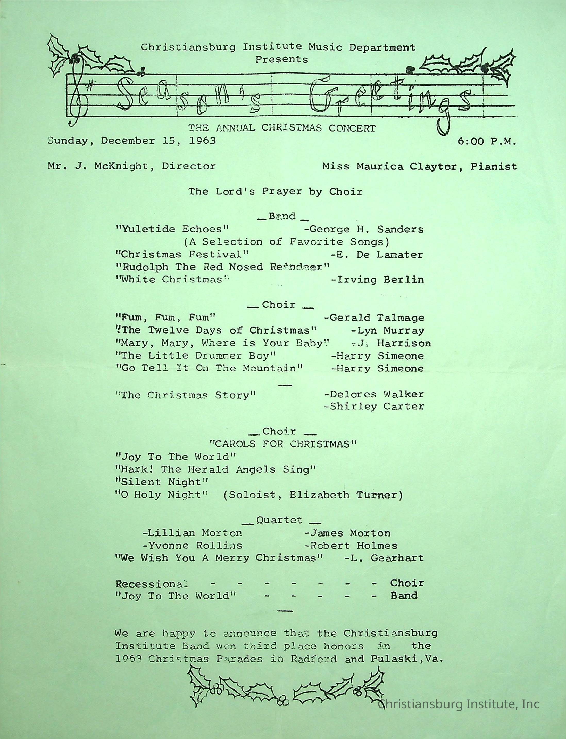 An event program for the annual Christmas concert at Christiansburg Institute held on December 15th, 1963.