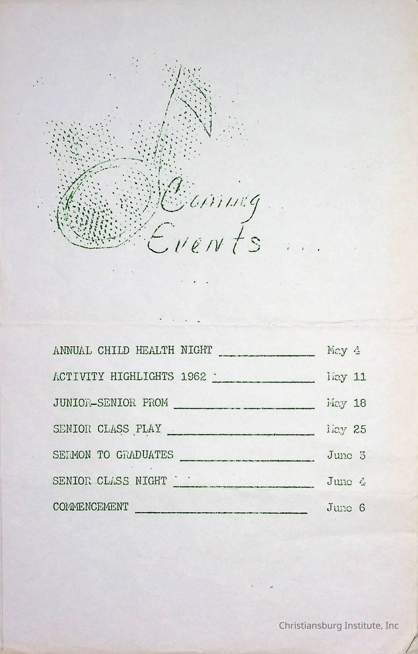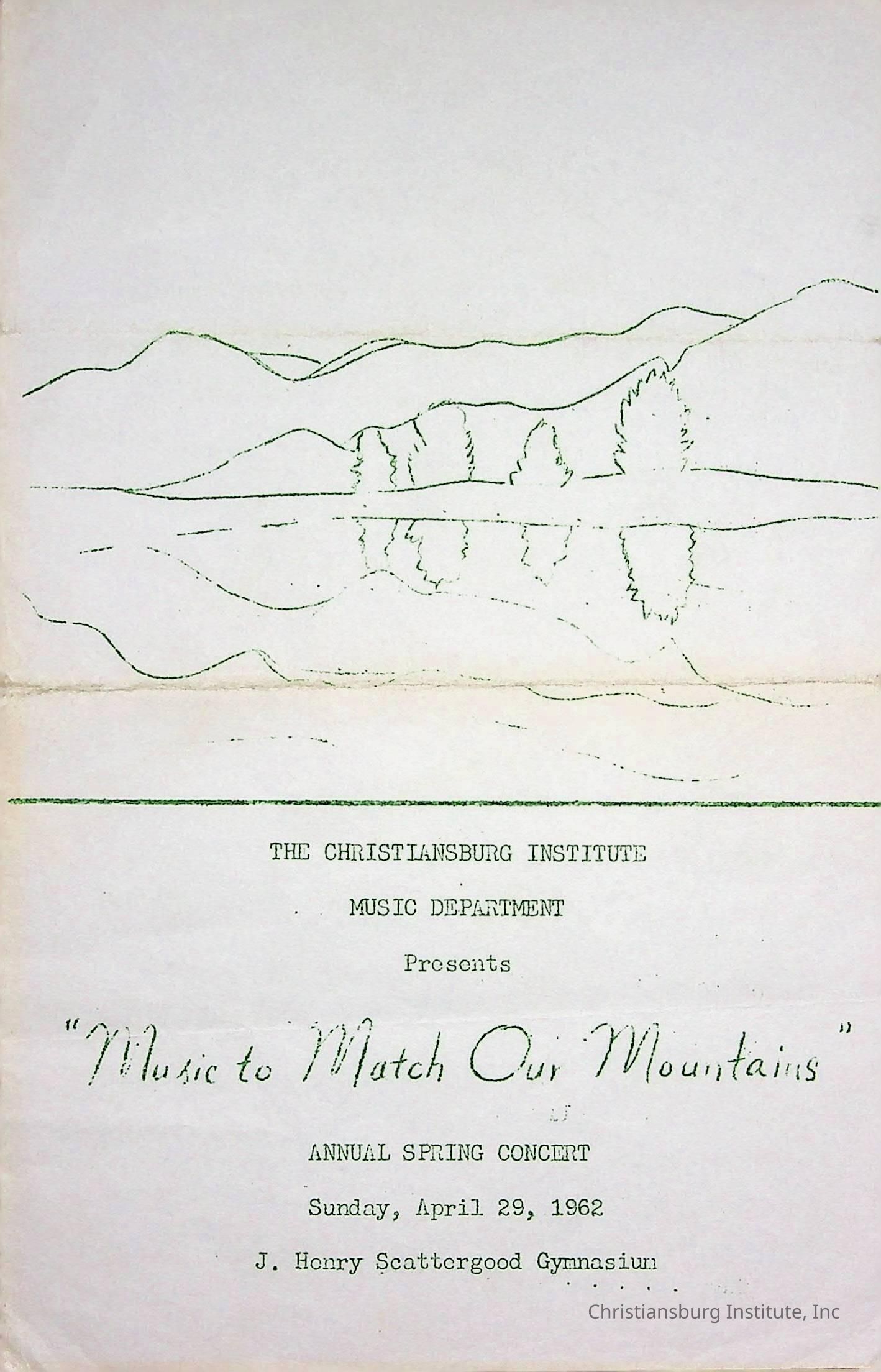 A program from the annual spring concert at Christiansburg Institute titled "Music to Match our Mountains" that took place on Sunday, April 29th, 1962.Creator