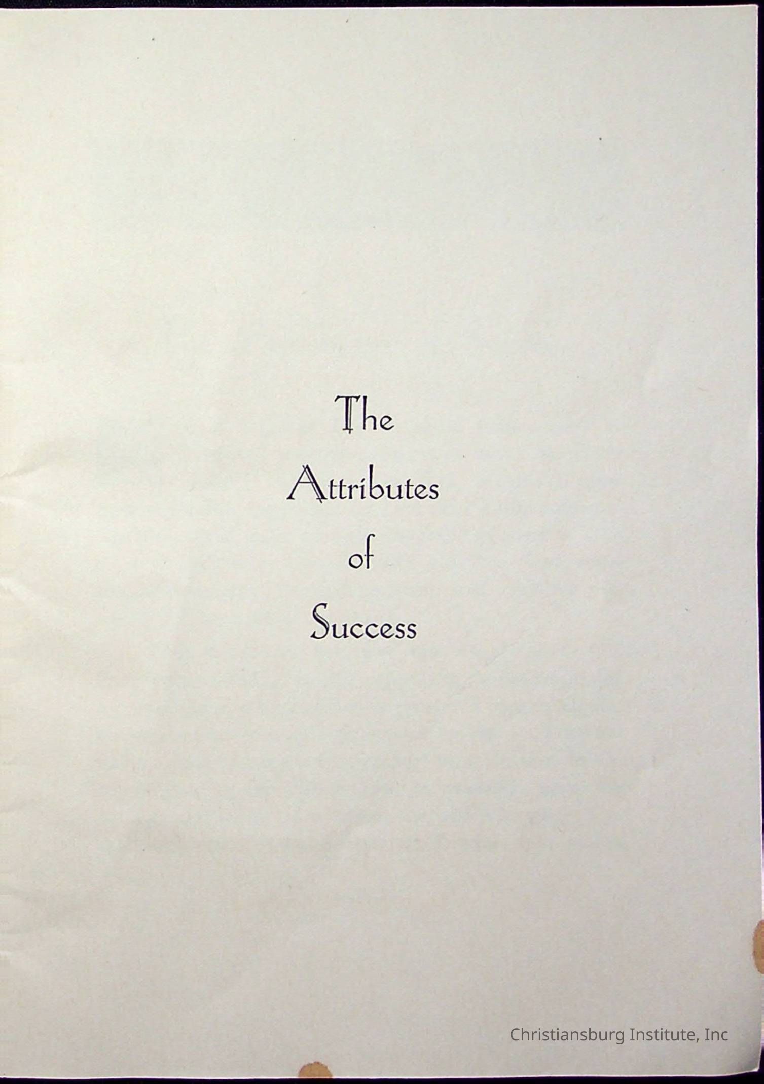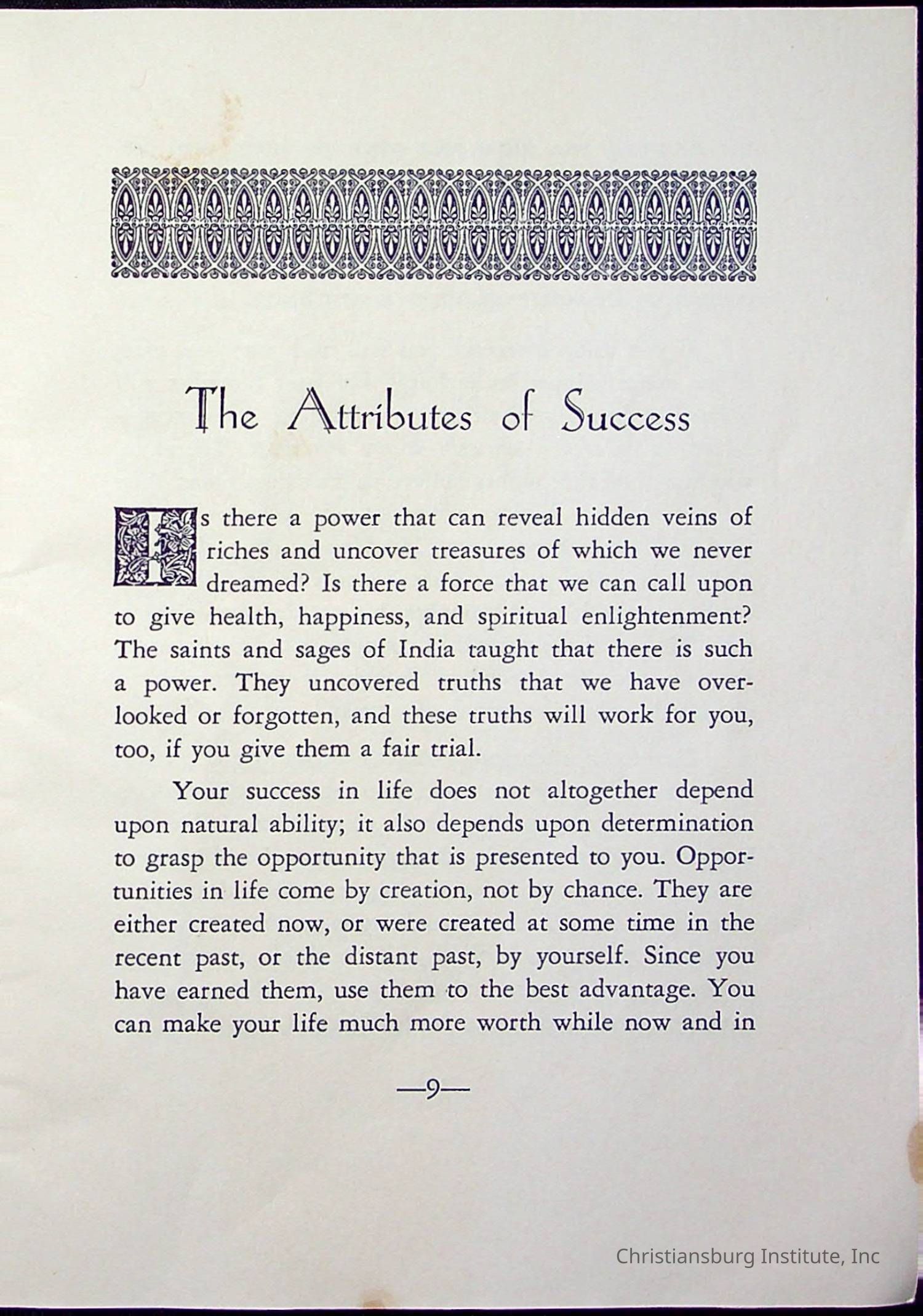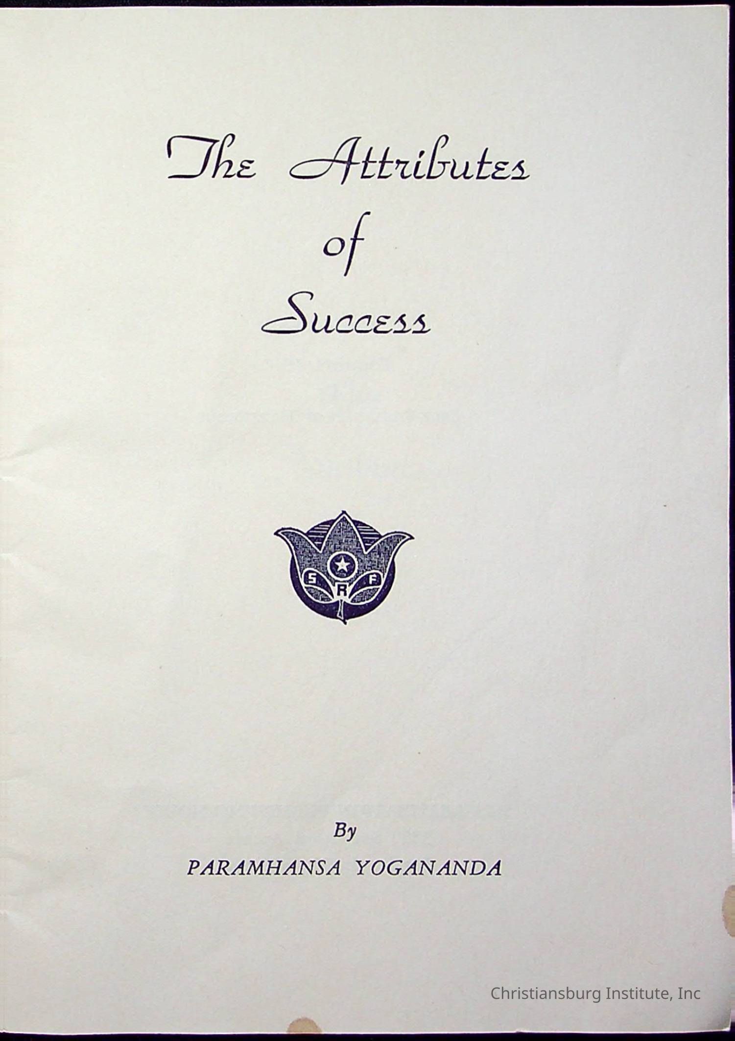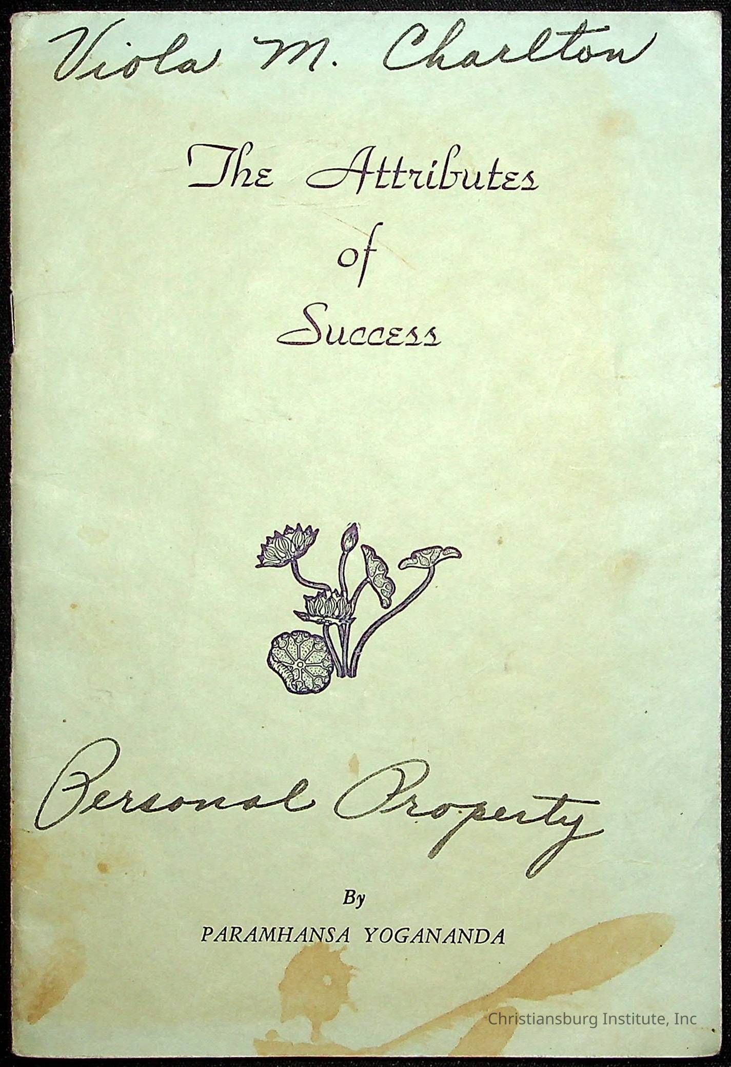 "The Attributes of Success" written by Paramhansa Yogananda published by the Self-Realization Publishing House in 1944. This book was owned by Christiansburg Institute teacher, Viola Charlton.Collection