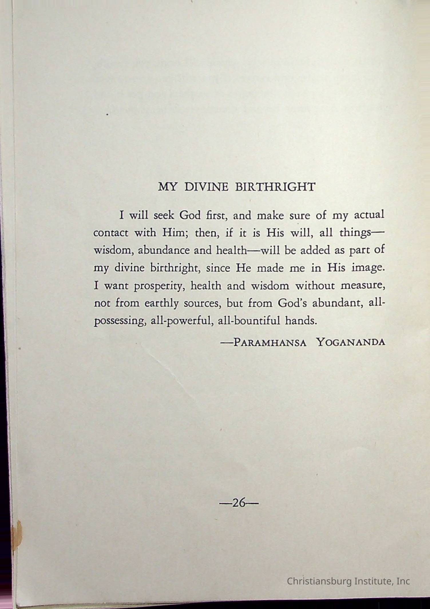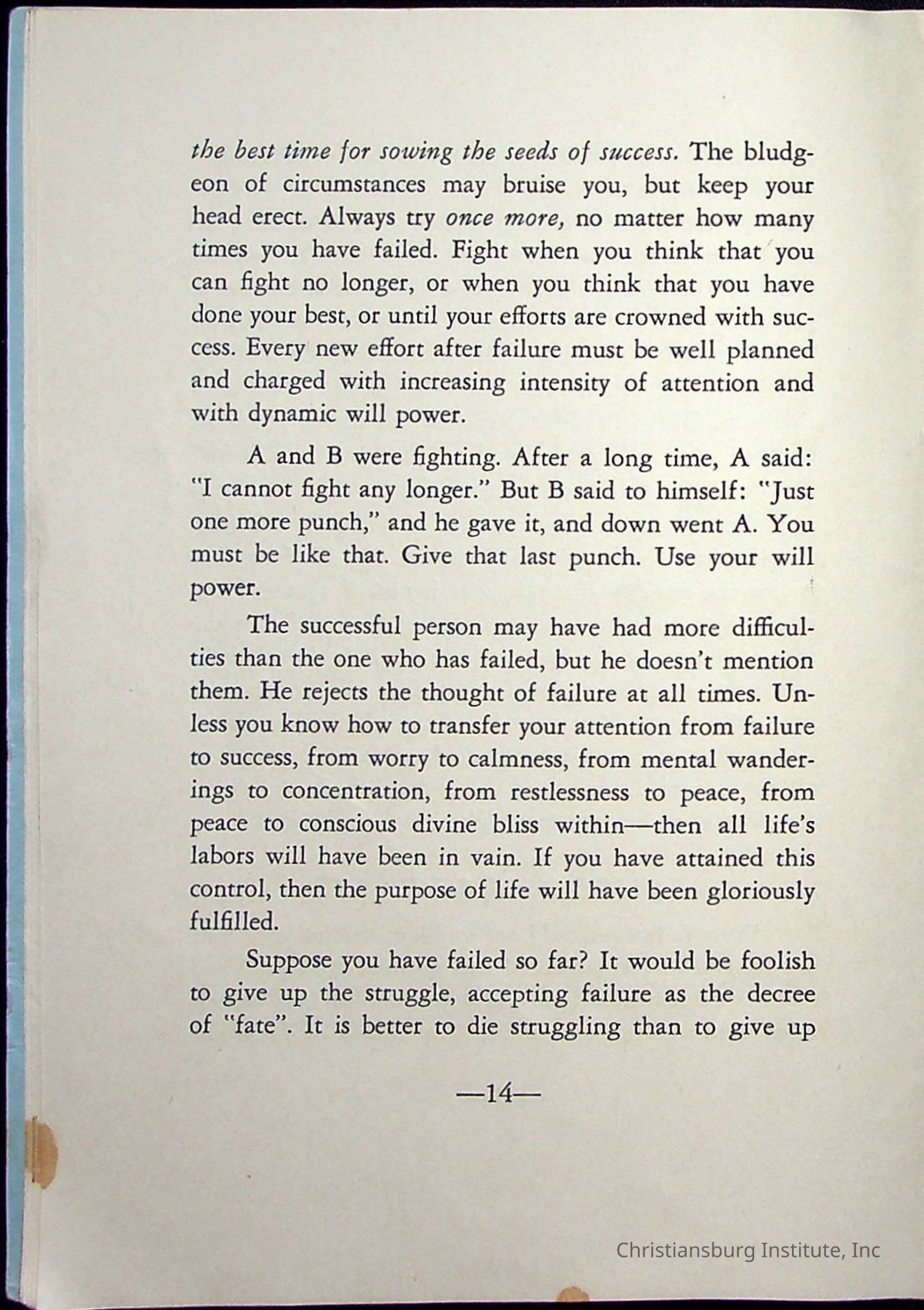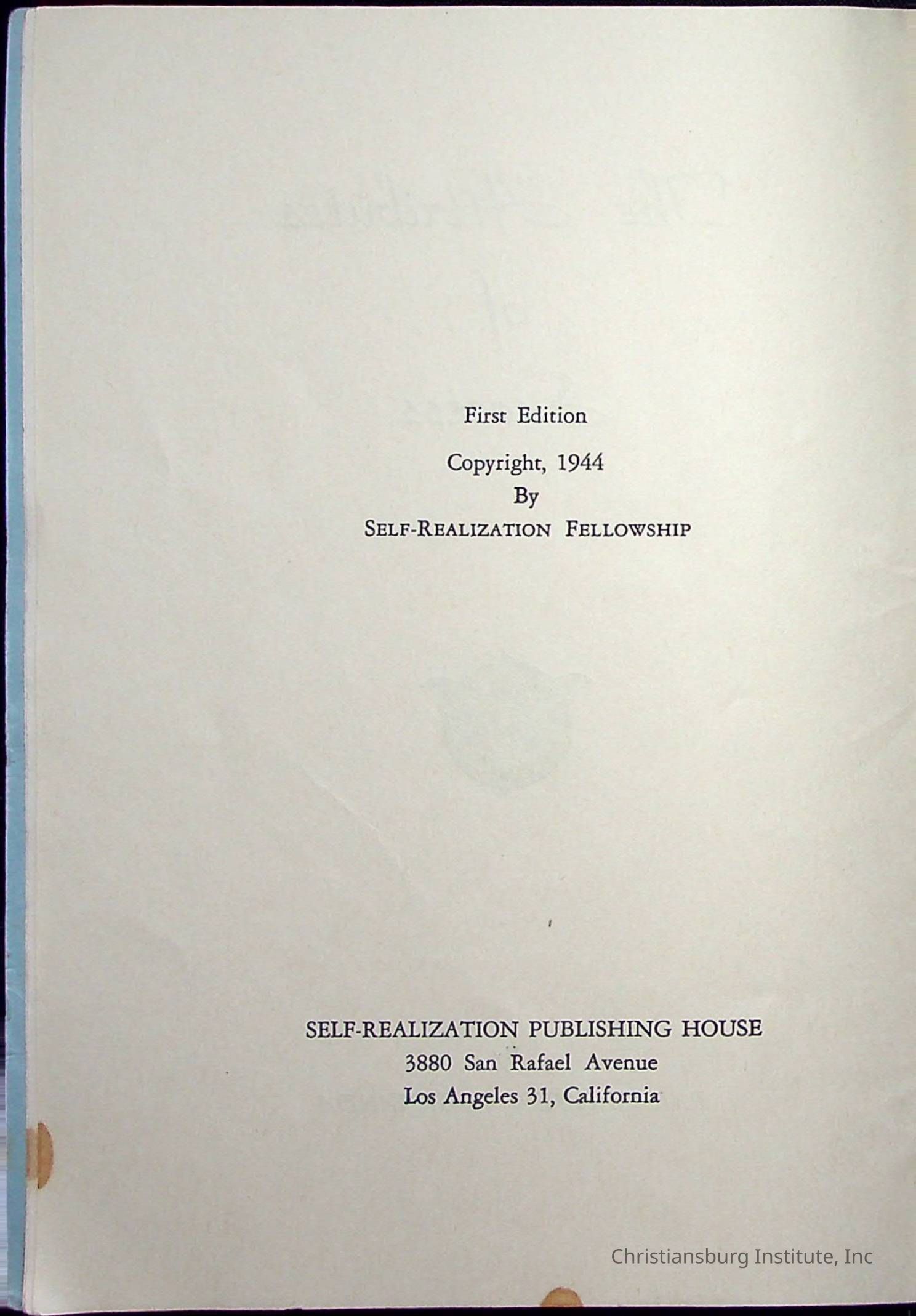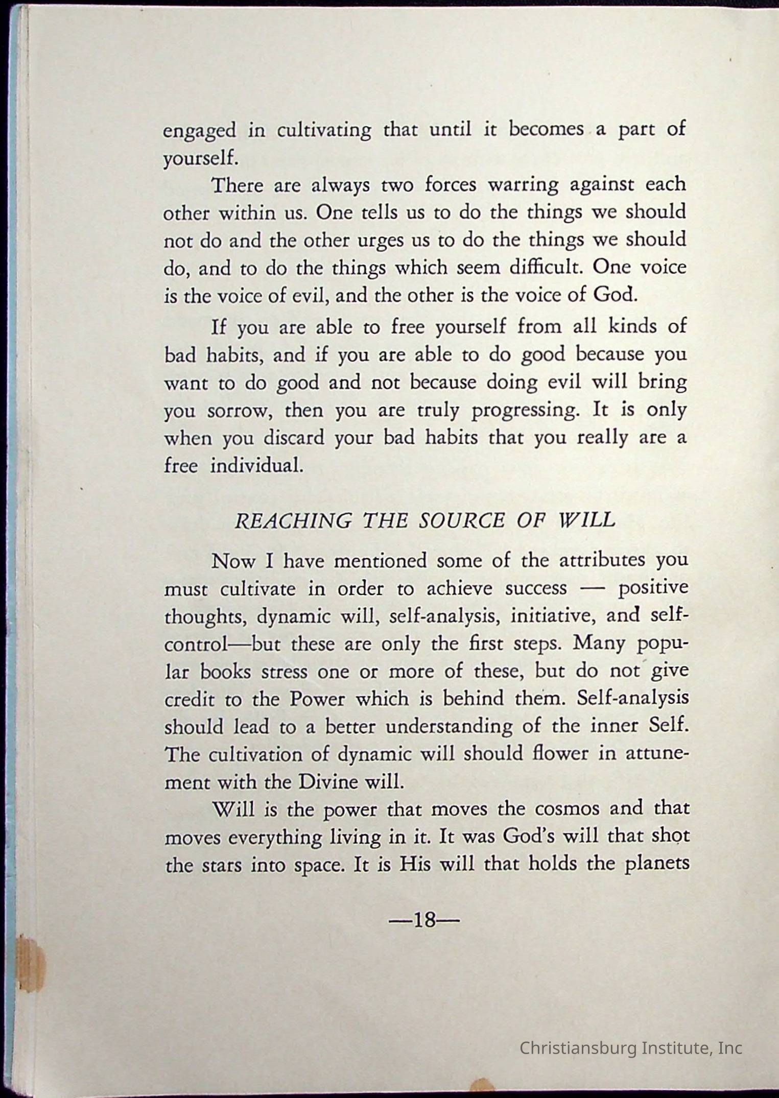 "The Attributes of Success" written by Paramhansa Yogananda published by the Self-Realization Publishing House in 1944. This book was owned by Christiansburg Institute teacher, Viola Charlton.Collection