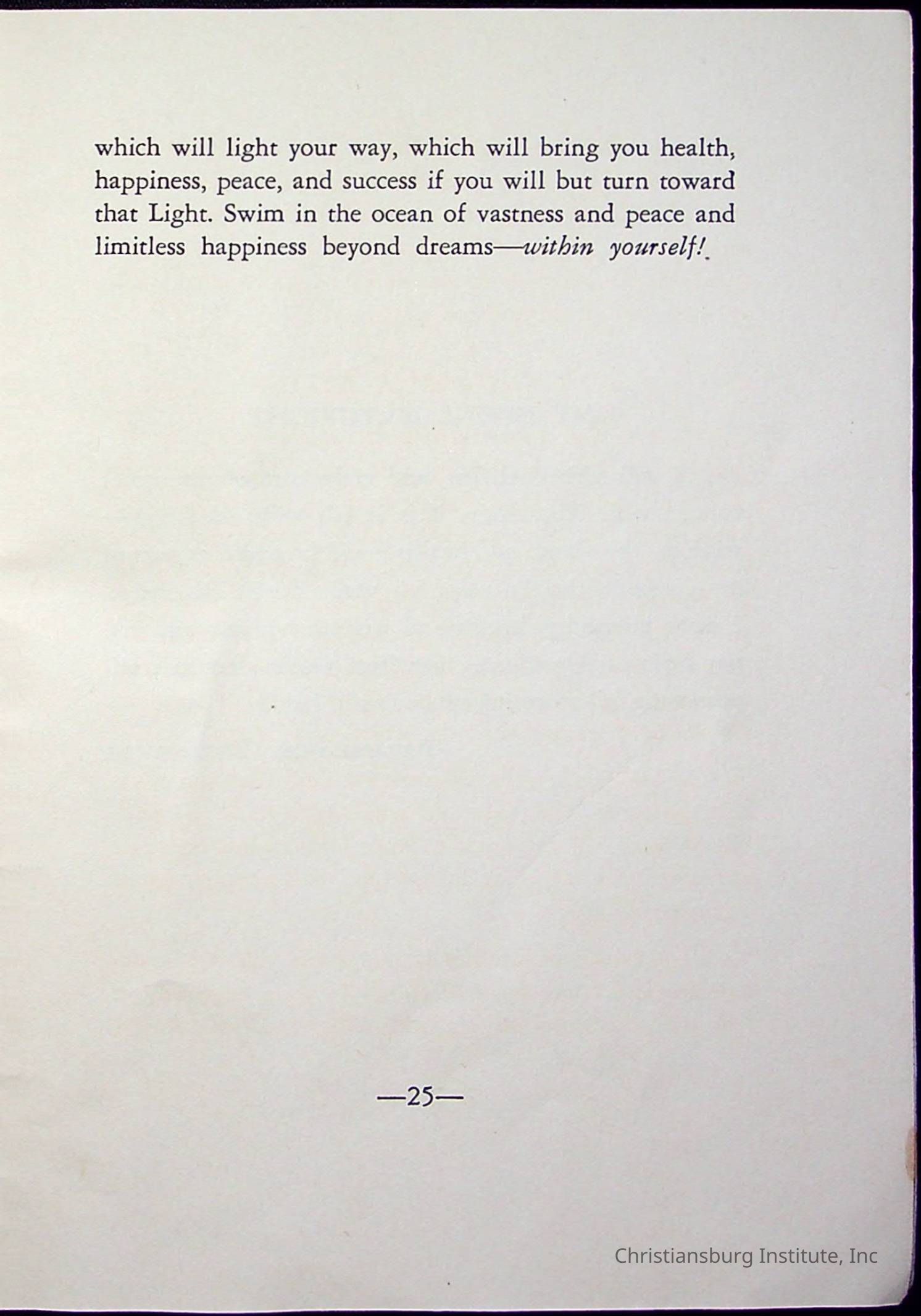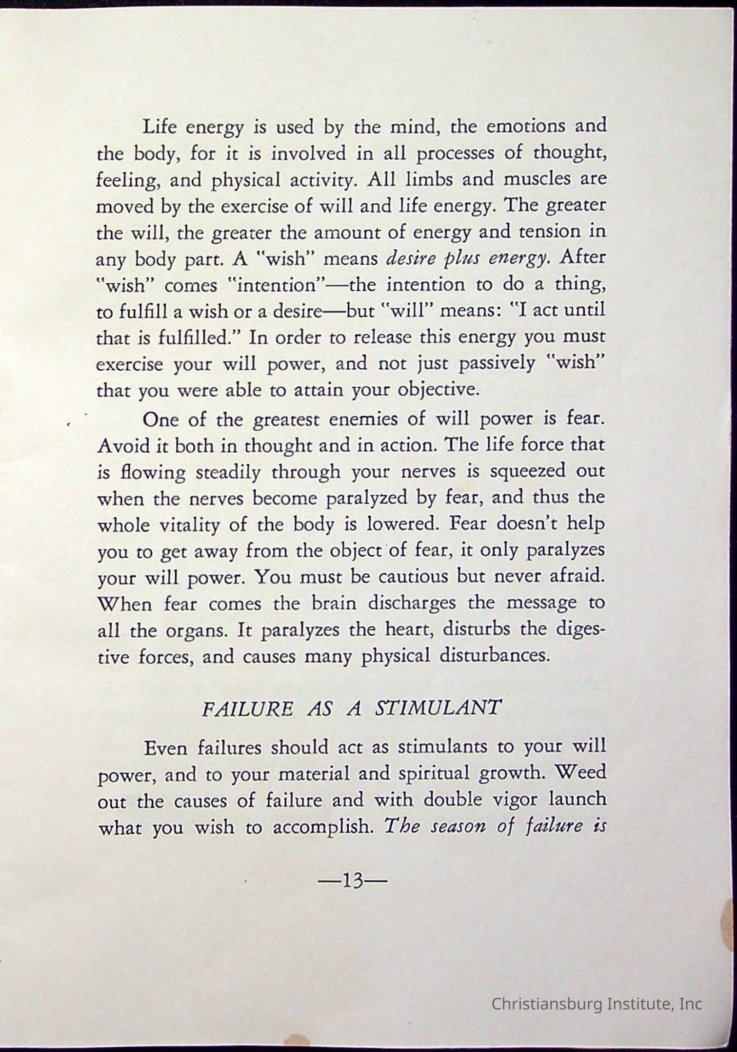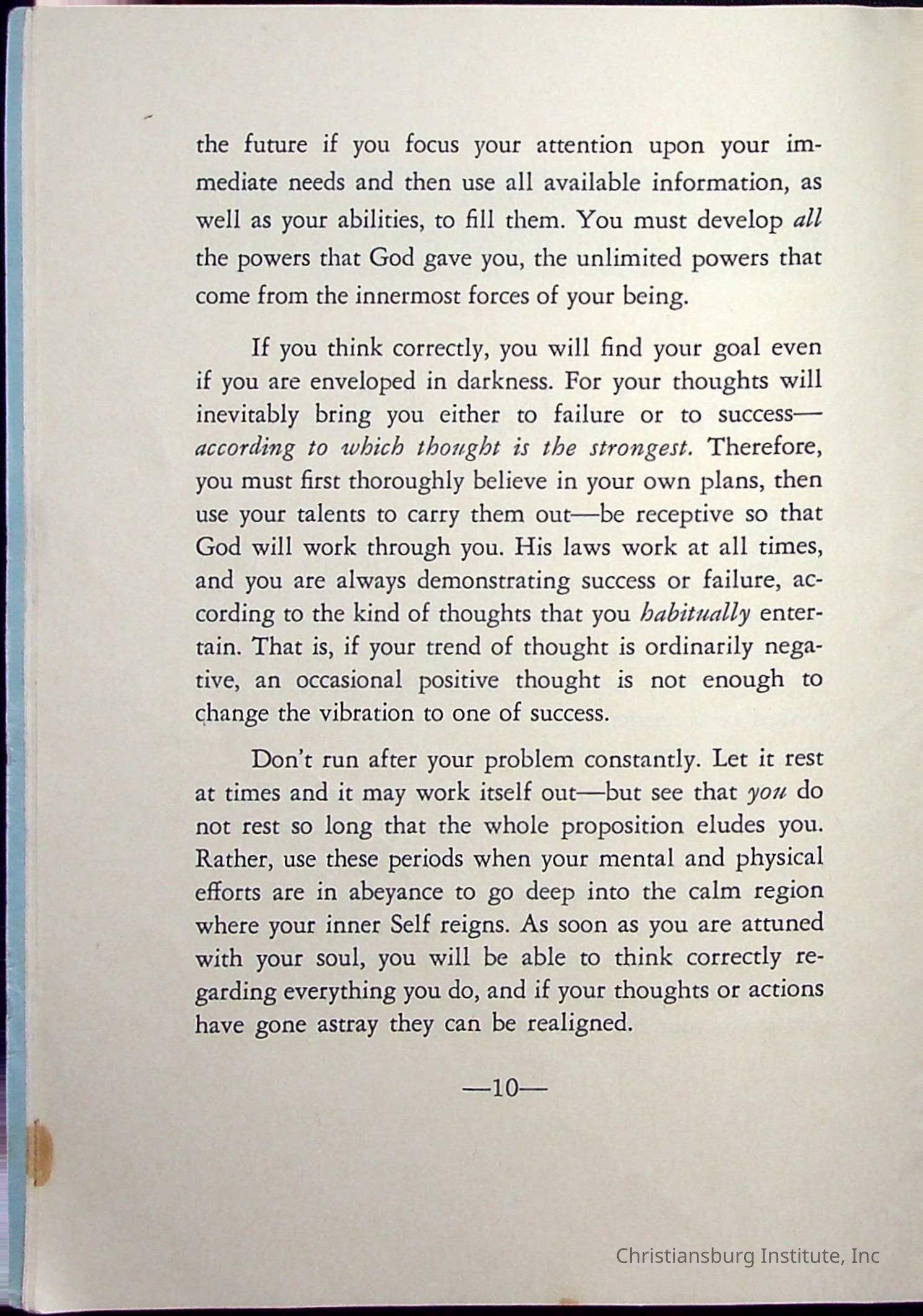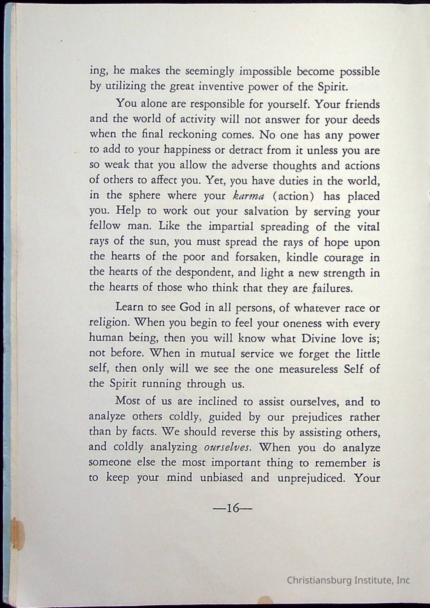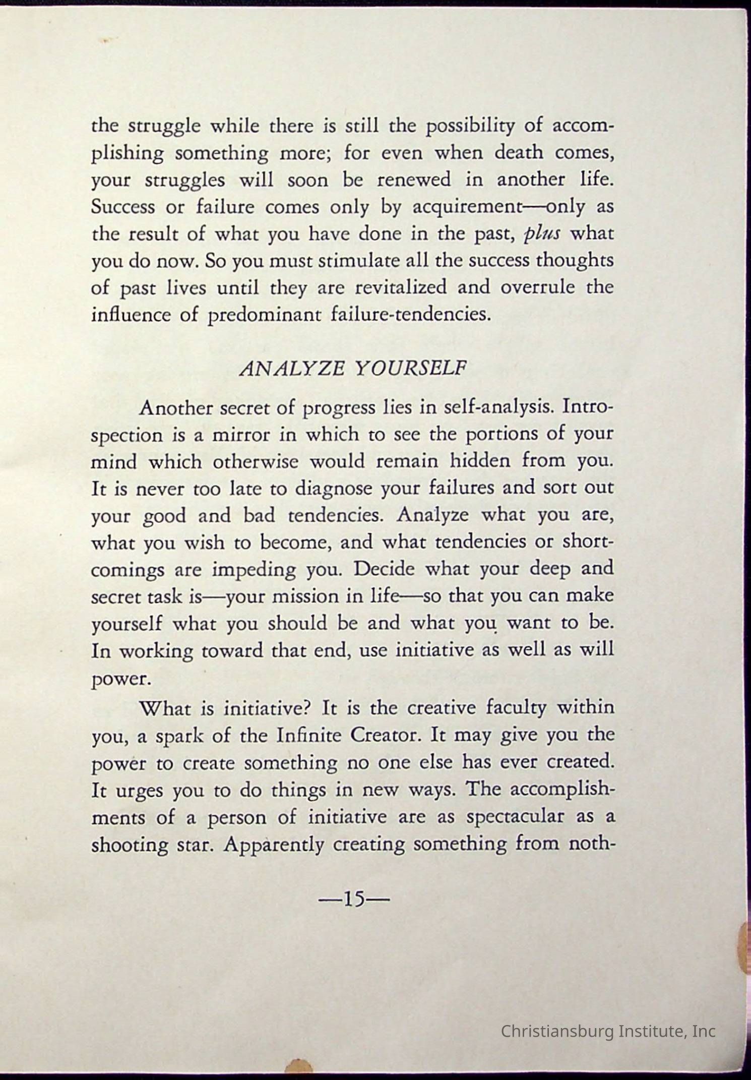 "The Attributes of Success" written by Paramhansa Yogananda published by the Self-Realization Publishing House in 1944. This book was owned by Christiansburg Institute teacher, Viola Charlton.Collection