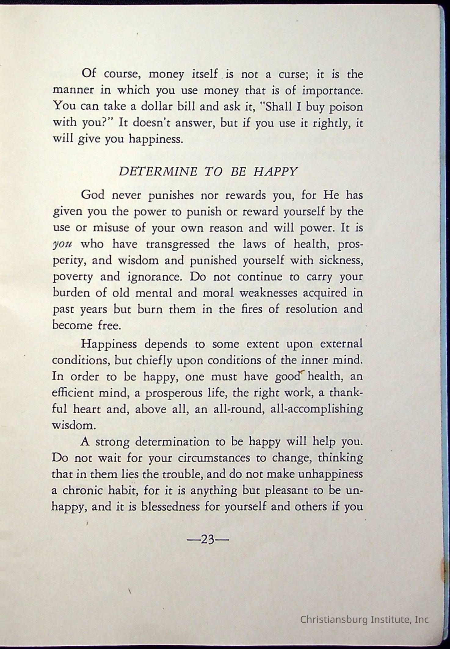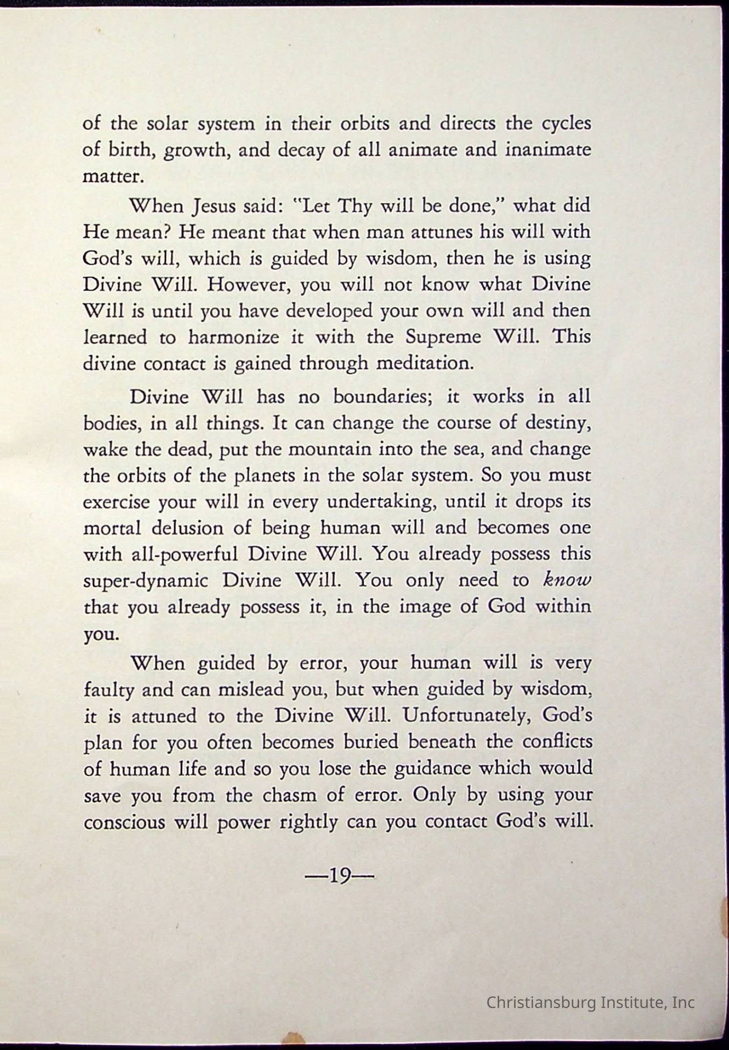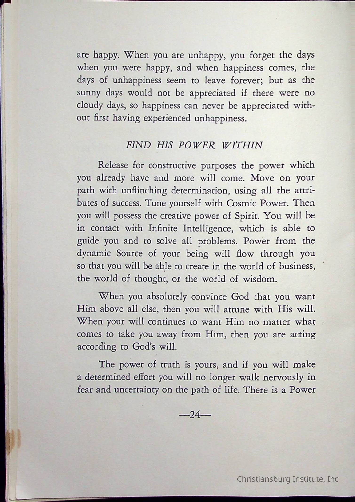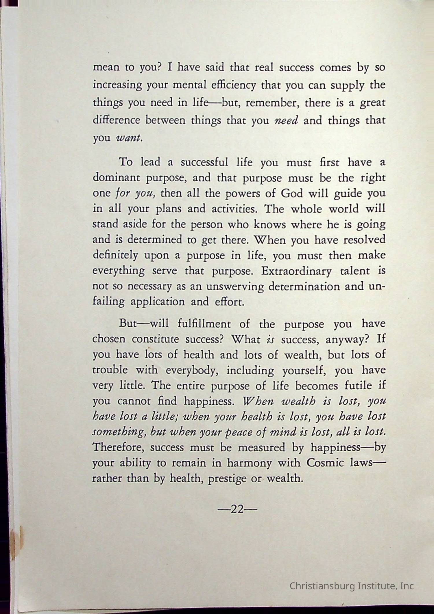"The Attributes of Success" written by Paramhansa Yogananda published by the Self-Realization Publishing House in 1944. This book was owned by Christiansburg Institute teacher, Viola Charlton.Collection