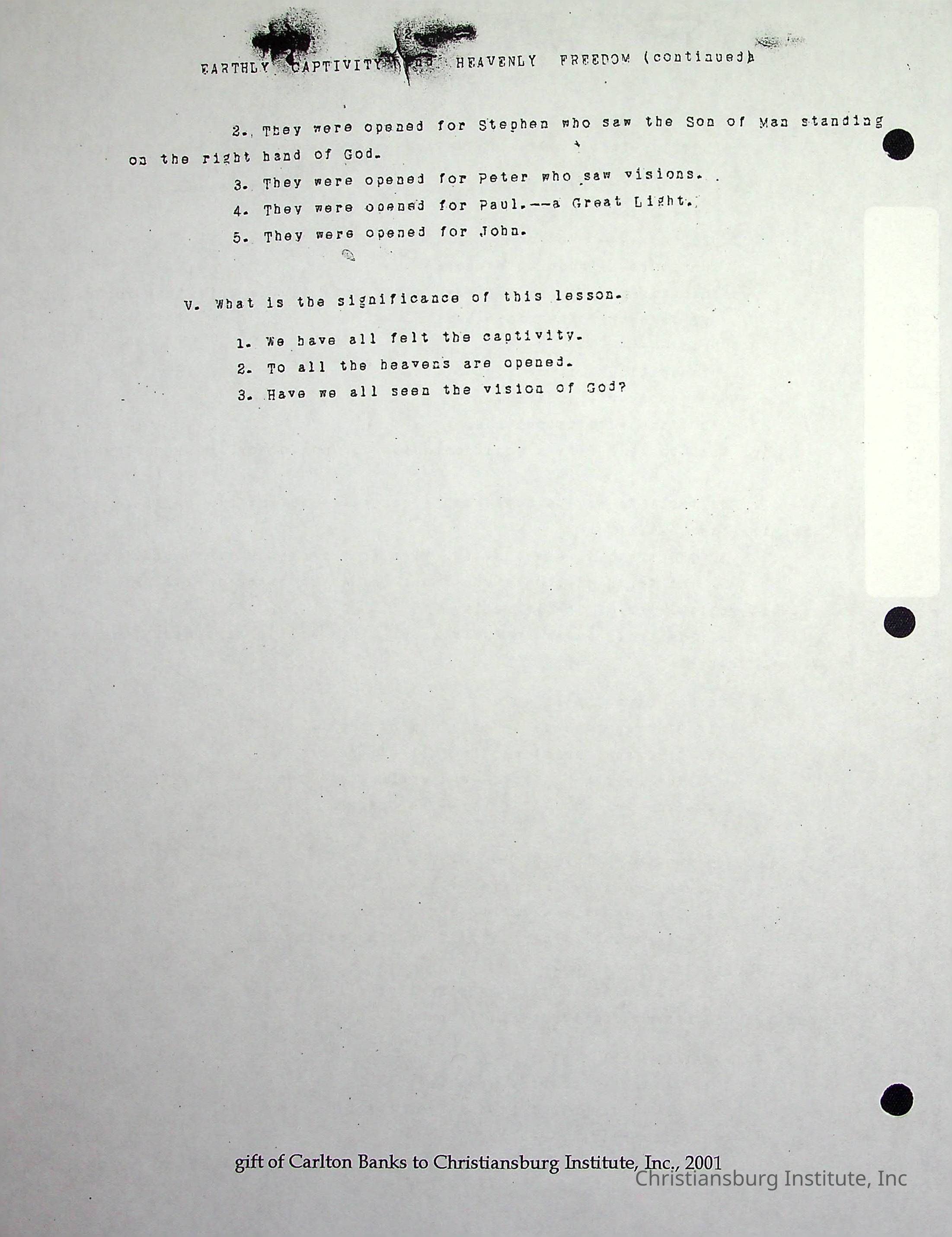 Copyright has been assigned to Christiansburg Institute Museum & Archives by Carlton Banks. For permission to publish materials created by the donor, contact CIMA@christiansburginstitute.com. Materials not created by John F. Banks may still be under copyright.
