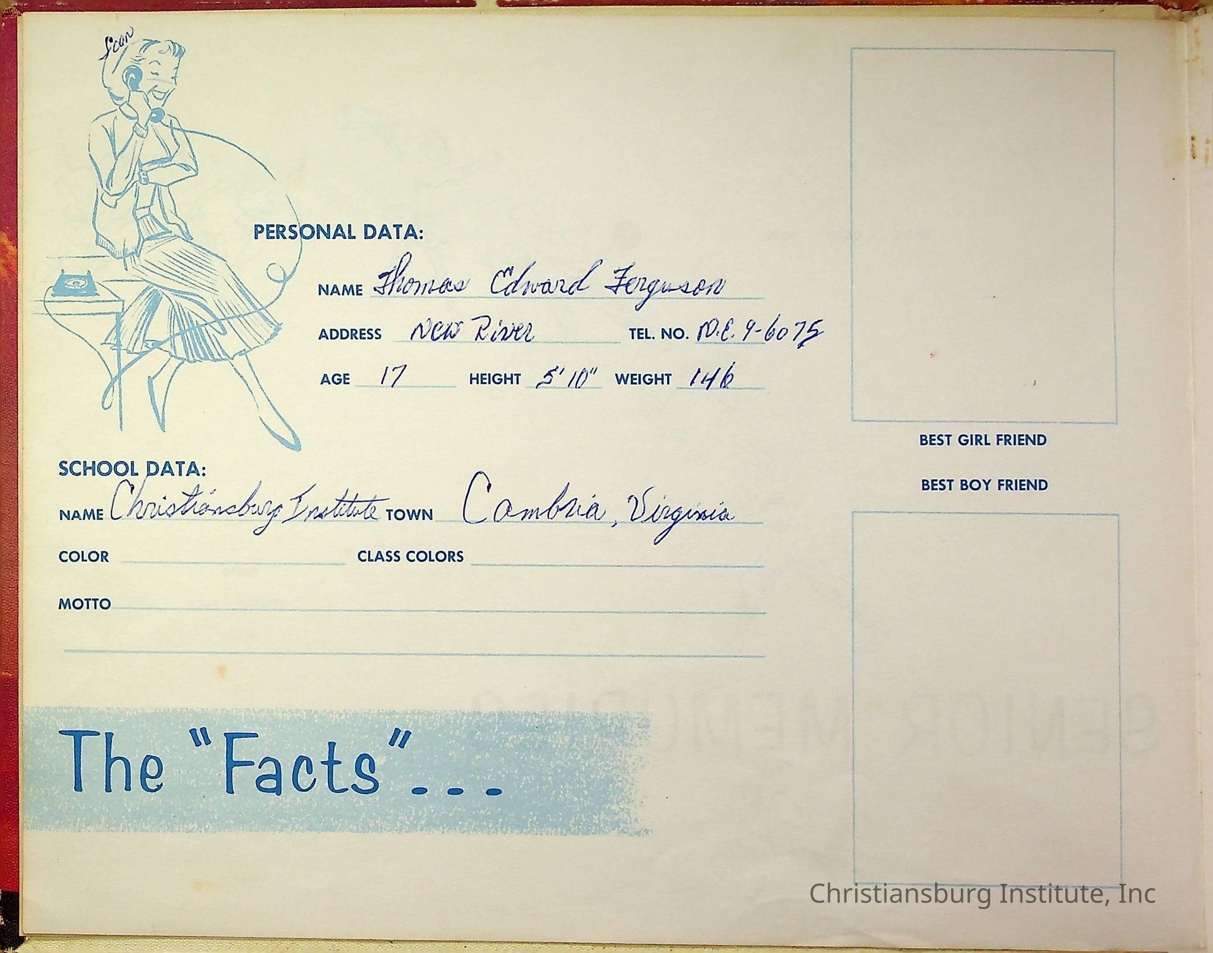 A senior memories booklet that was filled out by Thomas Edward Ferguson, a graduate of Christiansburg Institute in the year 1964.Collection