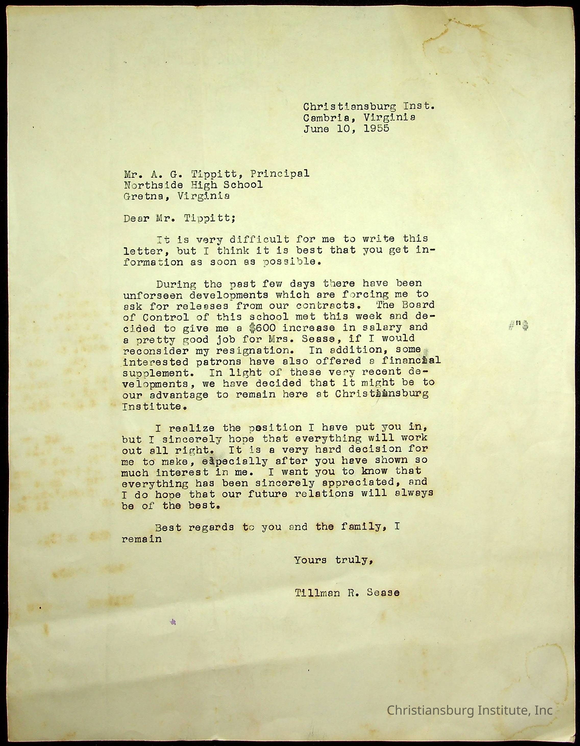 A letter from the athletic director of Christiansburg Industrial Institute, Tillman R. Sease to the principal of Northside High School, A. G. Tippitt dated June, 10th, 1955.Creator