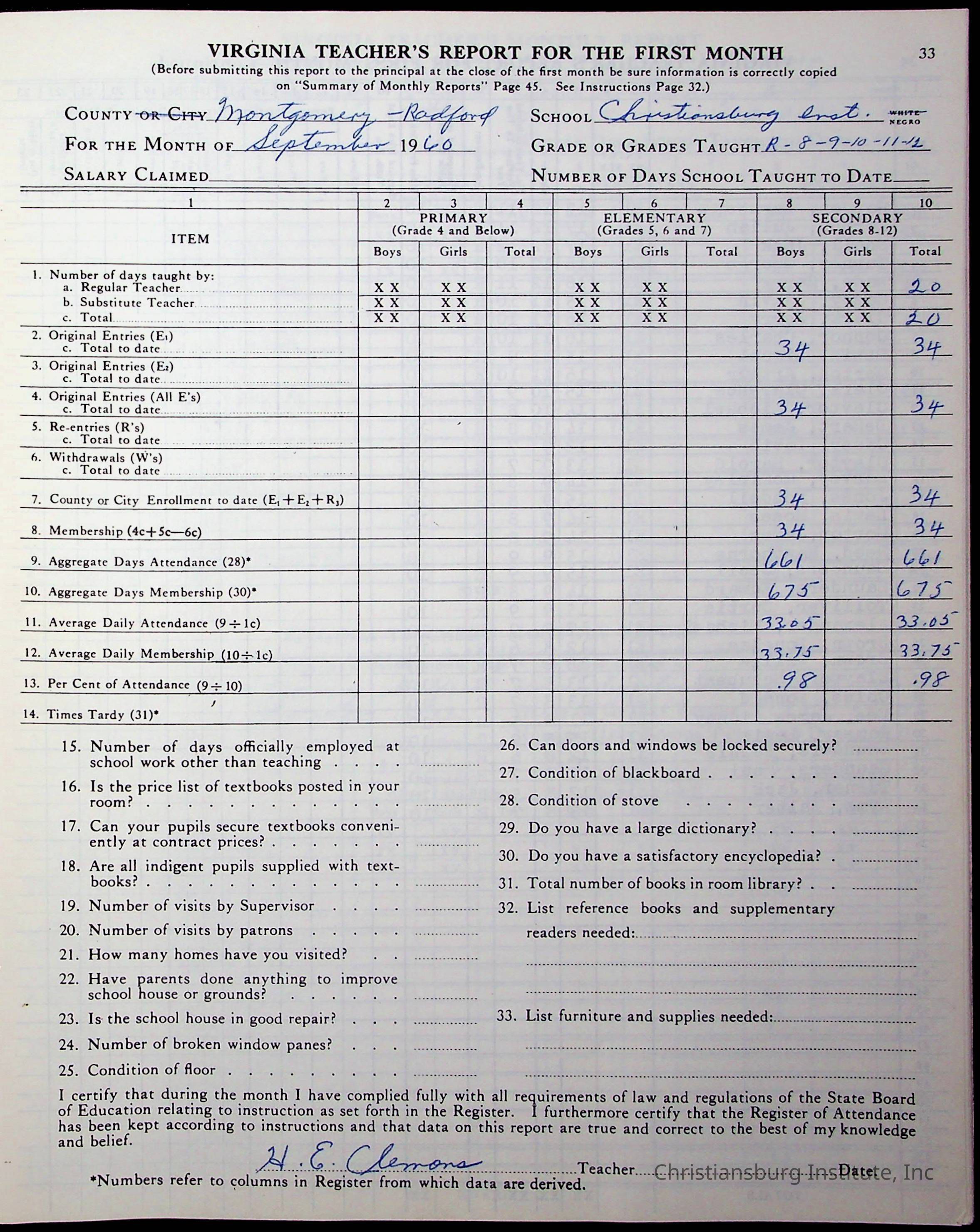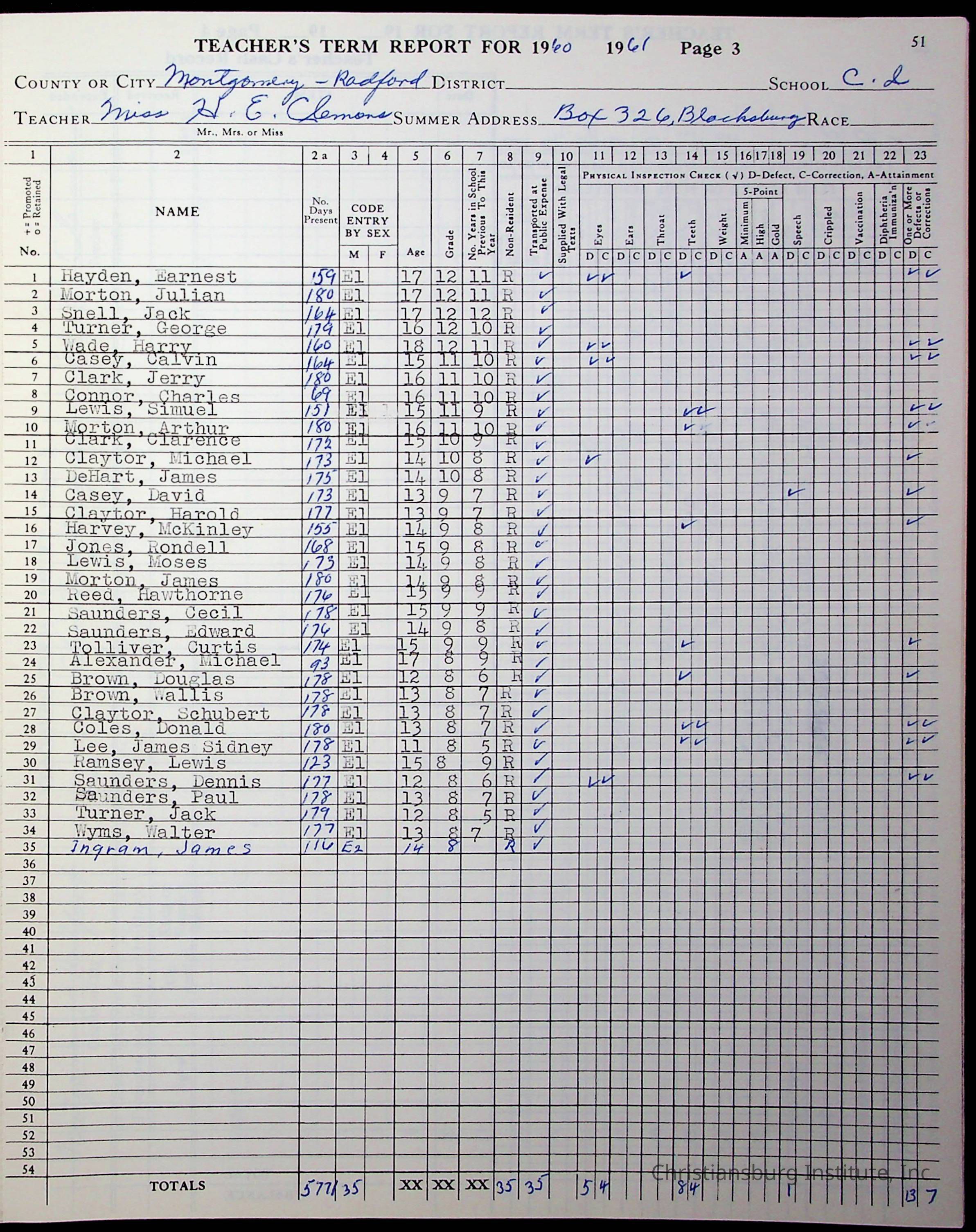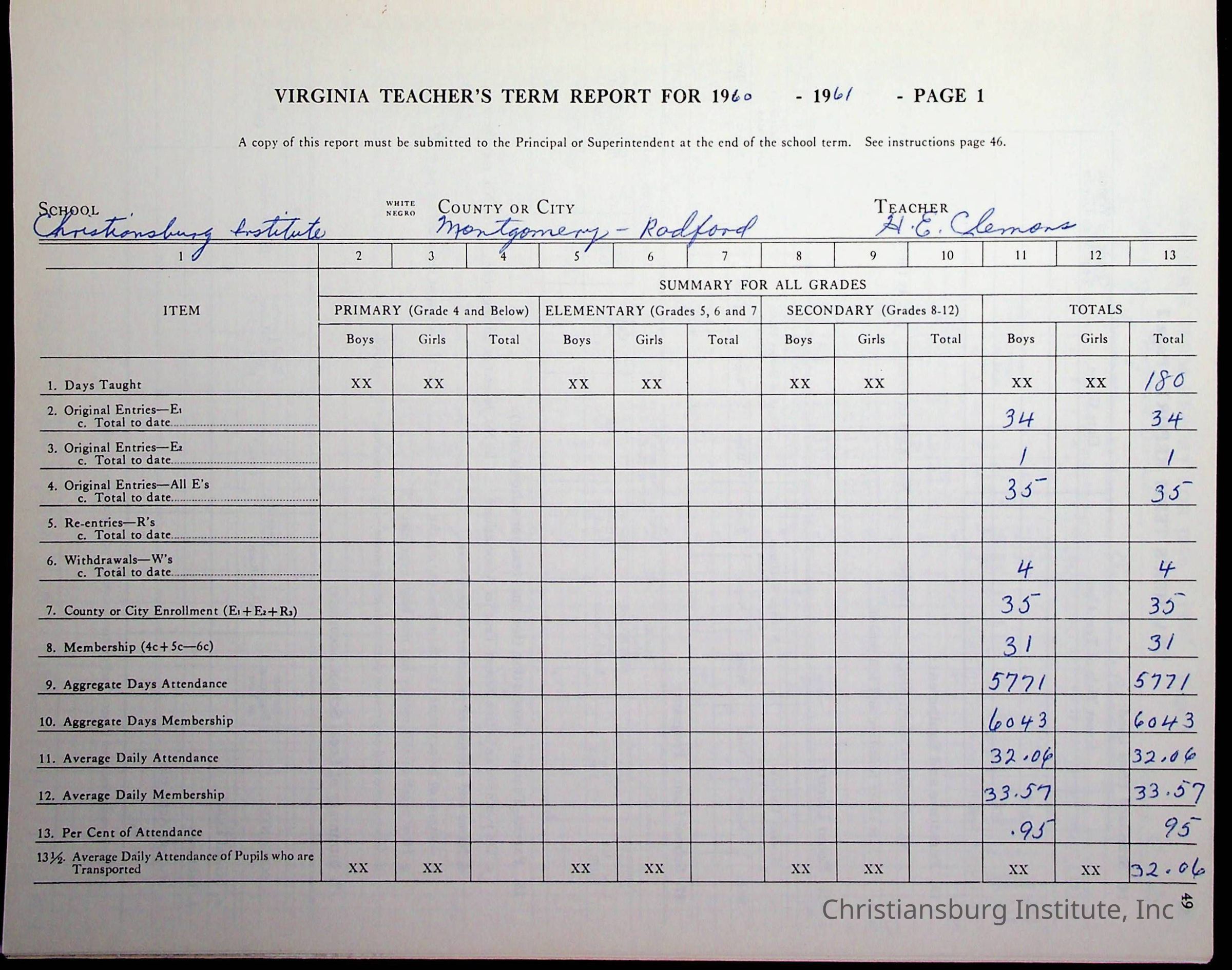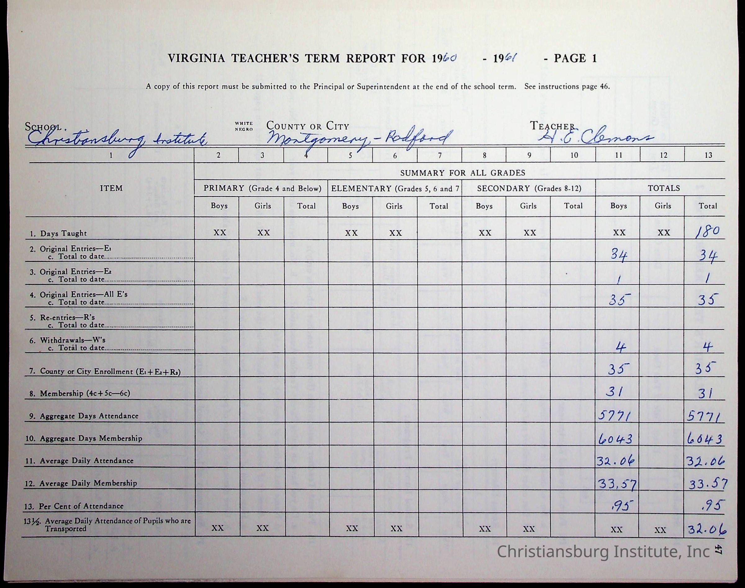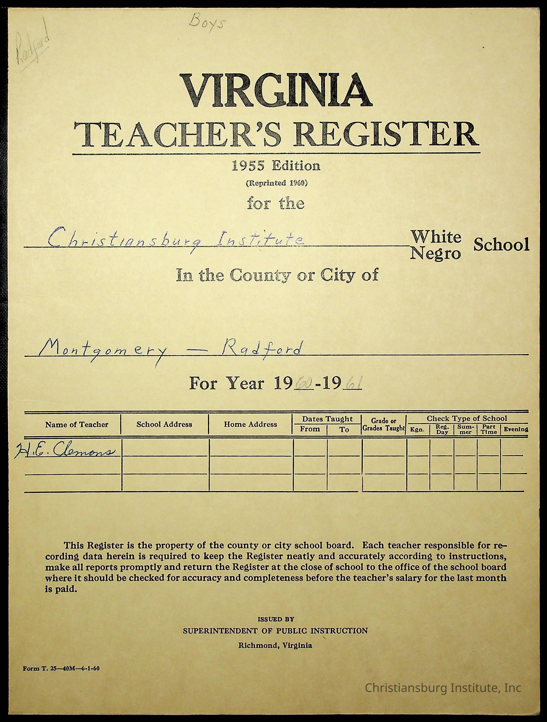 VA Teacher’s Register for H.E. Clemons, 1960-1961 (Radford Boys)Scope and Content