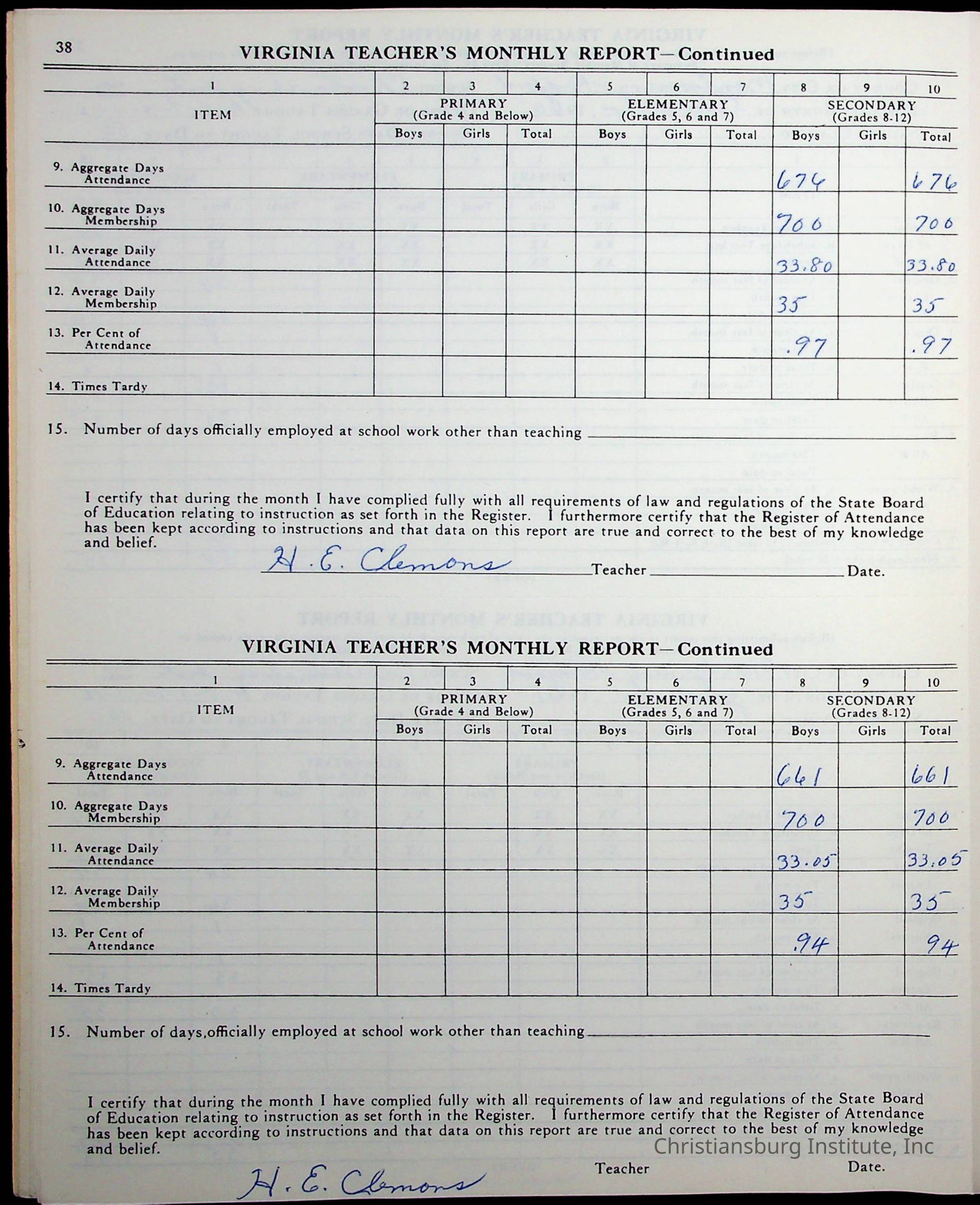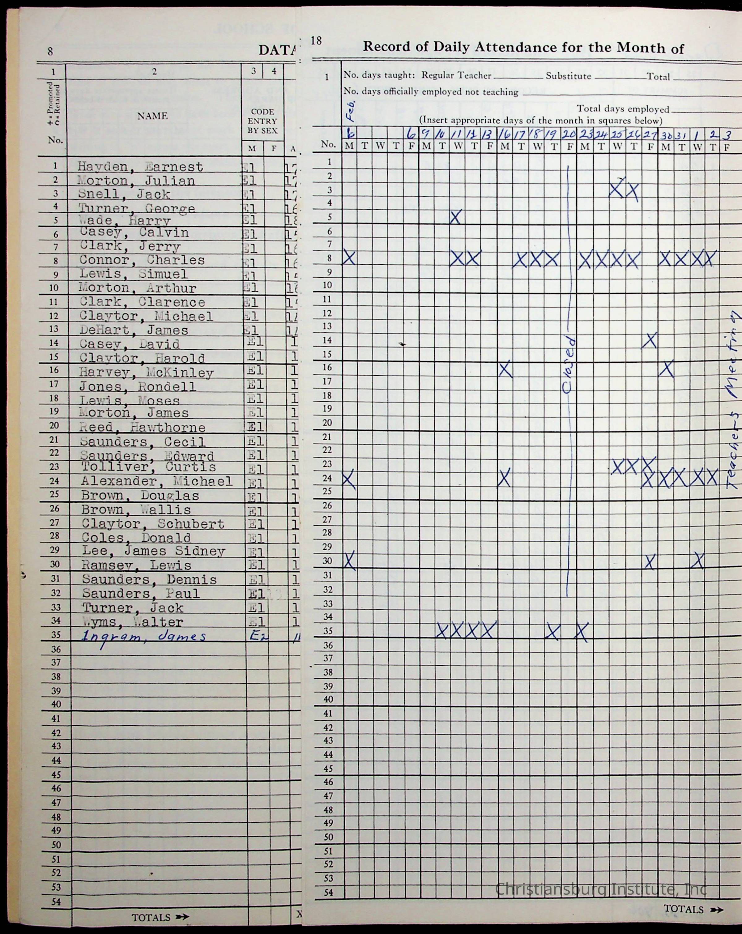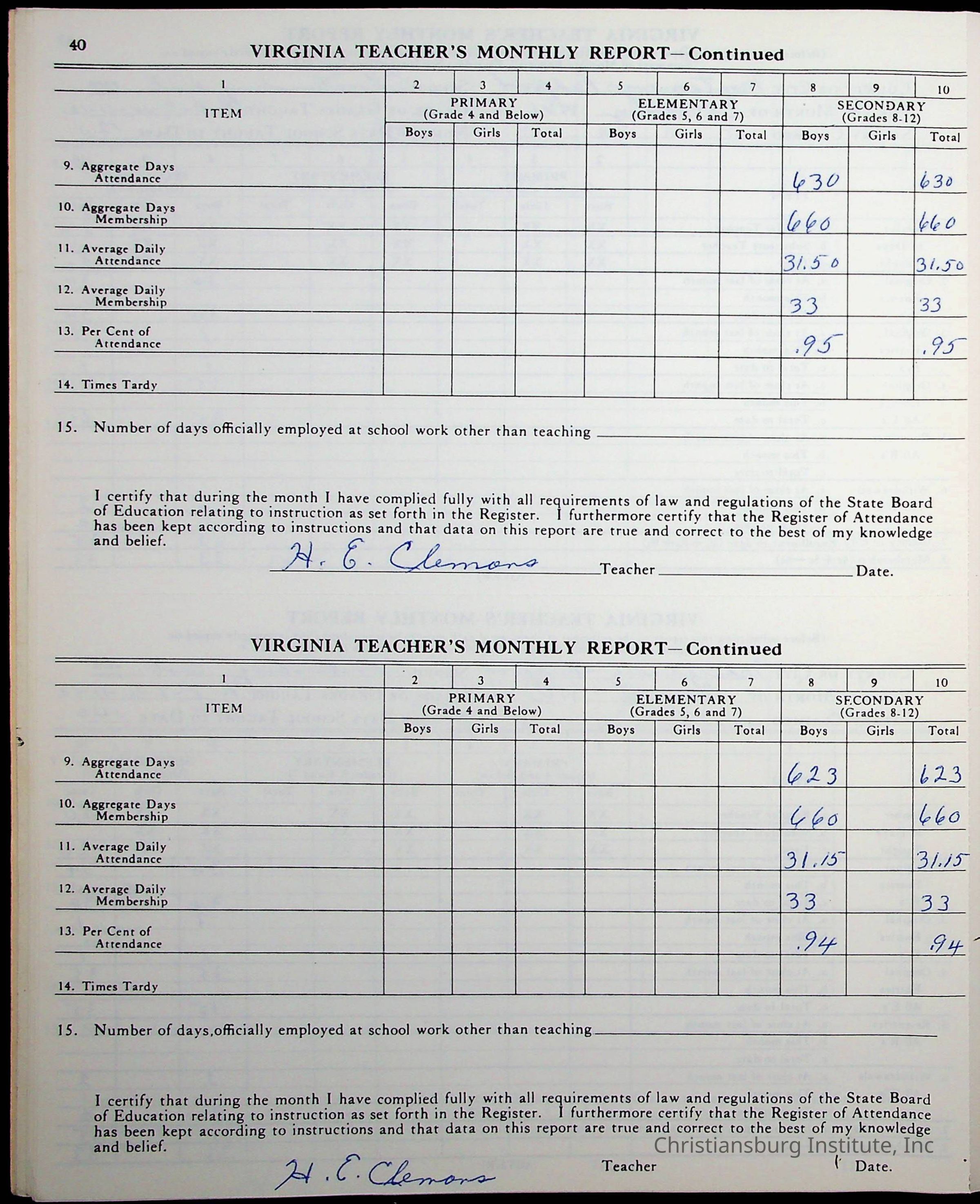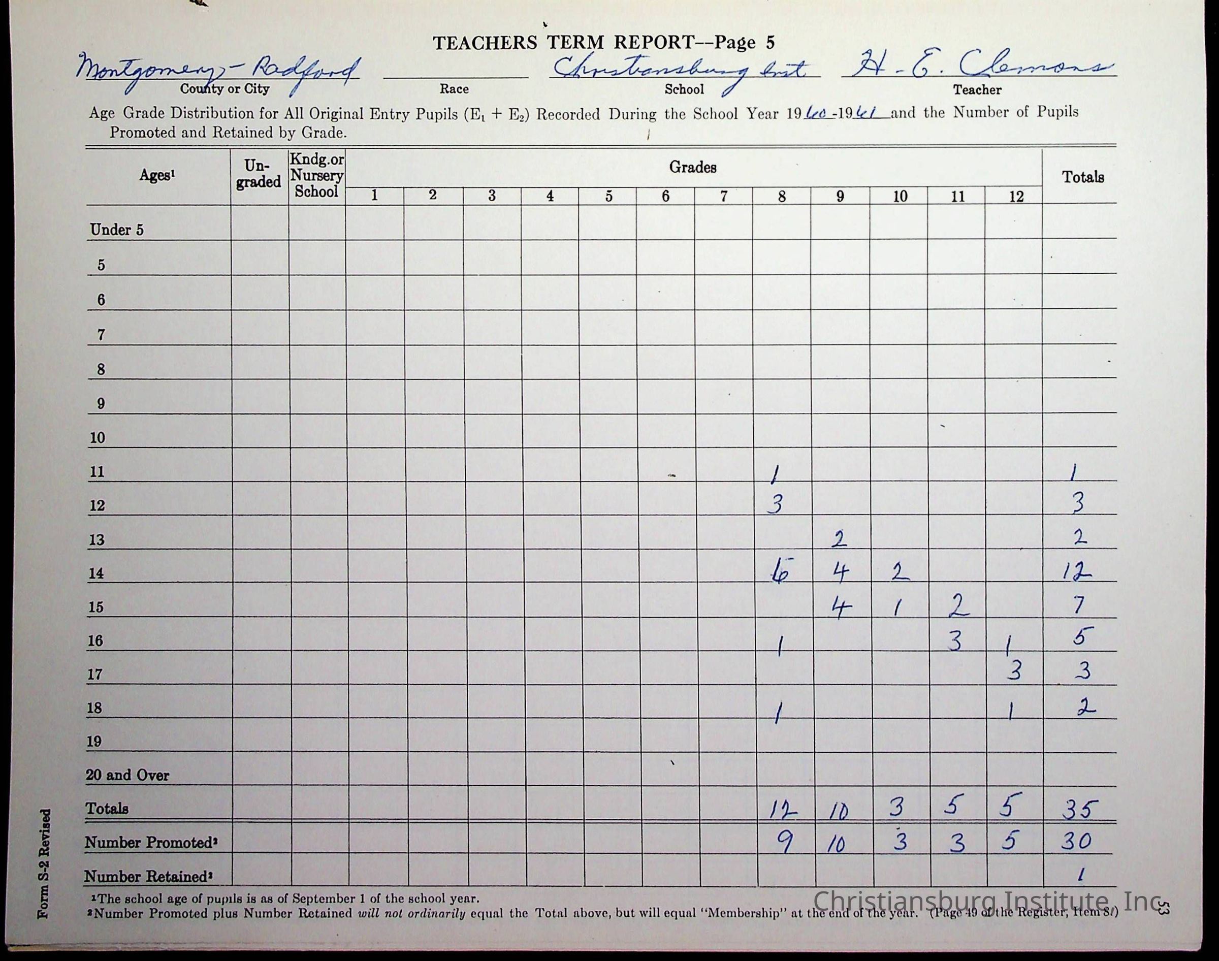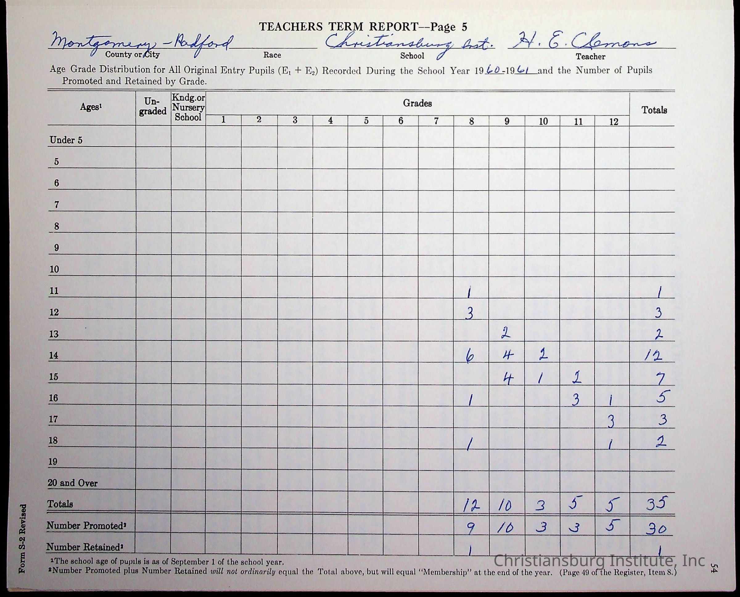 VA Teacher’s Register for H.E. Clemons, 1960-1961 (Radford Boys)Scope and Content