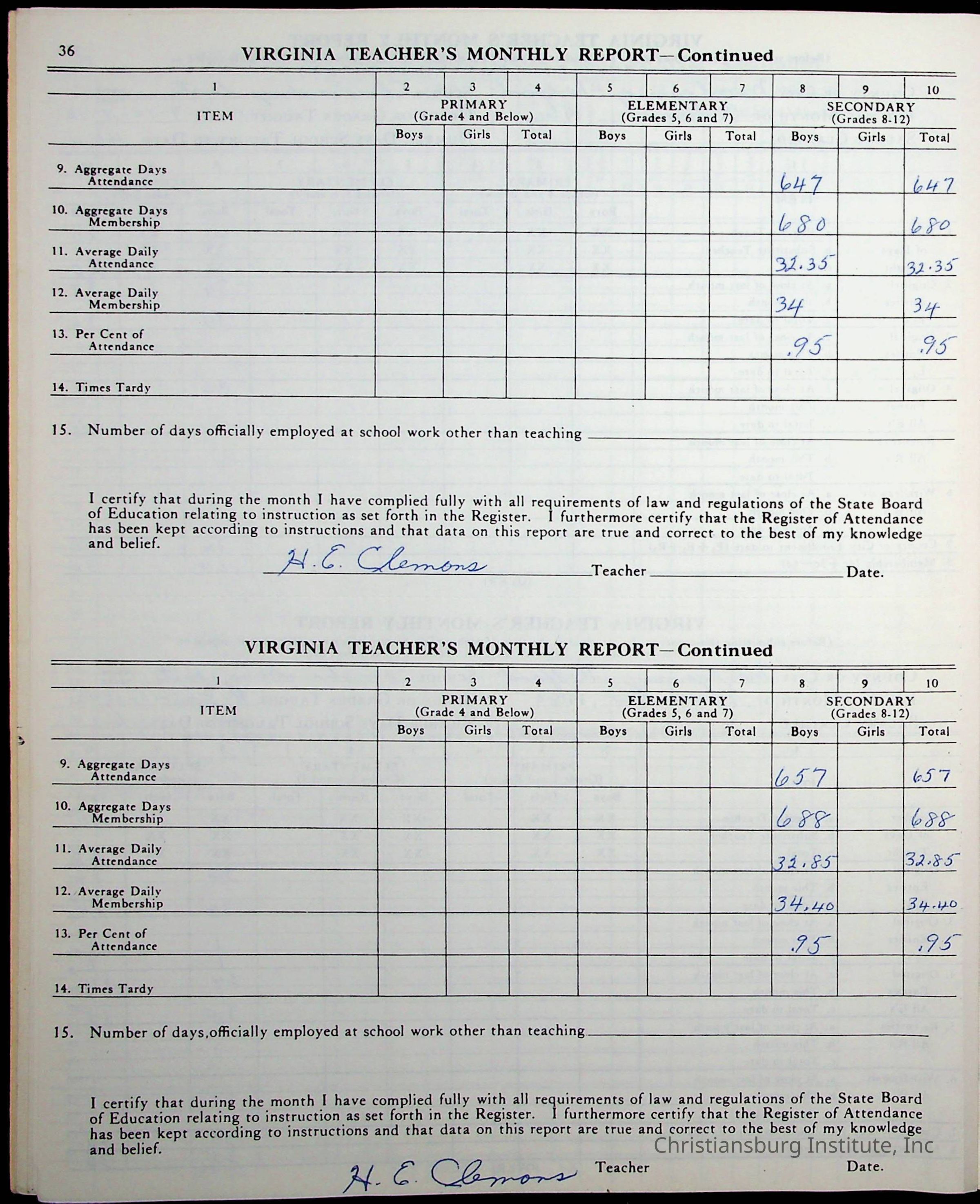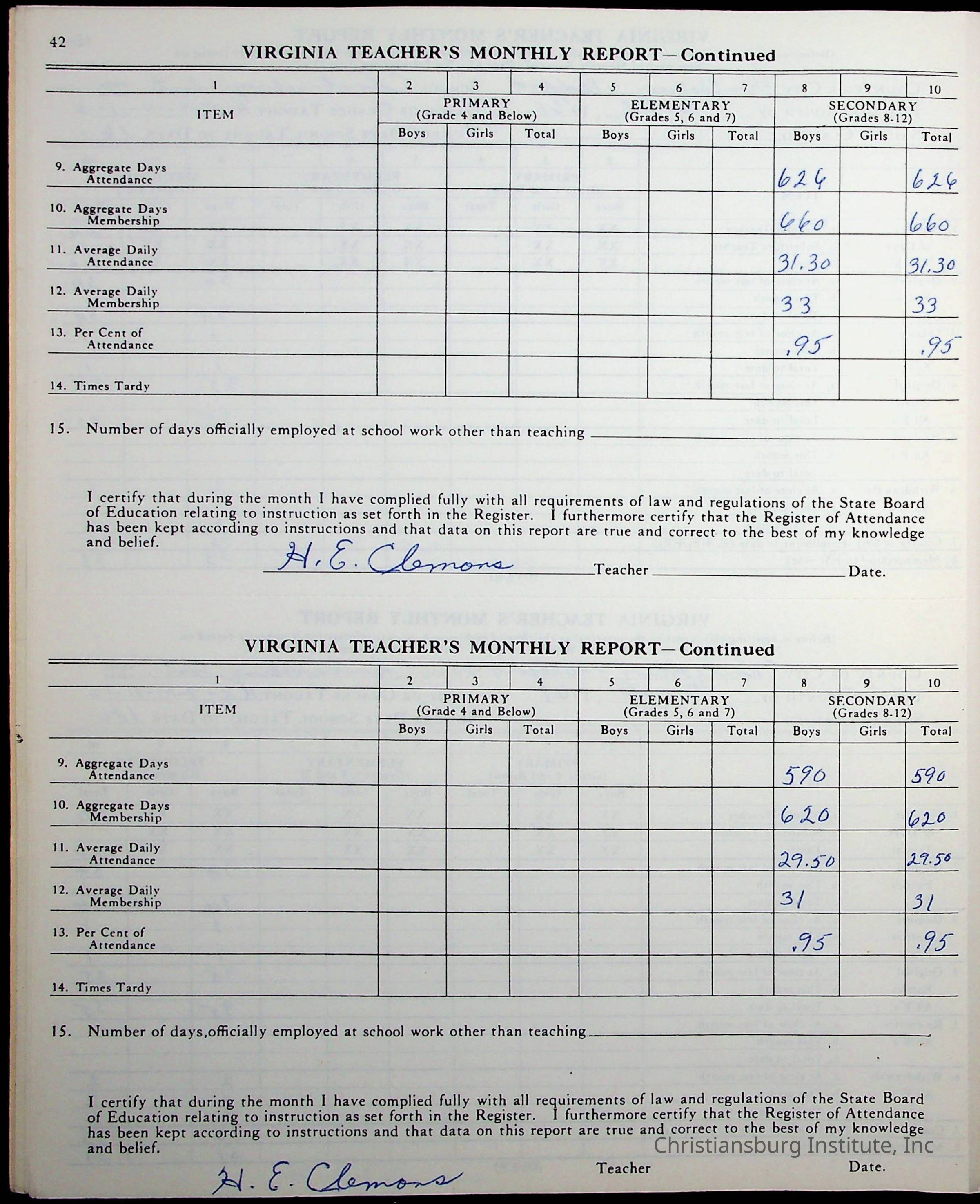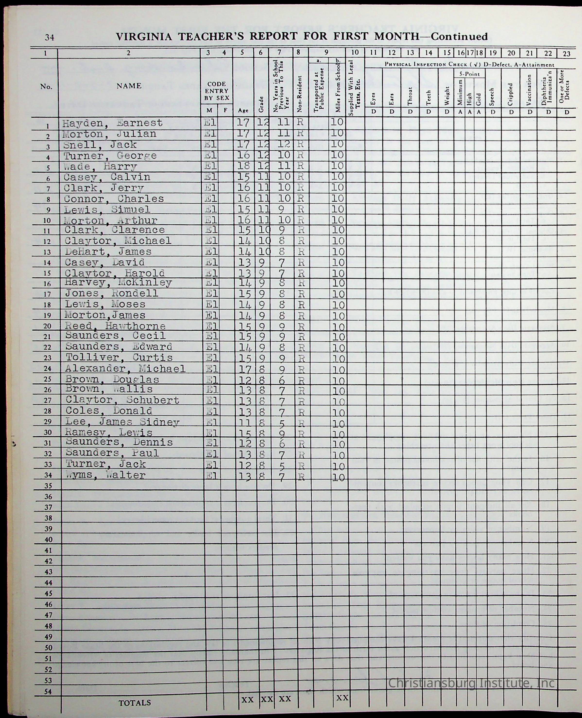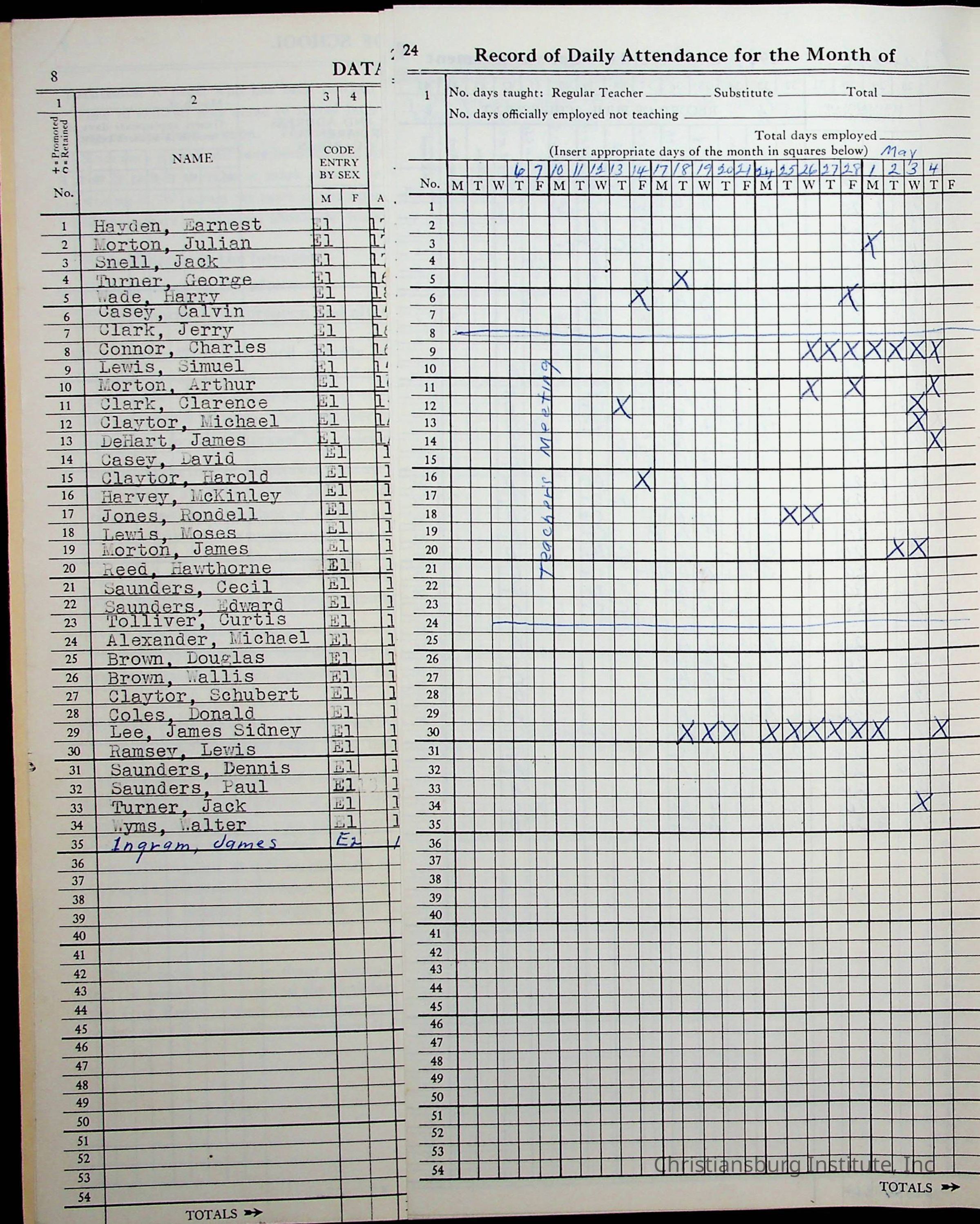 VA Teacher’s Register for H.E. Clemons, 1960-1961 (Radford Boys)Scope and Content