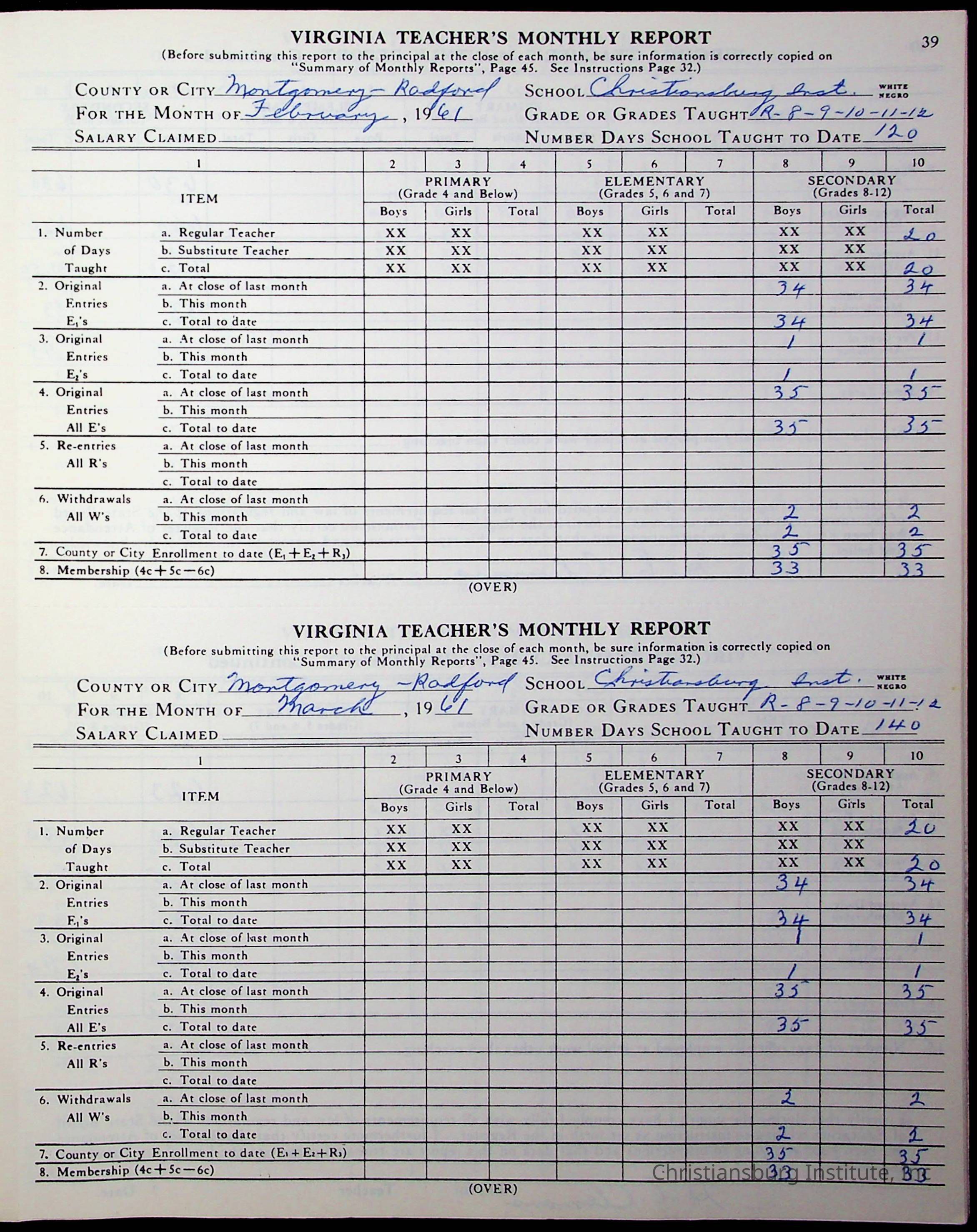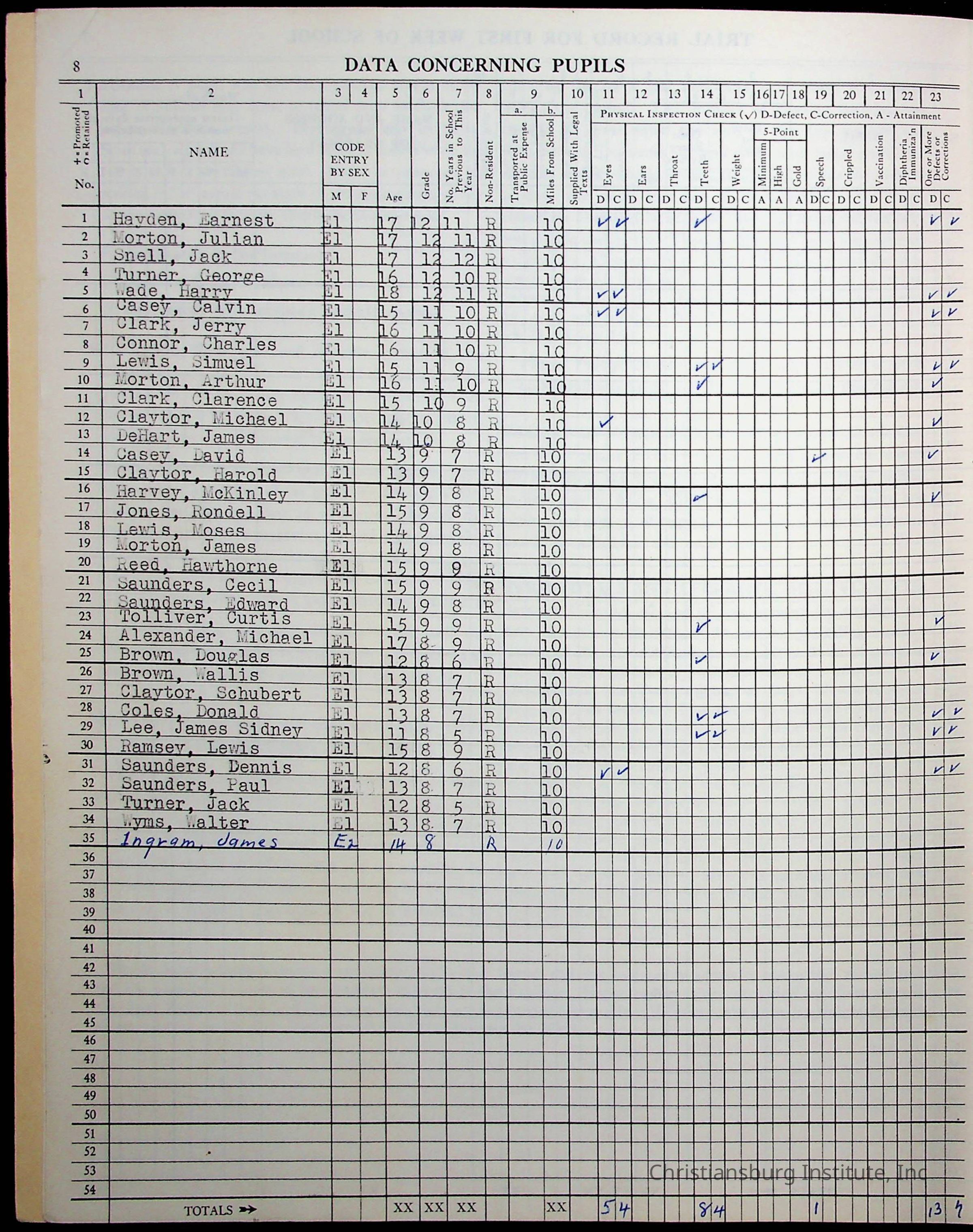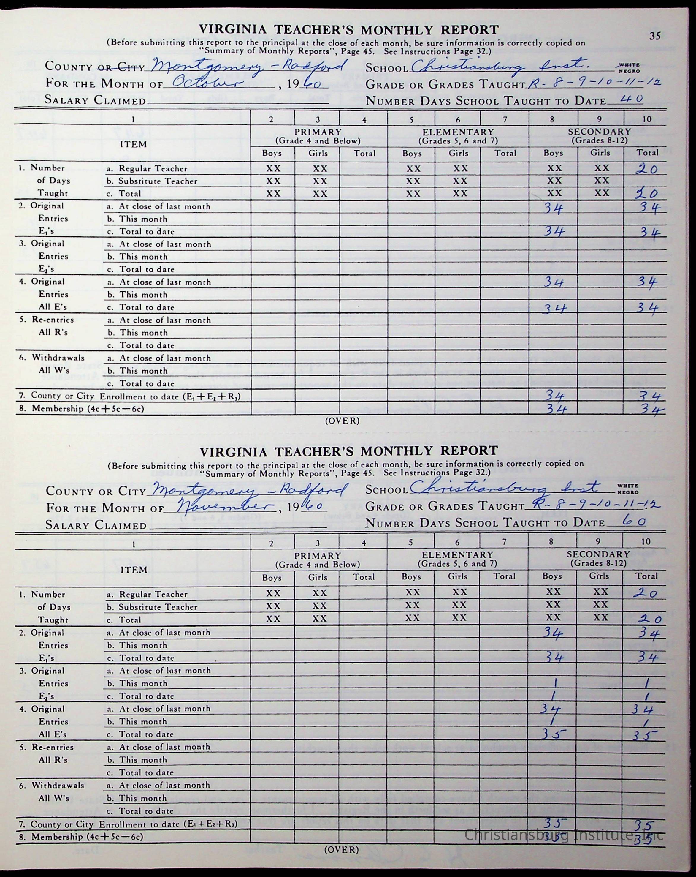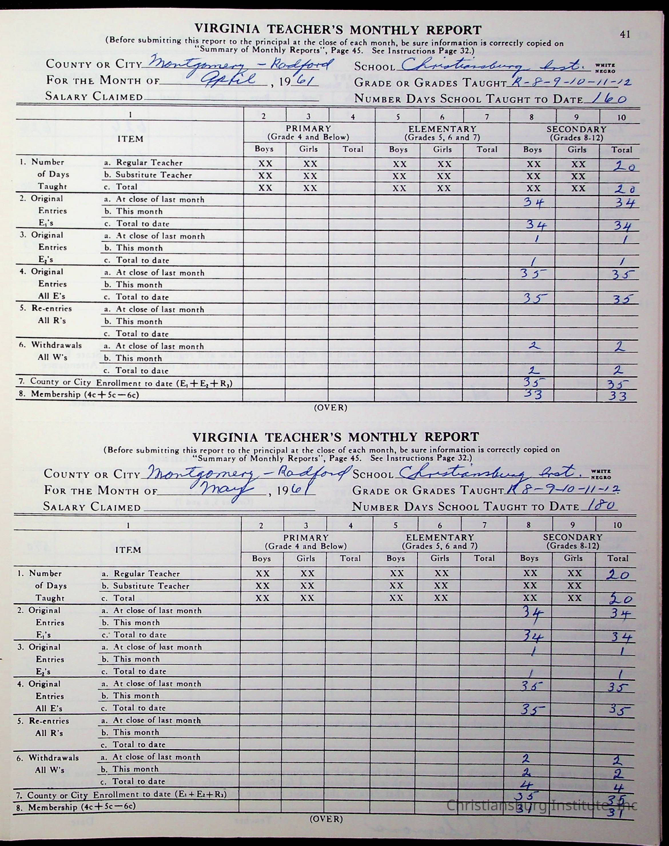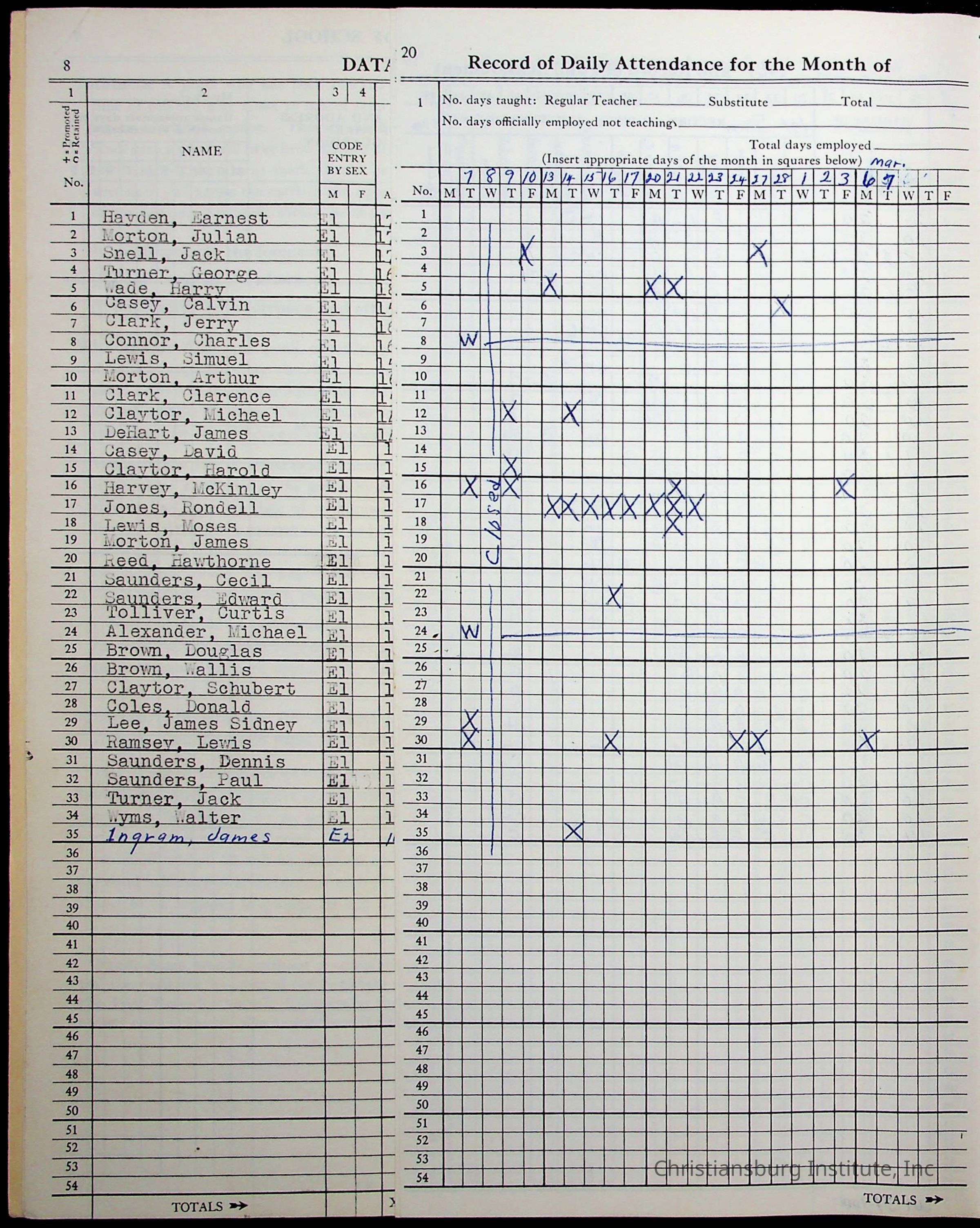 VA Teacher’s Register for H.E. Clemons, 1960-1961 (Radford Boys)Scope and Content