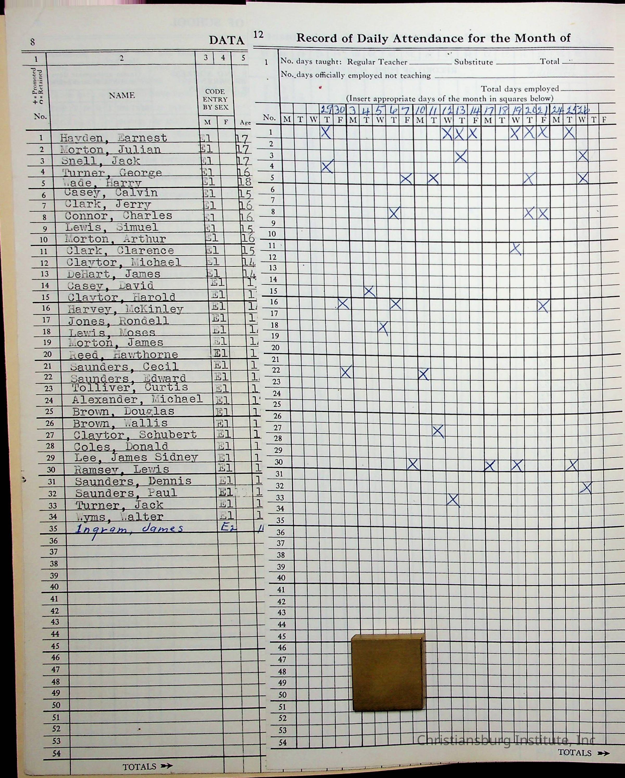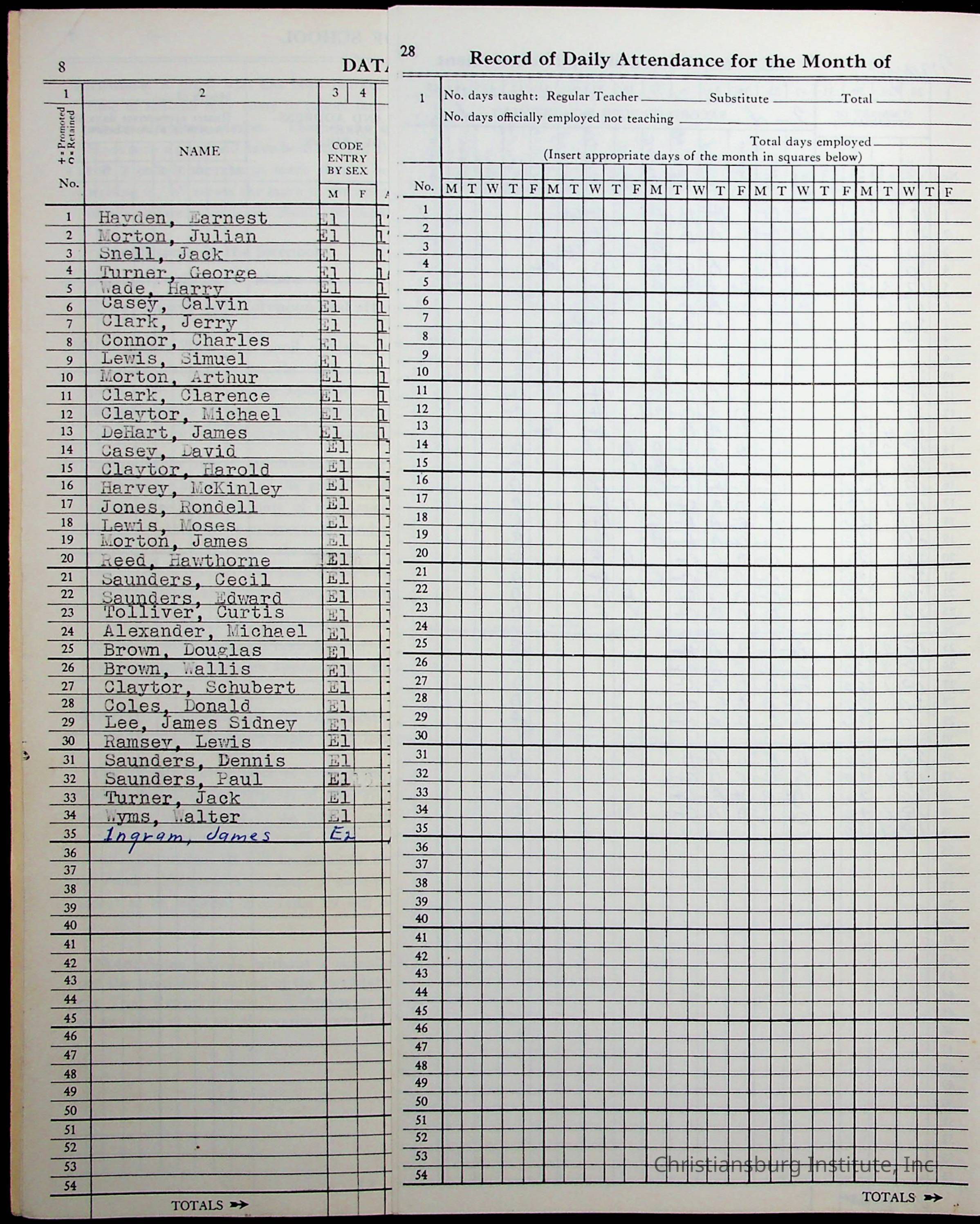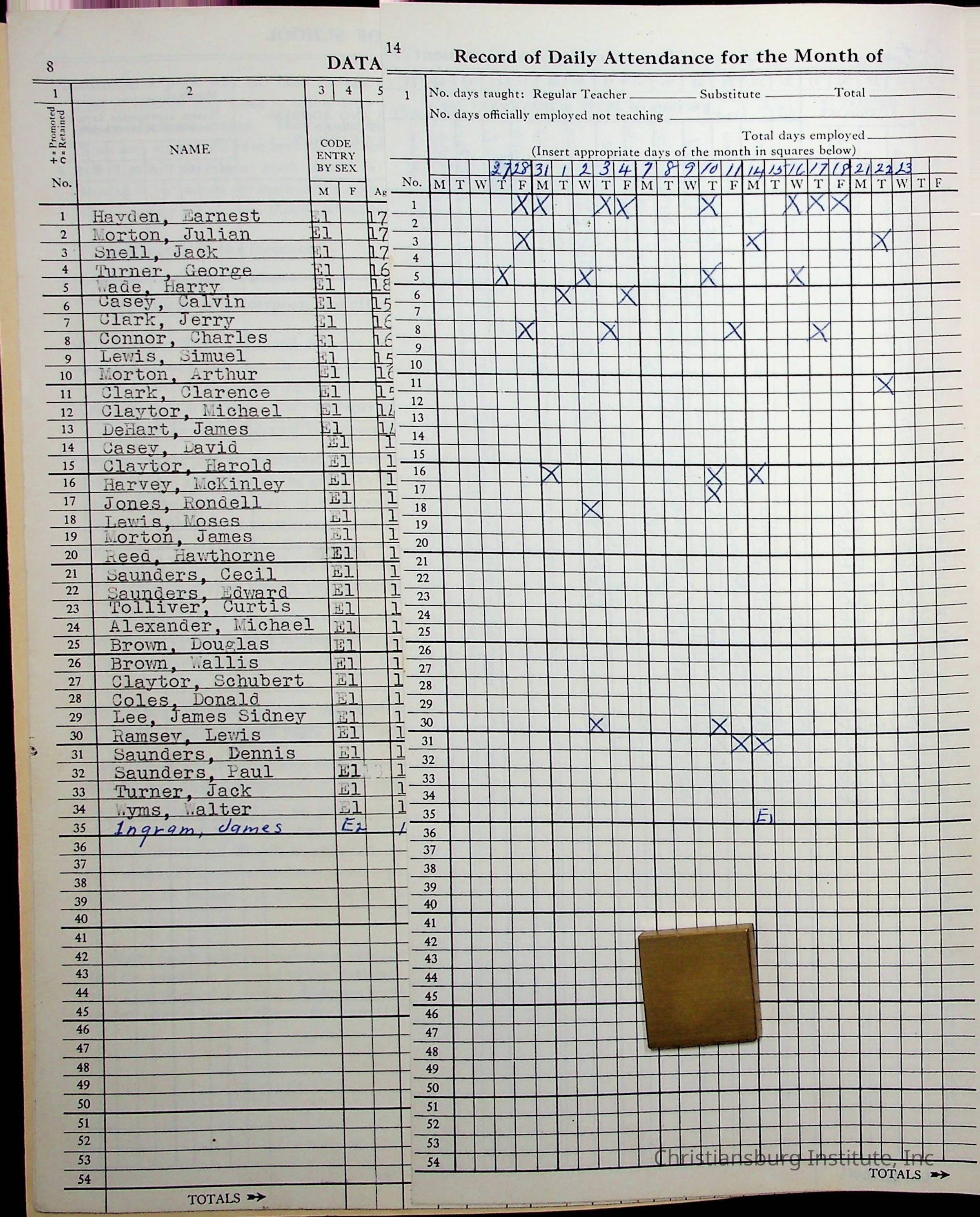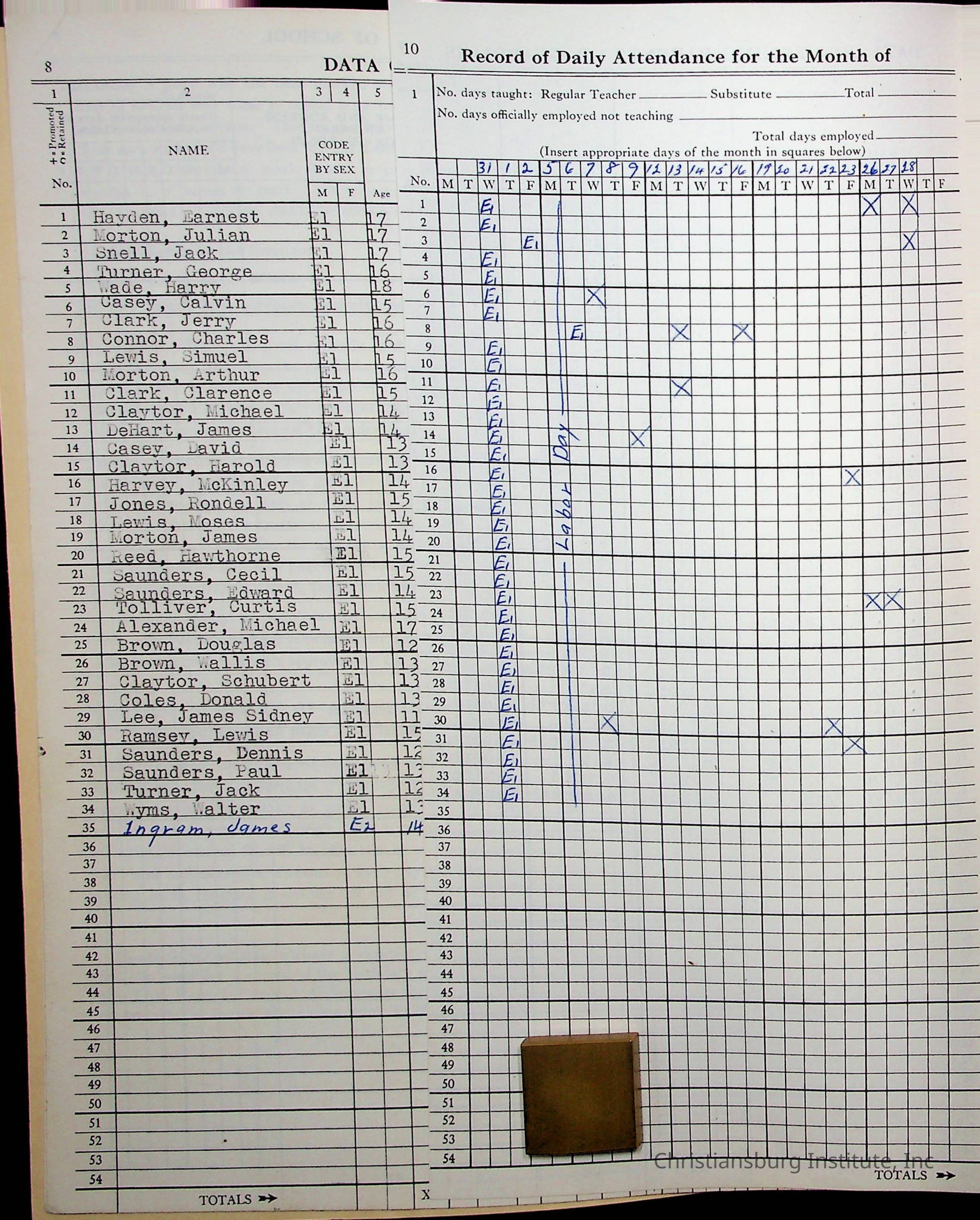 Hattie E. Clemons' Virginia teacher's register book for the school year 1960-1961 for Radford boy students at Christiansburg Institute including information about her students, their attendance, and course grades.Collection