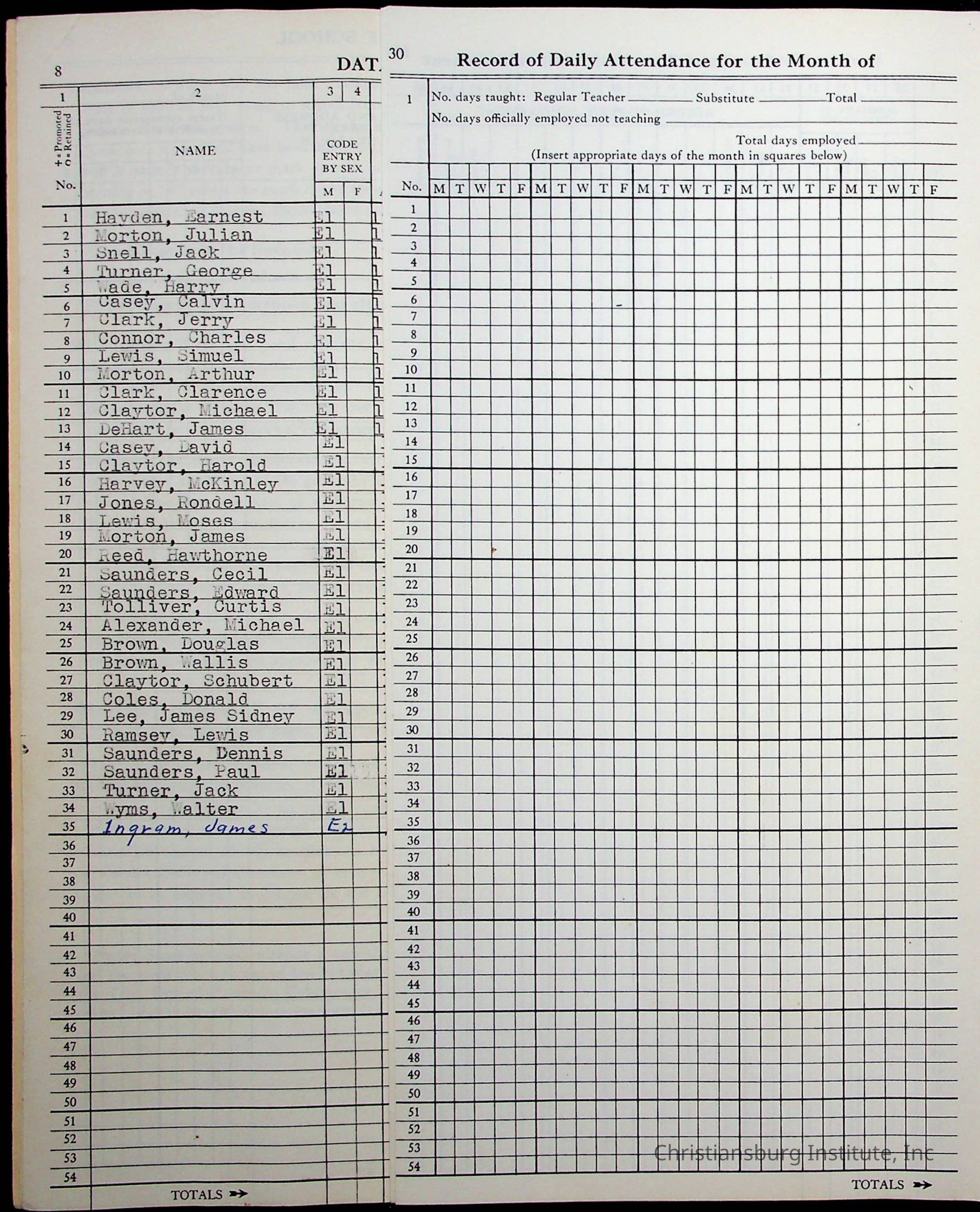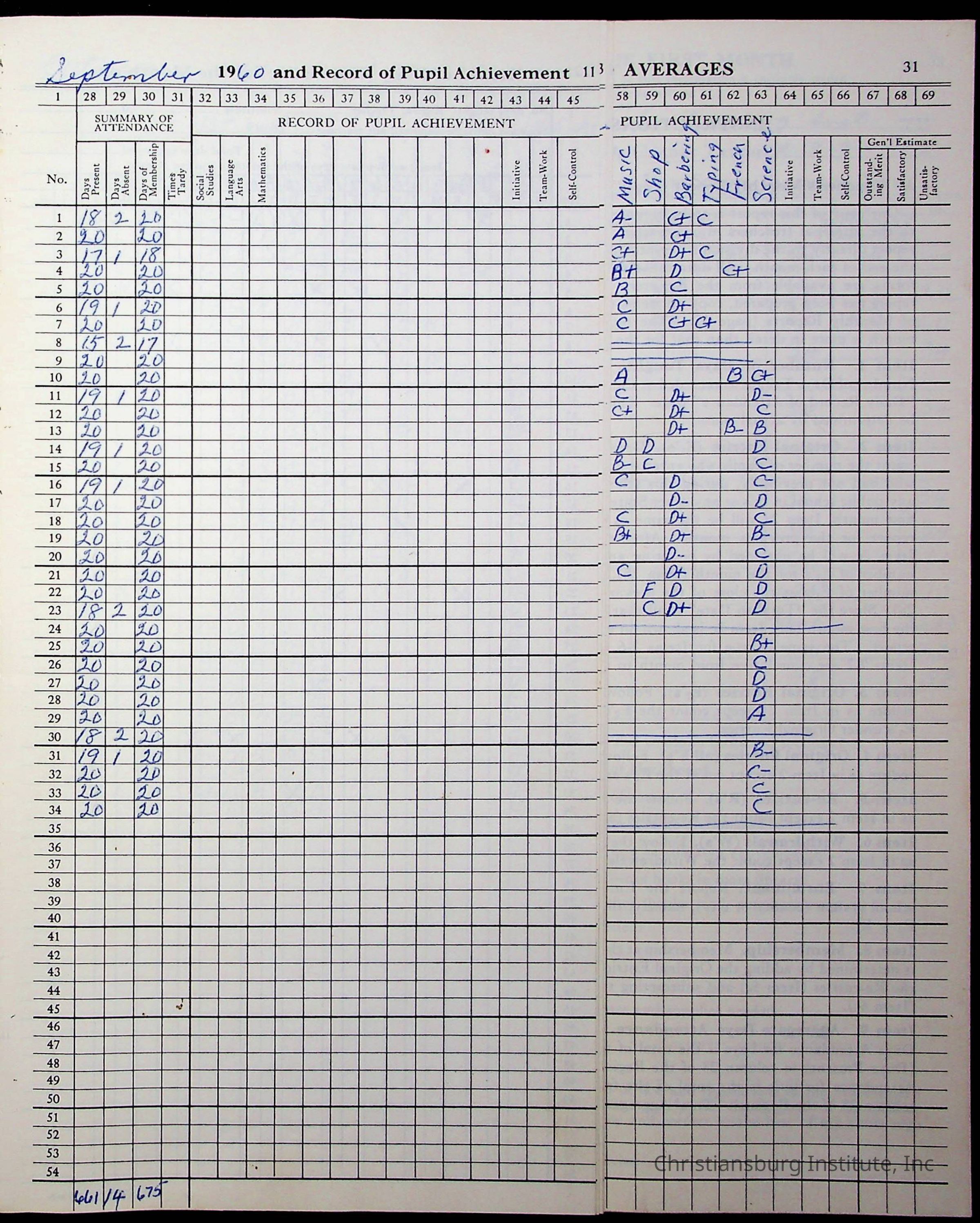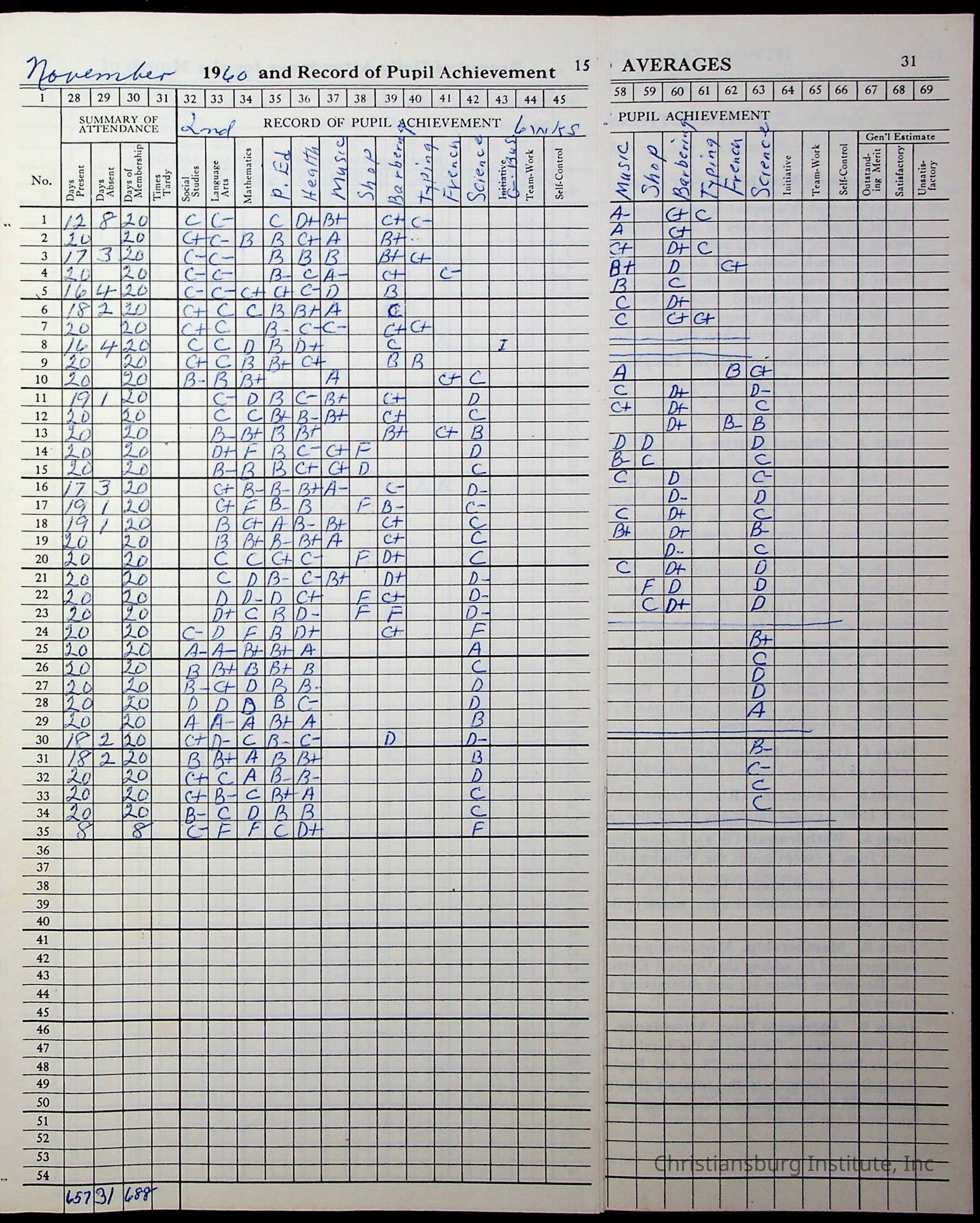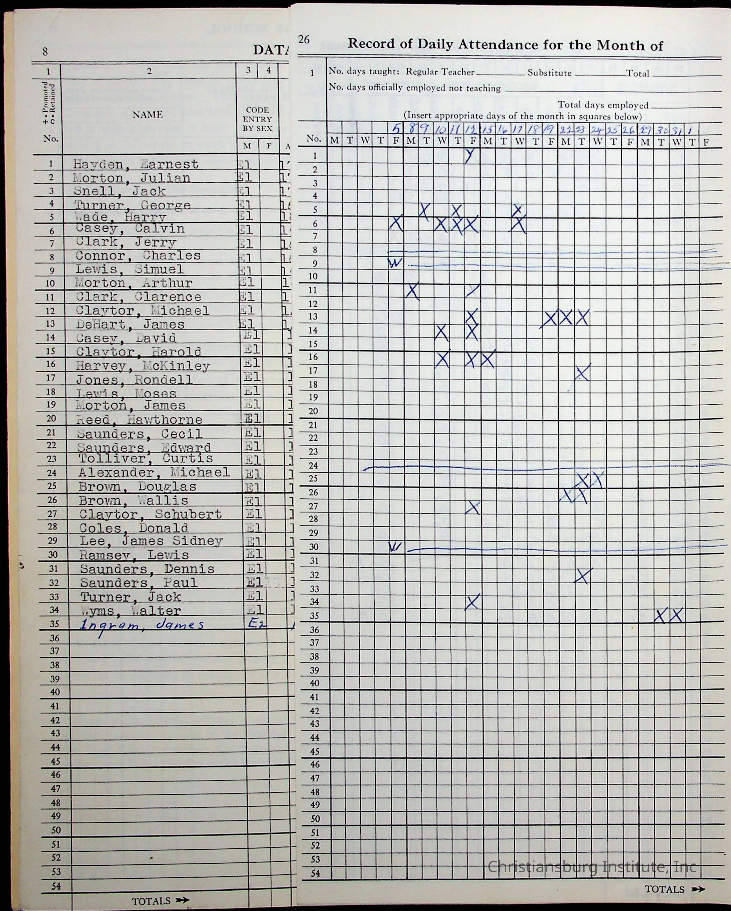 Hattie E. Clemons' Virginia teacher's register book for the school year 1960-1961 for Radford boy students at Christiansburg Institute including information about her students, their attendance, and course grades.Collection