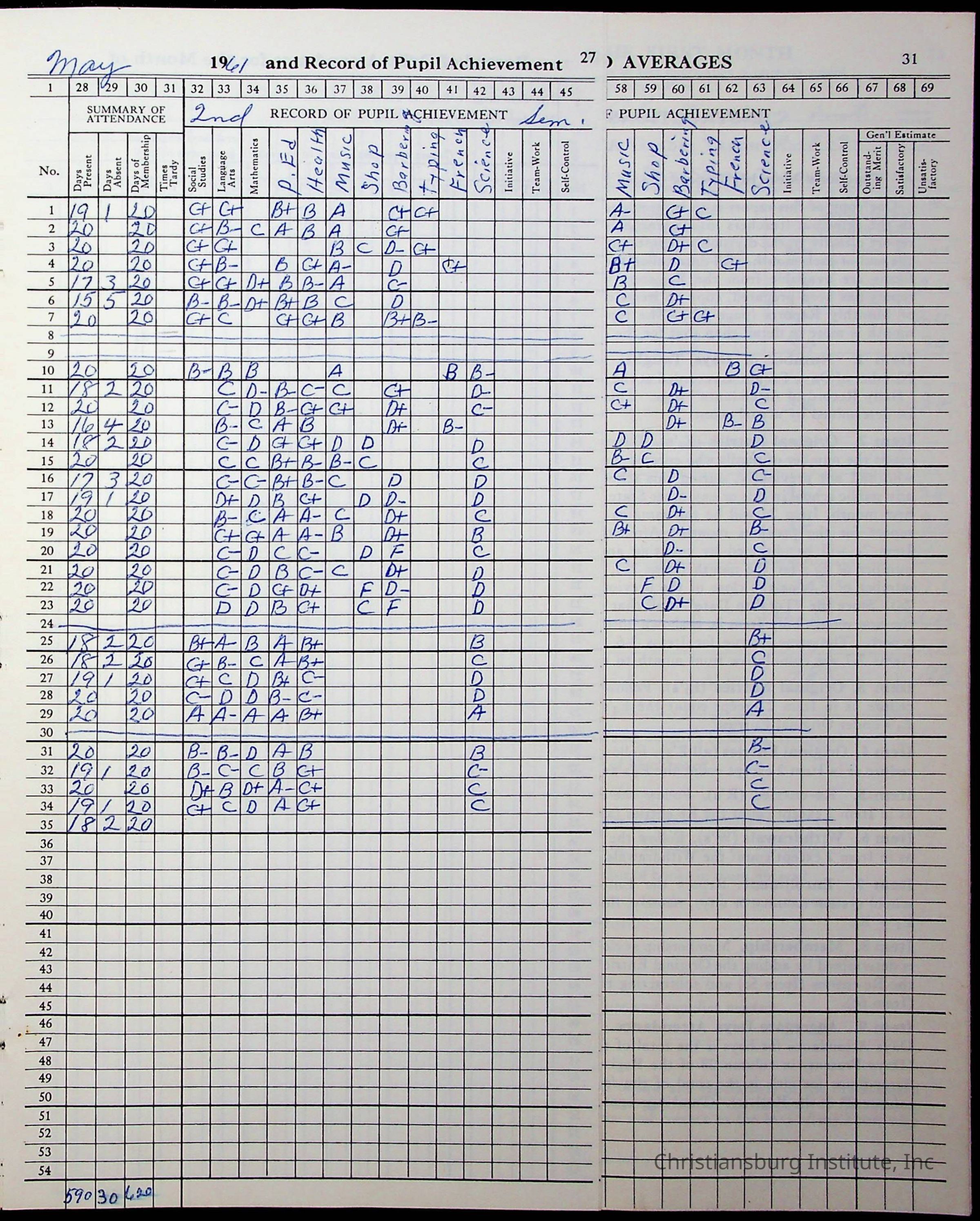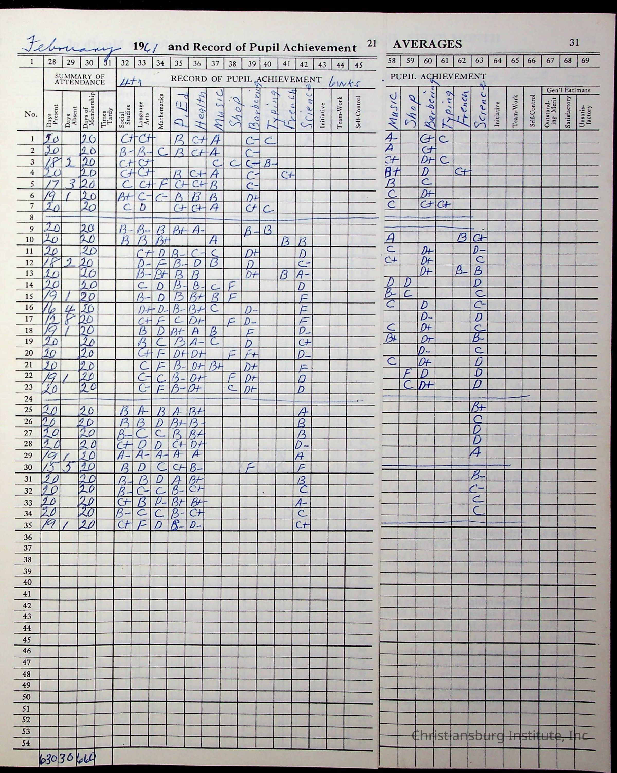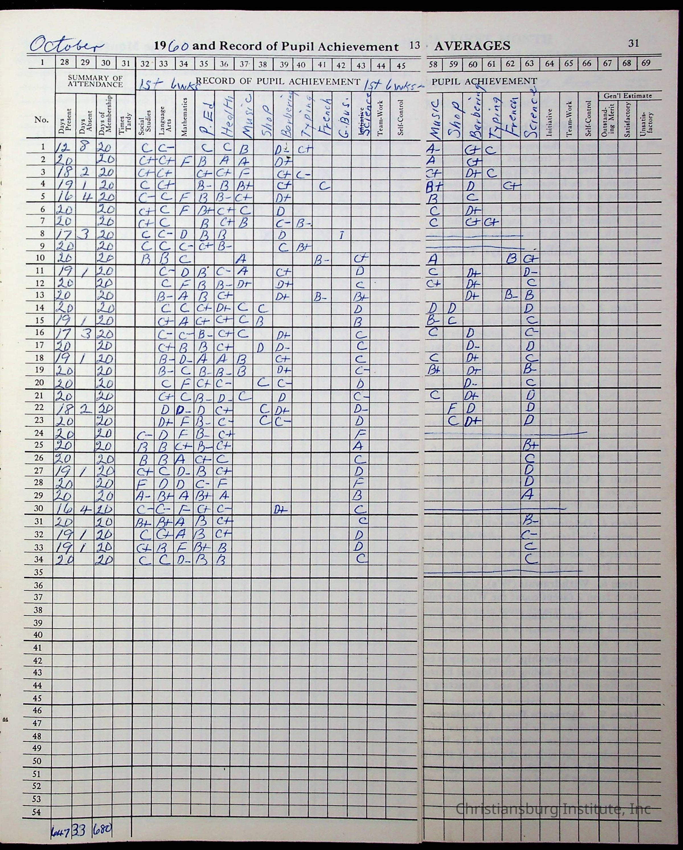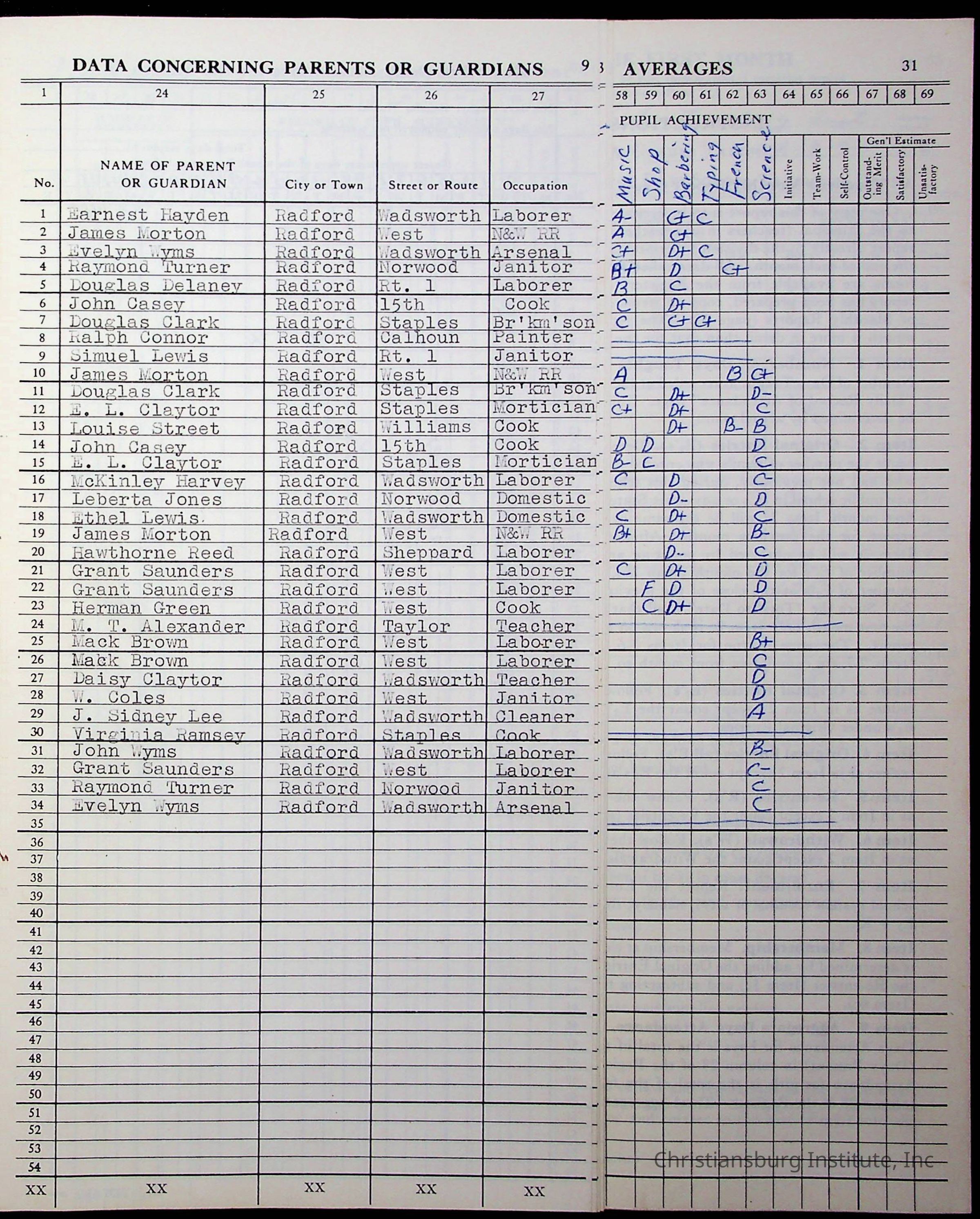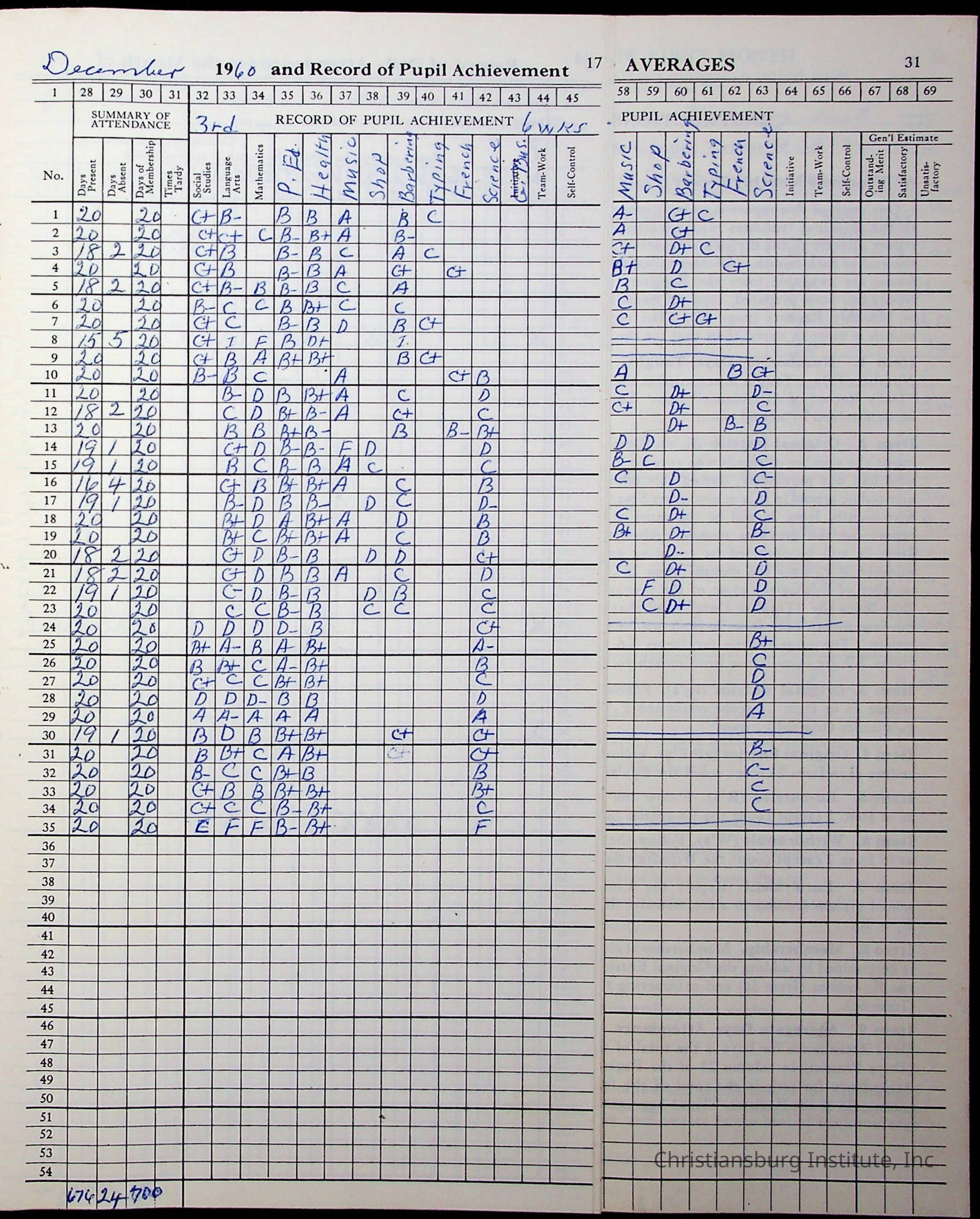 Hattie E. Clemons' Virginia teacher's register book for the school year 1960-1961 for Radford boy students at Christiansburg Institute including information about her students, their attendance, and course grades.Collection