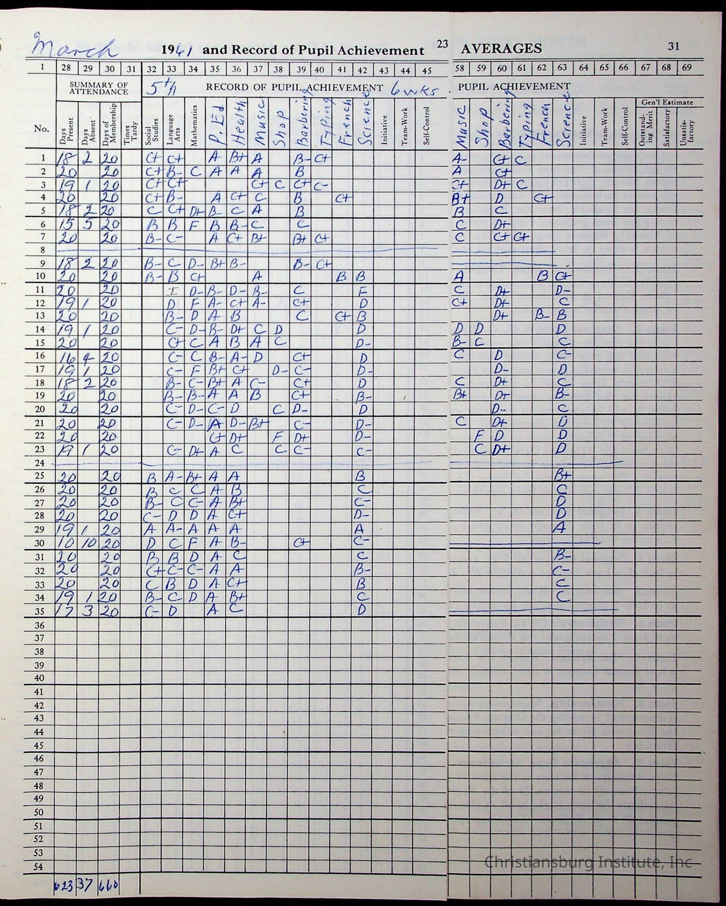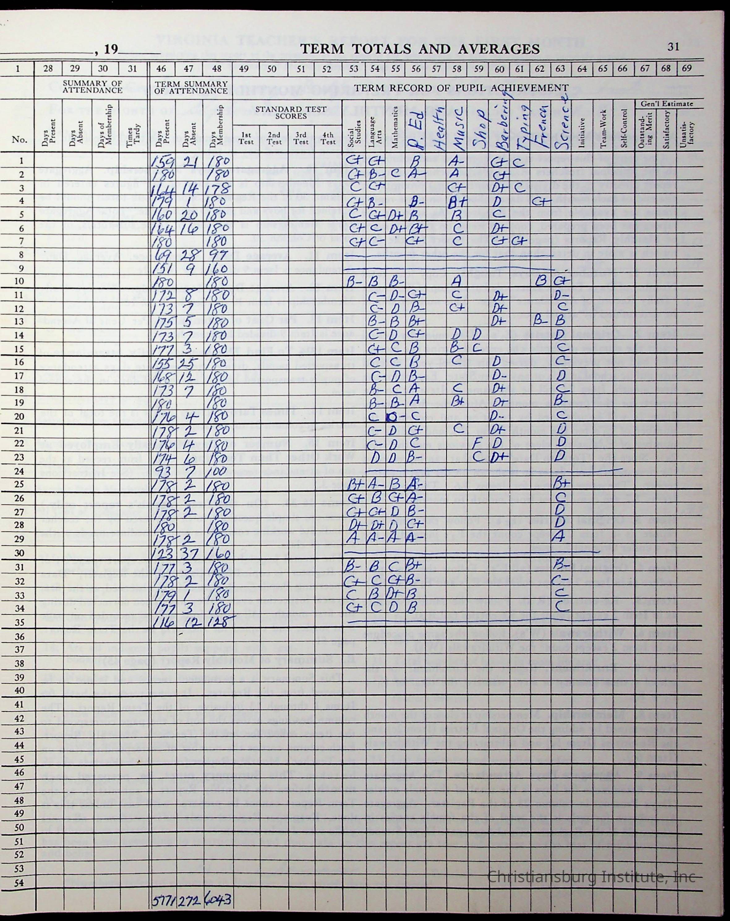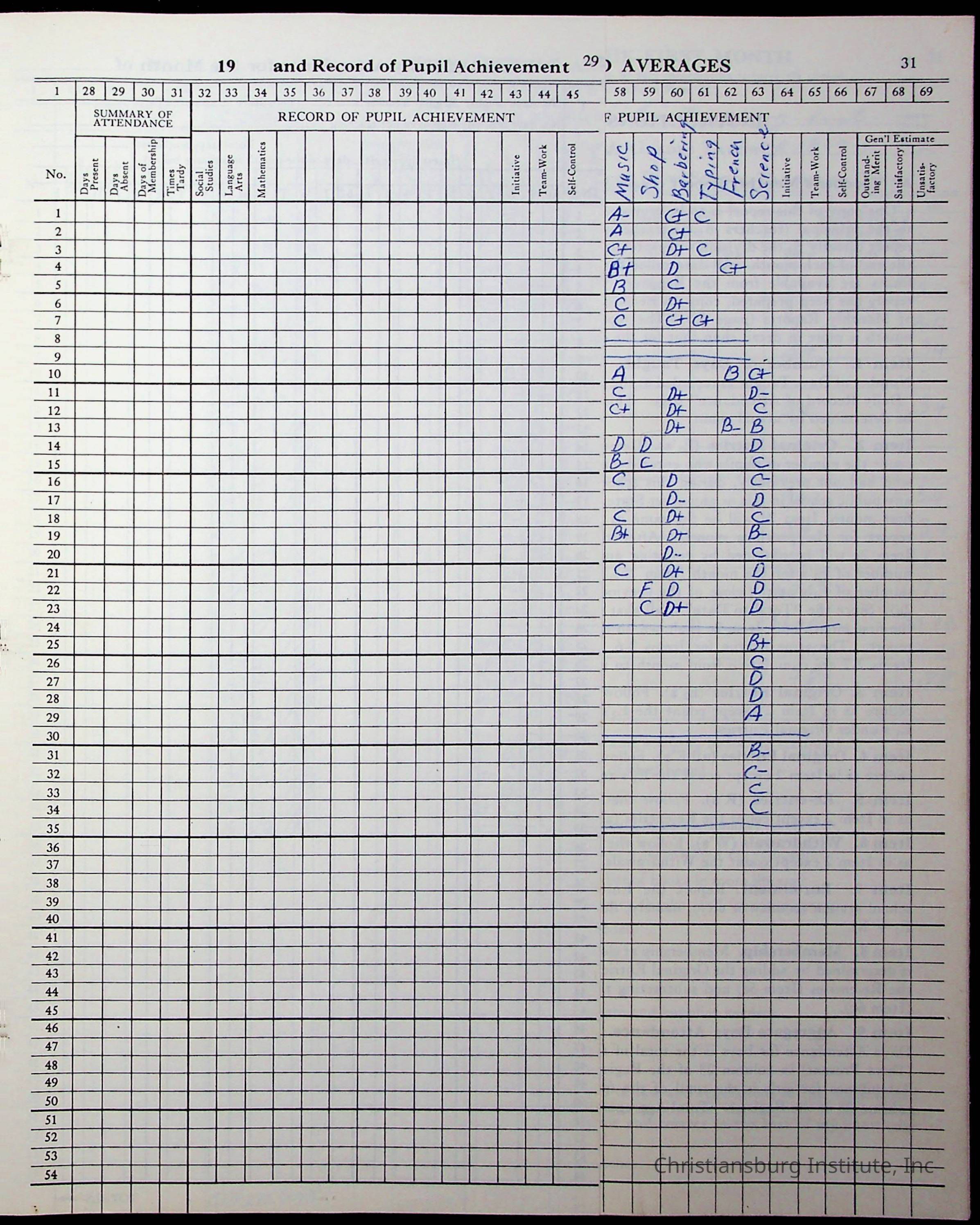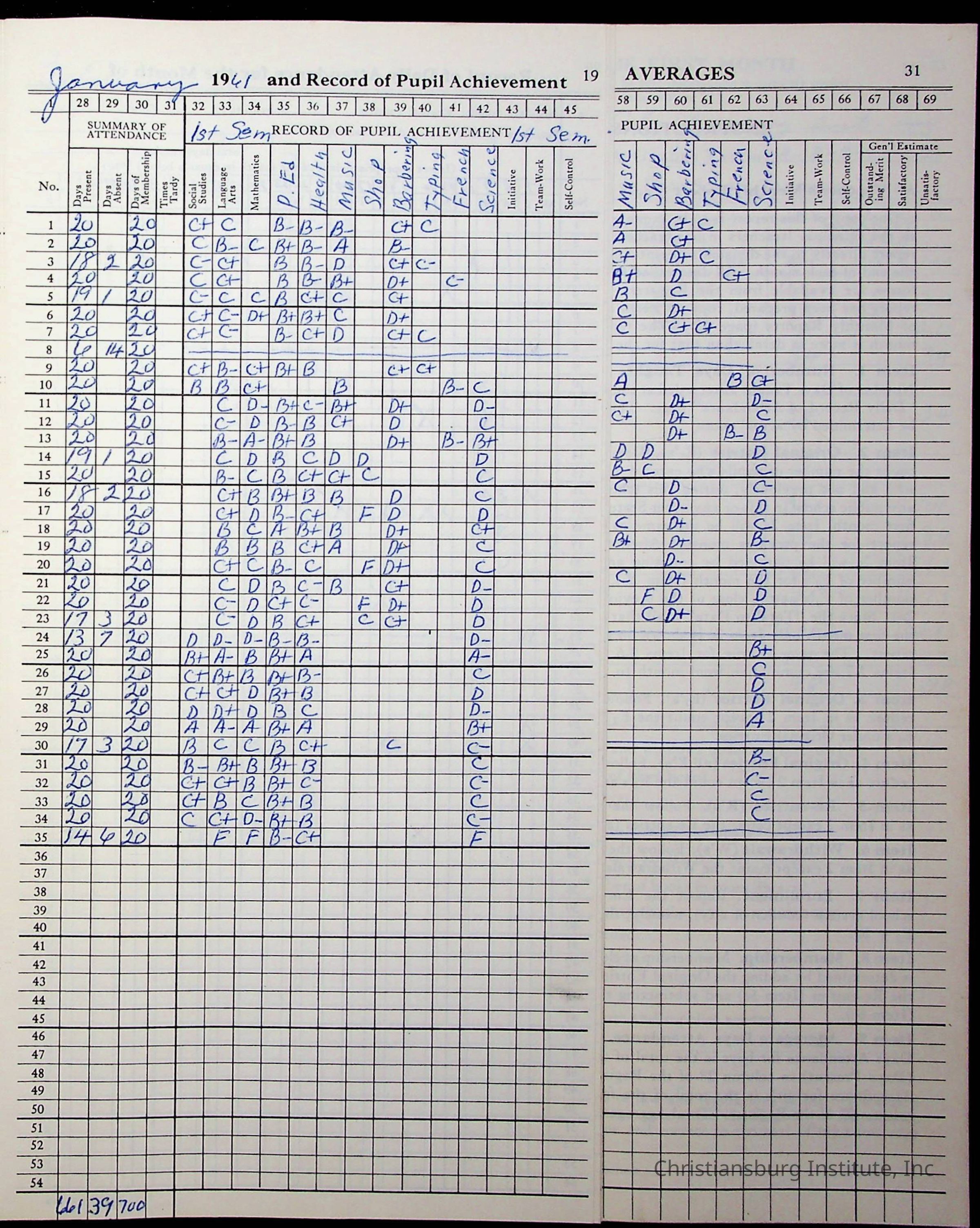 Hattie E. Clemons' Virginia teacher's register book for the school year 1960-1961 for Radford boy students at Christiansburg Institute including information about her students, their attendance, and course grades.Collection