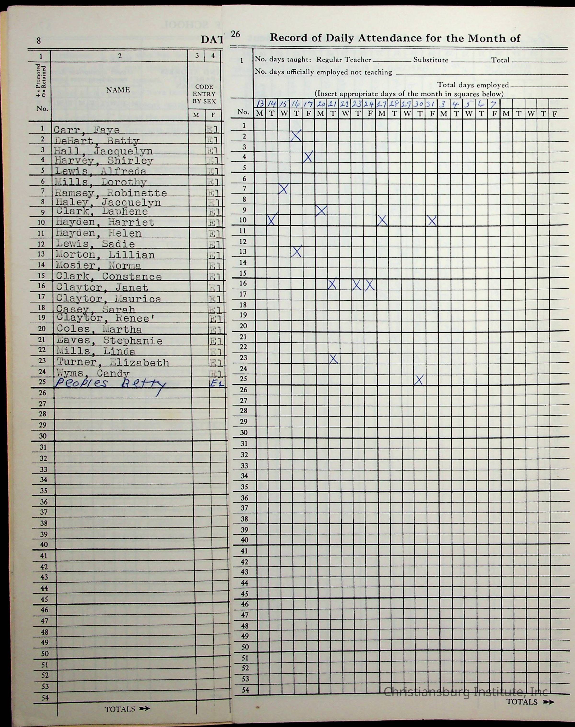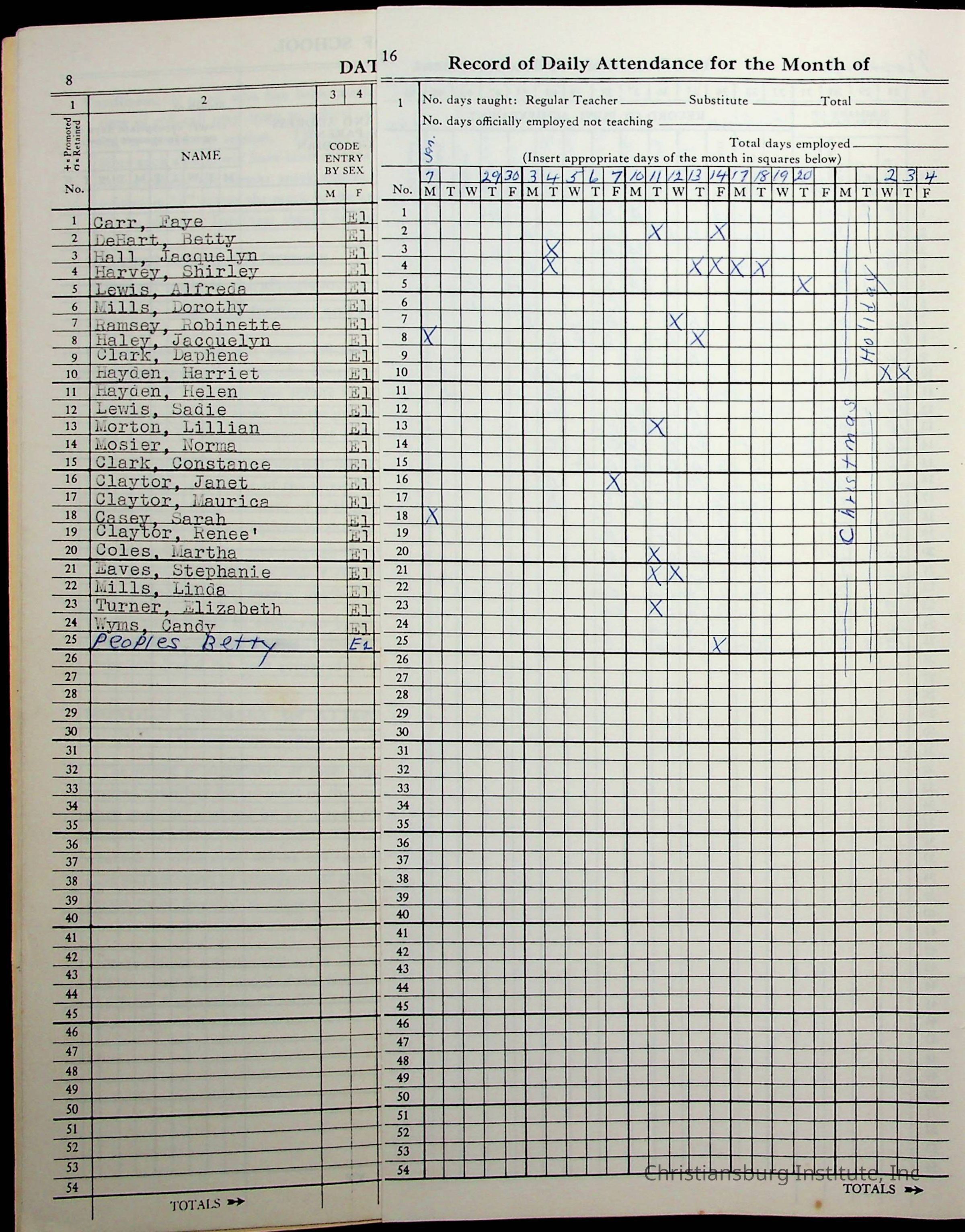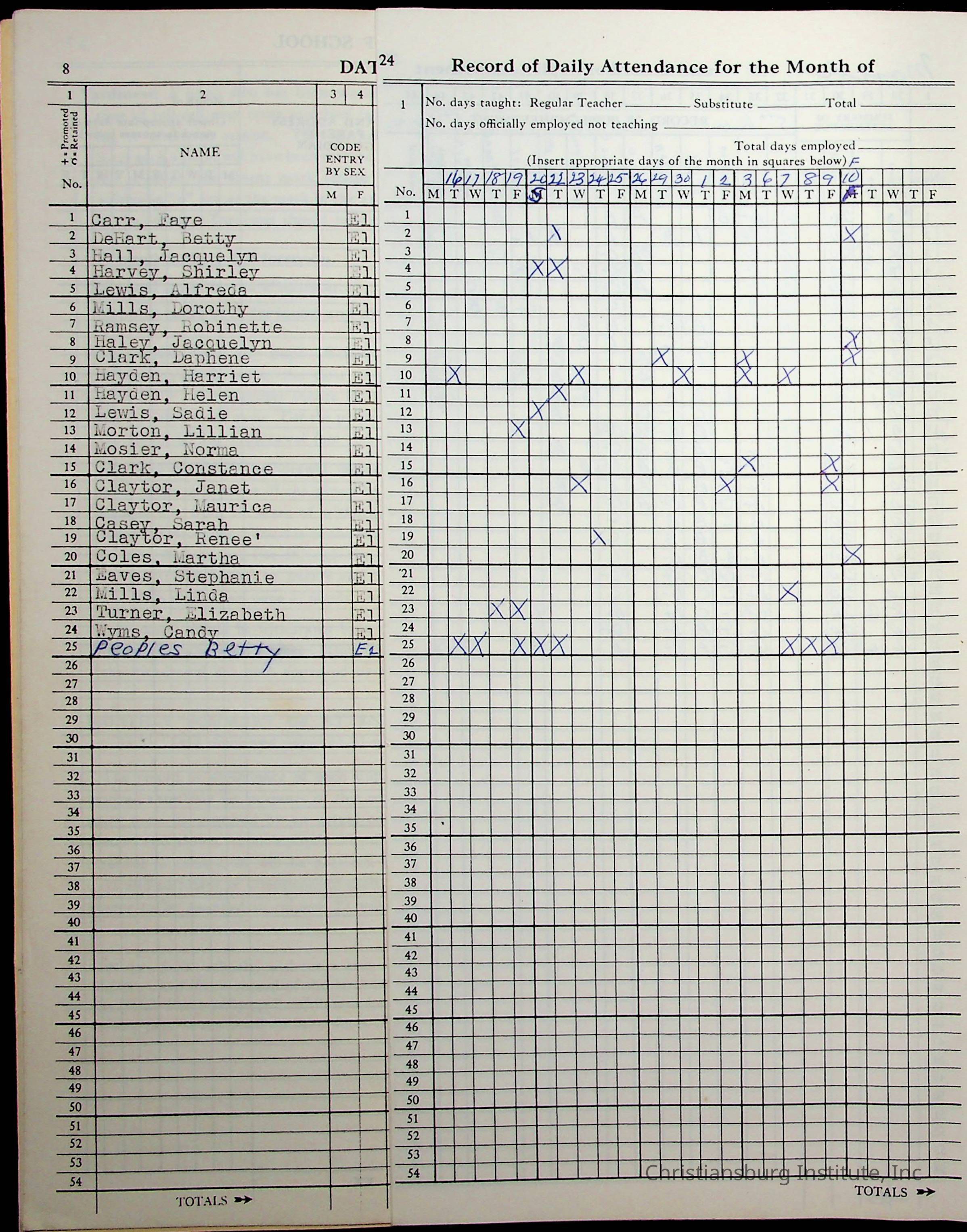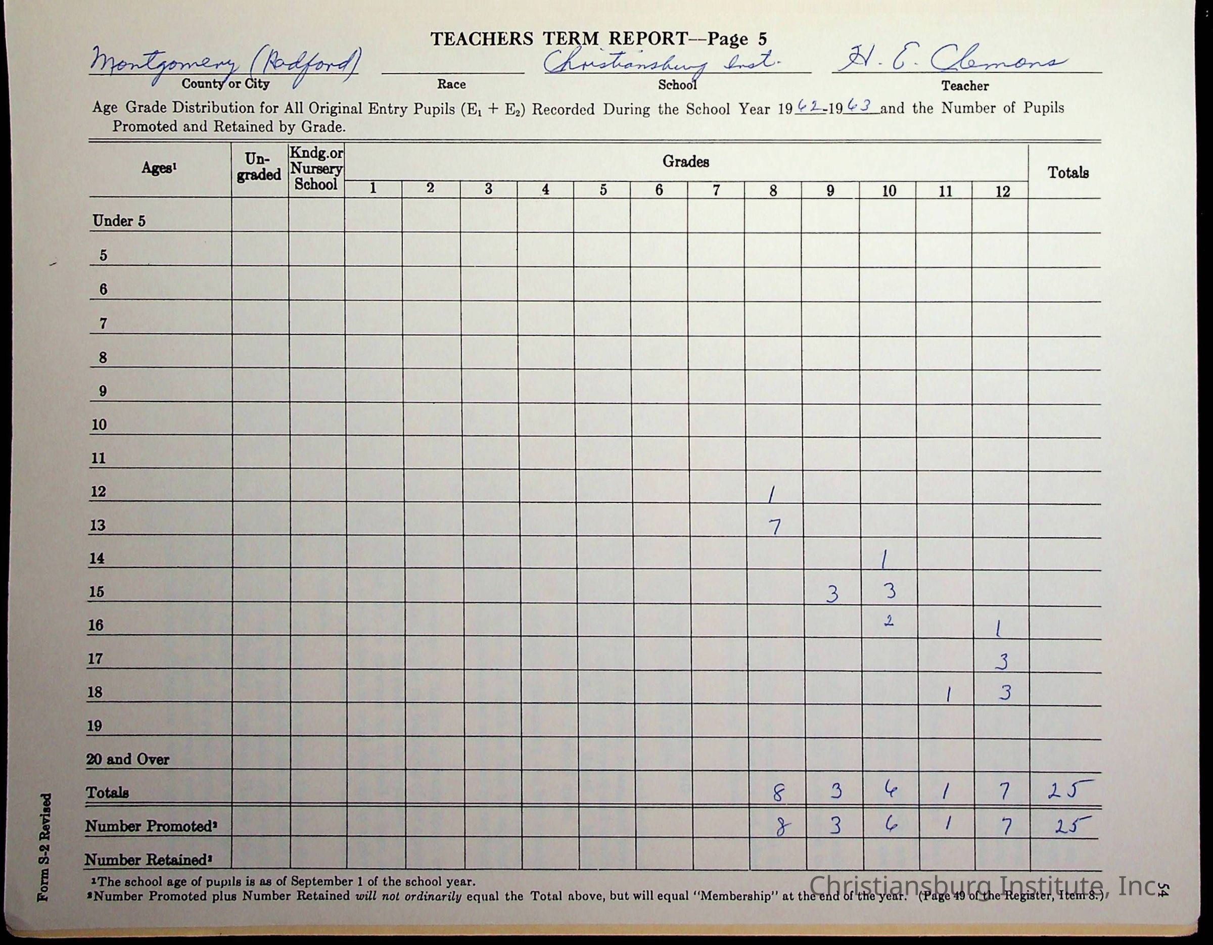 Hattie E. Clemons' Virginia teacher's register book for the school year 1962-1963 for Radford girl students at Christiansburg Institute including information about her students, their attendance, and course grades.Collection