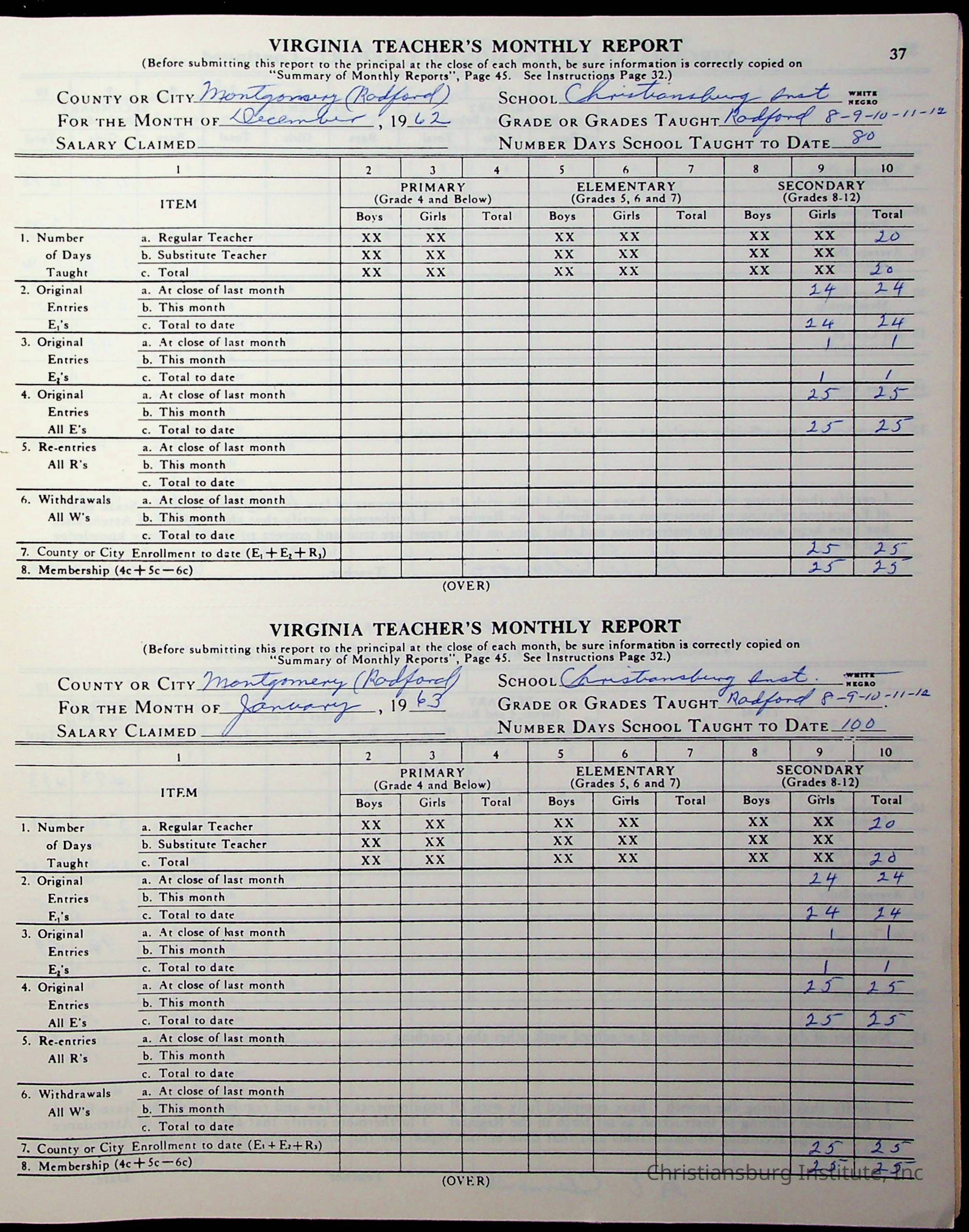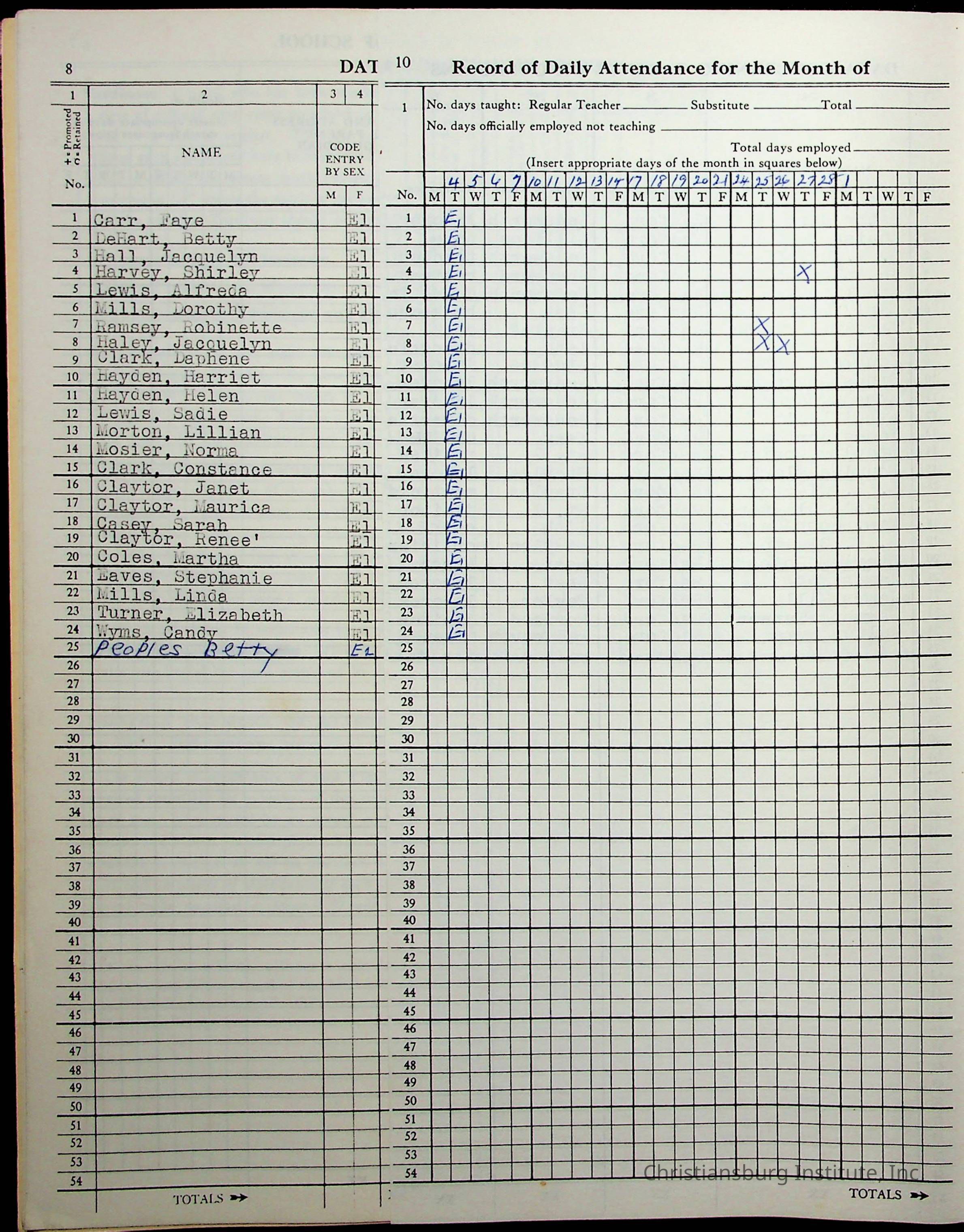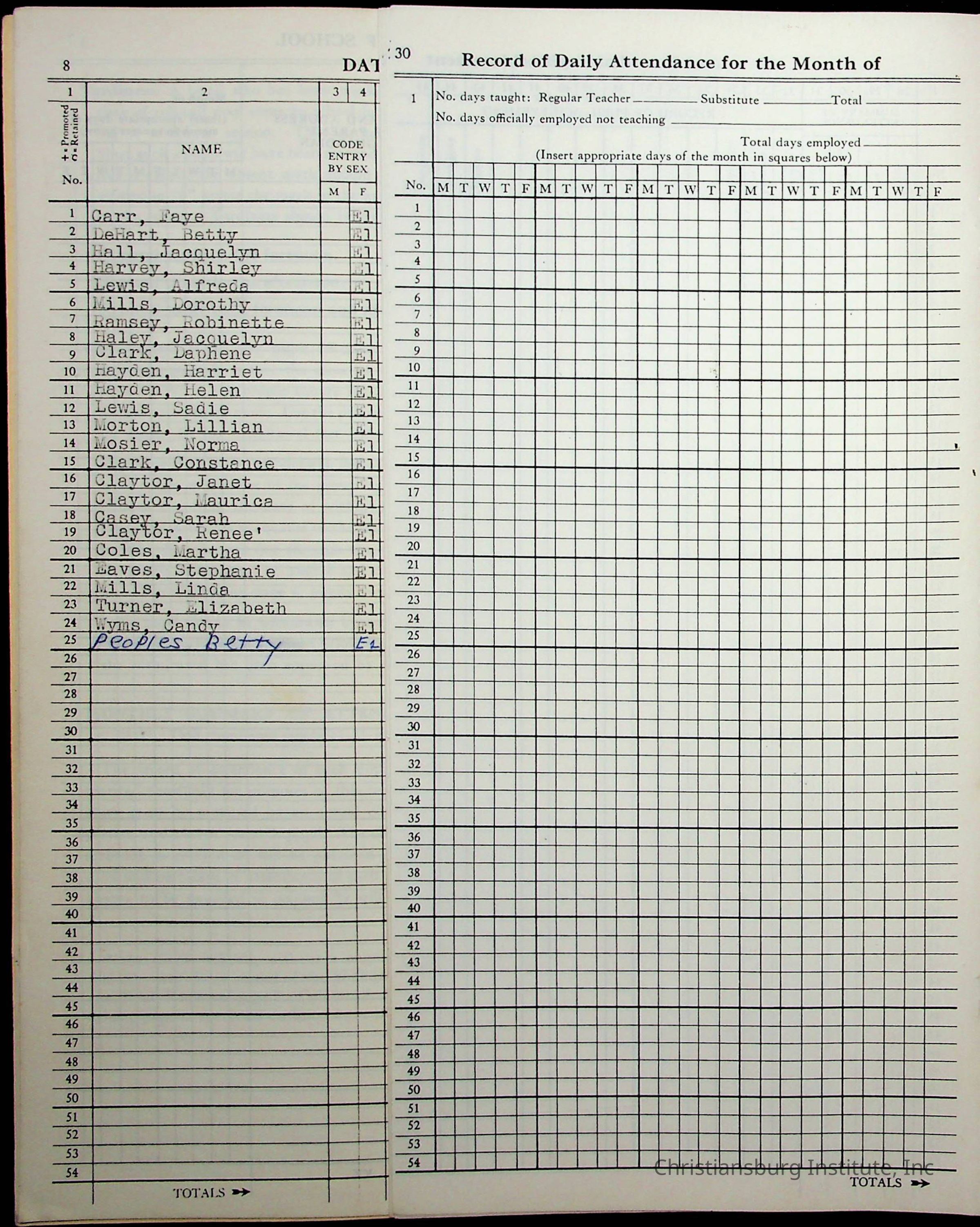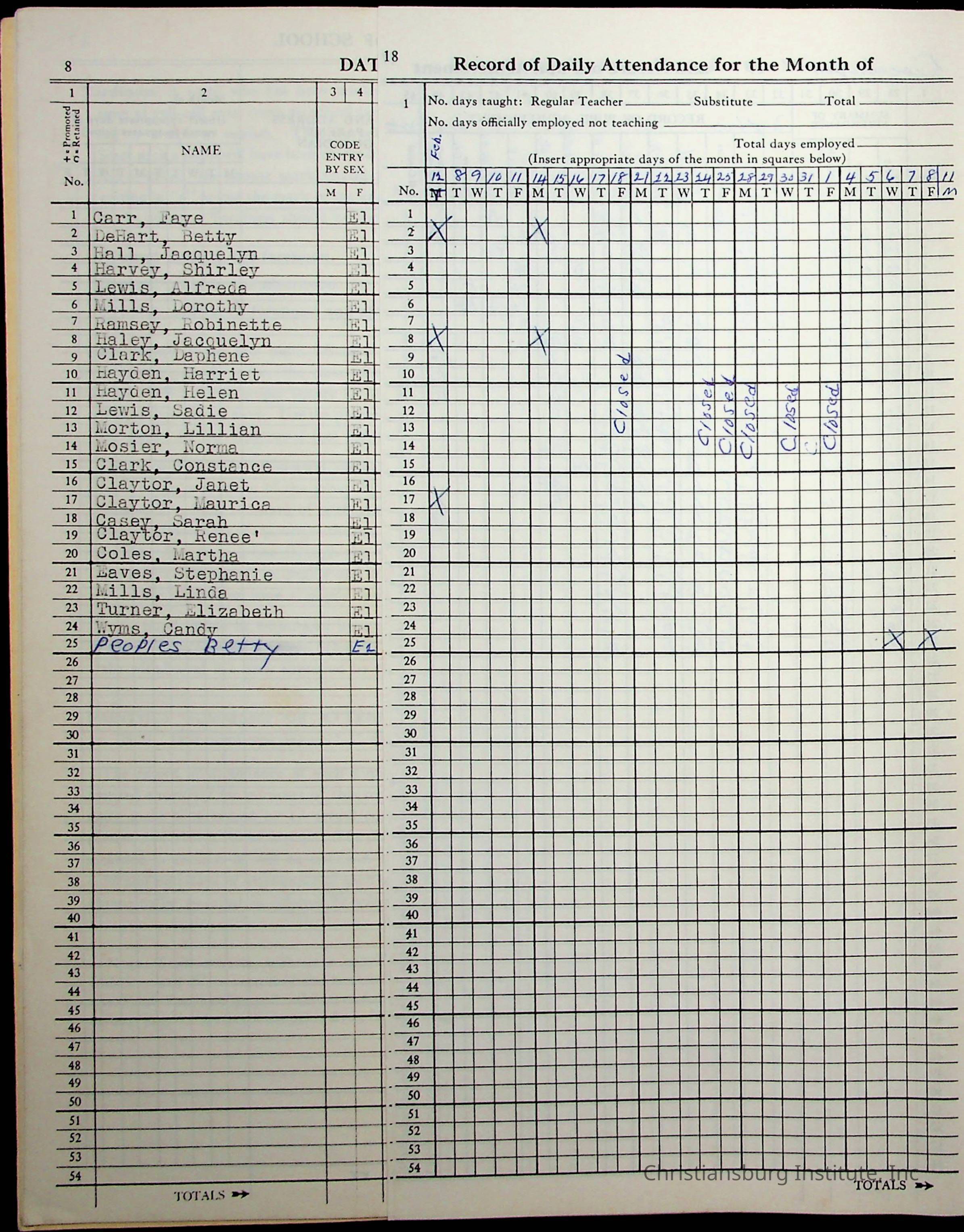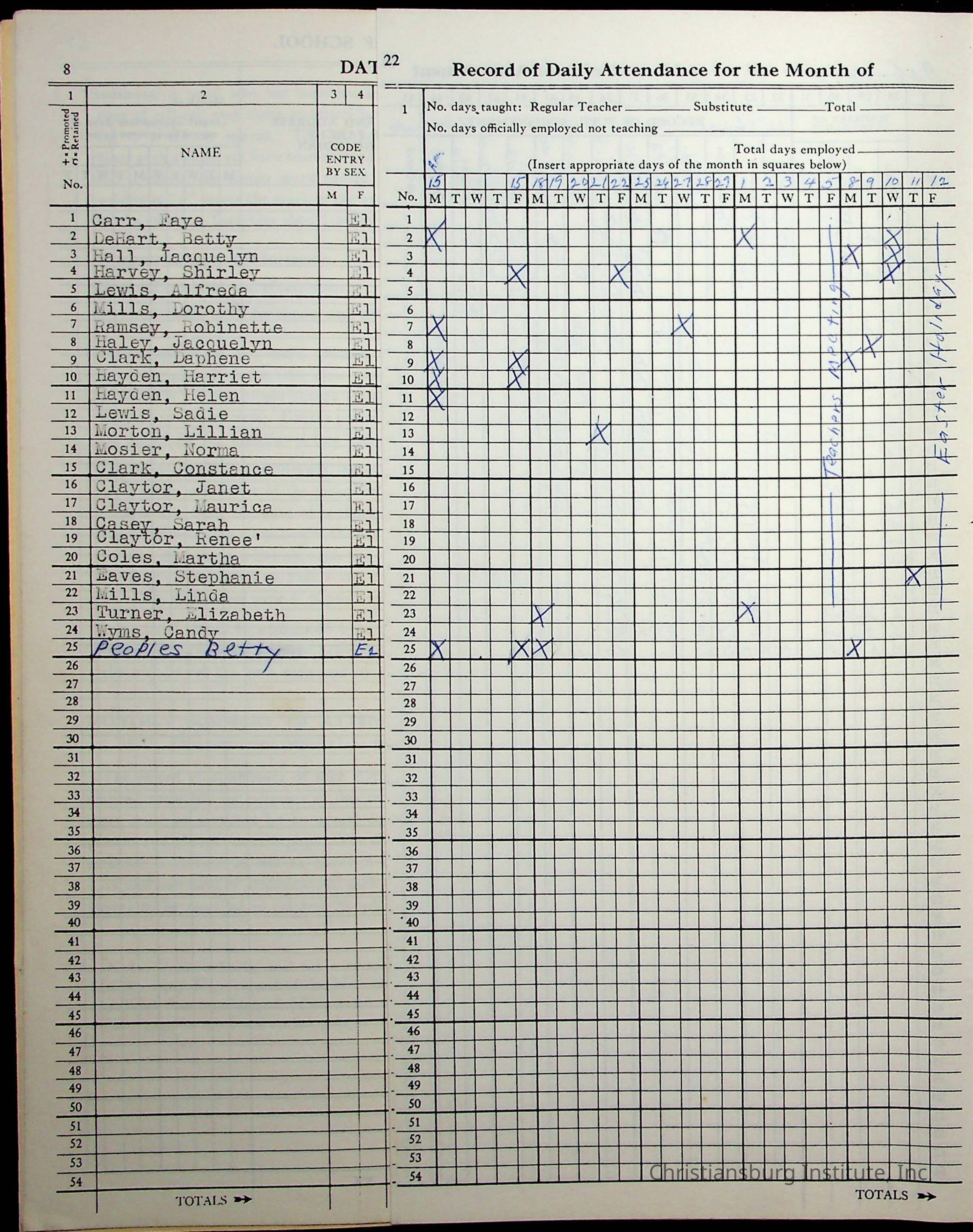 Hattie E. Clemons' Virginia teacher's register book for the school year 1962-1963 for Radford girl students at Christiansburg Institute including information about her students, their attendance, and course grades.Collection