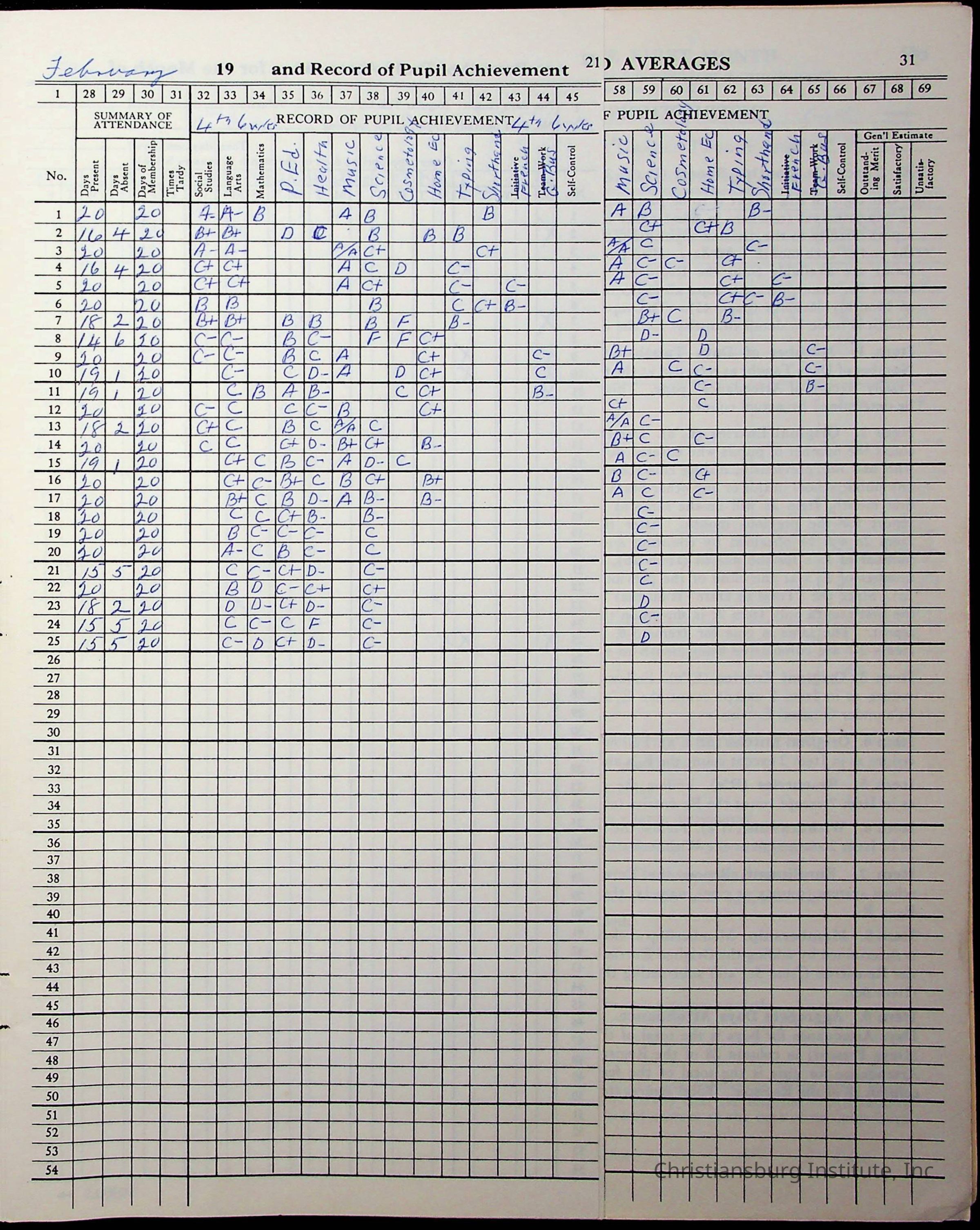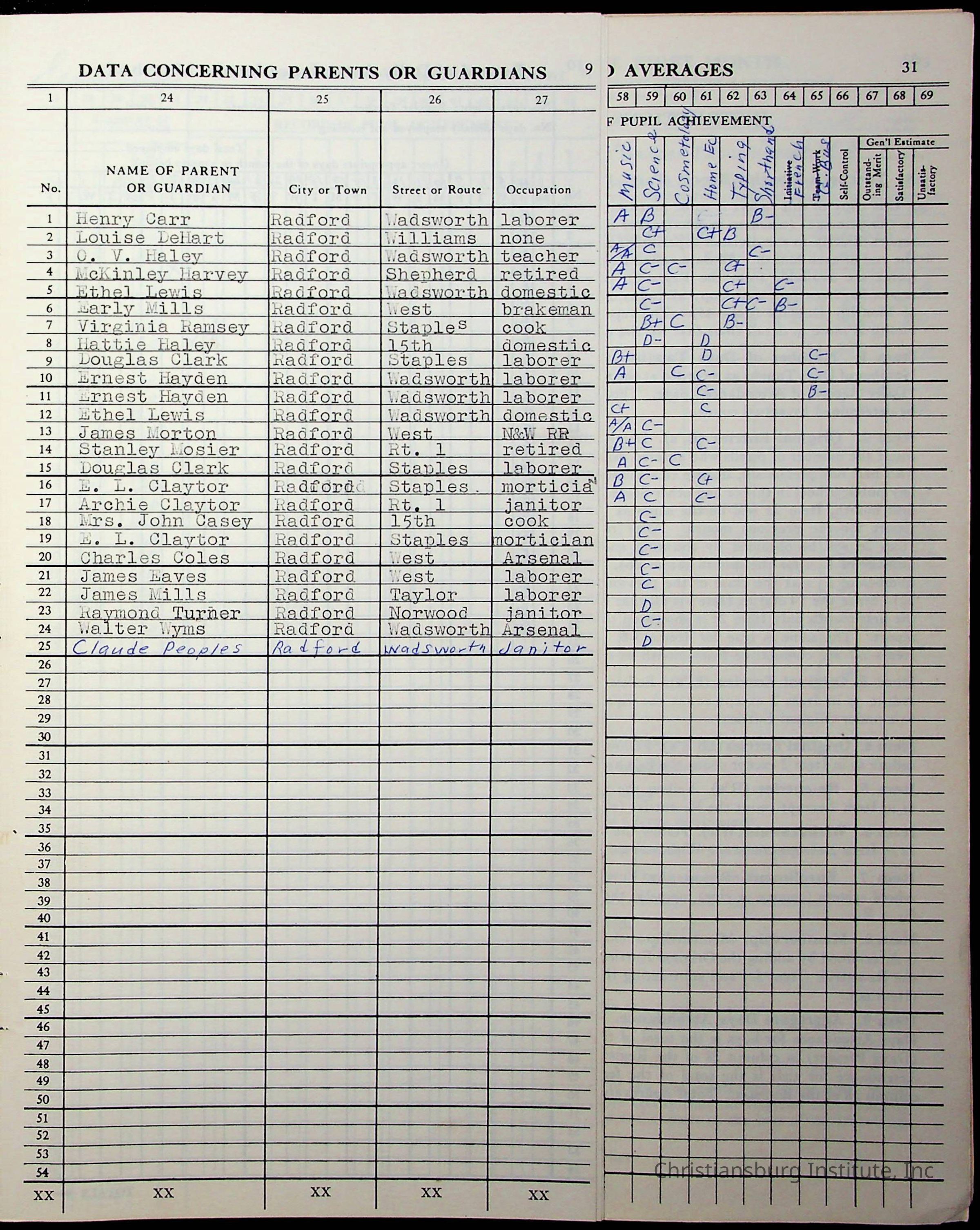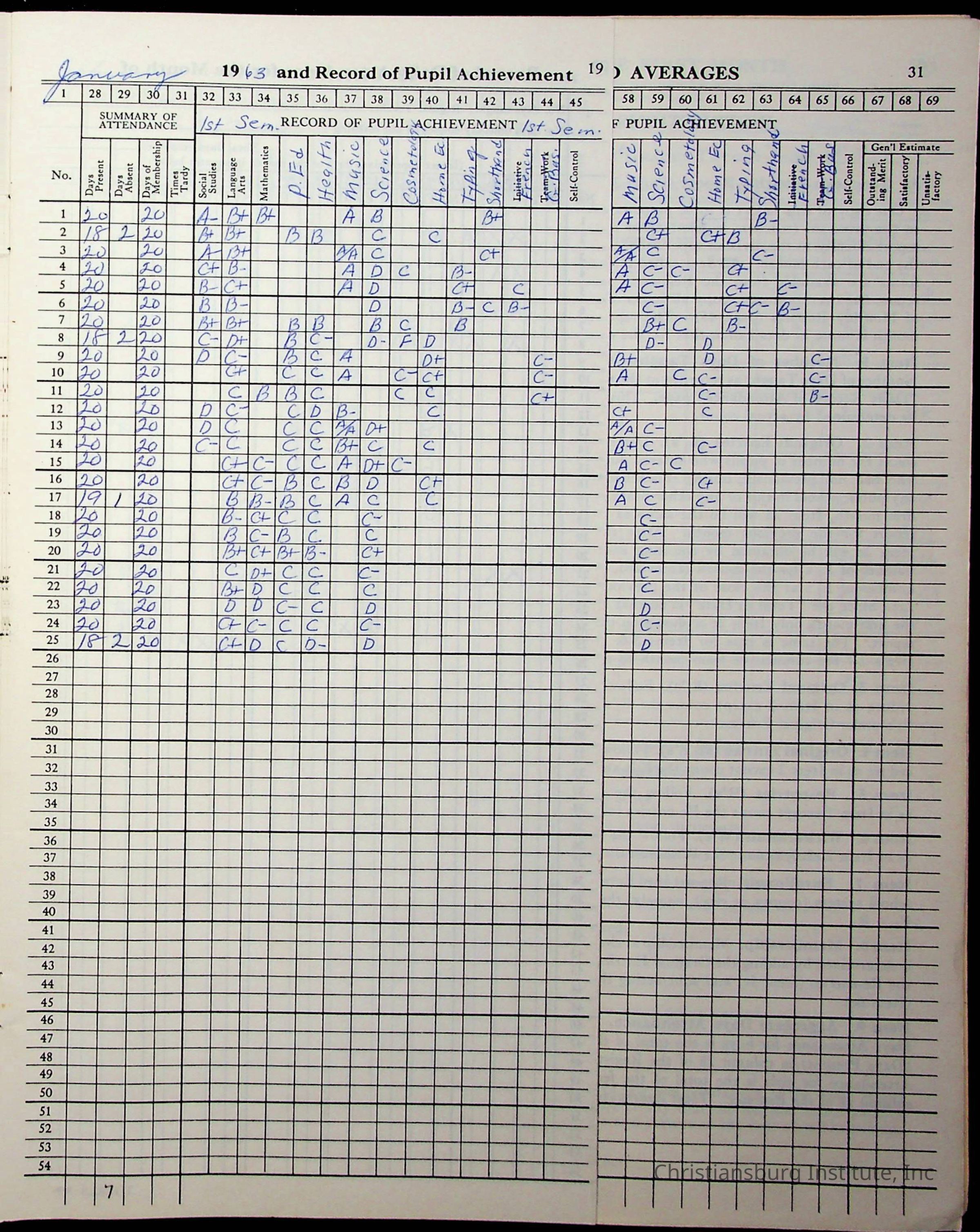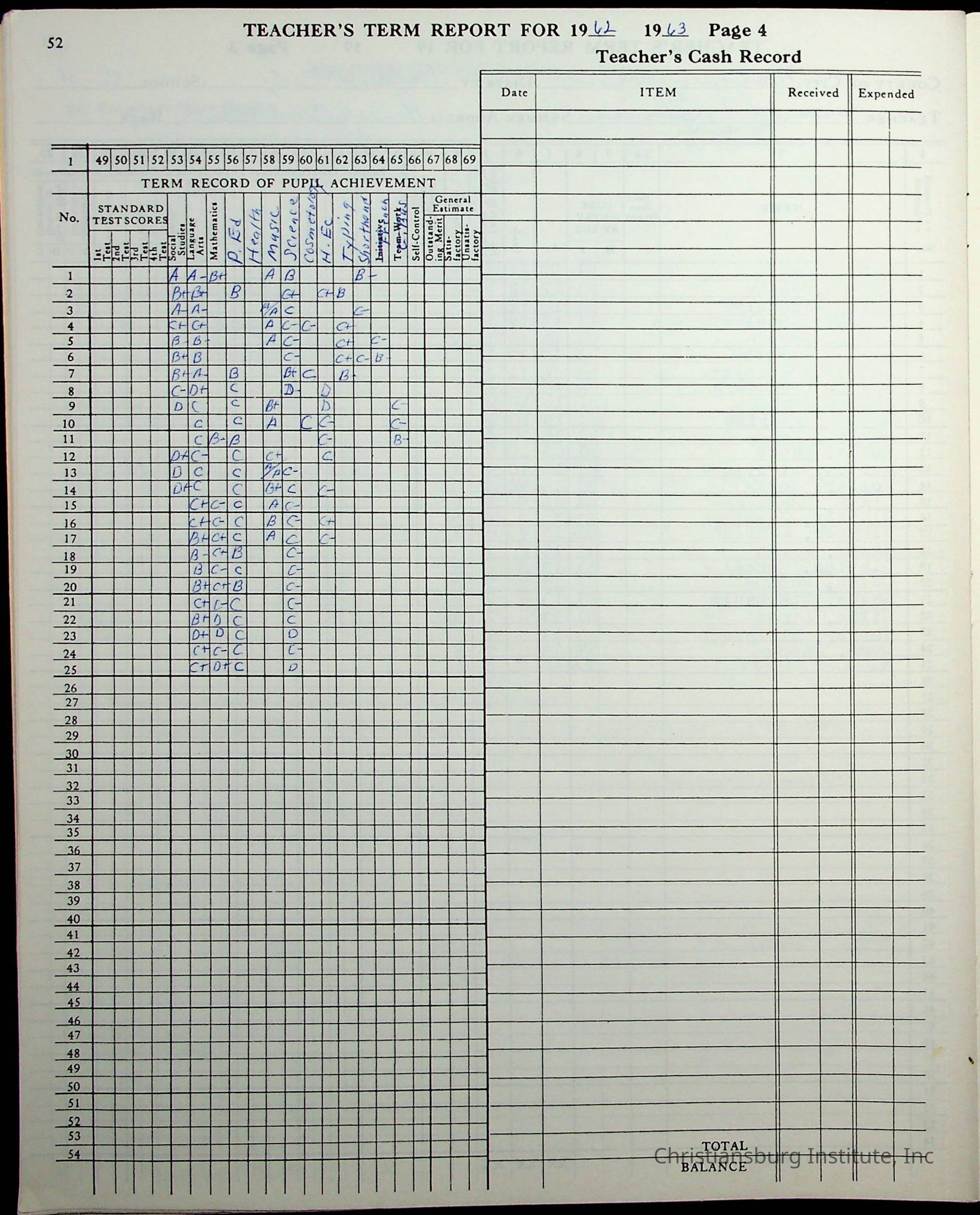 Hattie E. Clemons' Virginia teacher's register book for the school year 1962-1963 for Radford girl students at Christiansburg Institute including information about her students, their attendance, and course grades.Collection