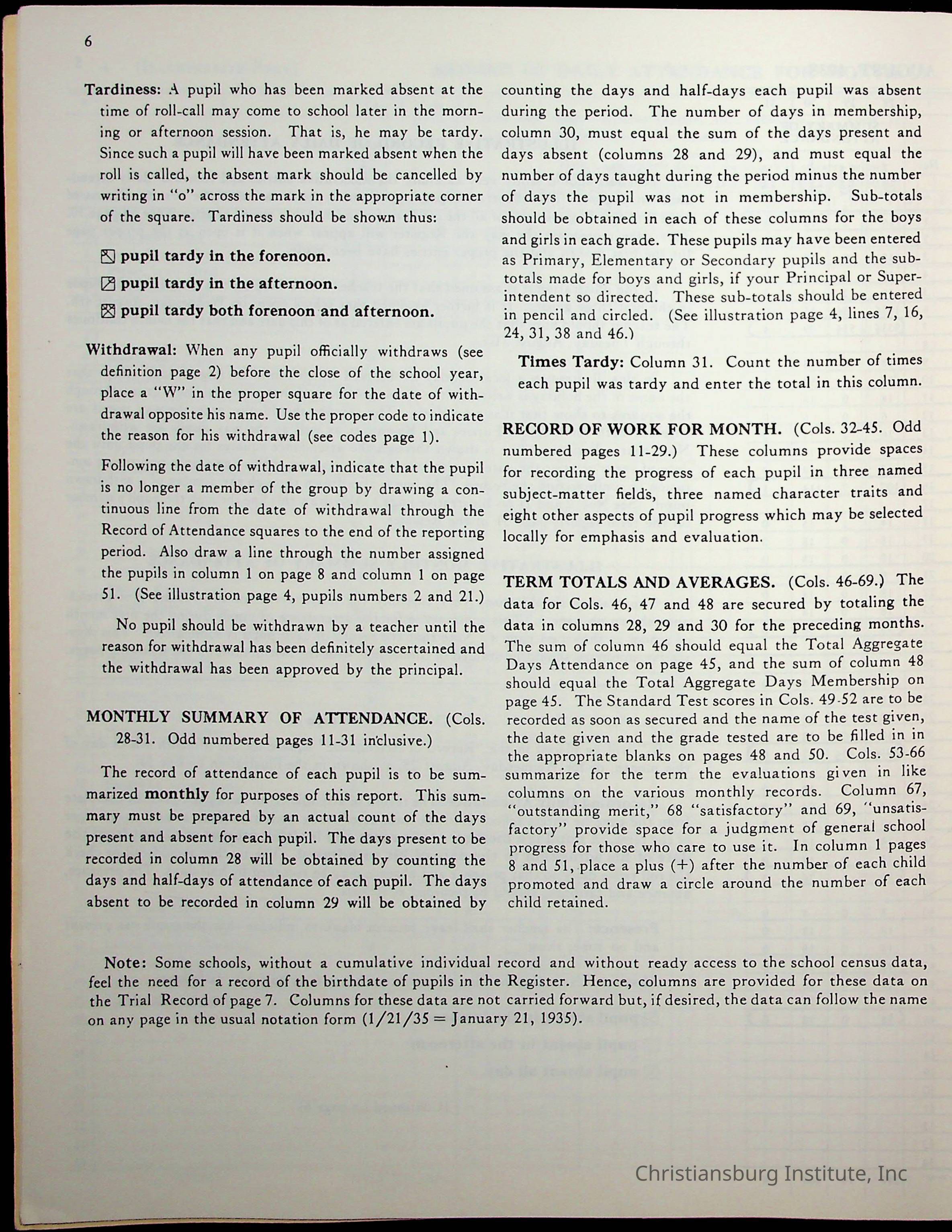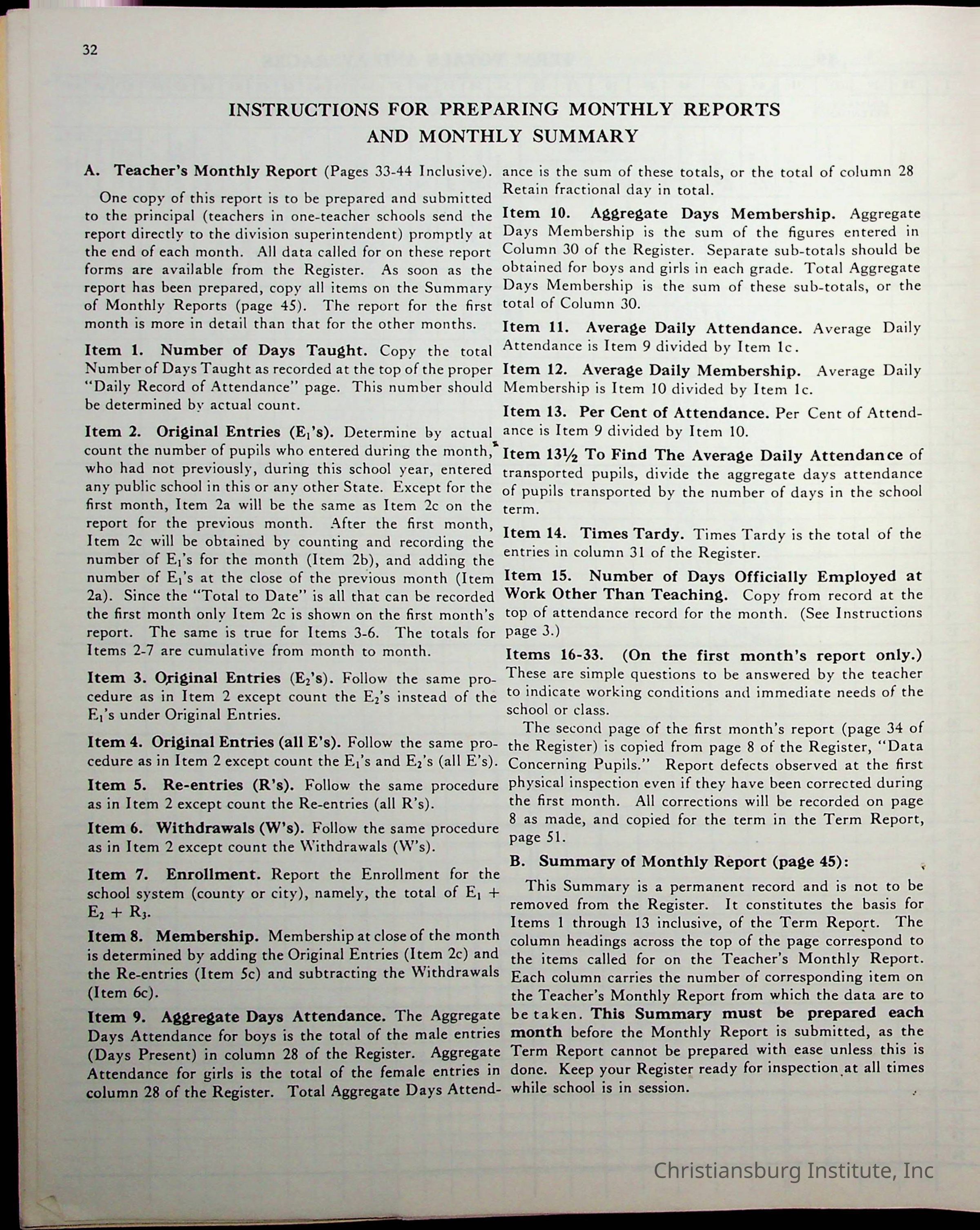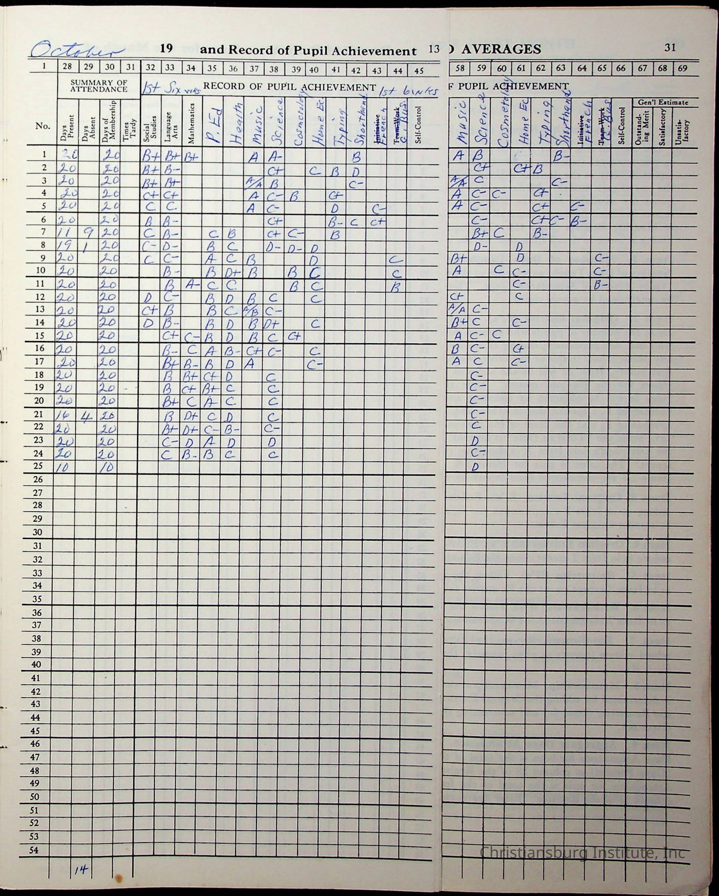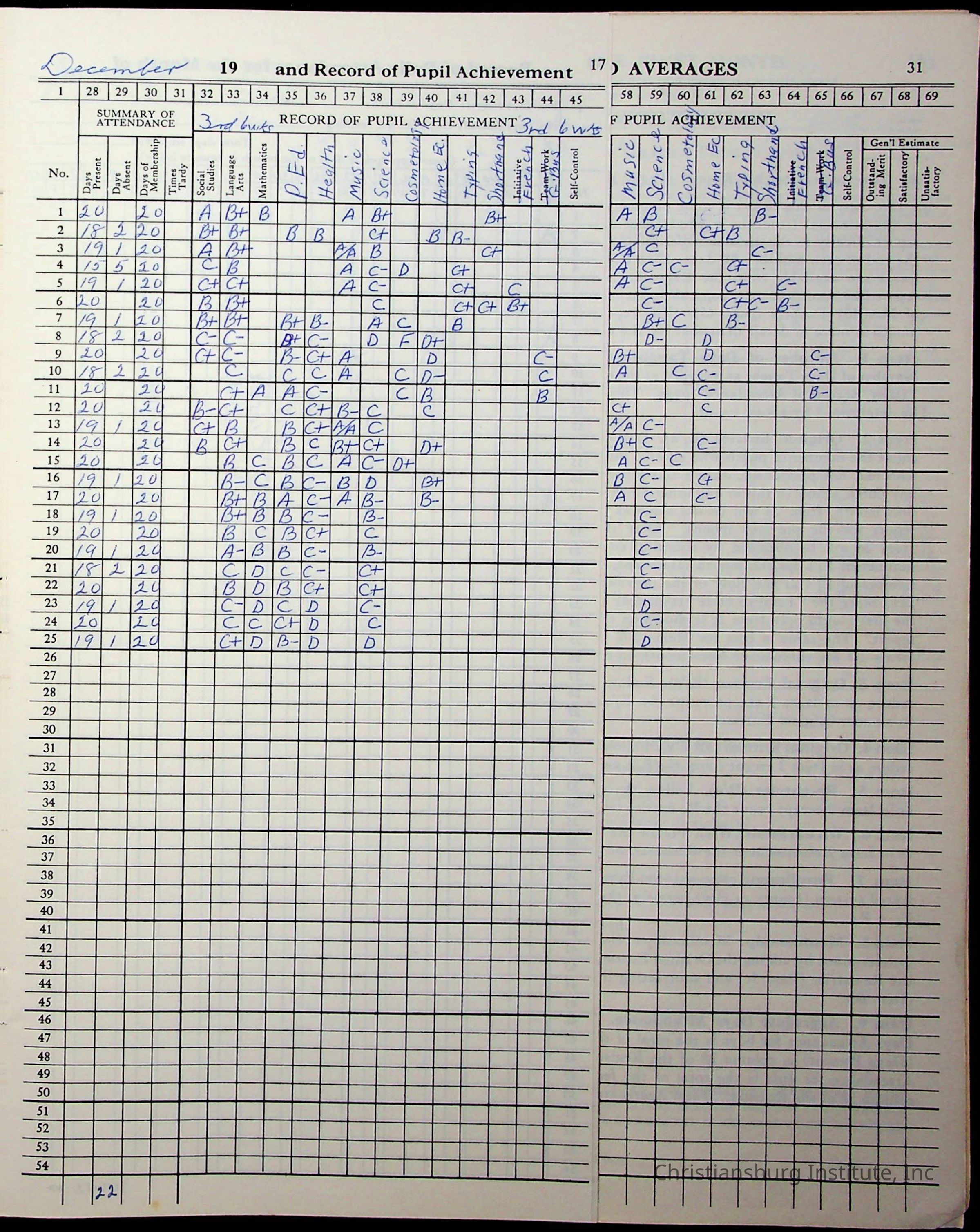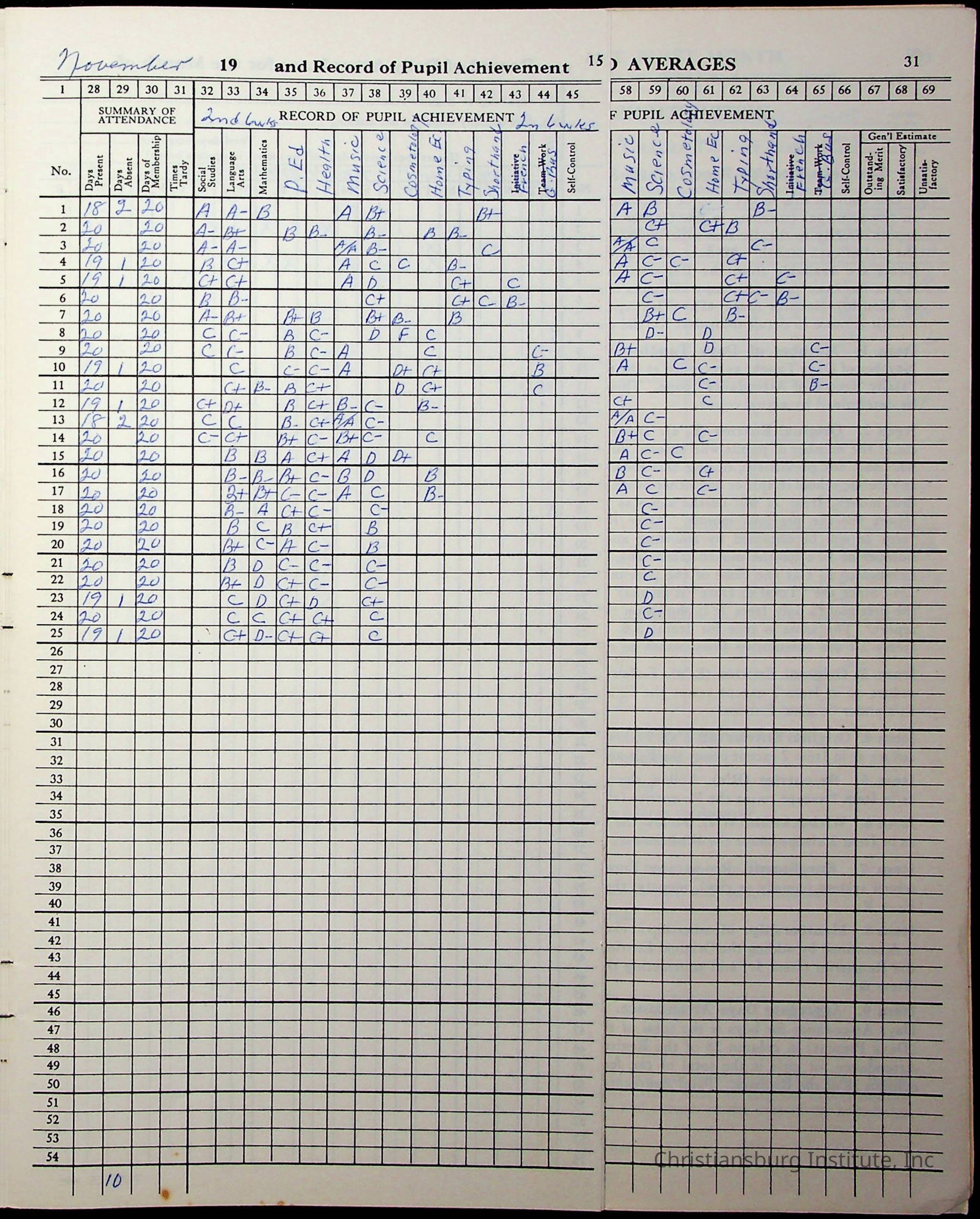 Hattie E. Clemons' Virginia teacher's register book for the school year 1962-1963 for Radford girl students at Christiansburg Institute including information about her students, their attendance, and course grades.Collection