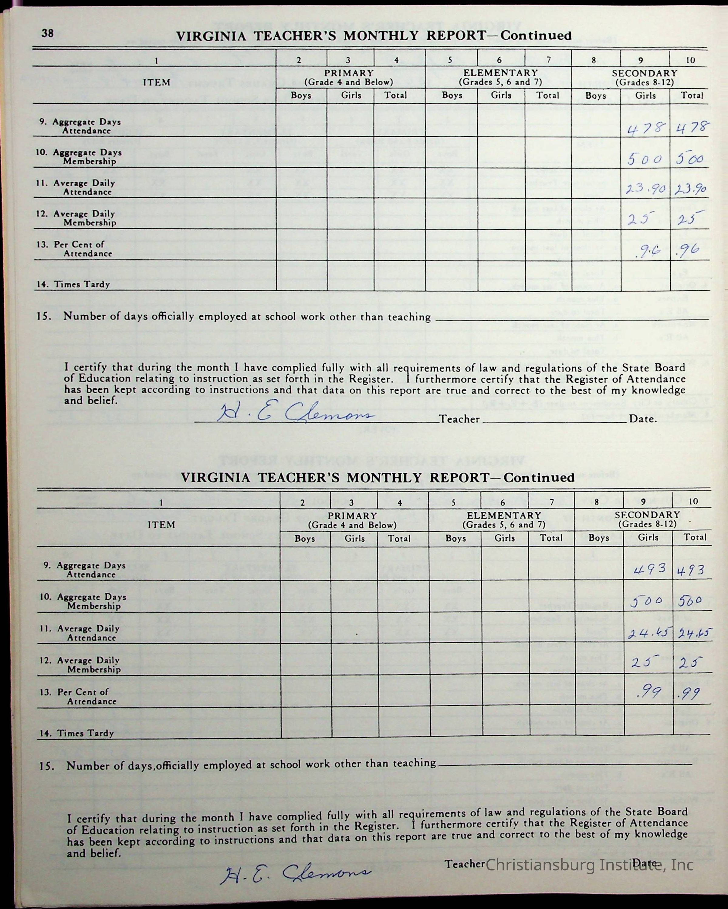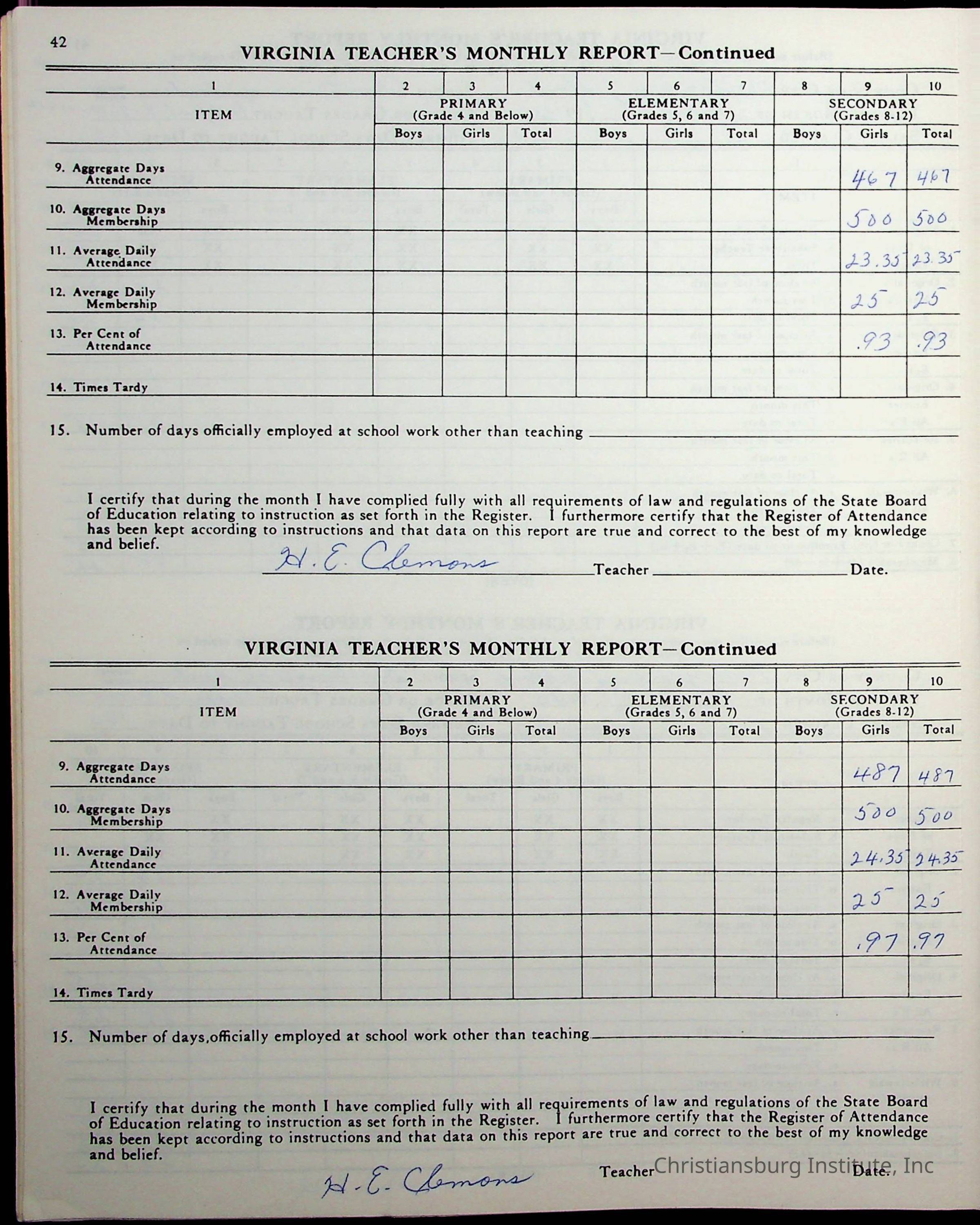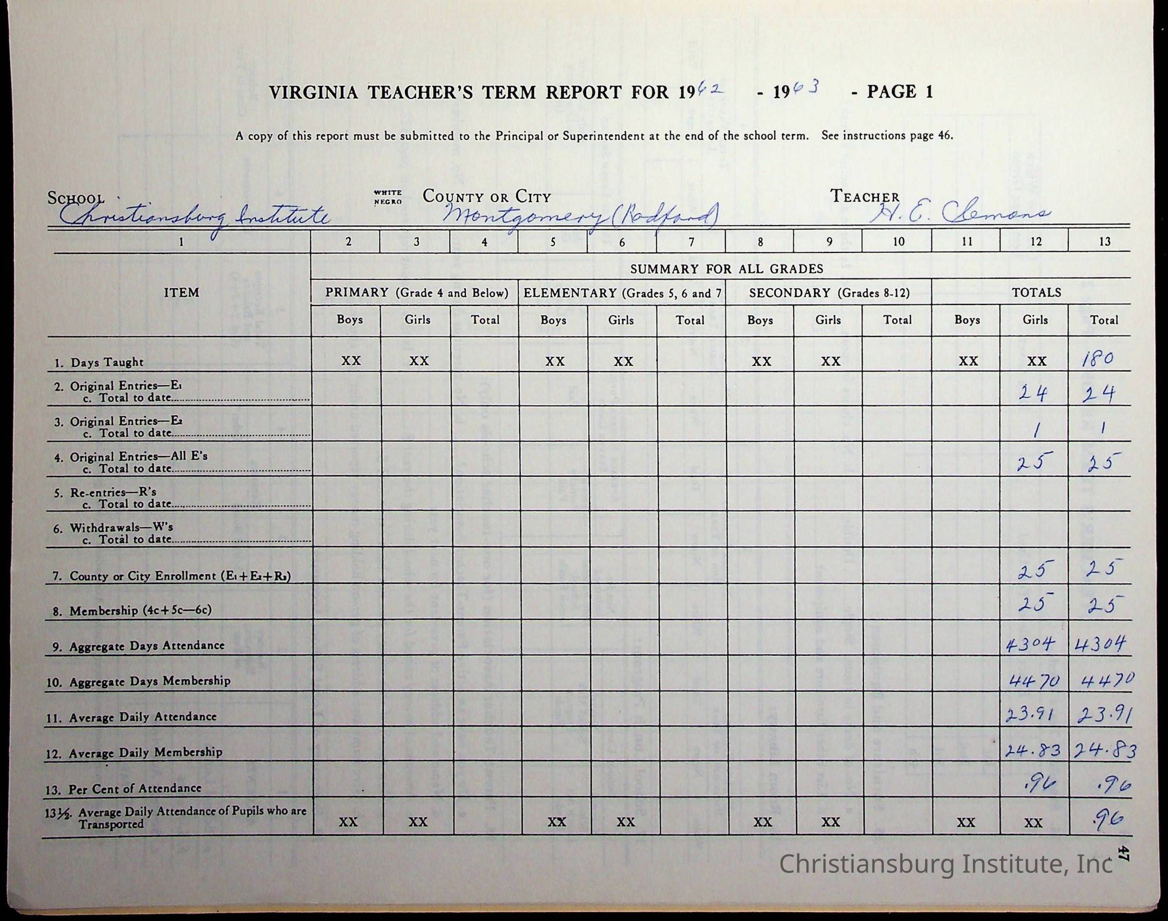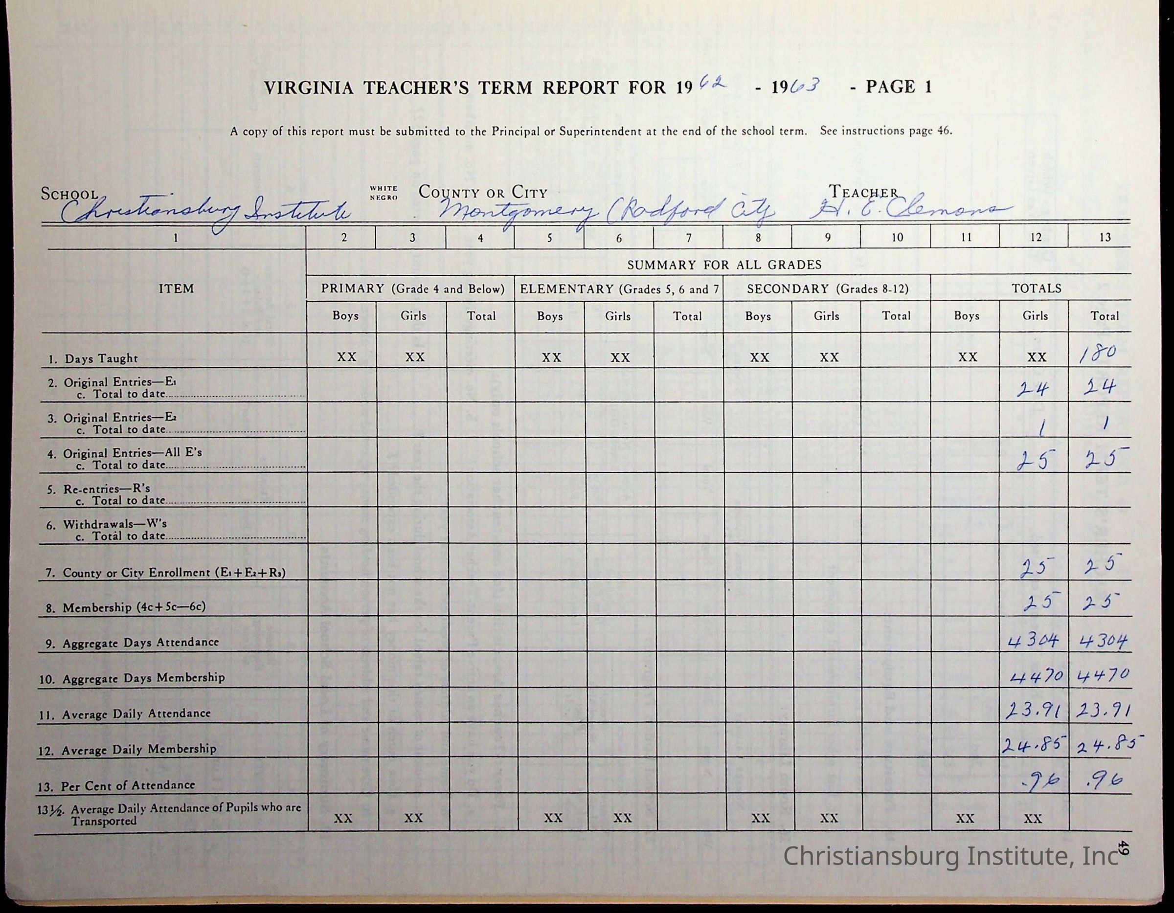 VA Teacher’s Register for H.E. Clemons, 1962-1963 (Radford Girls)Scope and Content