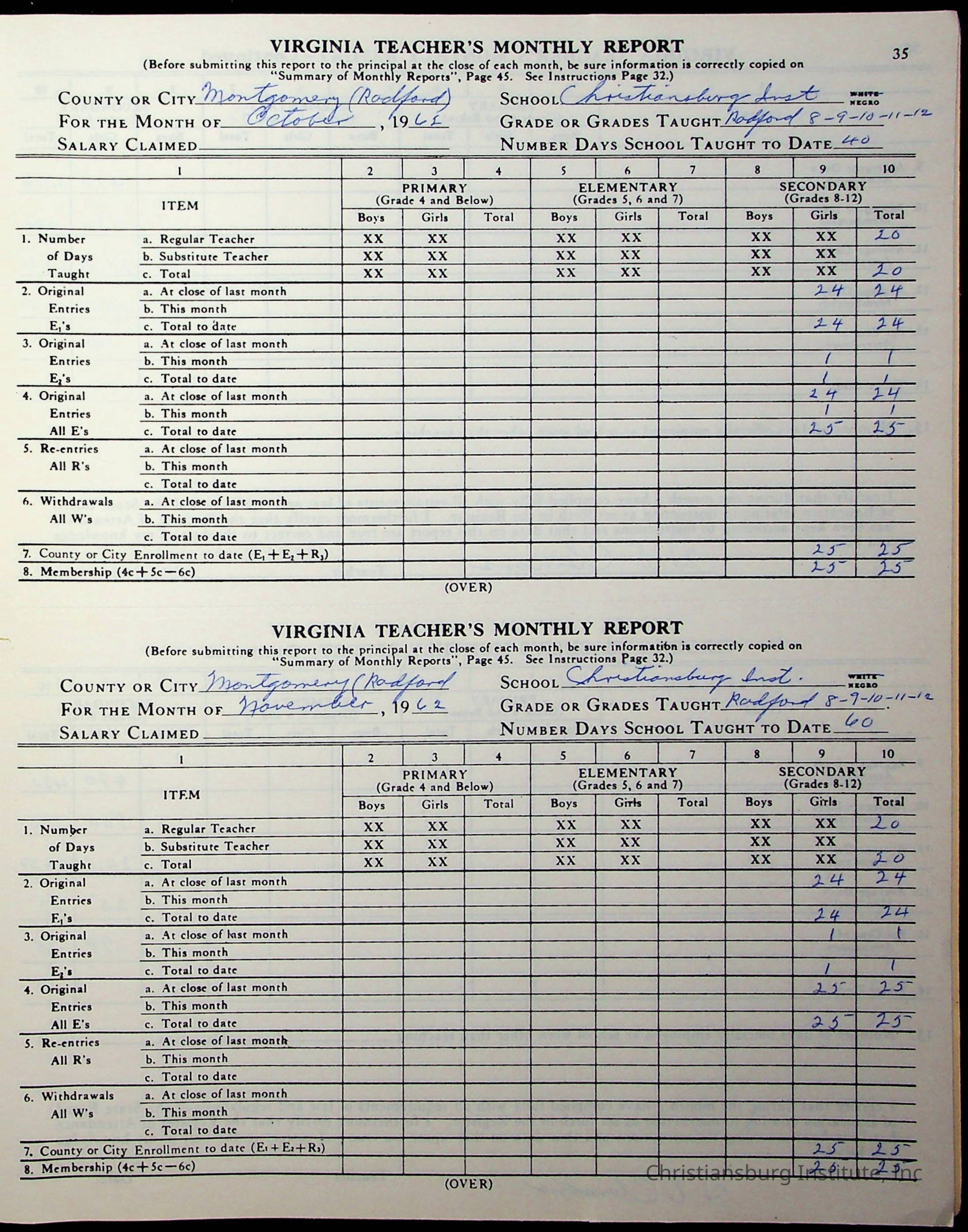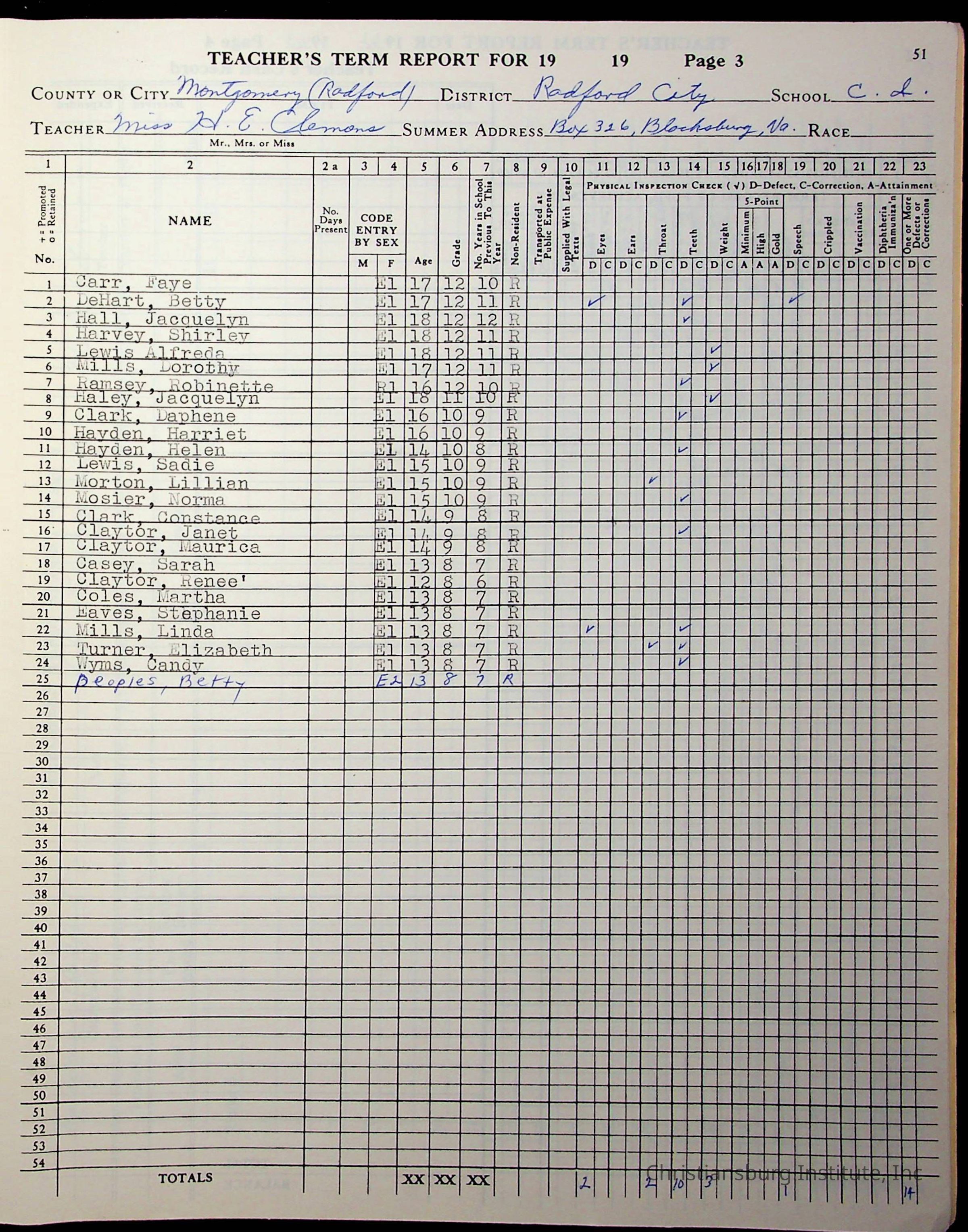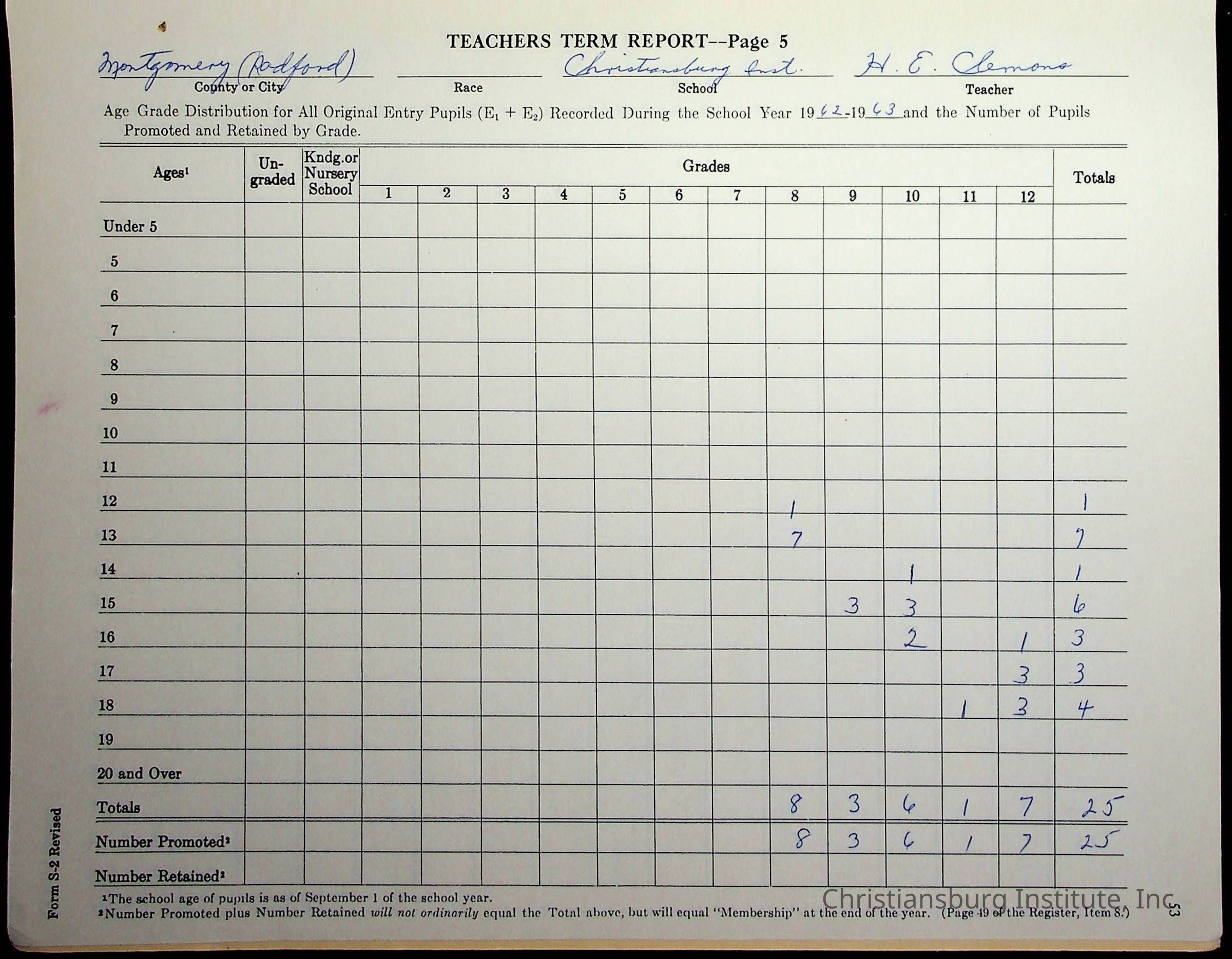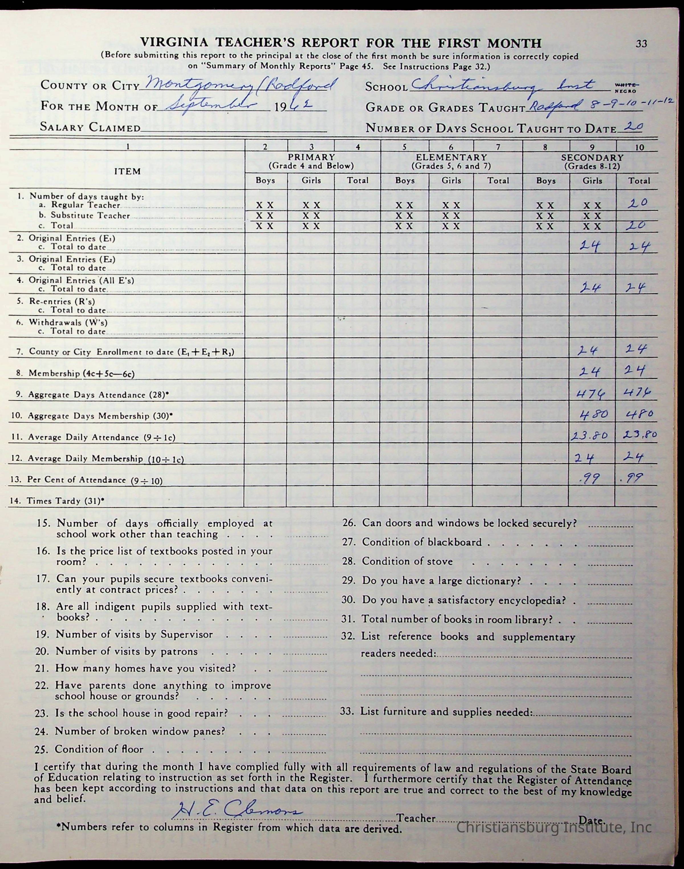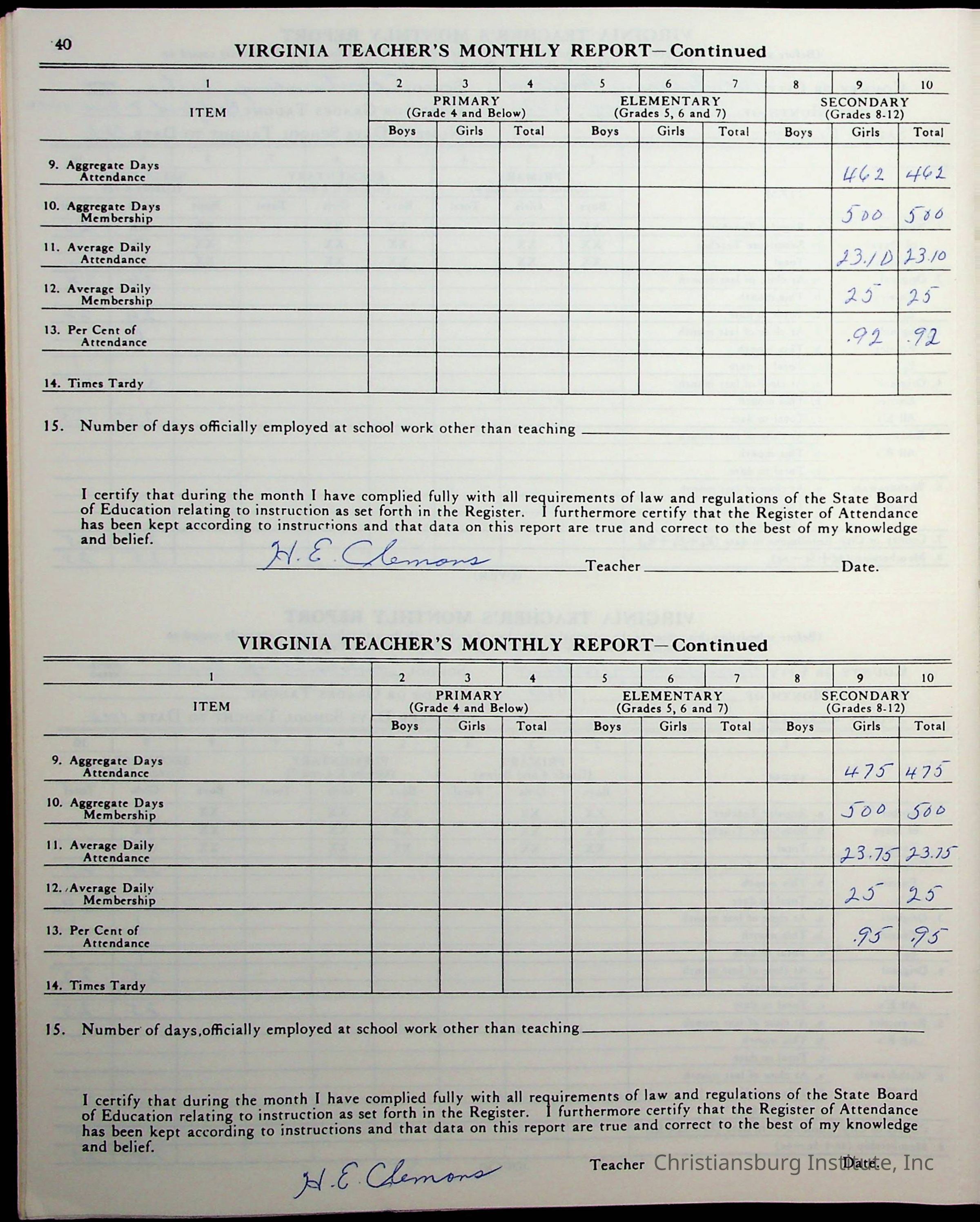VA Teacher’s Register for H.E. Clemons, 1962-1963 (Radford Girls)Scope and Content