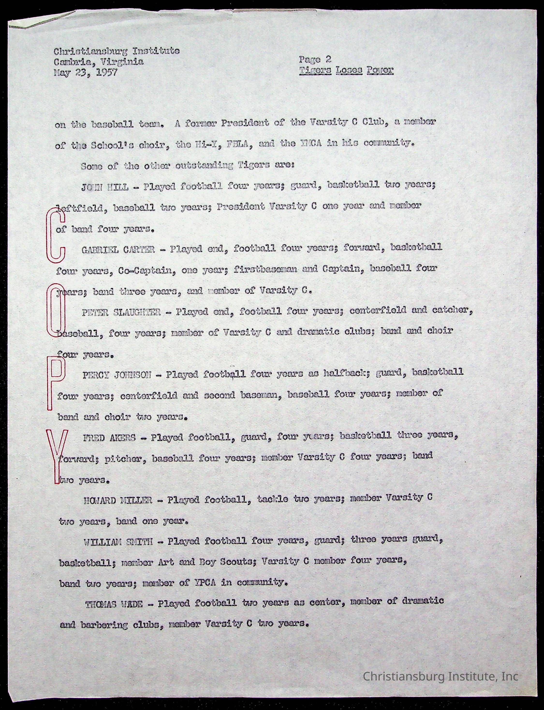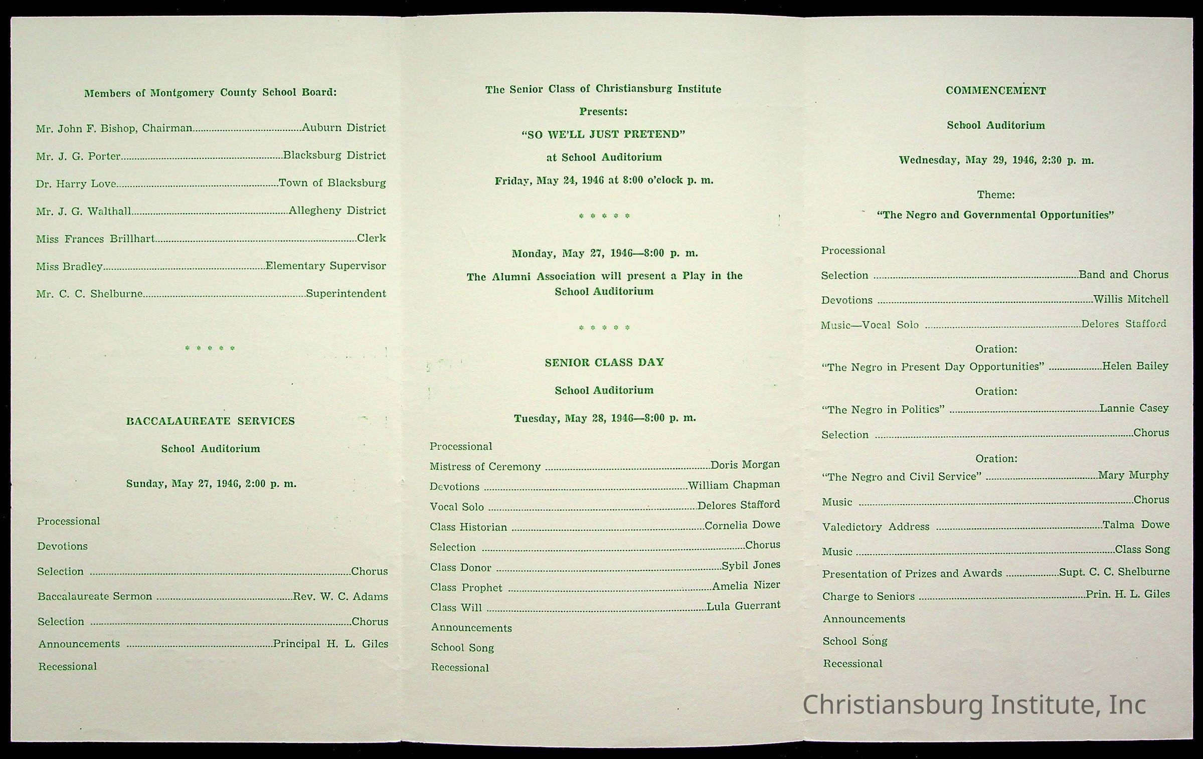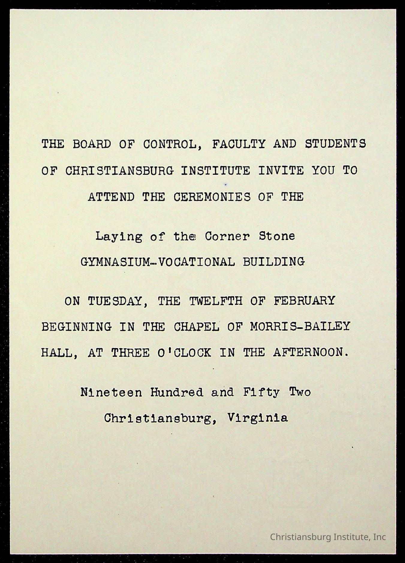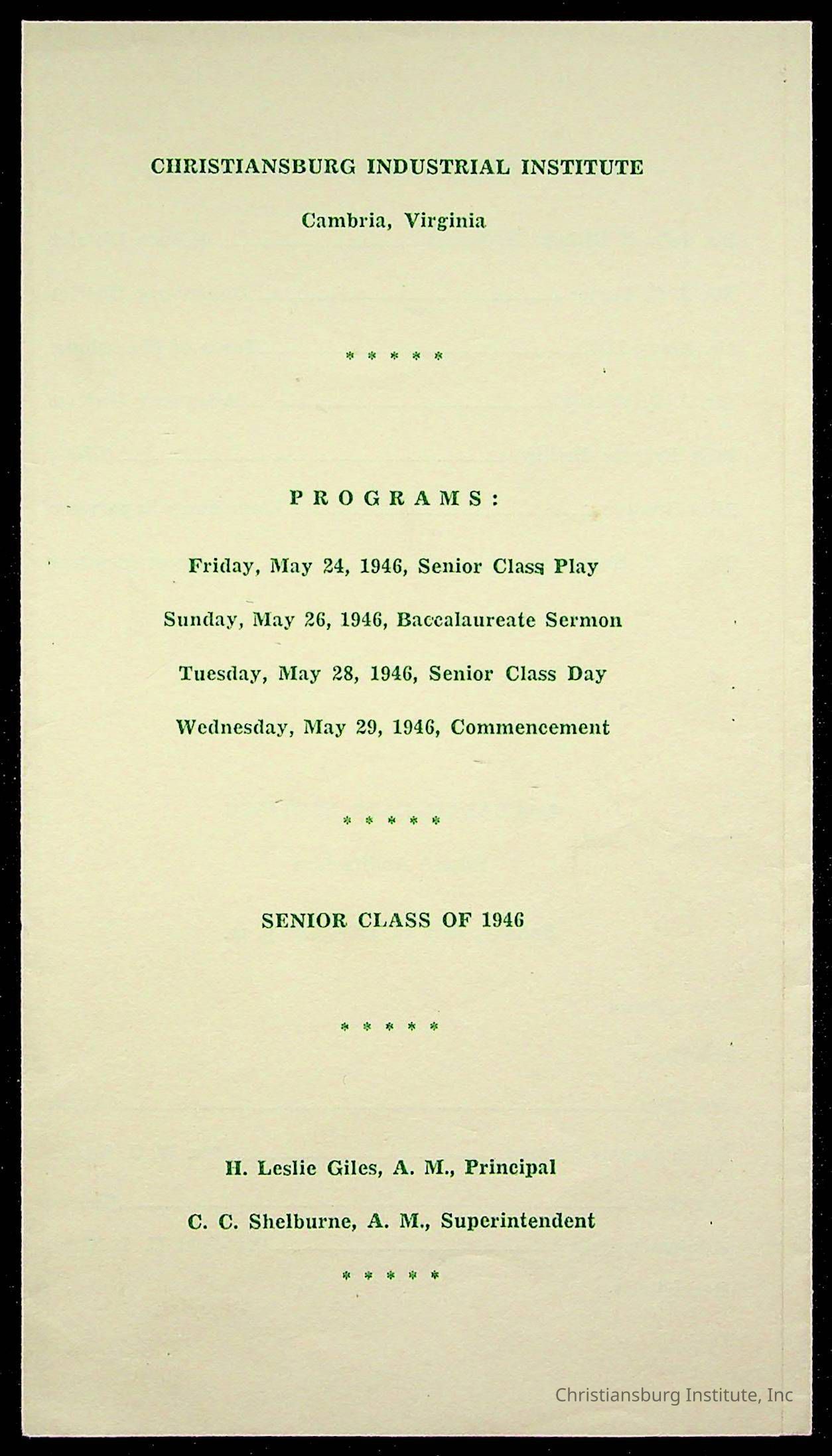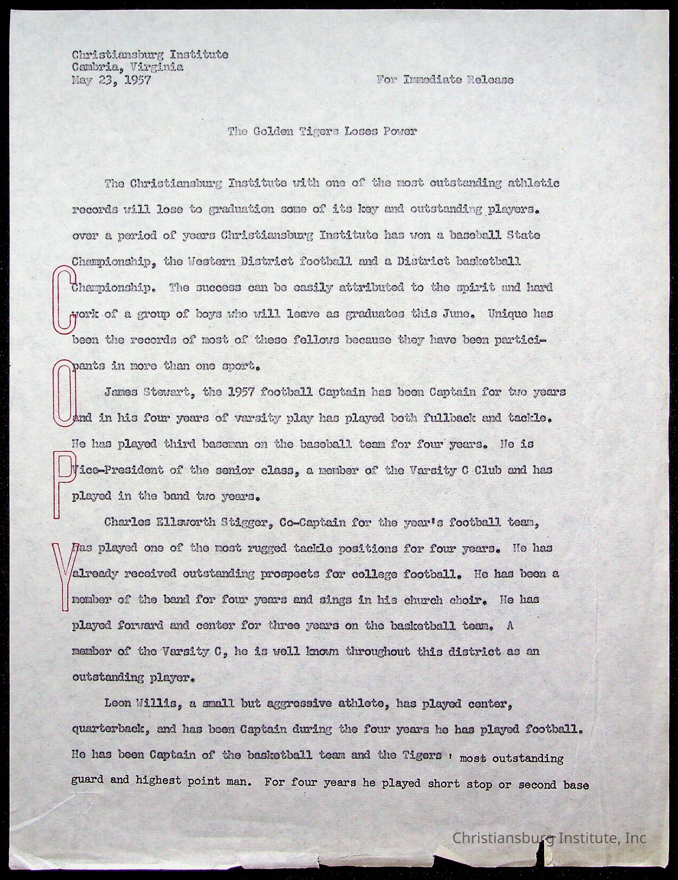 Copyright has been assigned to Christiansburg Institute Museum & Archives by Montgomery County Public Schools. For permission to publish materials created by the donor, contact CIMA@christiansburginstitute.com. Materials not created by Christiansburg Industrial Institute may still be under copyright.