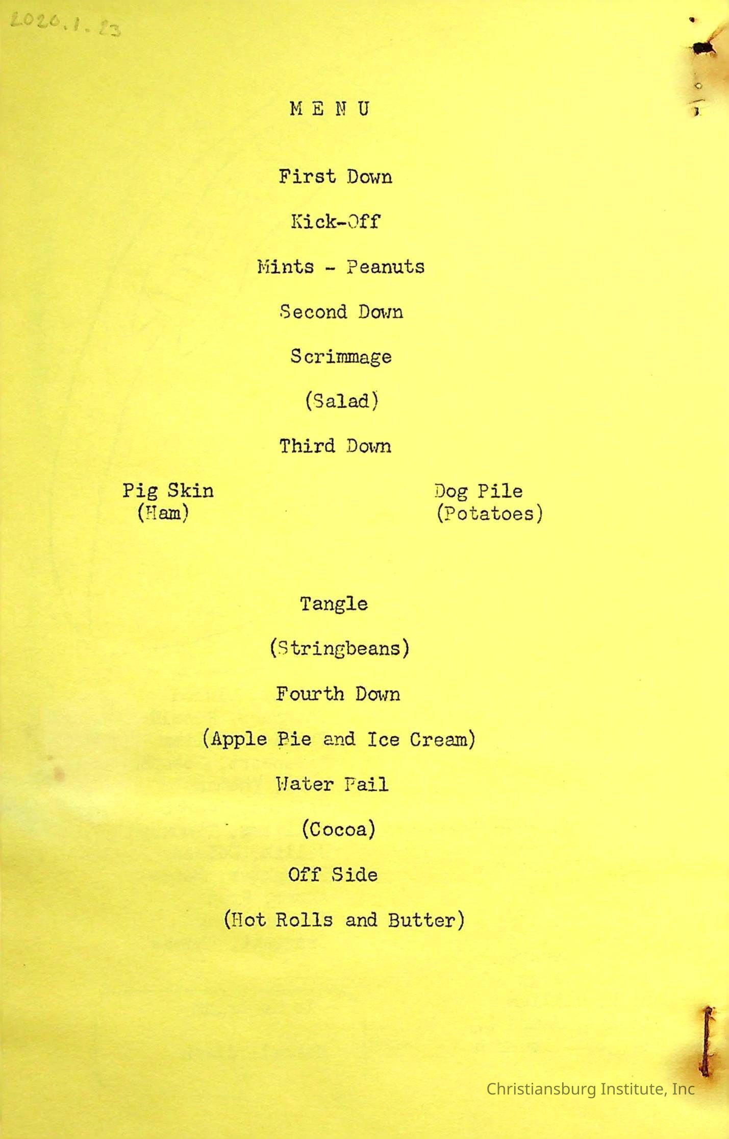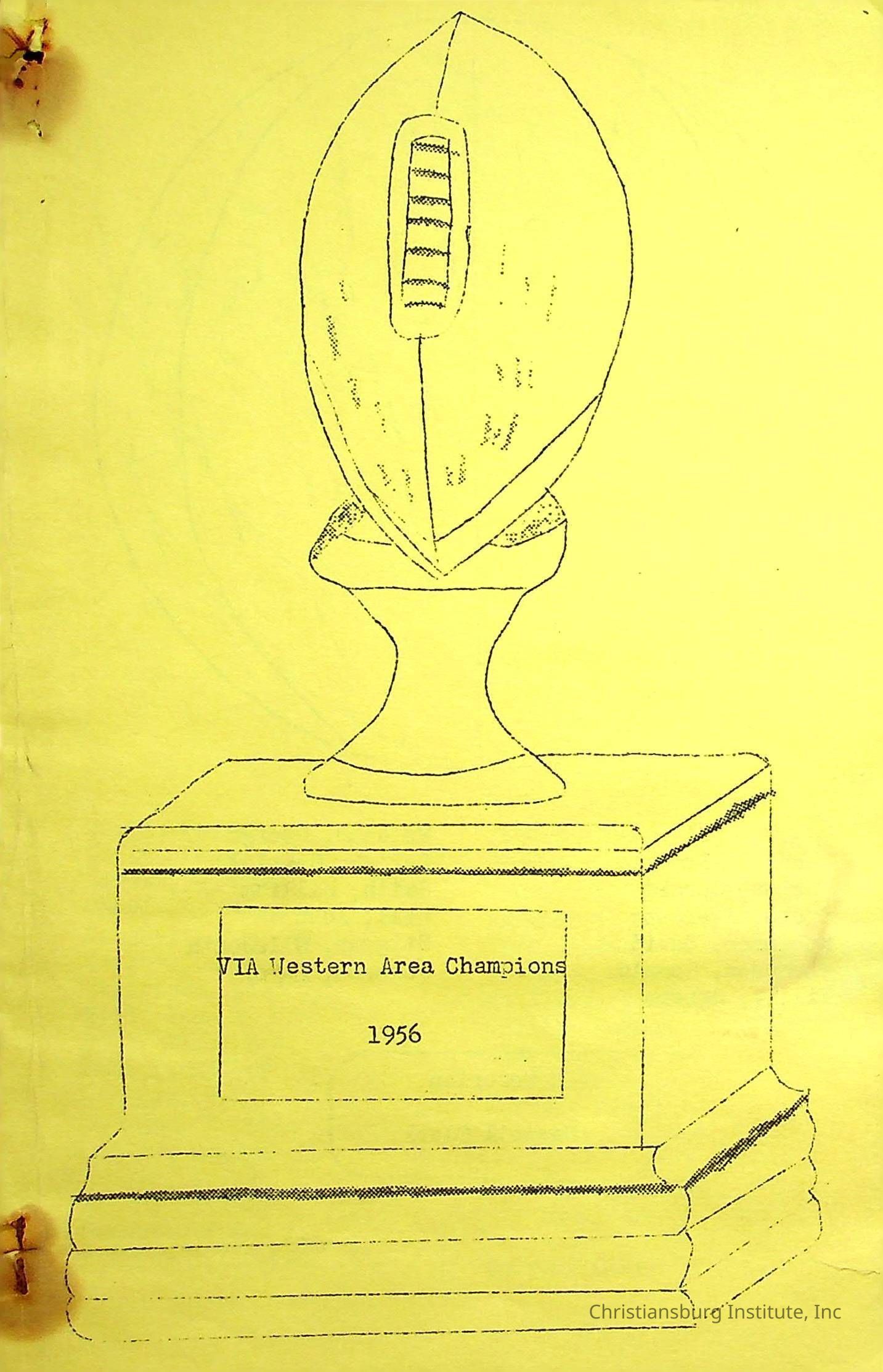 A yellow program for the Awards Dinner, held on March 8, 1957, to celebrate the 1956 VIA Western Area Championship. The program lists the order of events, members of the 1956 team, the 1957 football schedule, and the lyrics to "Hail to C.I.I."Collection