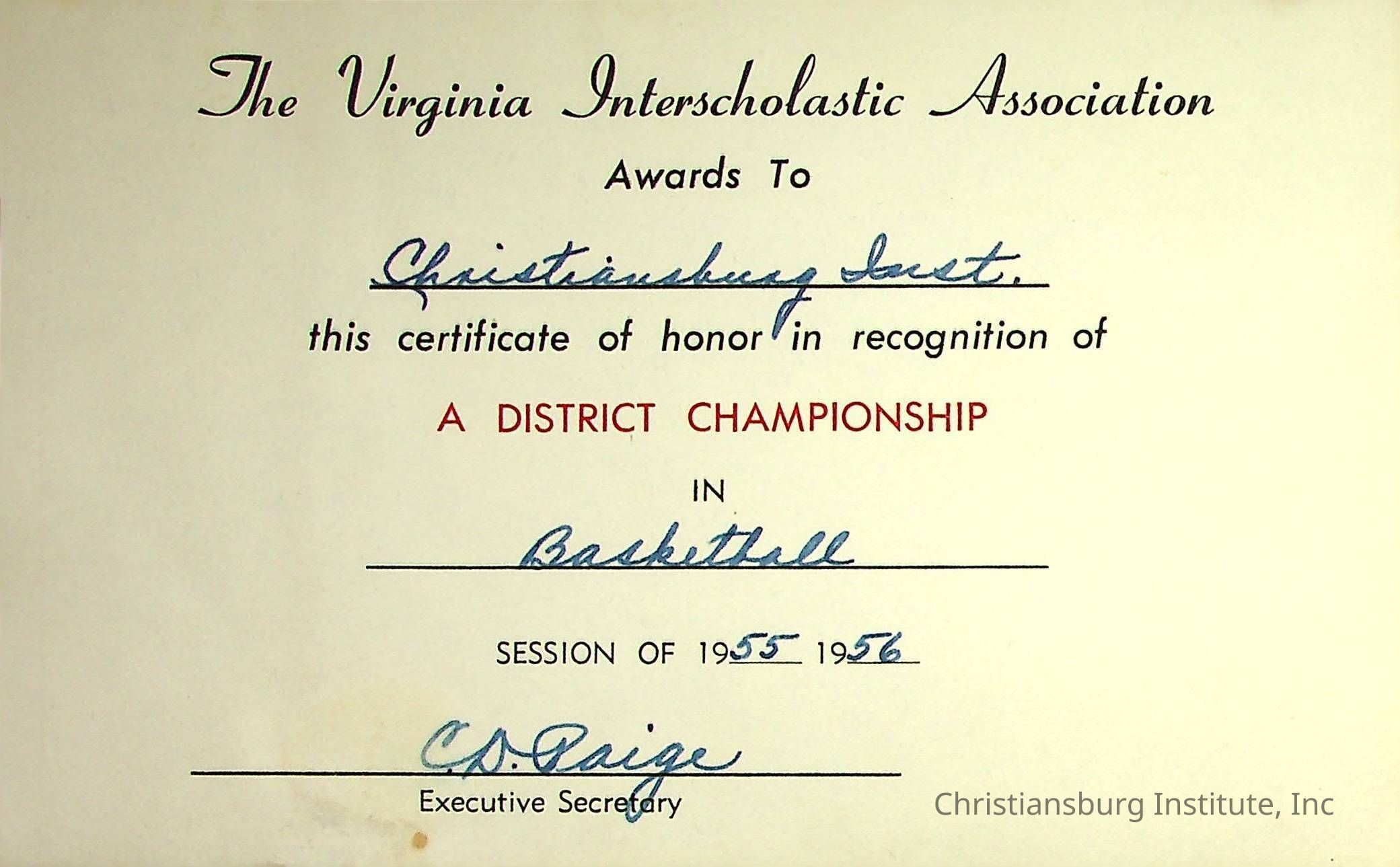 An award for the District Championship in basketball awarded to Christiansburg Institute for the 1955-1956 season issued by the Virginia Interscholastic Association.Creator