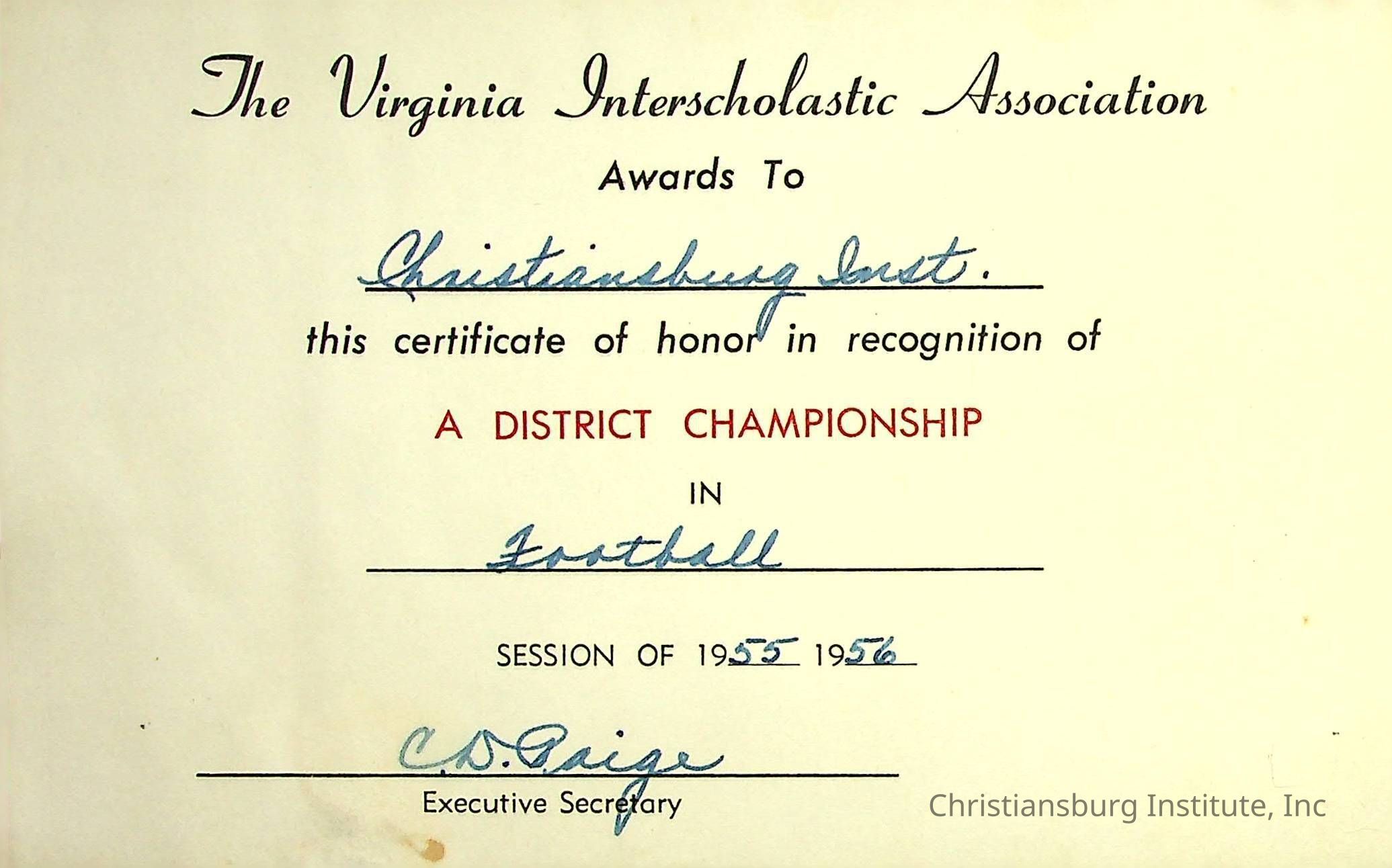 An award for the District Championship in football awarded to Christiansburg Institute for the 1955-1956 season issued by the Virginia Interscholastic Association. Signed by Executive Secretary C.D. Paige.